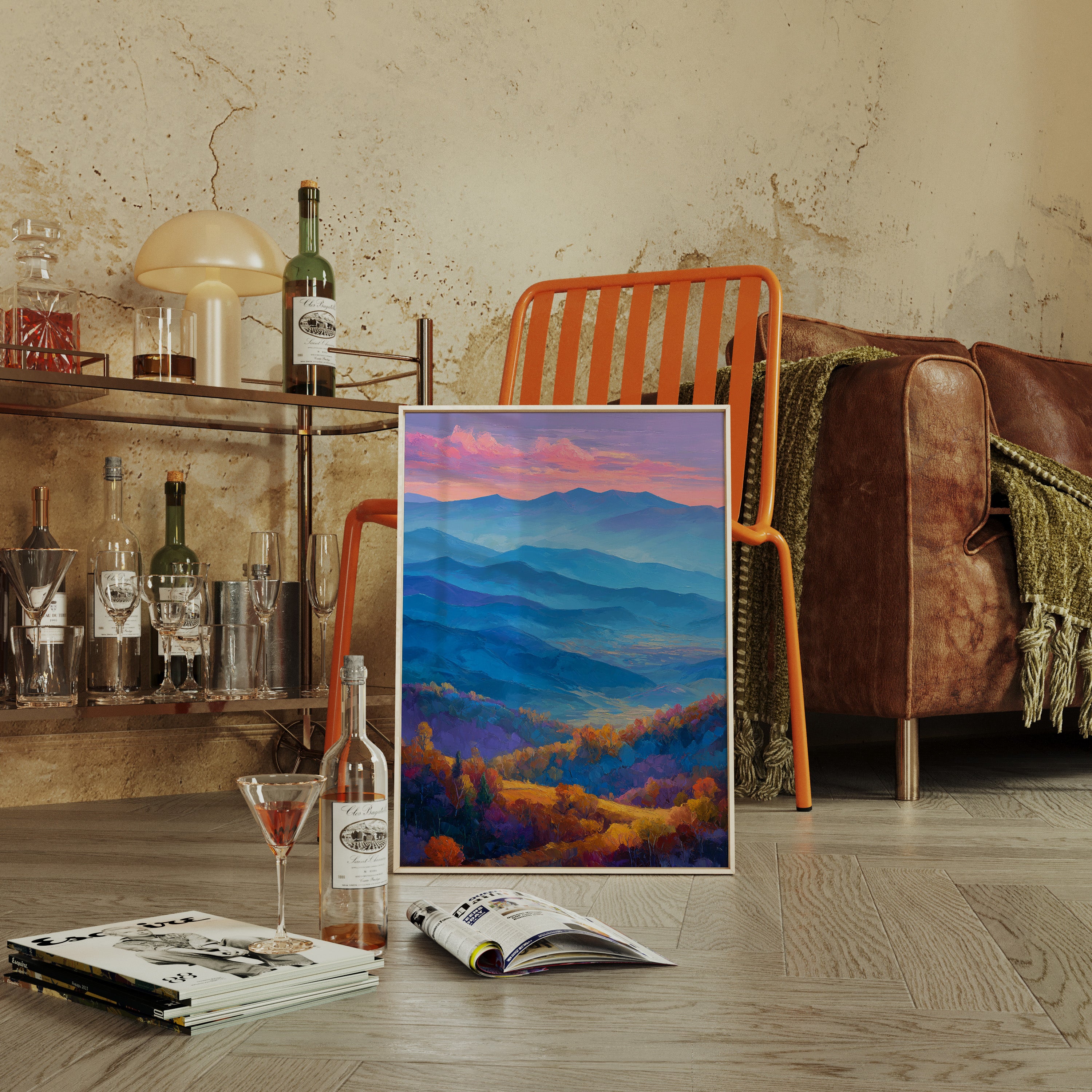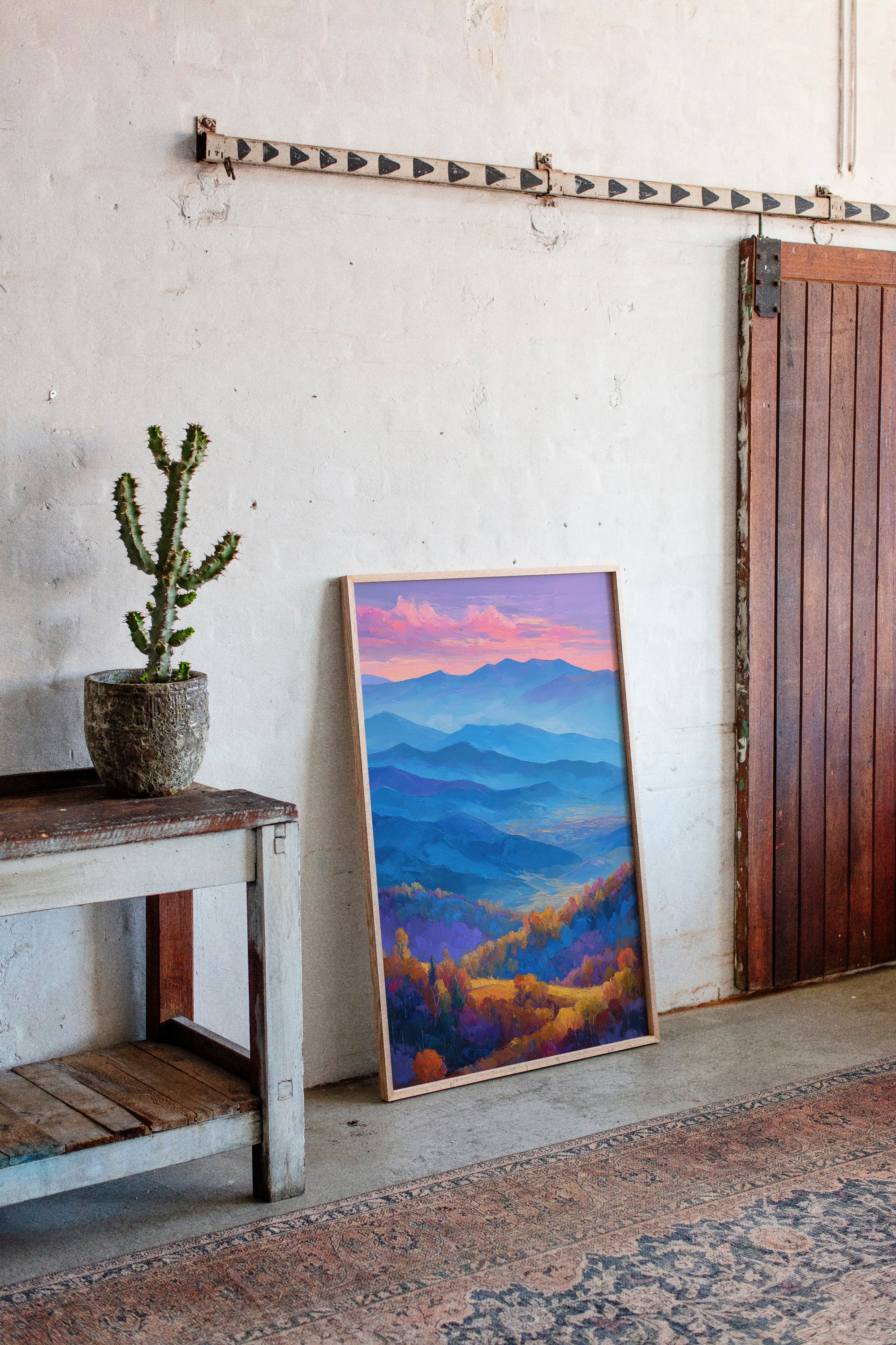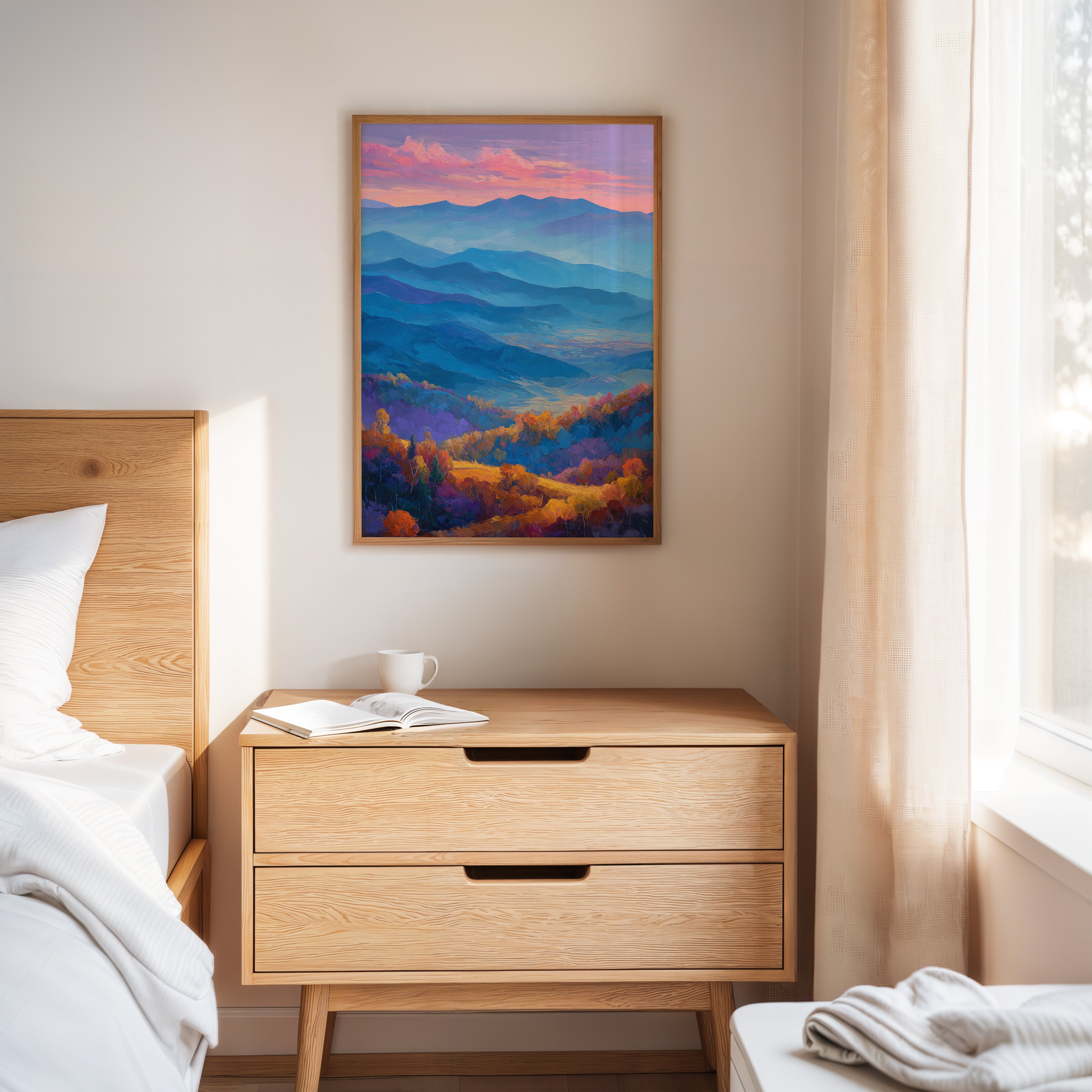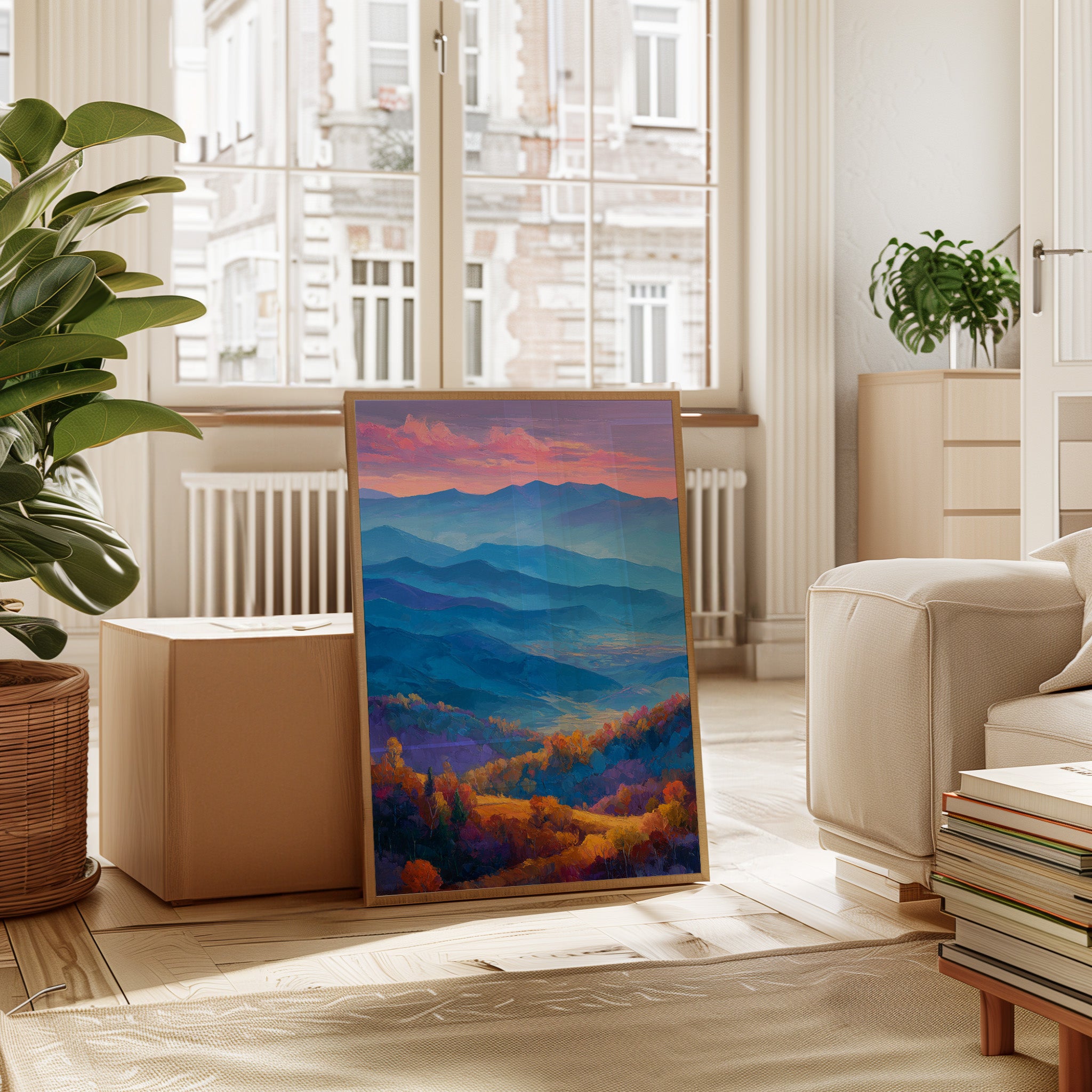 Dawn breaks over rolling mountains, painting the sky in tender coral hues that dance with twilight purple. Layer upon layer of ridges cascade into the distance, each fold draped in deepening shades of blue and indigo. In the foreground, autumn has set the valley ablaze with golden meadows and vibrant foliage, creating a dramatic contrast against the cool mountain palette. The textured brushstrokes capture the rugged terrain while maintaining a dreamlike quality, as if the landscape itself is flowing like music. This piece would bring serene majesty to a living room or office space, creating a window to the wilderness that changes with the day's light.