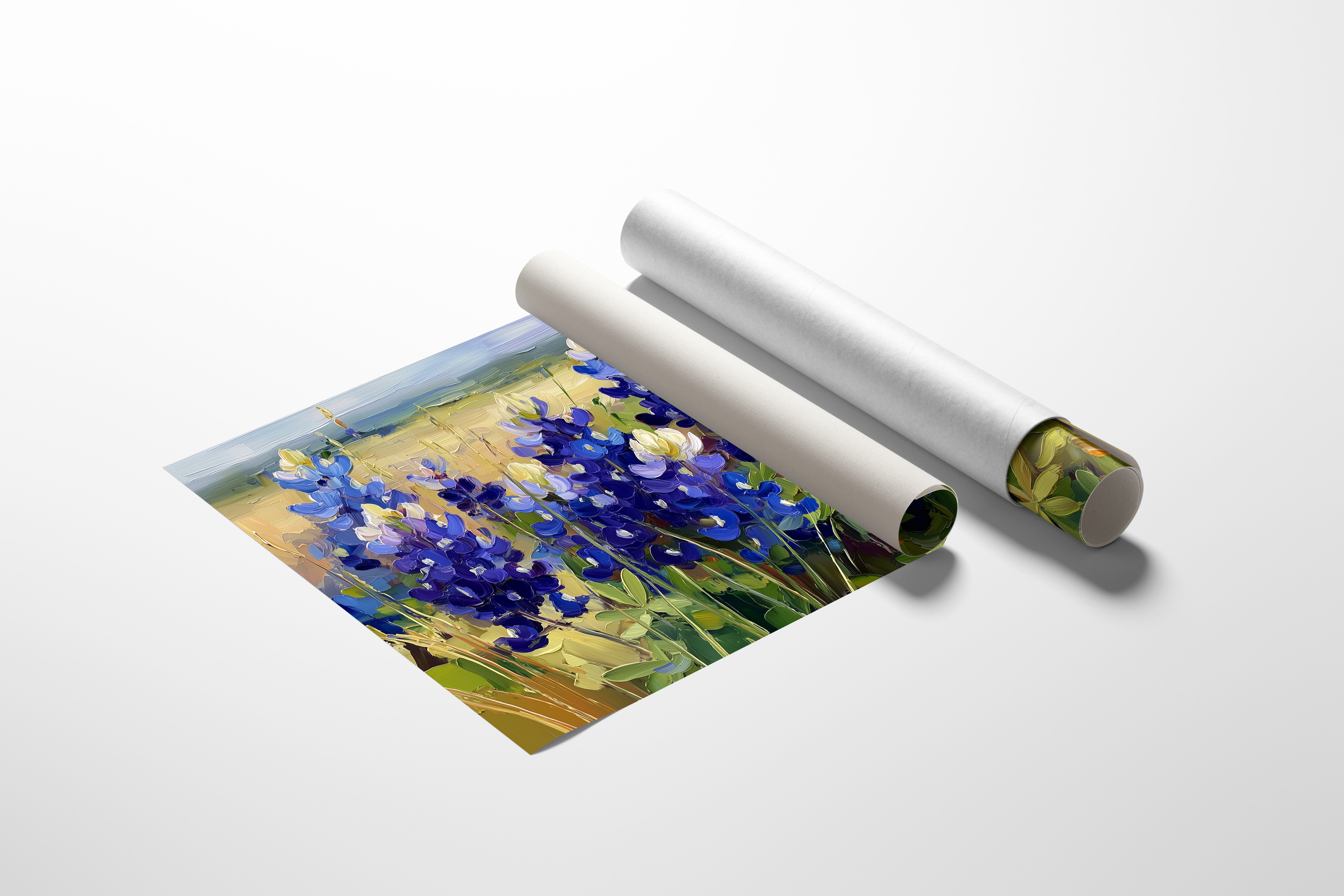 Sunlight bathes a field of proud Texas bluebonnets, their royal blue petals catching the warm glow of a spring afternoon. Part of our Contemporary collection, this piece captures the bold brushstrokes and vibrant energy of modern impressionism. The flowers stand tall against a golden prairie backdrop, their deep indigo blooms creating a rhythmic dance across the canvas. Delicate yellow wildflowers peek through at ground level, adding subtle contrast to the dramatic display of blues and purples. Perfect for bringing natural vitality to dining rooms or living spaces where its striking colors can inspire conversation and contemplation. The textured brushwork invites viewers to experience the gentle prairie breeze rustling through each petal.