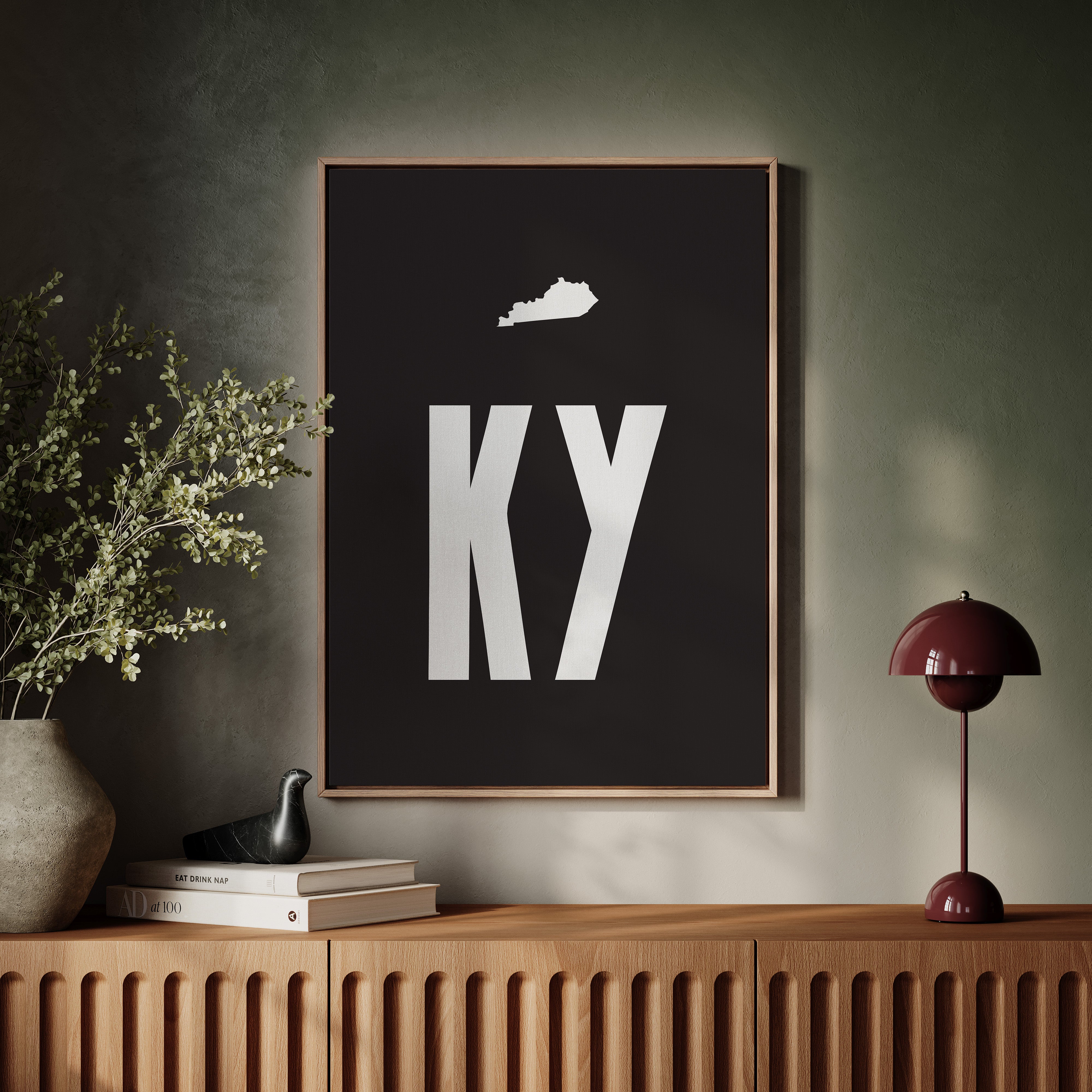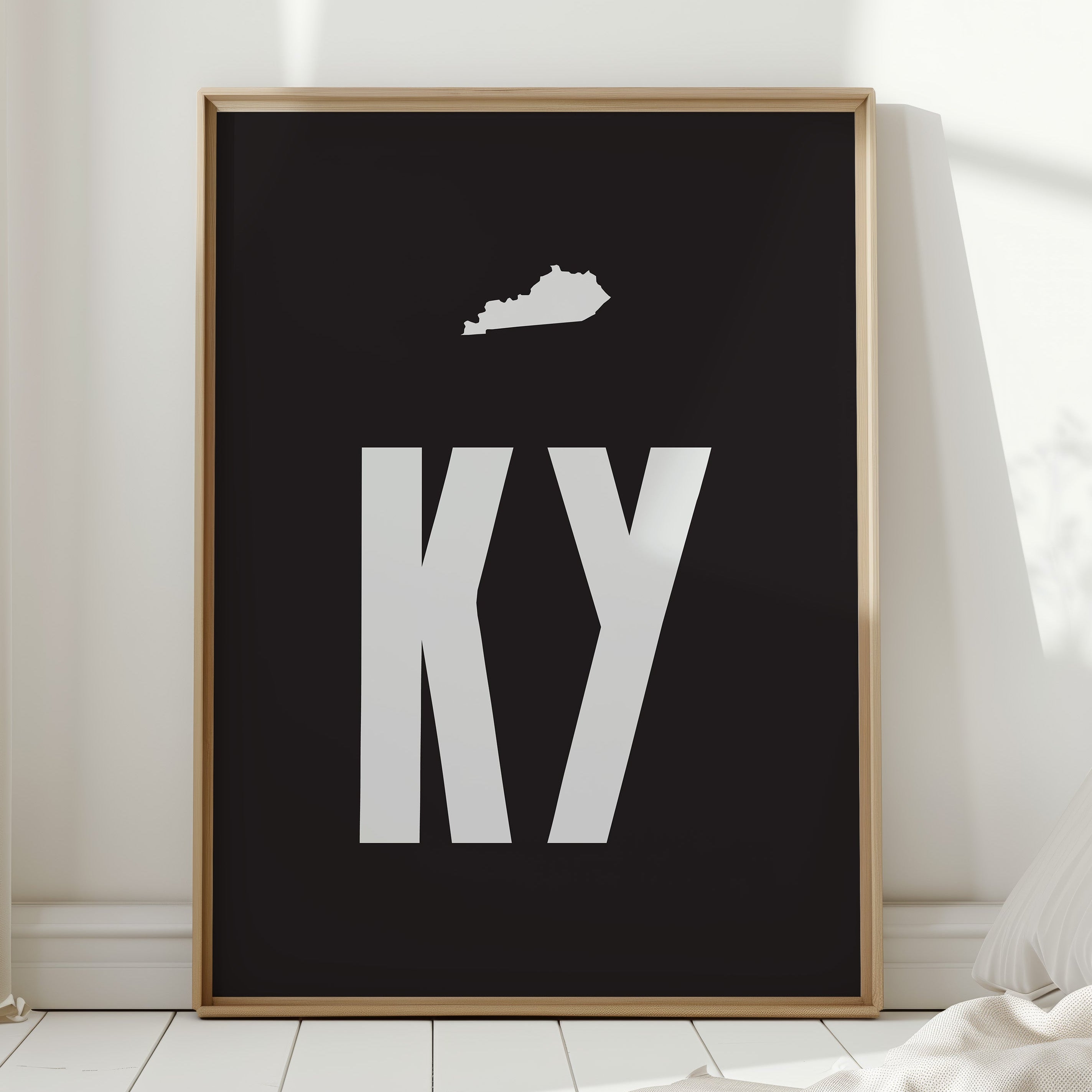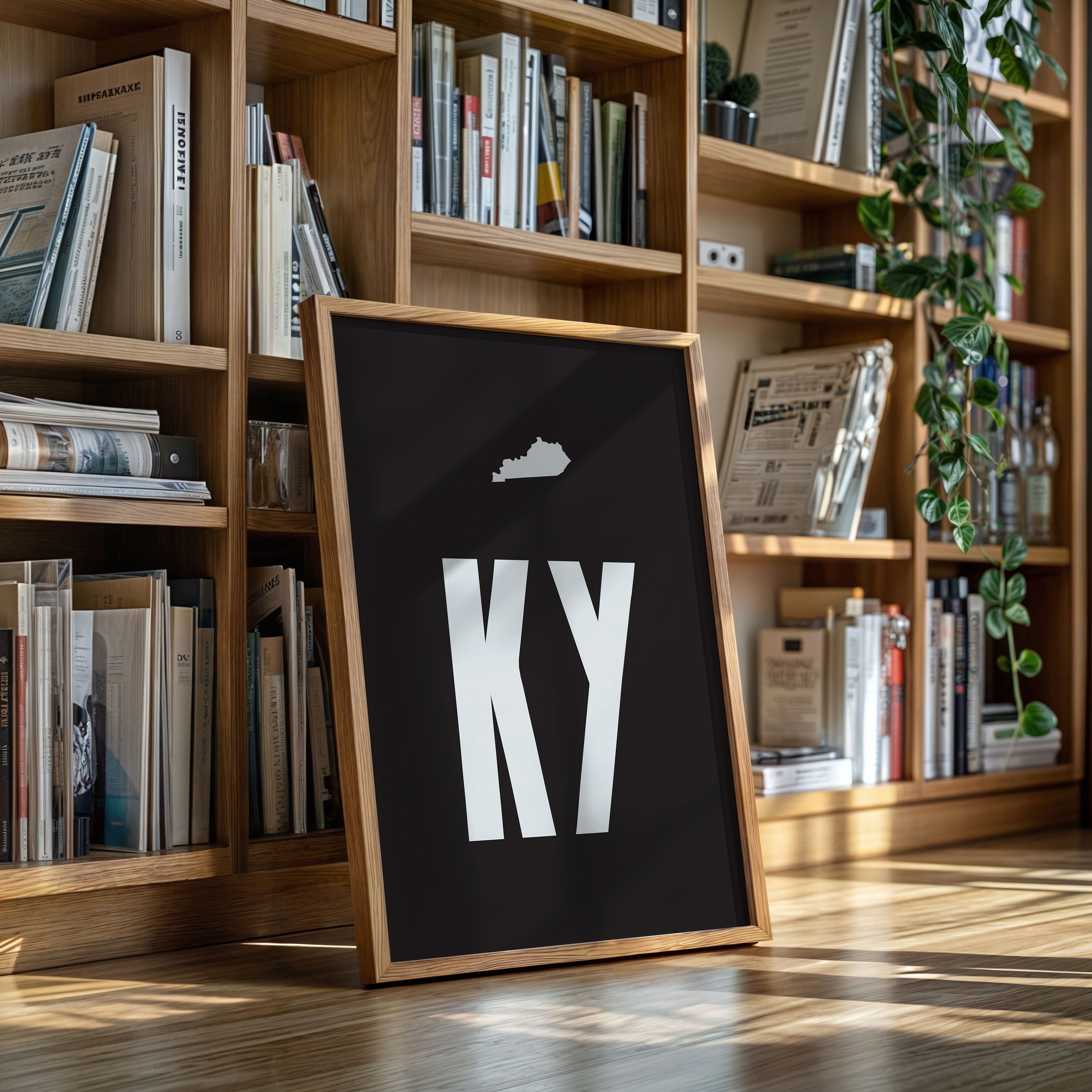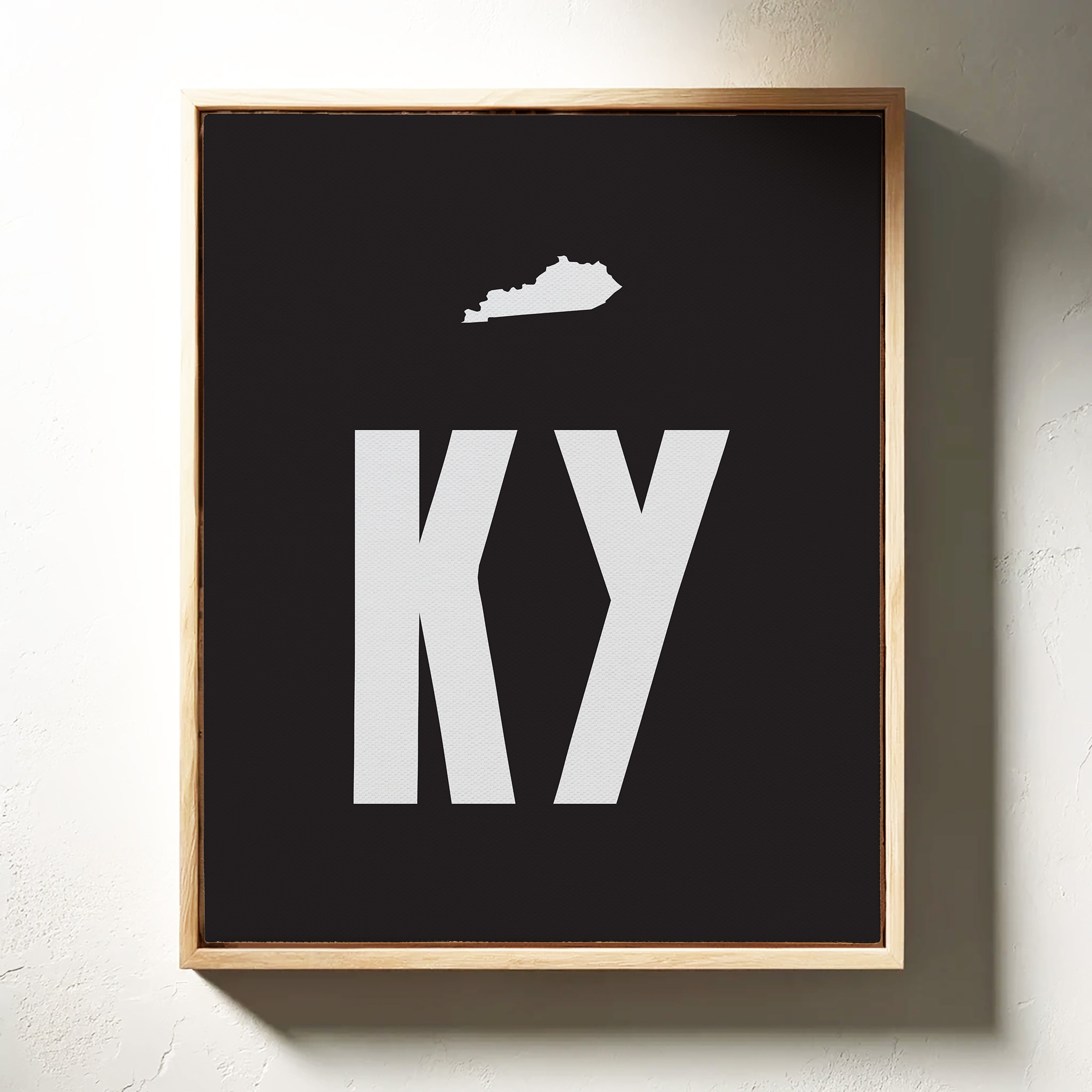 Bold typography meets geographical identity in this striking monochromatic composition. The familiar silhouette of Kentucky floats above clean, contemporary letterforms, creating a powerful dialogue between place and design. Sharp angles and precise edges of the ""KY"" letters contrast beautifully with the organic curves of the state outline, while the deep black background amplifies the crisp white elements. This elegant study in minimalism would command attention in a modern office space or creative studio, where its clean lines and strong geometric presence can inspire fresh perspectives.