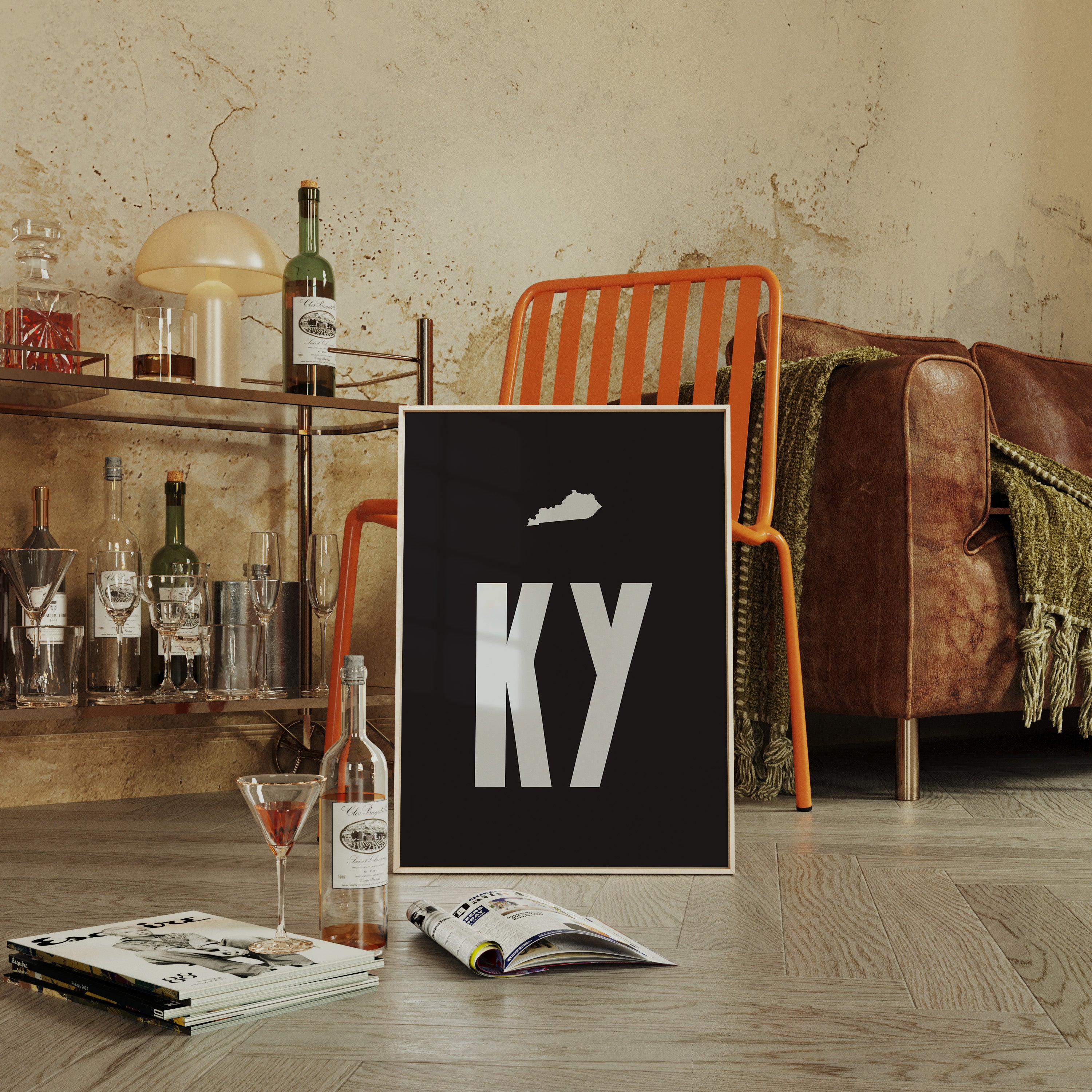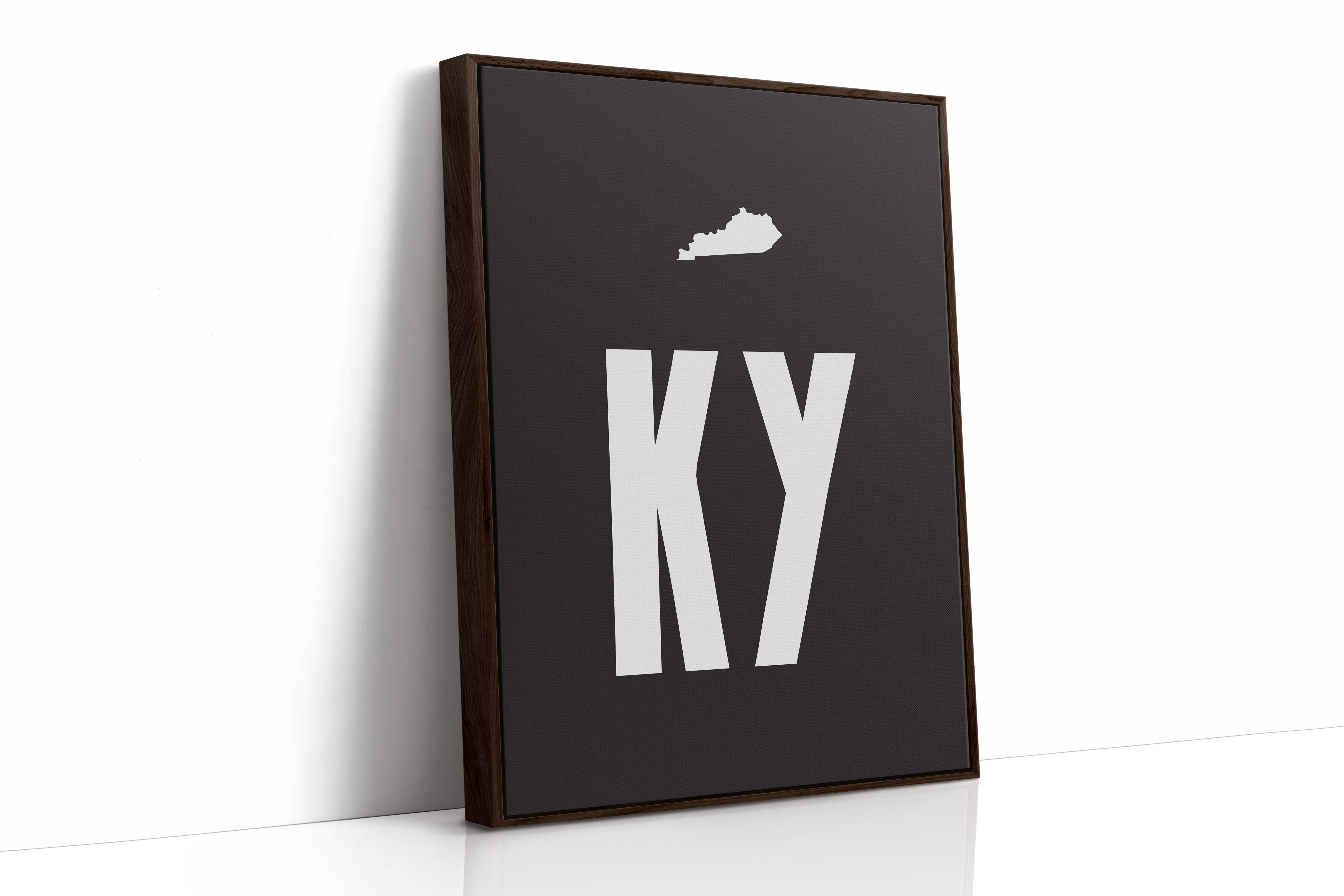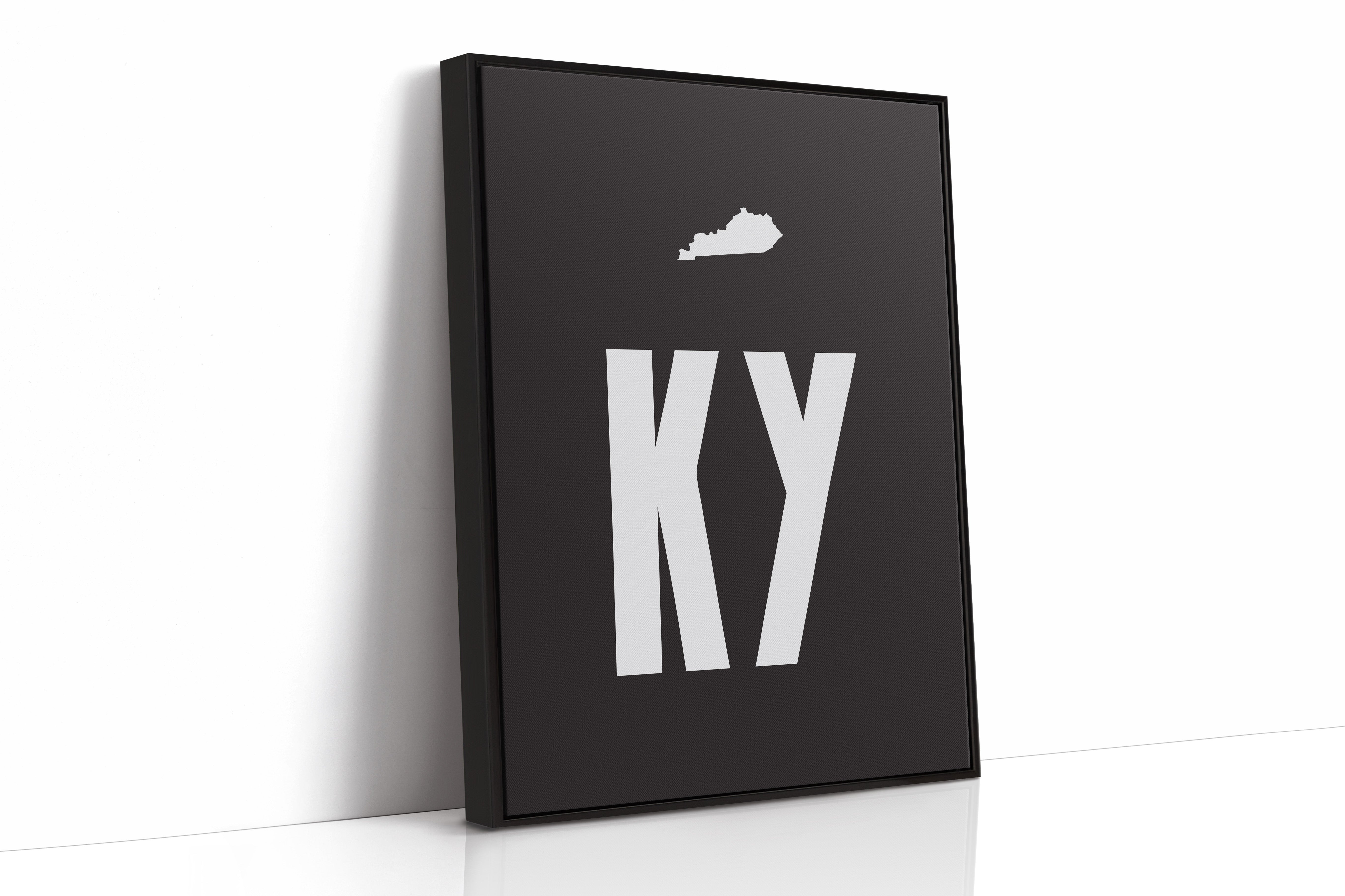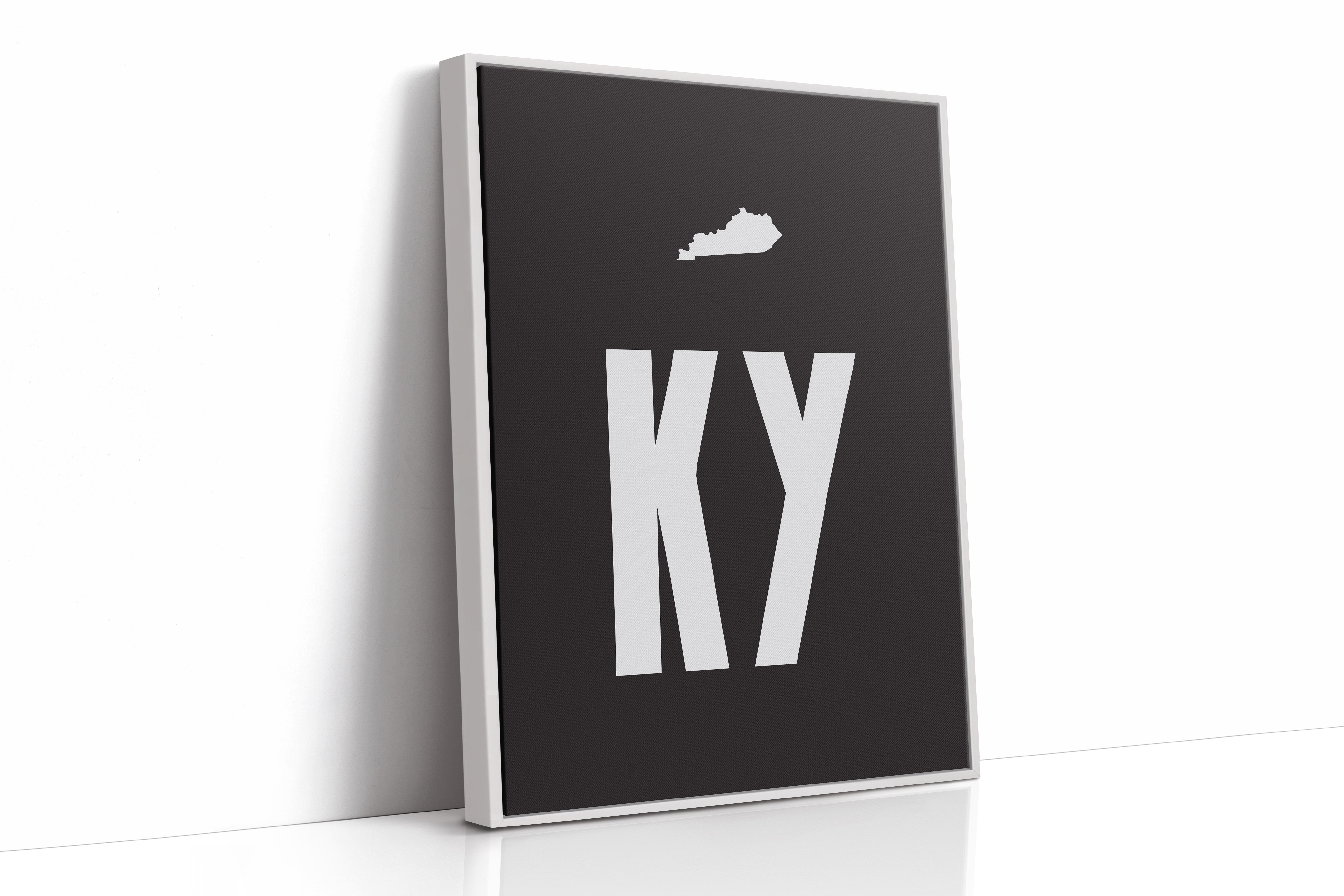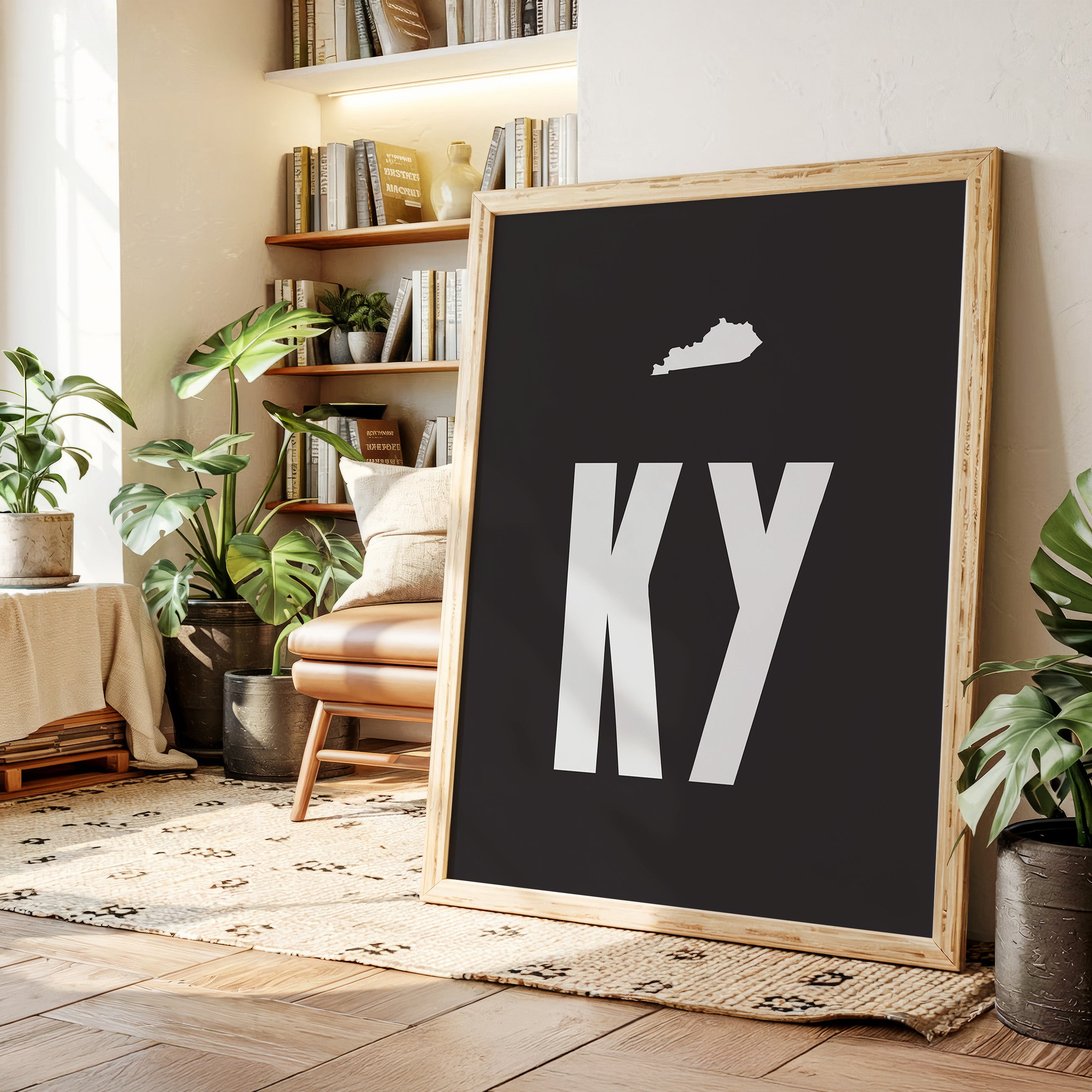 Bold typography meets geographical identity in this striking monochromatic composition. The familiar silhouette of Kentucky floats above clean, contemporary letterforms, creating a powerful dialogue between place and design. Sharp angles and precise edges of the ""KY"" letters contrast beautifully with the organic curves of the state outline, while the deep black background amplifies the crisp white elements. This elegant study in minimalism would command attention in a modern office space or creative studio, where its clean lines and strong geometric presence can inspire fresh perspectives.