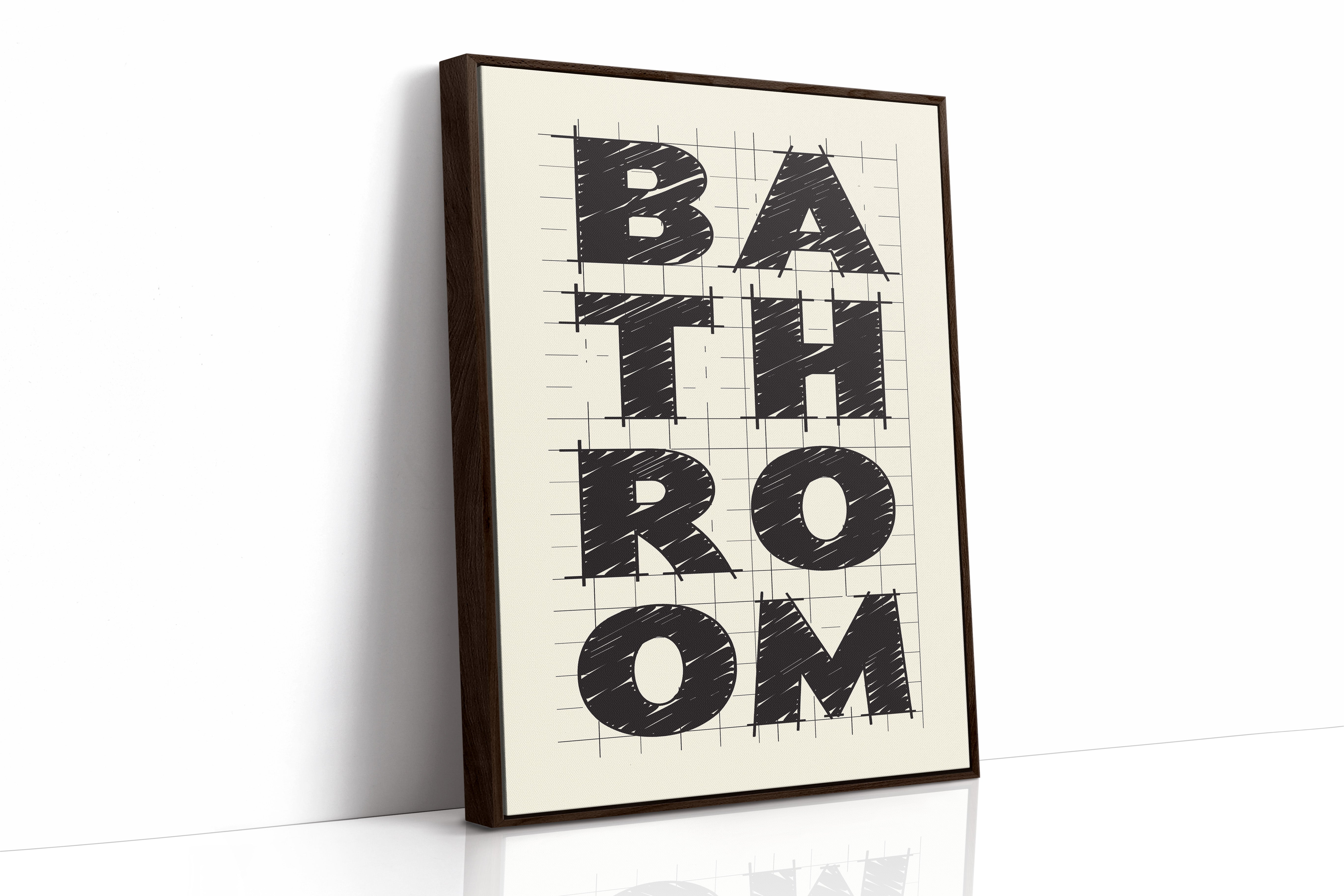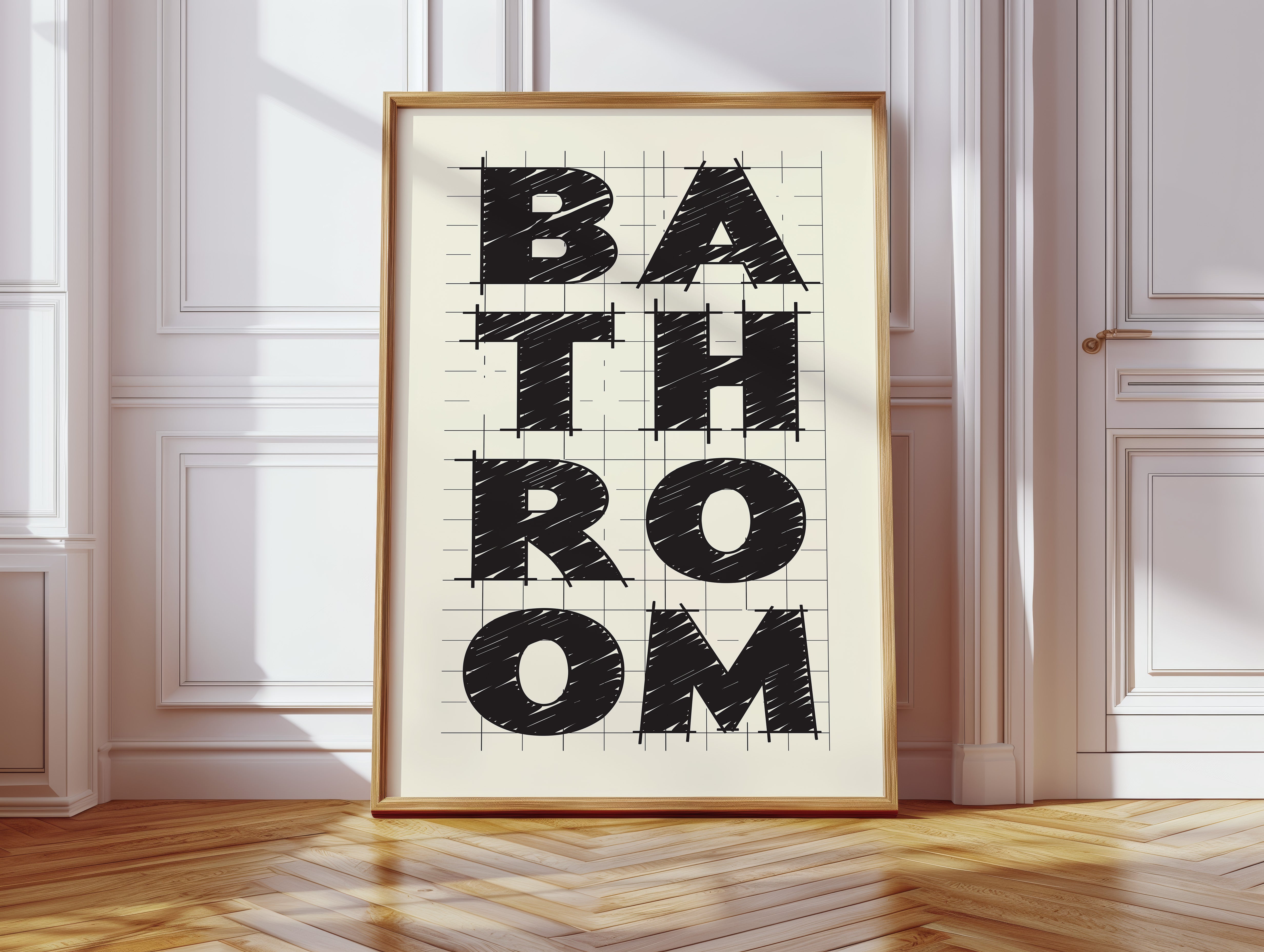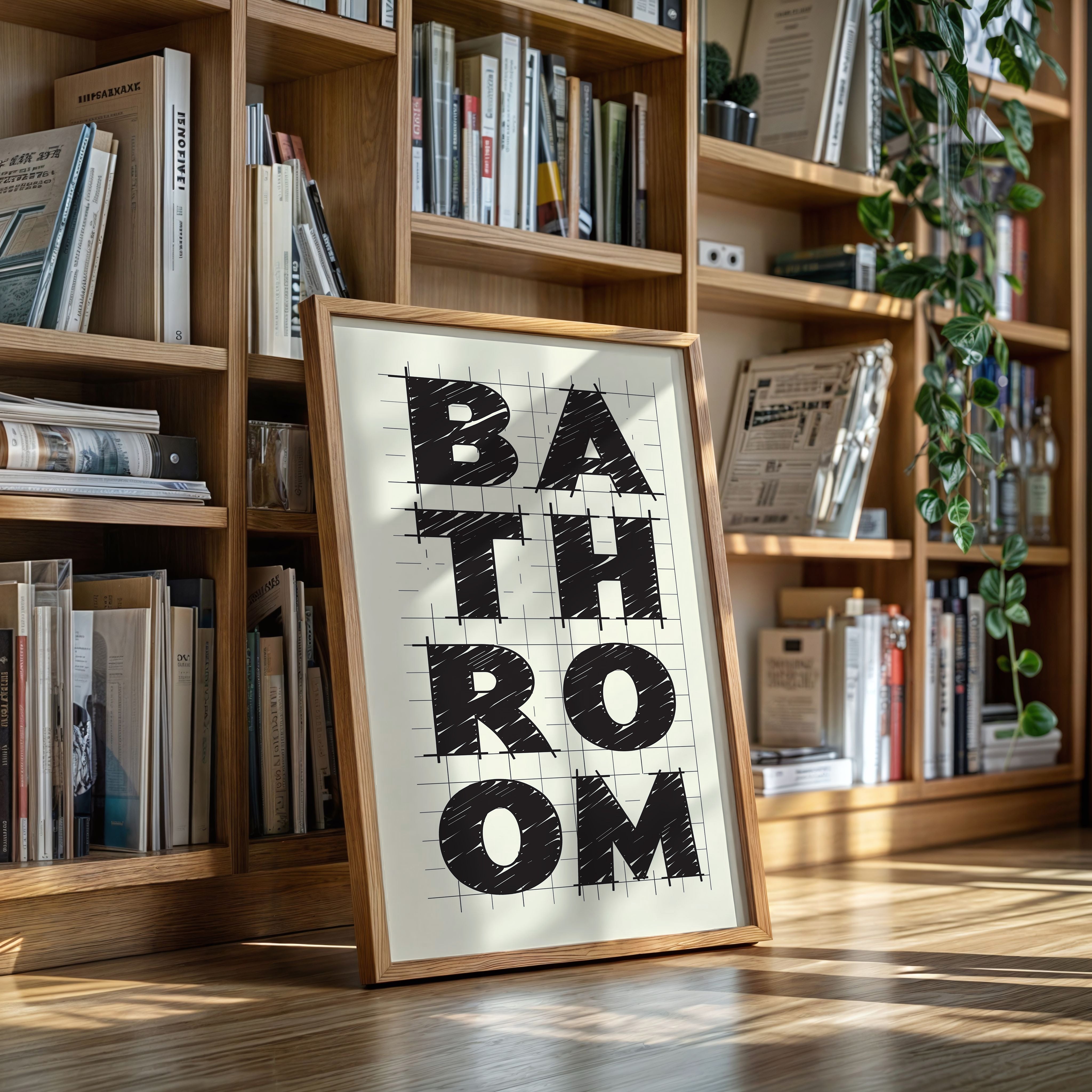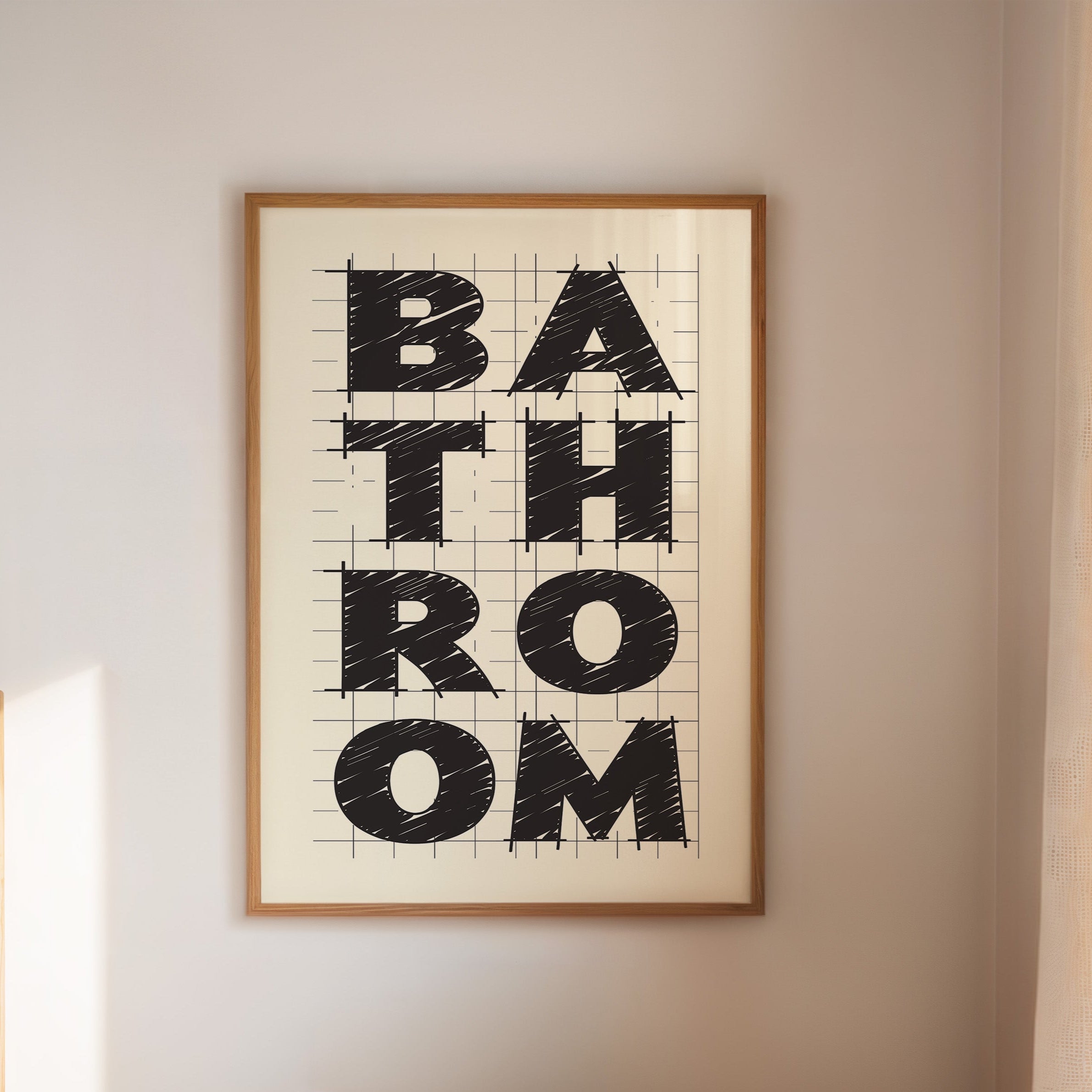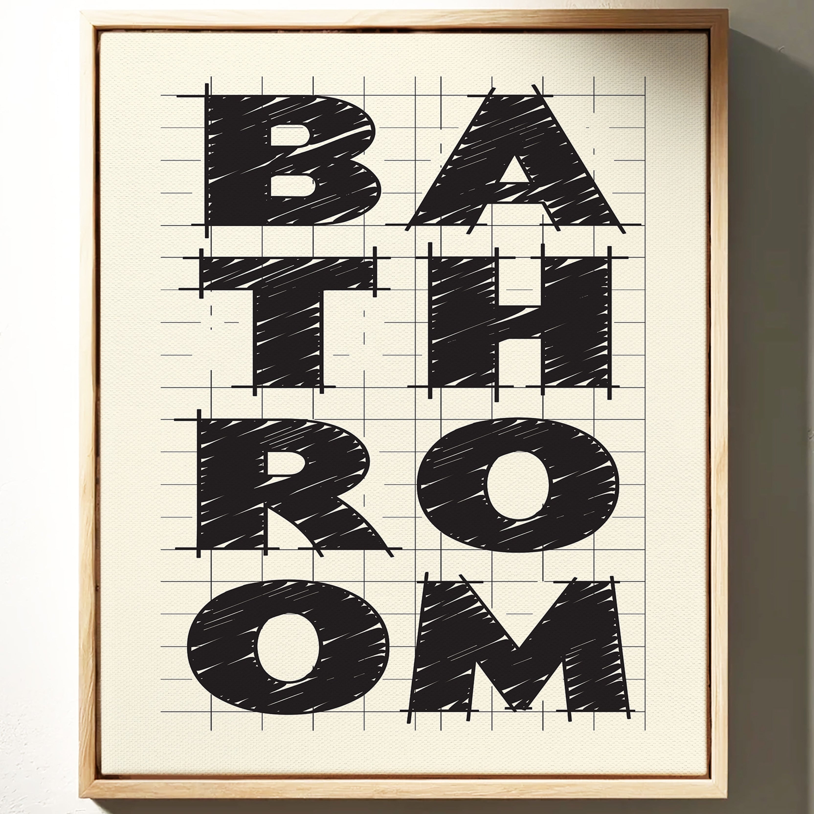 Bold lines intersect with purpose, creating a statement that commands attention through stark contrast and architectural precision. This piece from our Contemporary collection celebrates the raw energy of modern typography and design. The textured, hand-drawn quality of each letter brings warmth to the geometric framework, while the gridded background suggests both structure and possibility. Against cream-colored paper, black letters spell out 'BATHROOM' with confident strokes that feel both planned and spontaneous. Perfect for elevating a modern powder room or adding sophisticated charm to a master bath. The piece invites viewers to appreciate the artistry in everyday spaces.