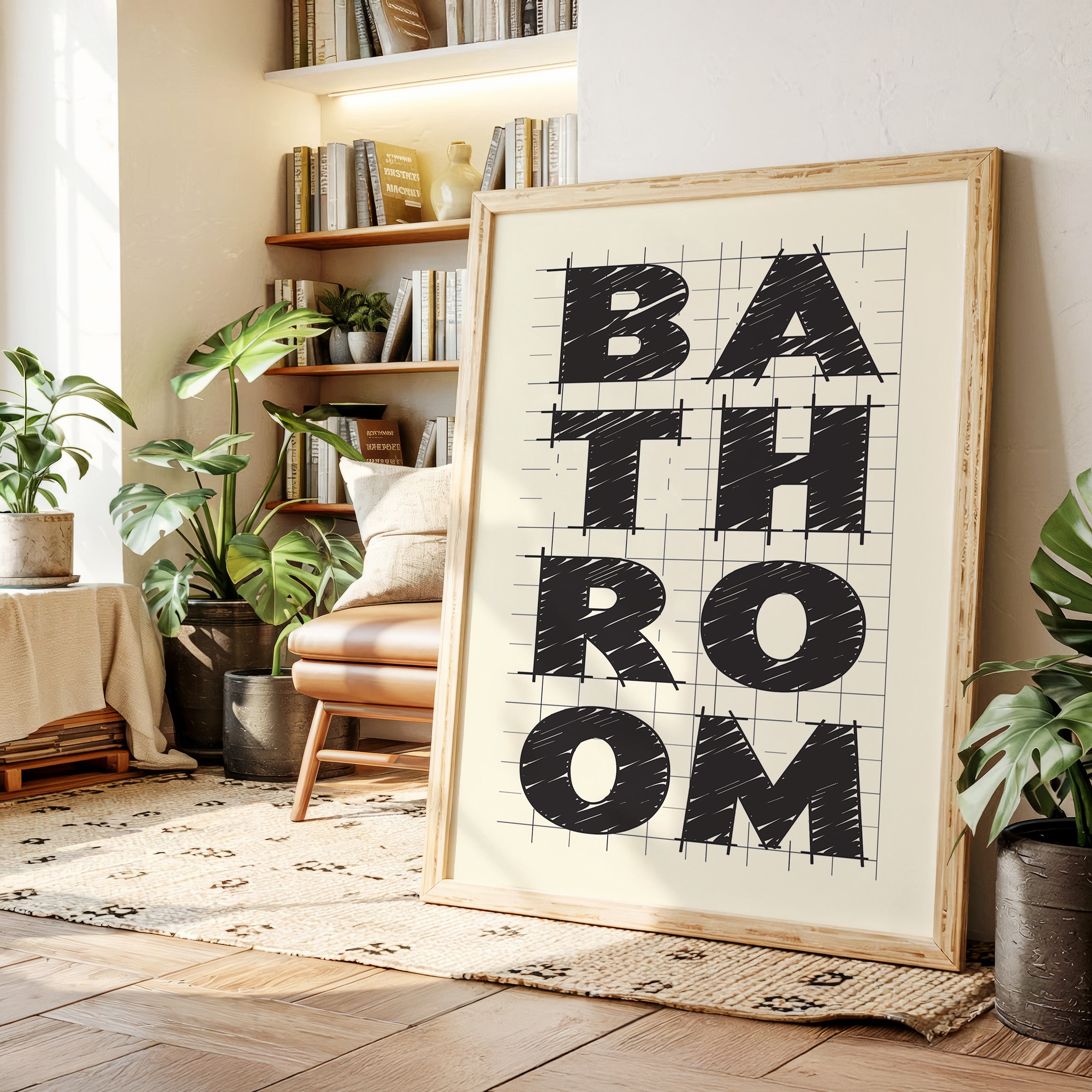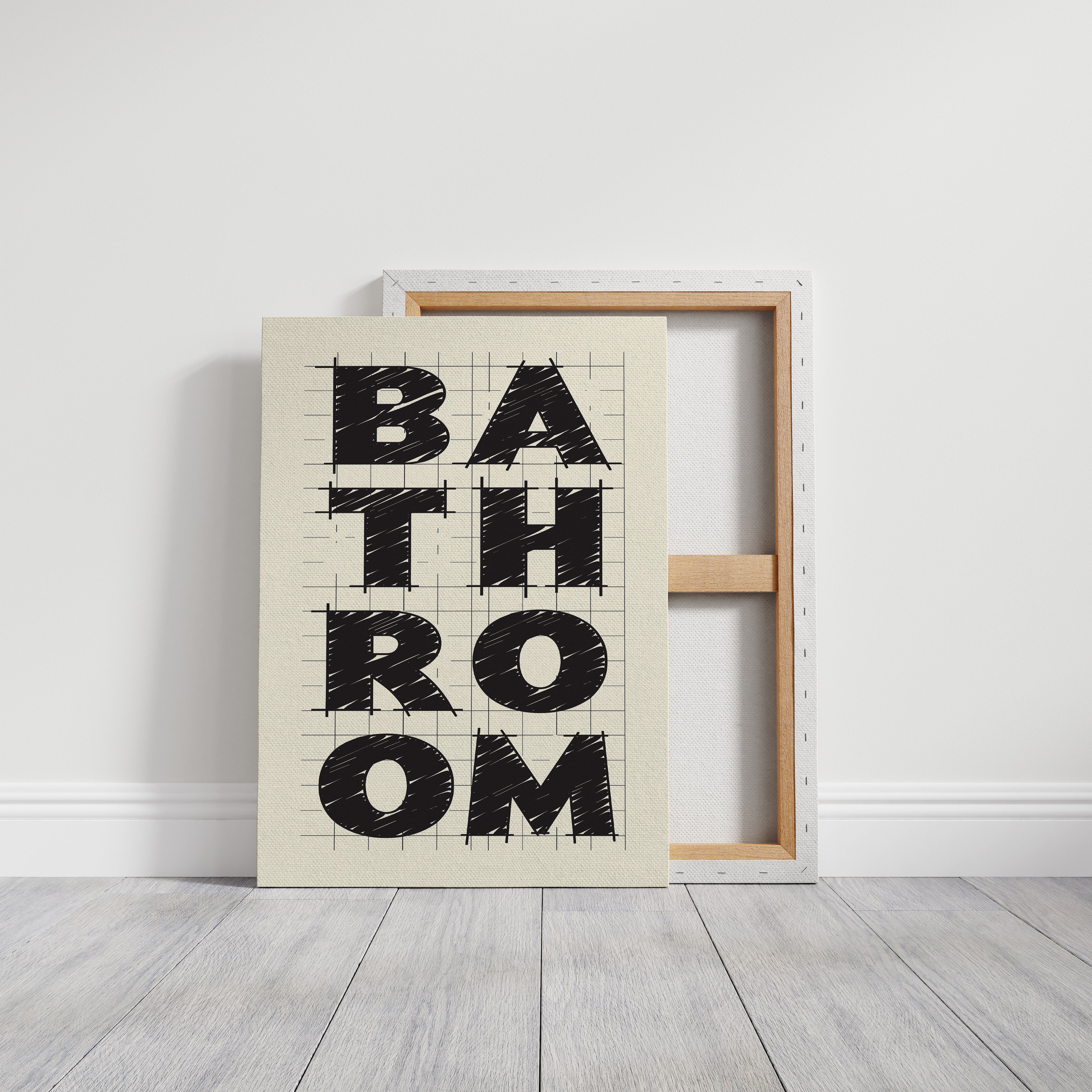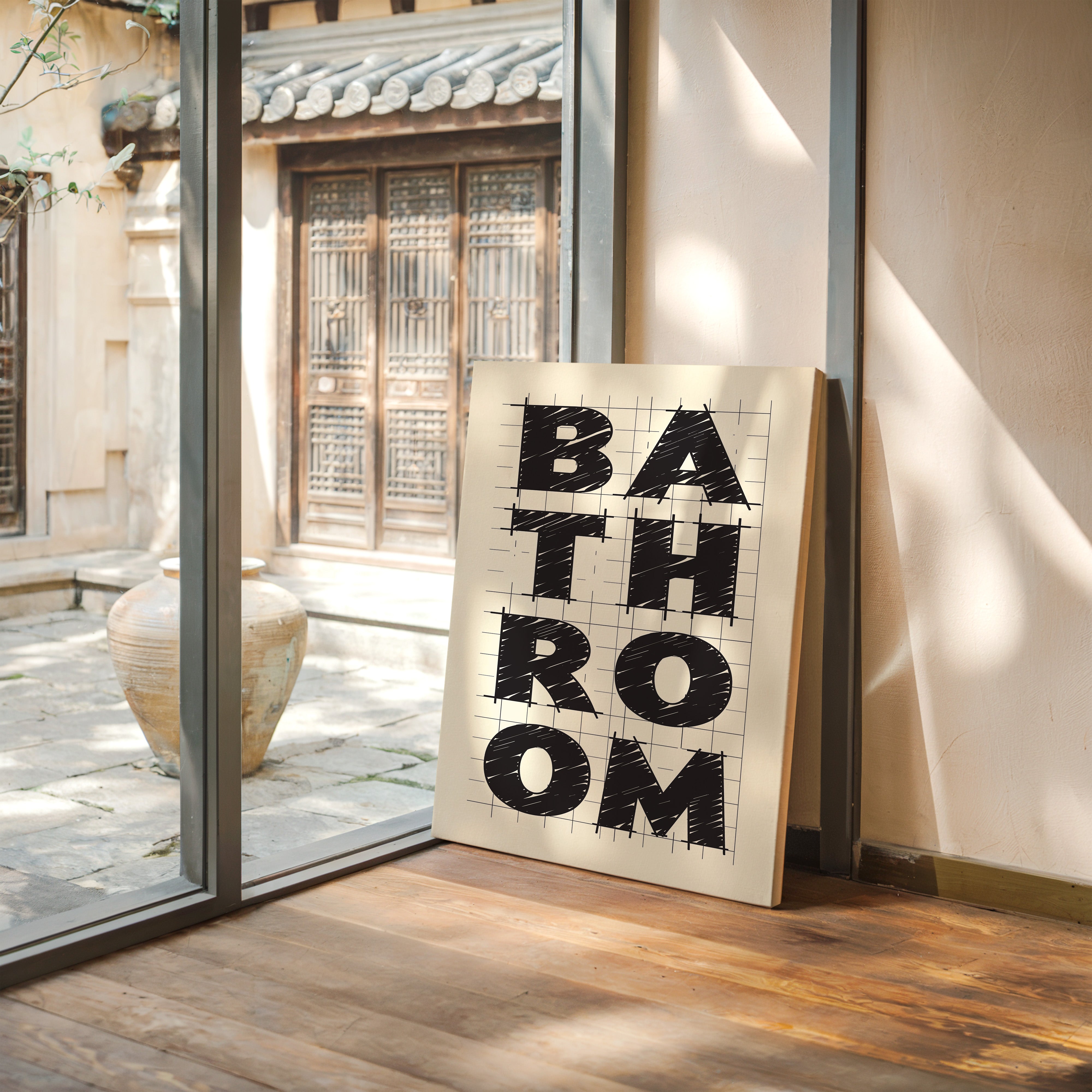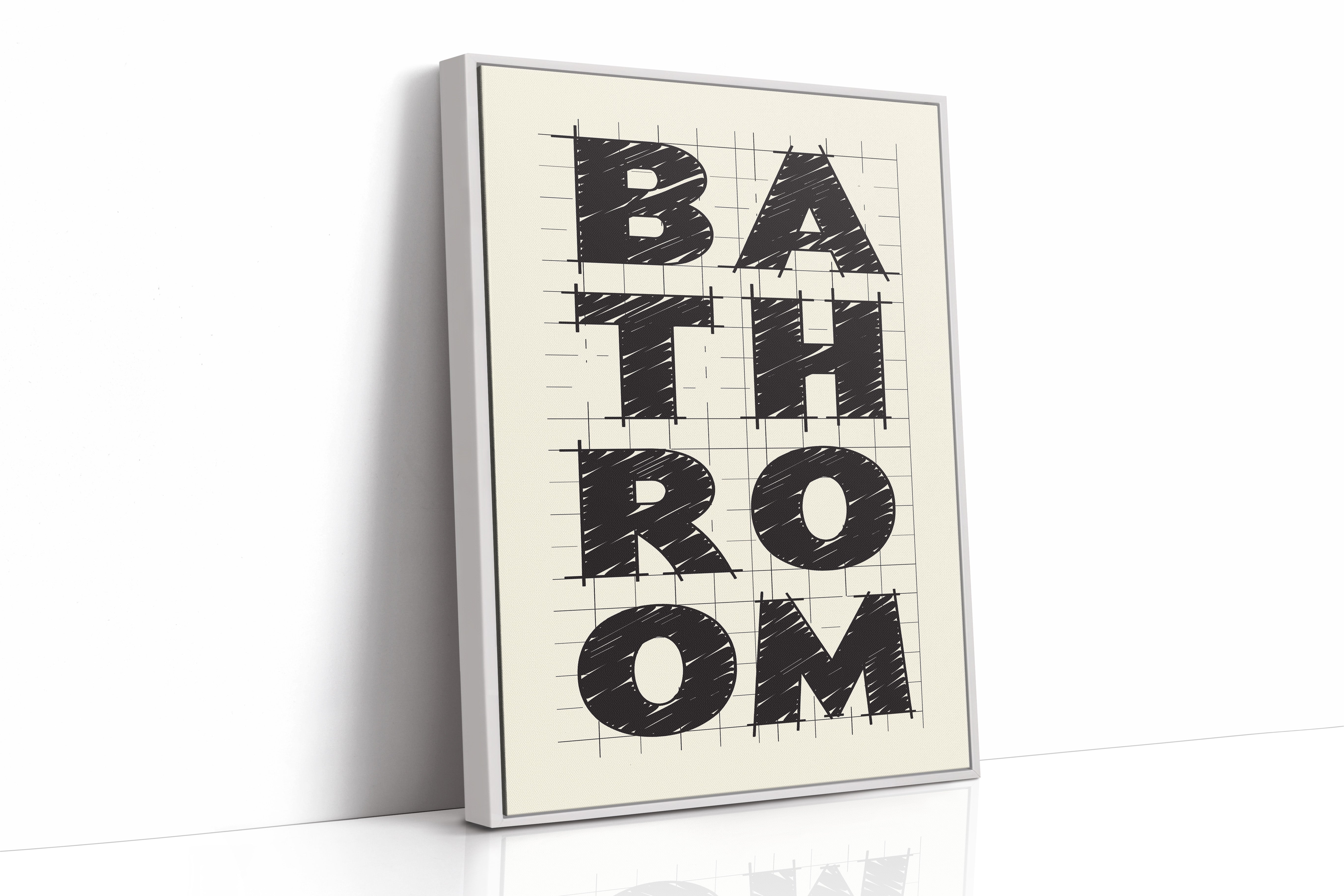 Bold lines intersect with purpose, creating a statement that commands attention through stark contrast and architectural precision. This piece from our Contemporary collection celebrates the raw energy of modern typography and design. The textured, hand-drawn quality of each letter brings warmth to the geometric framework, while the gridded background suggests both structure and possibility. Against cream-colored paper, black letters spell out 'BATHROOM' with confident strokes that feel both planned and spontaneous. Perfect for elevating a modern powder room or adding sophisticated charm to a master bath. The piece invites viewers to appreciate the artistry in everyday spaces.