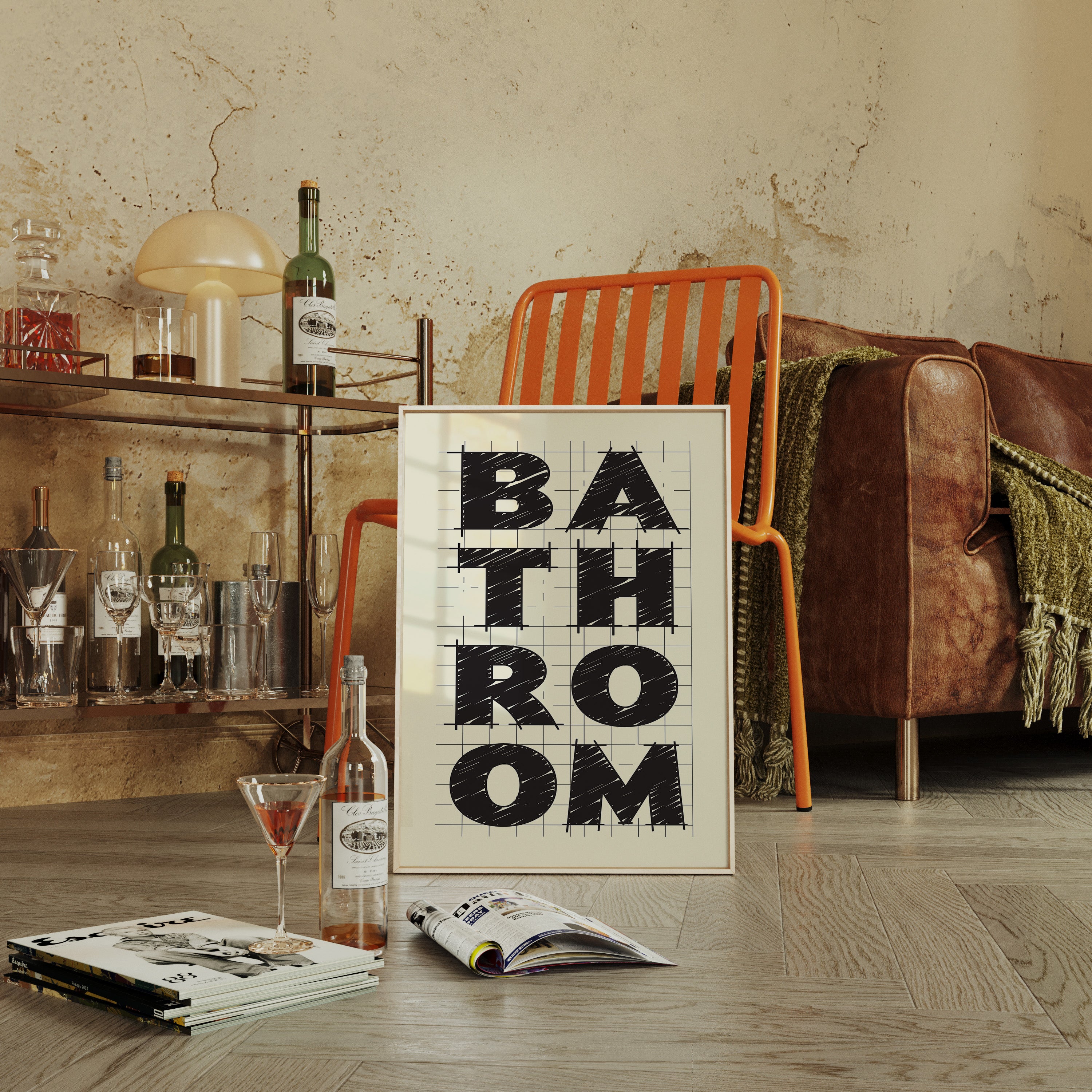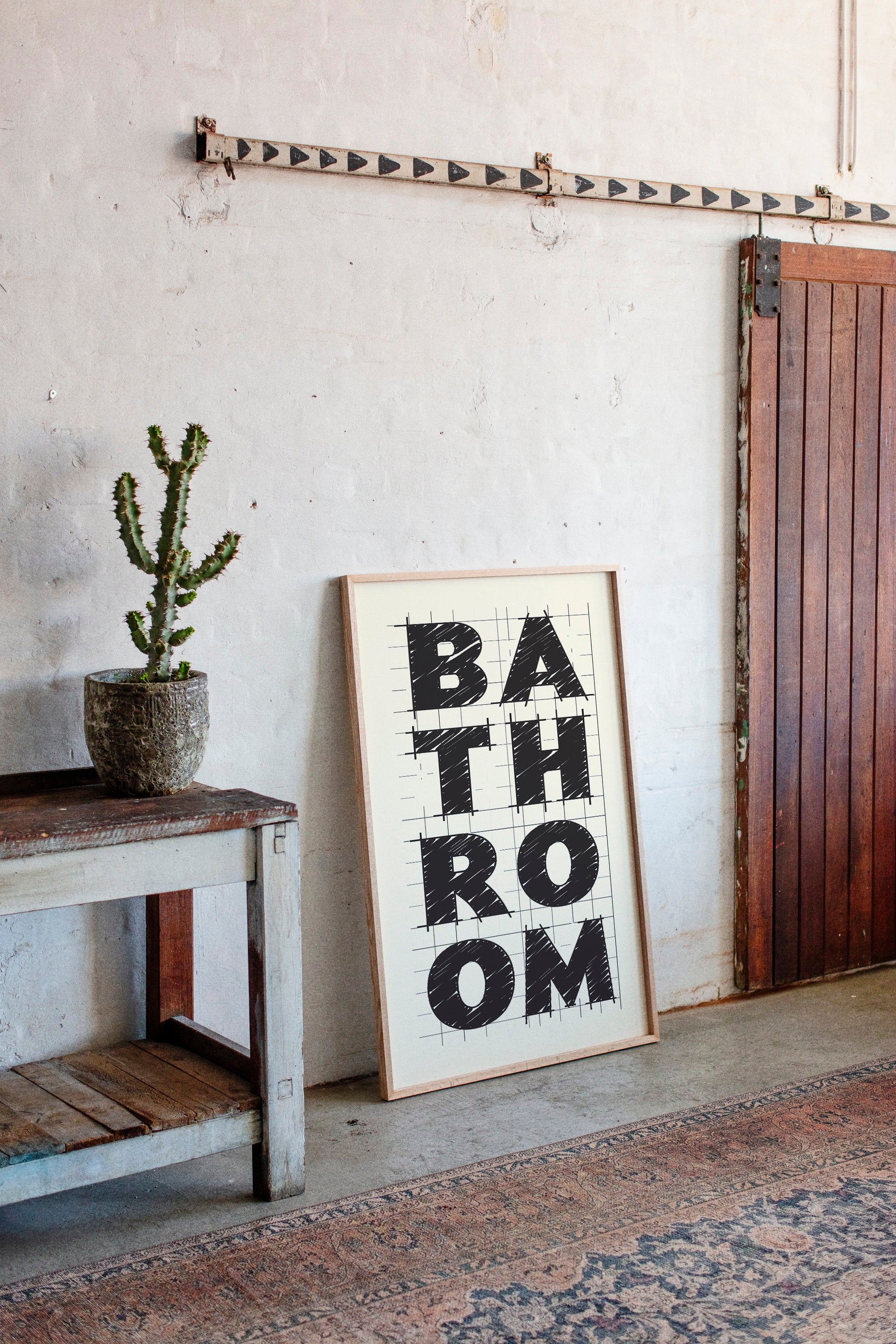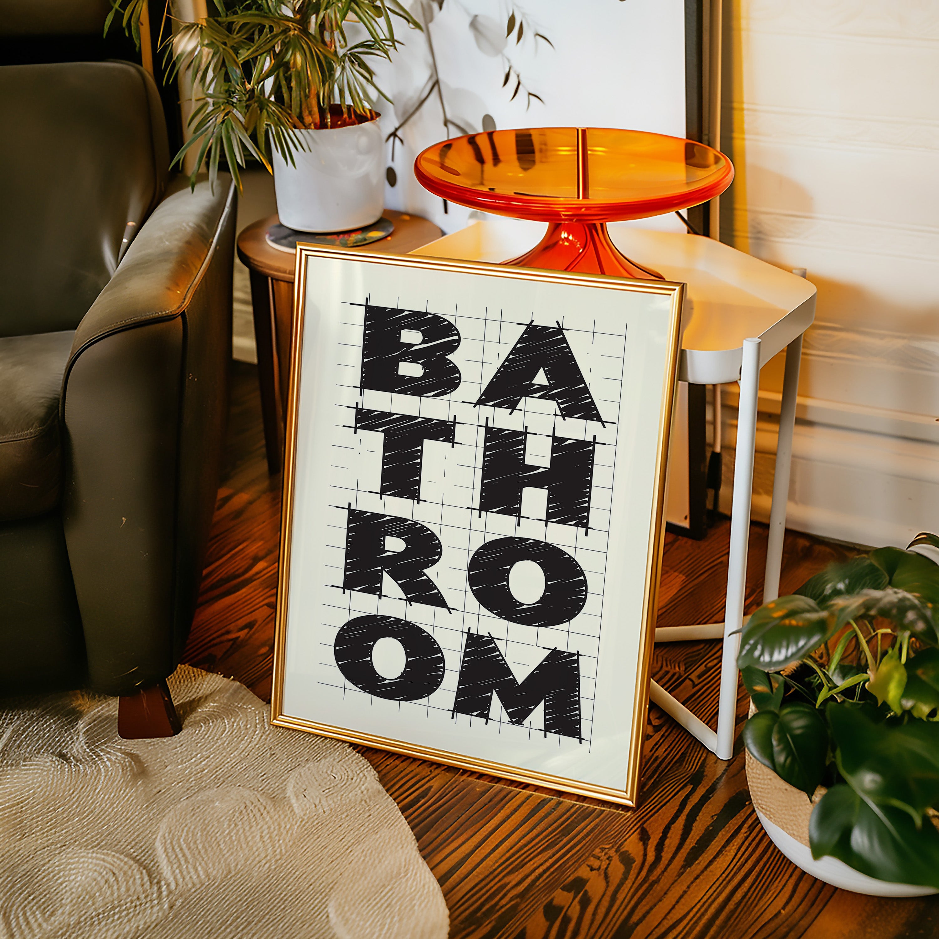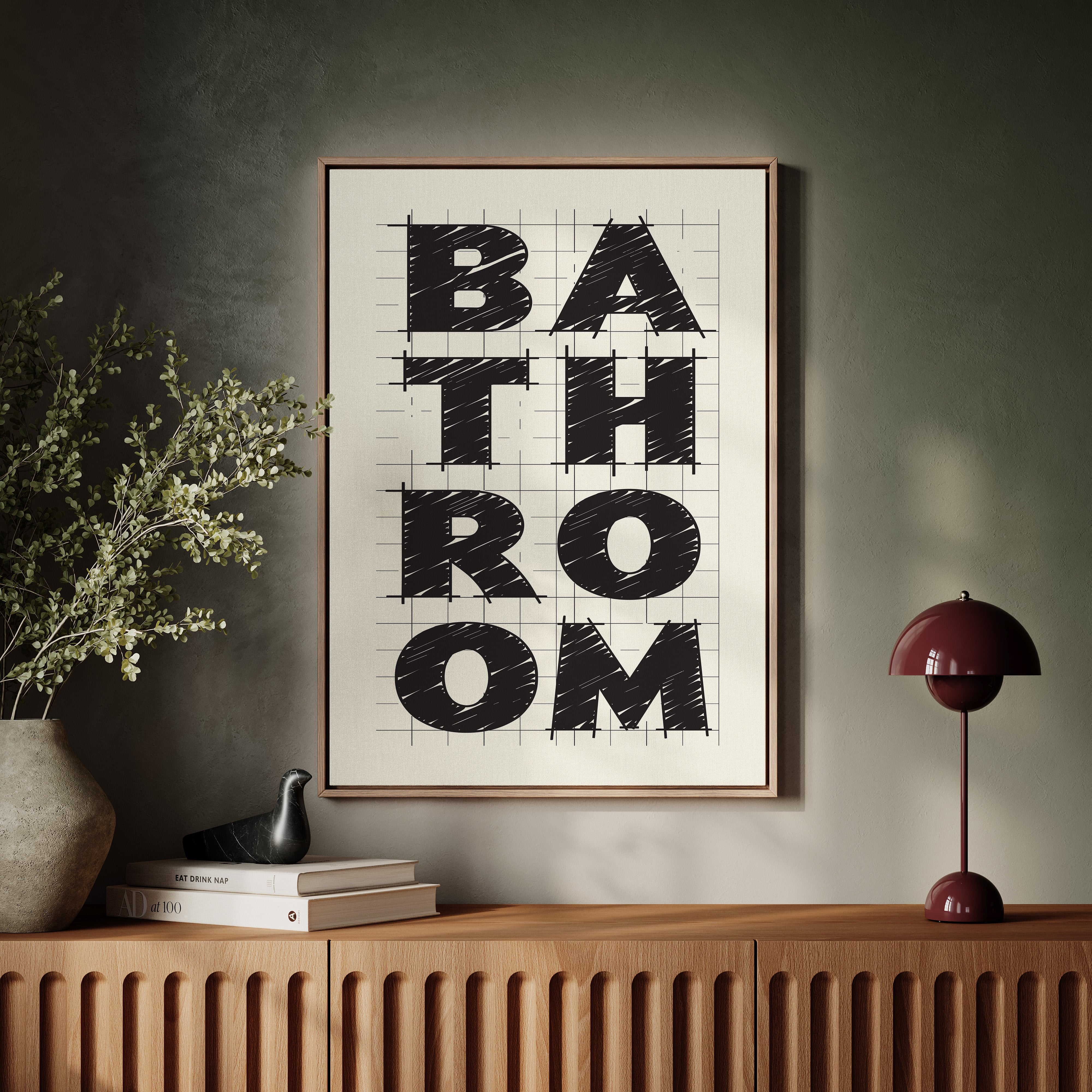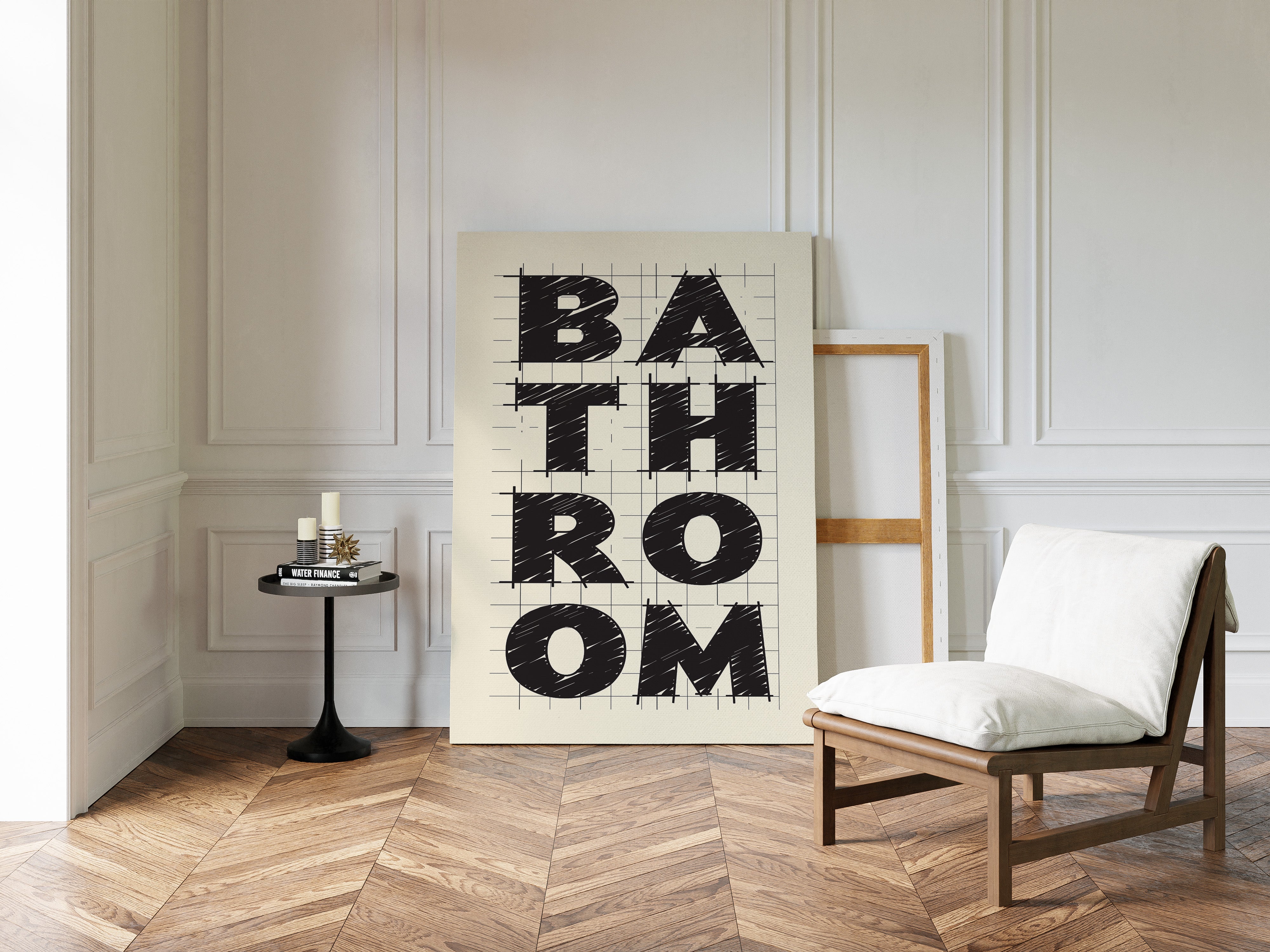 Bold lines intersect with purpose, creating a statement that commands attention through stark contrast and architectural precision. This piece from our Contemporary collection celebrates the raw energy of modern typography and design. The textured, hand-drawn quality of each letter brings warmth to the geometric framework, while the gridded background suggests both structure and possibility. Against cream-colored paper, black letters spell out 'BATHROOM' with confident strokes that feel both planned and spontaneous. Perfect for elevating a modern powder room or adding sophisticated charm to a master bath. The piece invites viewers to appreciate the artistry in everyday spaces.