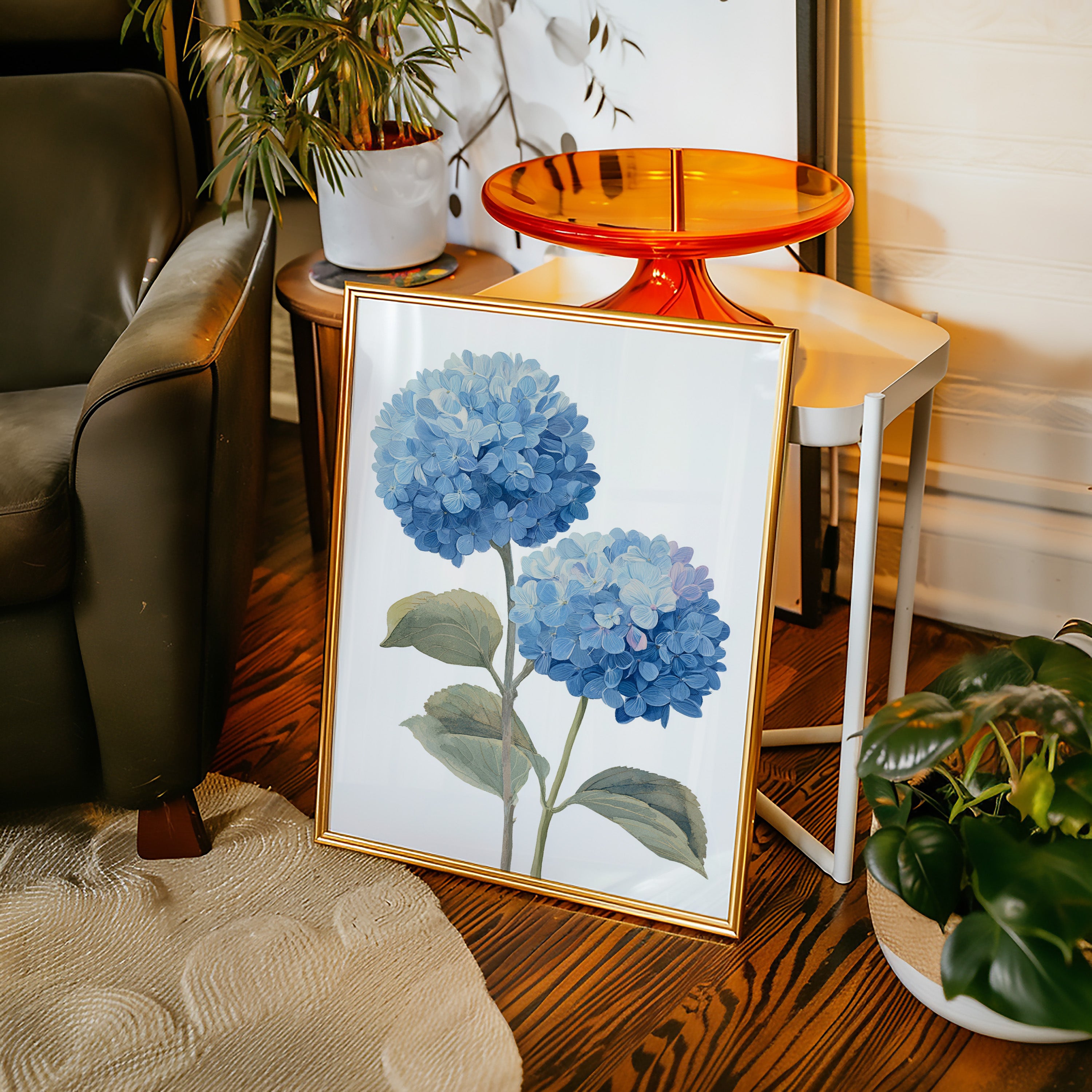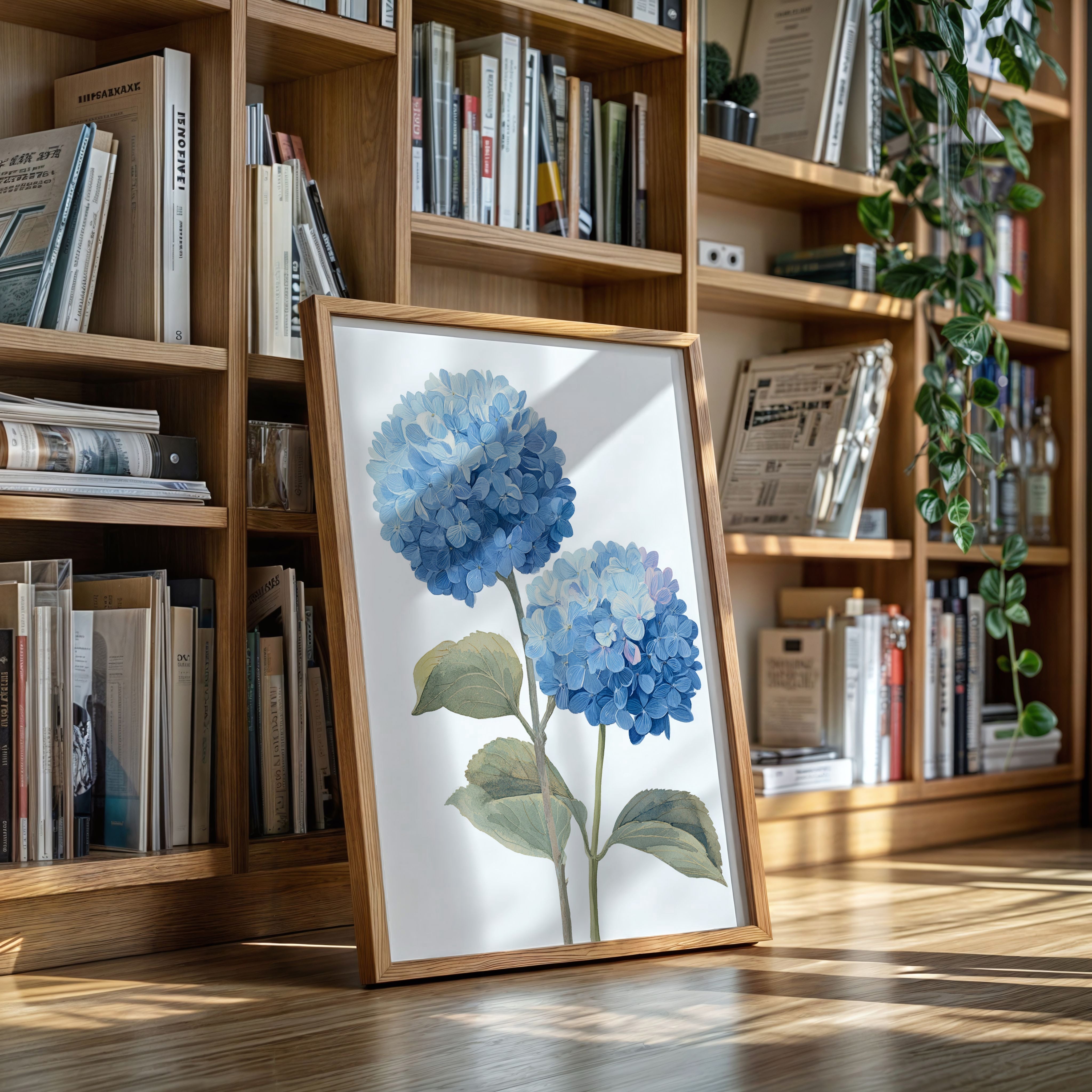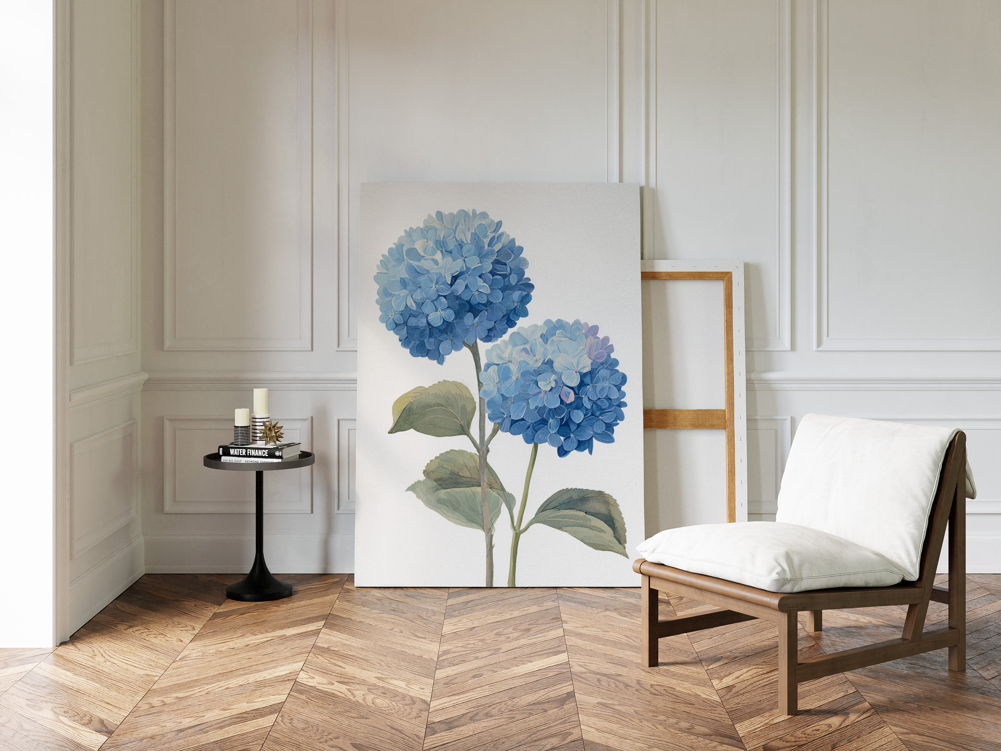 In a gentle embrace of summer, two hydrangeas stand tall, their blooms a cascade of cerulean hues, capturing the essence of tranquil afternoons. This piece reflects the artisanal care and attention to detail found in nature's palette. Each petal unfurls with delicate grace, radiating a serene beauty that invites contemplation‚soft blues dance with hints of lavender, while lush green leaves cradle the blossoms, grounding their ethereal presence. Ideal for a sunlit corner in a cozy living room or a serene reading nook, where calmness reigns.