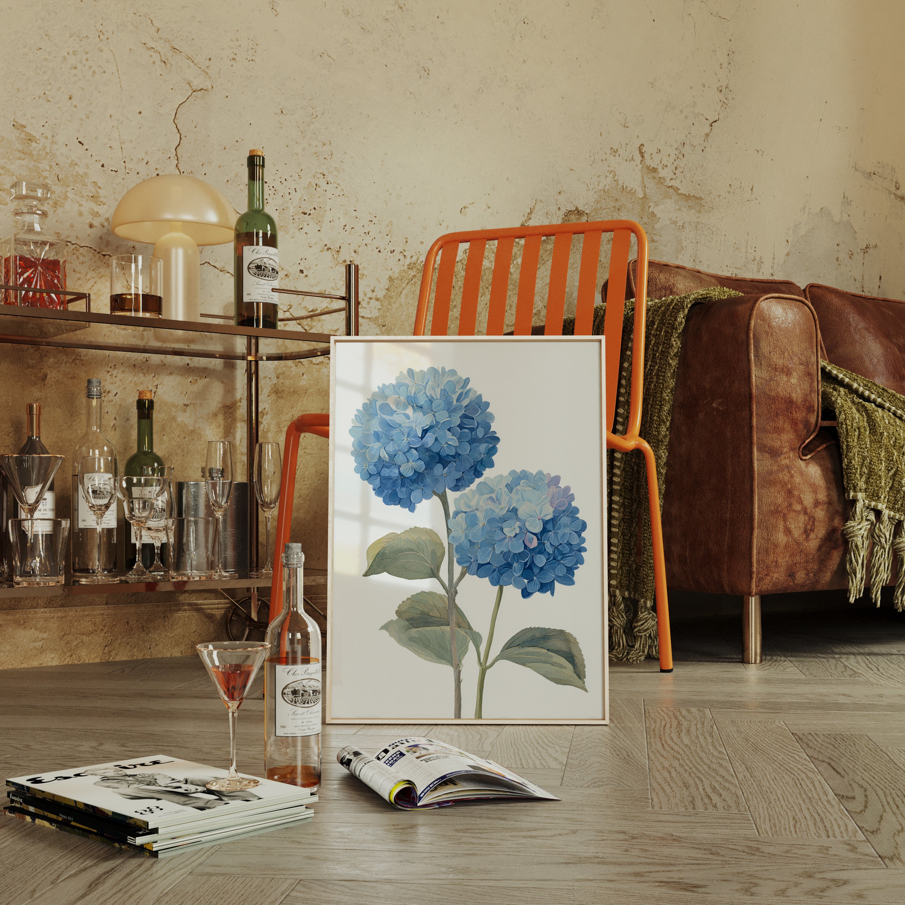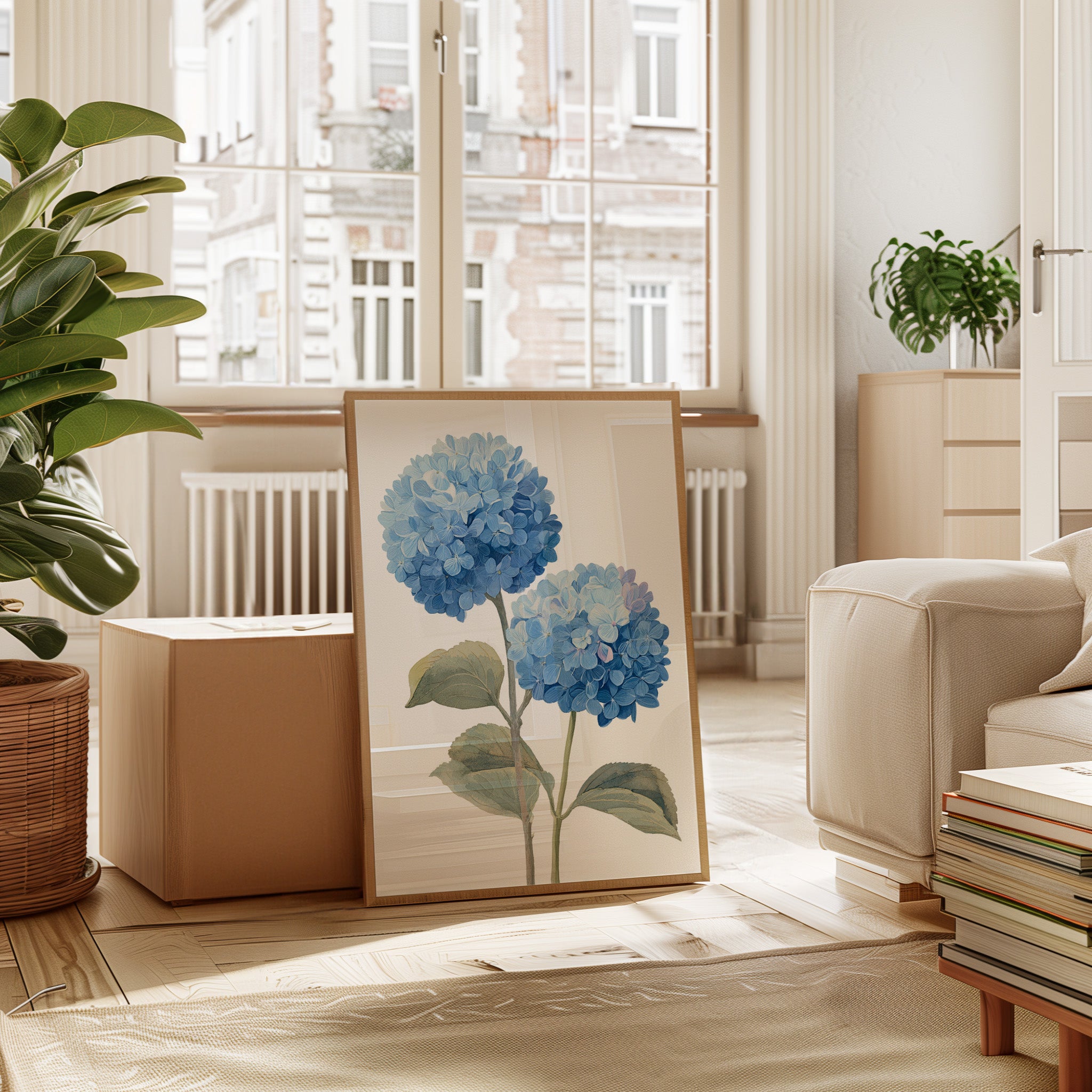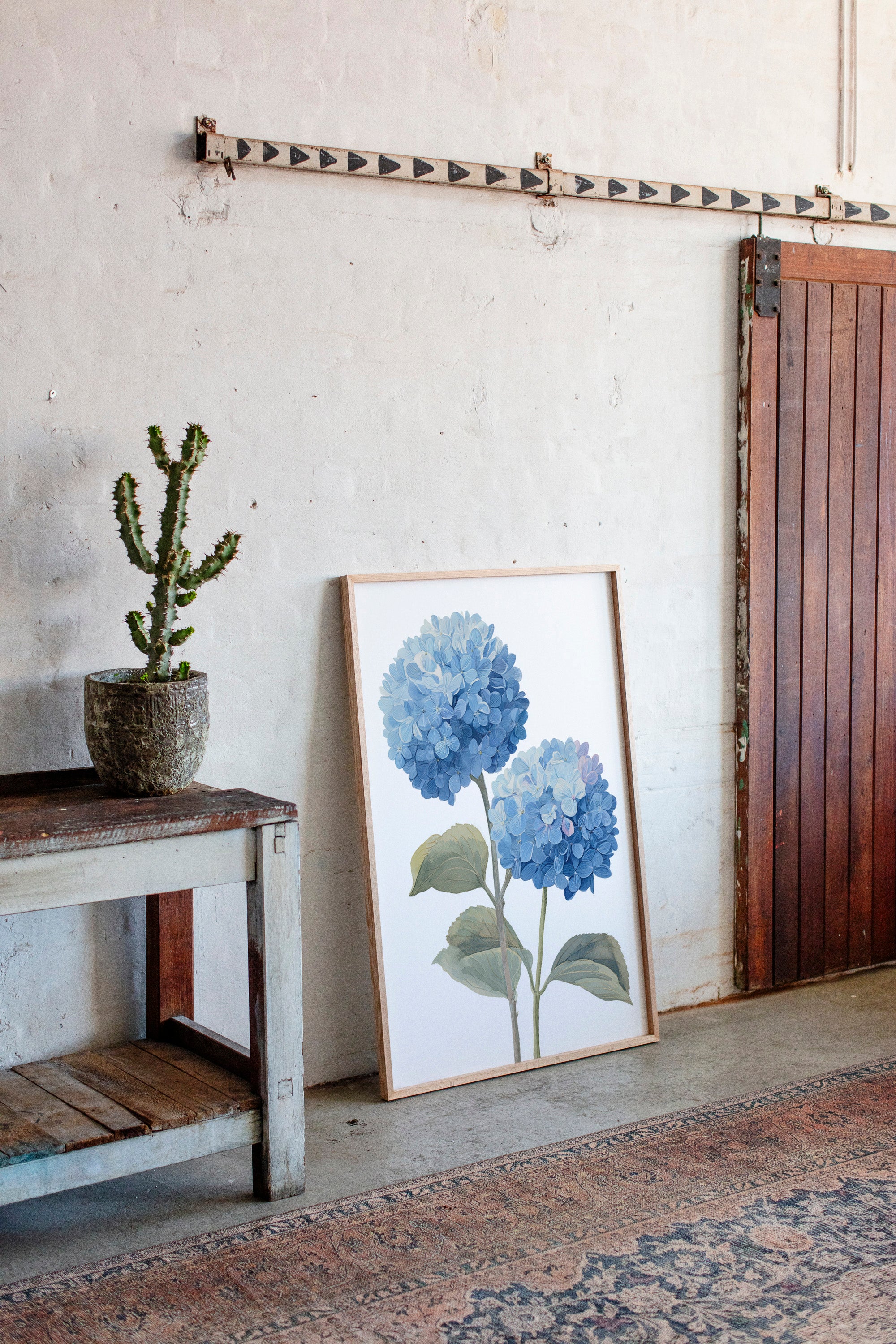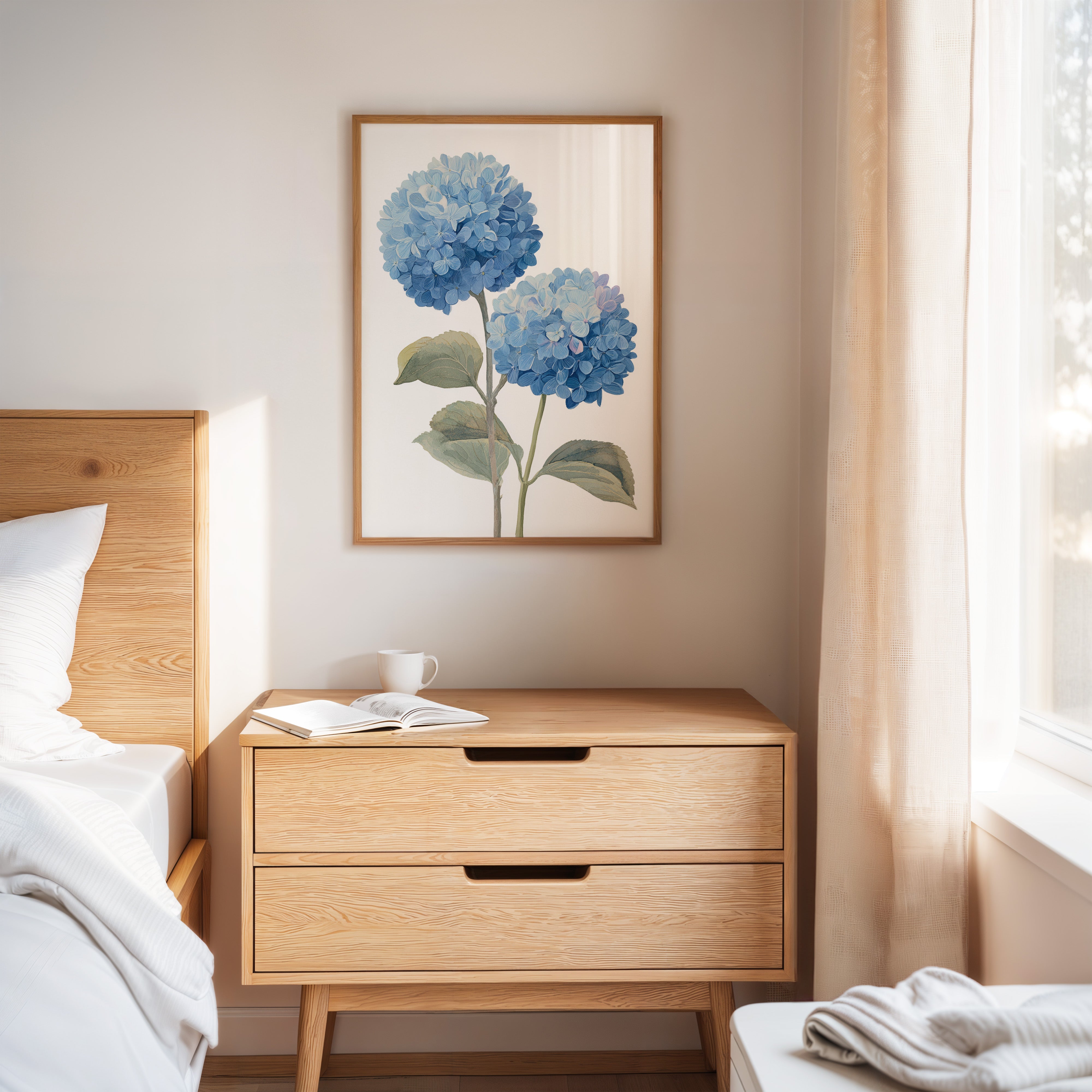 In a gentle embrace of summer, two hydrangeas stand tall, their blooms a cascade of cerulean hues, capturing the essence of tranquil afternoons. This piece reflects the artisanal care and attention to detail found in nature's palette. Each petal unfurls with delicate grace, radiating a serene beauty that invites contemplation‚soft blues dance with hints of lavender, while lush green leaves cradle the blossoms, grounding their ethereal presence. Ideal for a sunlit corner in a cozy living room or a serene reading nook, where calmness reigns.