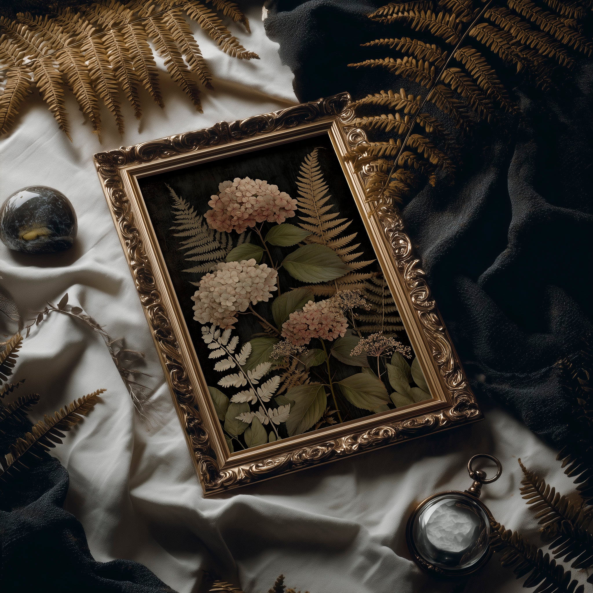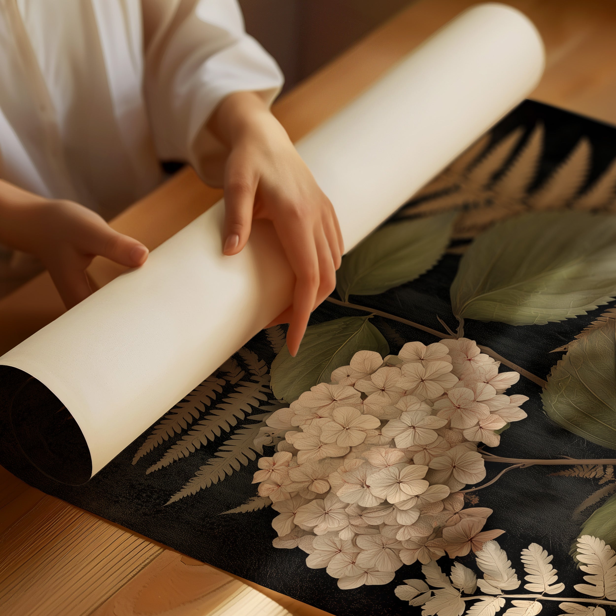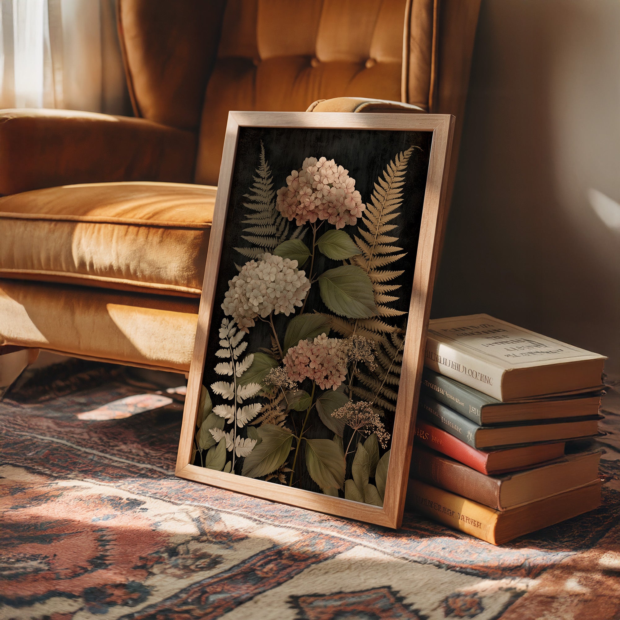 Delicate hydrangeas emerge from darkness, their soft pink petals capturing light like memories preserved in time. Feathery ferns frame the blooms with golden-bronze fronds, creating a botanical composition that balances strength and fragility against the rich, velvety backdrop. This elegant botanical study brings understated luxury to sophisticated spaces, creating a striking focal point against dramatic dark walls.