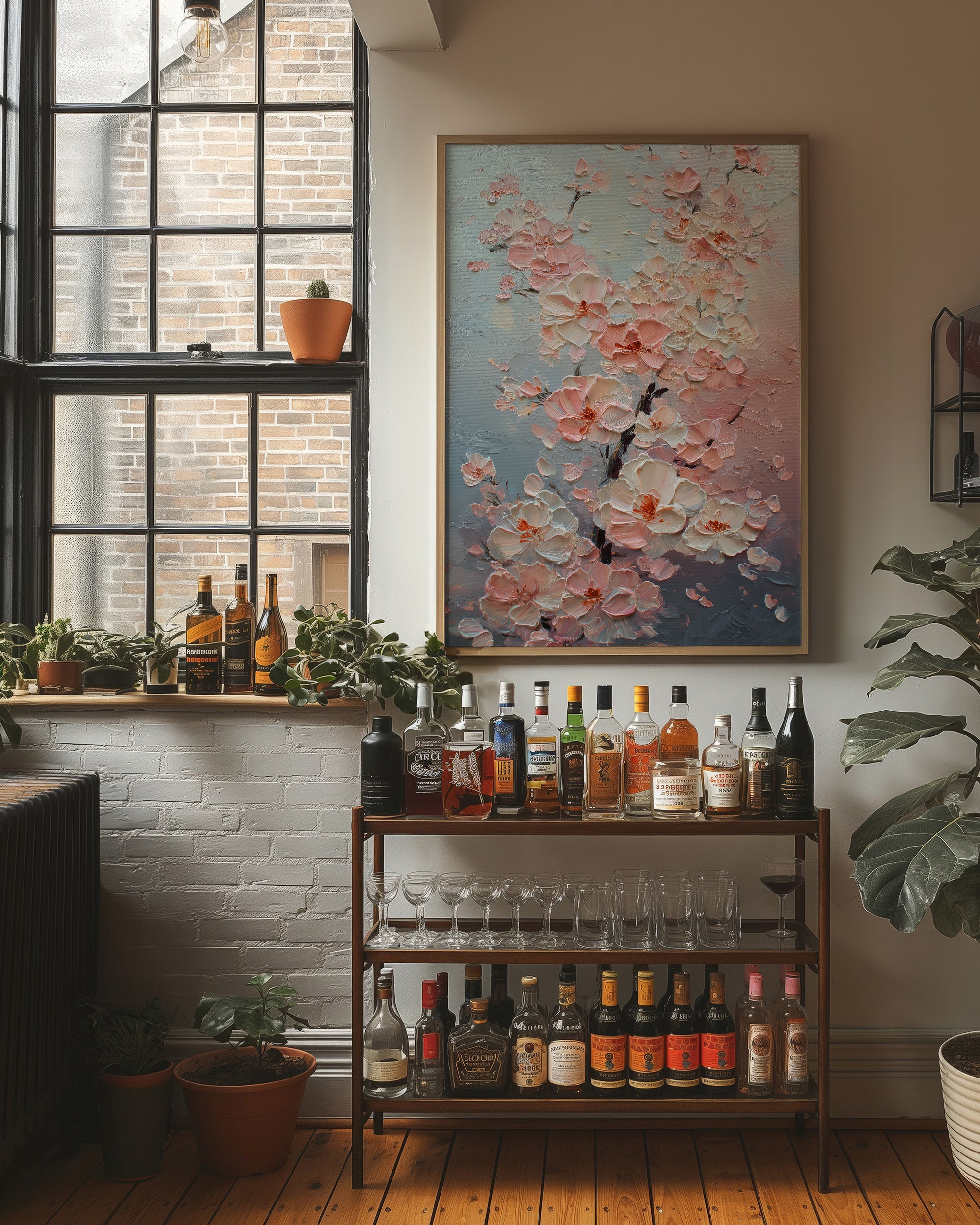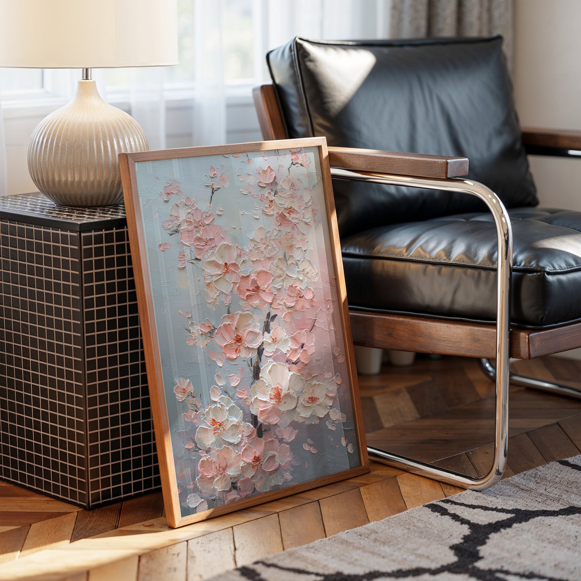 Delicate pink blossoms emerge from a misty blue background, their textured petals catching the soft light like morning frost. The impasto technique creates a sculptural quality, with layers of paint building dimensional flowers that seem to float off the canvas. This contemporary piece transforms a modern interior into a perpetual springtime, where cherry blossoms remain eternally in bloom. The artwork's generous scale makes a striking statement against light wooden floors and crisp white walls, creating an elegant focal point that bridges nature and modern design. Perfect for brightening a minimalist living space or adding romantic sophistication to a master bedroom.