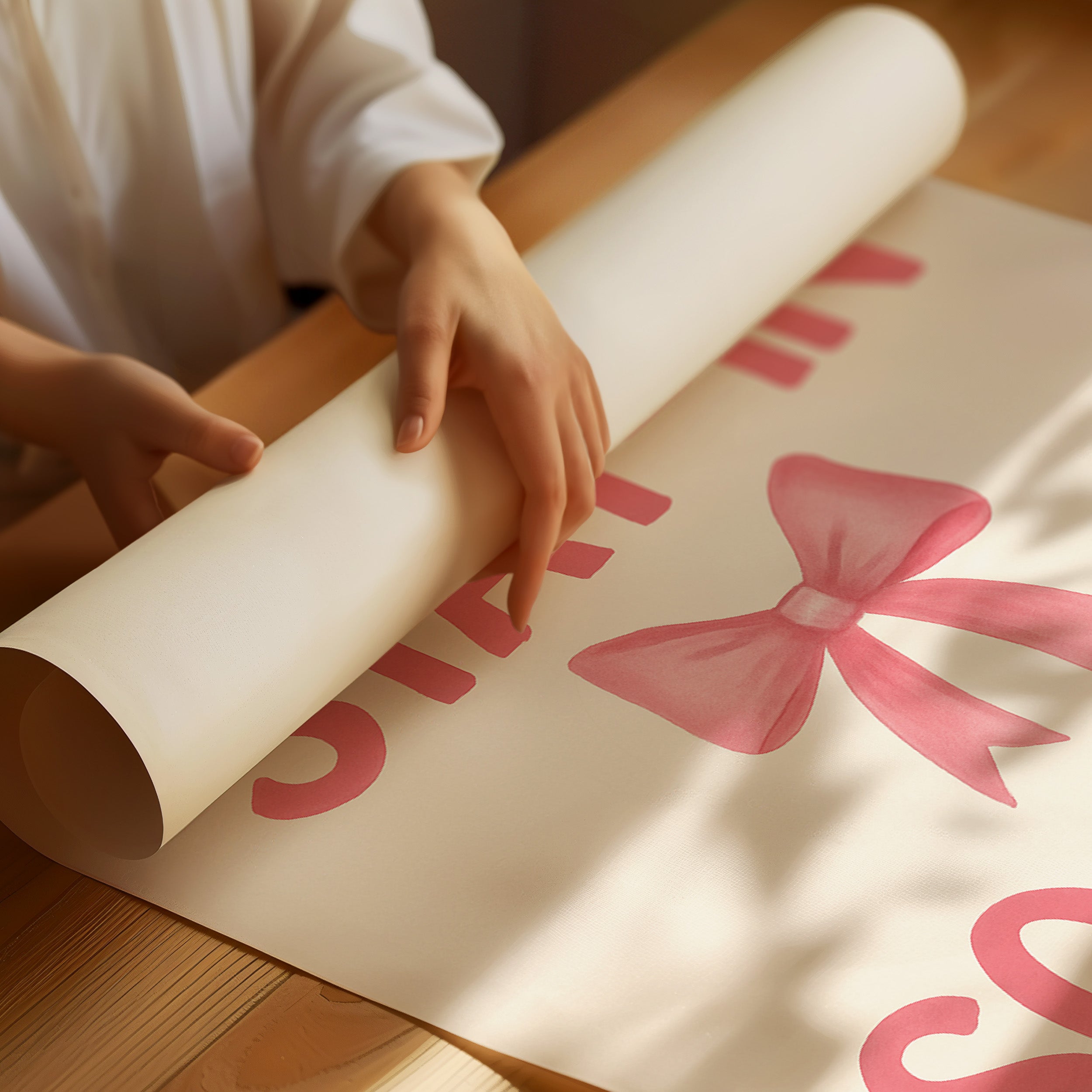 A minimalist statement piece featuring the phrase "STAY-IN SOCIETY" rendered in soft pink lettering against a cream background. The text is separated by a delicately painted bow ribbon in the same rosy hue, creating a charming visual break between the words. This contemporary artwork embodies the introvert's anthem, celebrating the joy of choosing home comforts over social obligations. The watercolor-like quality of the pink typography gives it a gentle, approachable feel while making a bold declaration about modern social preferences.
