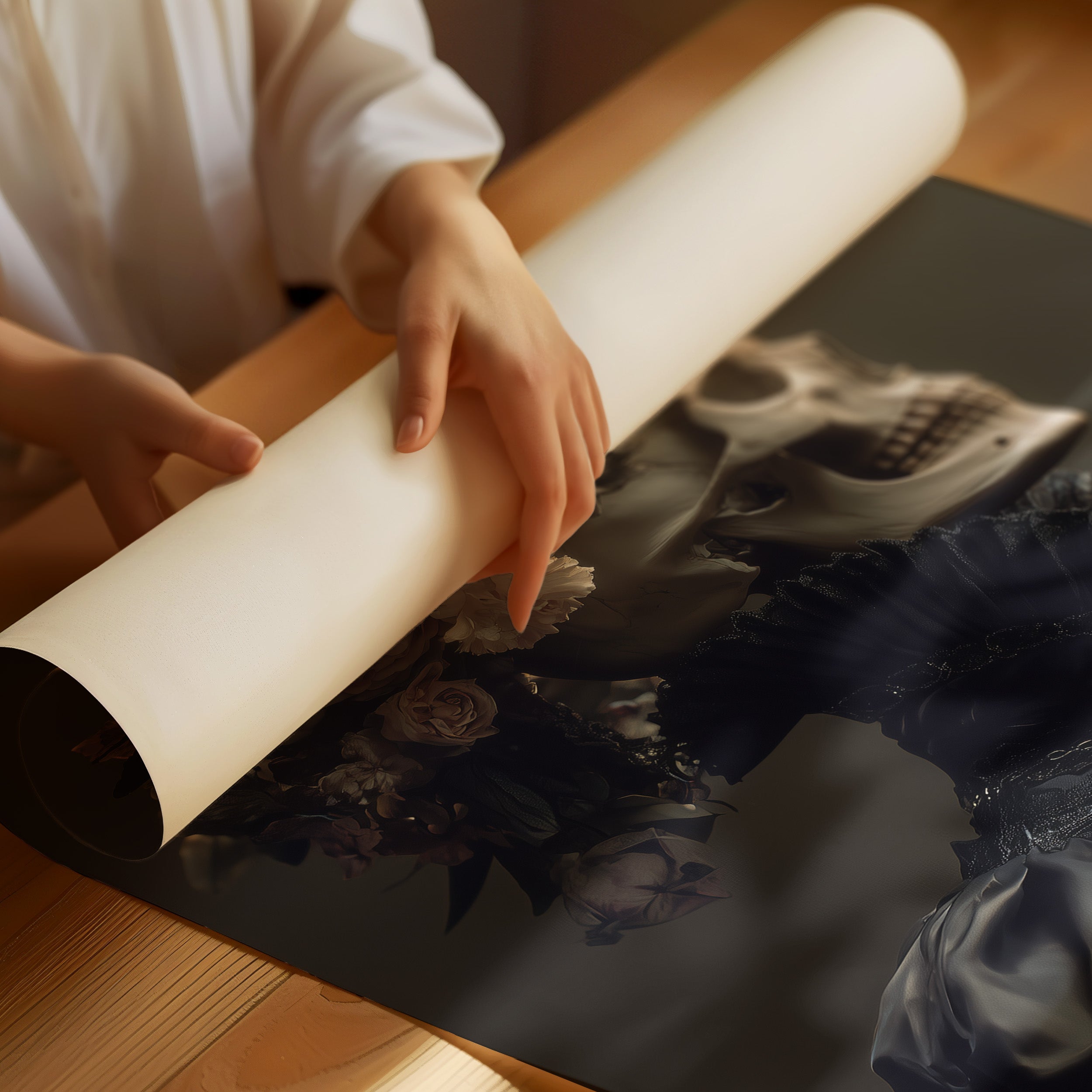 A haunting juxtaposition where soft, blush-toned roses cascade over the stark white of a skull, creating a moment where beauty and mortality dance together. The delicate petals and Victorian-inspired attire speak to a timeless elegance, while the monochromatic palette is punctuated only by the gentle pink blooms. This contemporary vanitas captures the essence of life's fleeting nature with a darkly romantic sensibility.