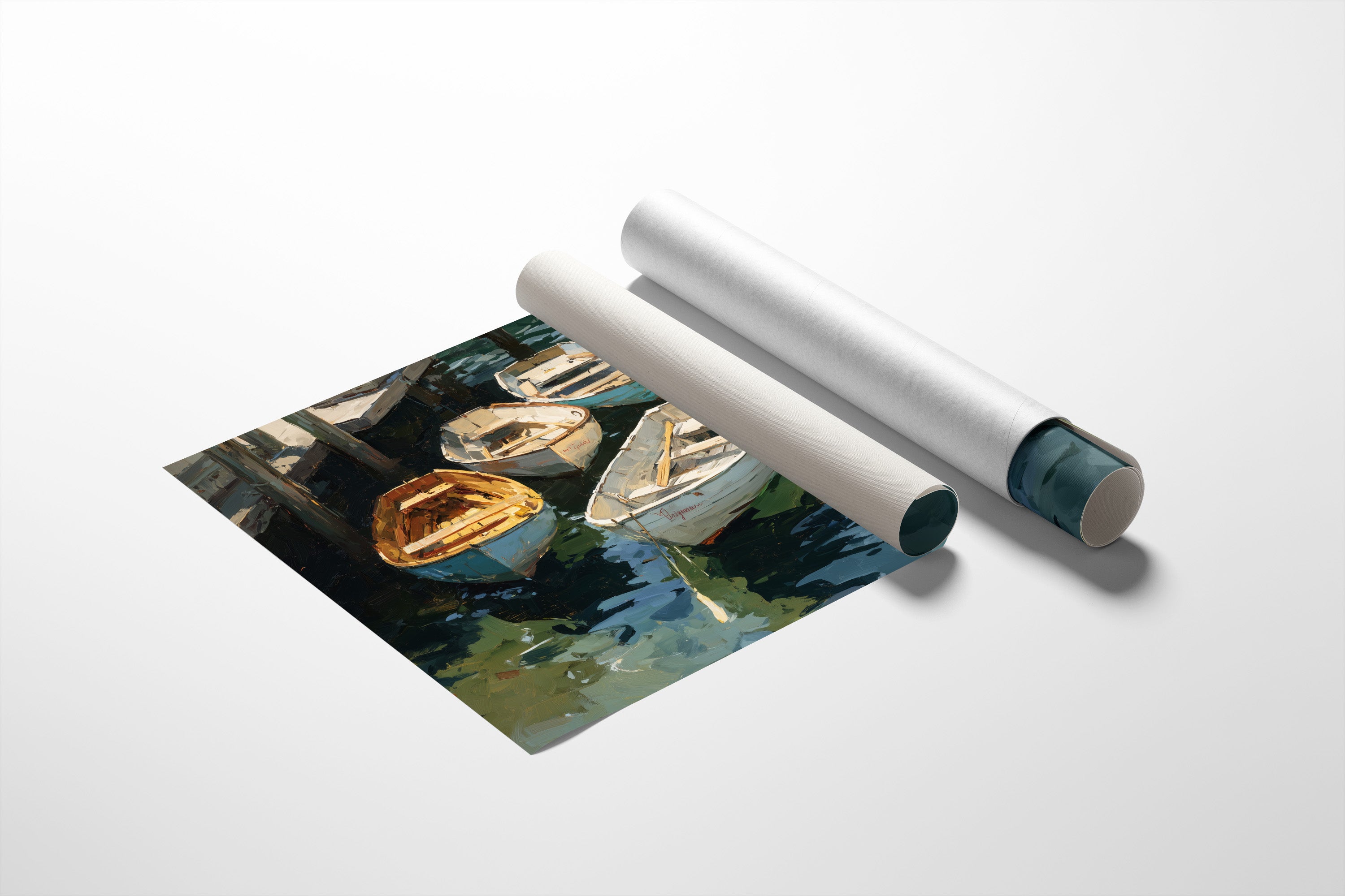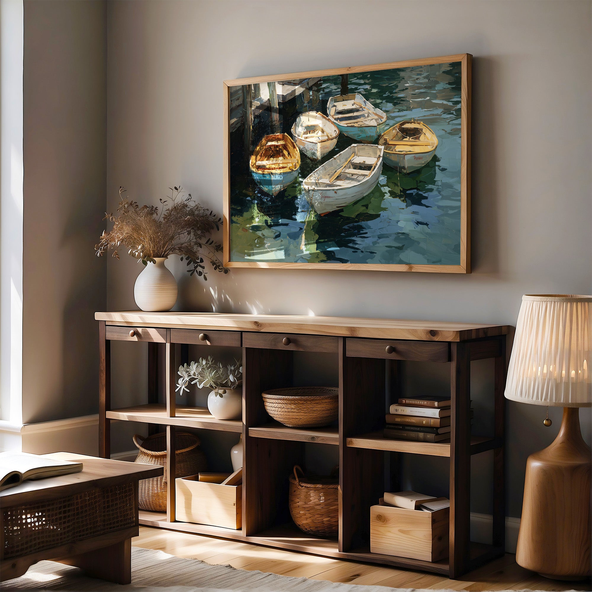 Small wooden vessels float peacefully on rippling turquoise waters, their weathered hulls telling stories of countless journeys. The play of light creates a mesmerizing dance across the water's surface, highlighting the contrast between the warm amber tones of the boats and the cool depths beneath them. This serene harbor scene invites quiet contemplation of coastal life and maritime tradition.