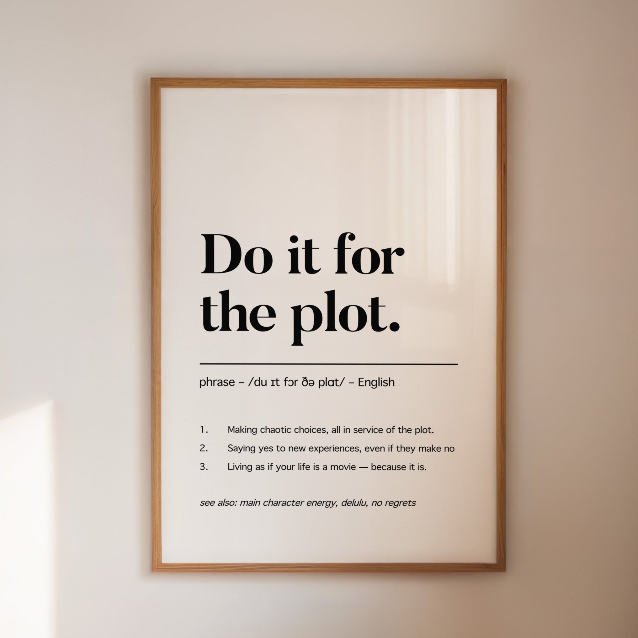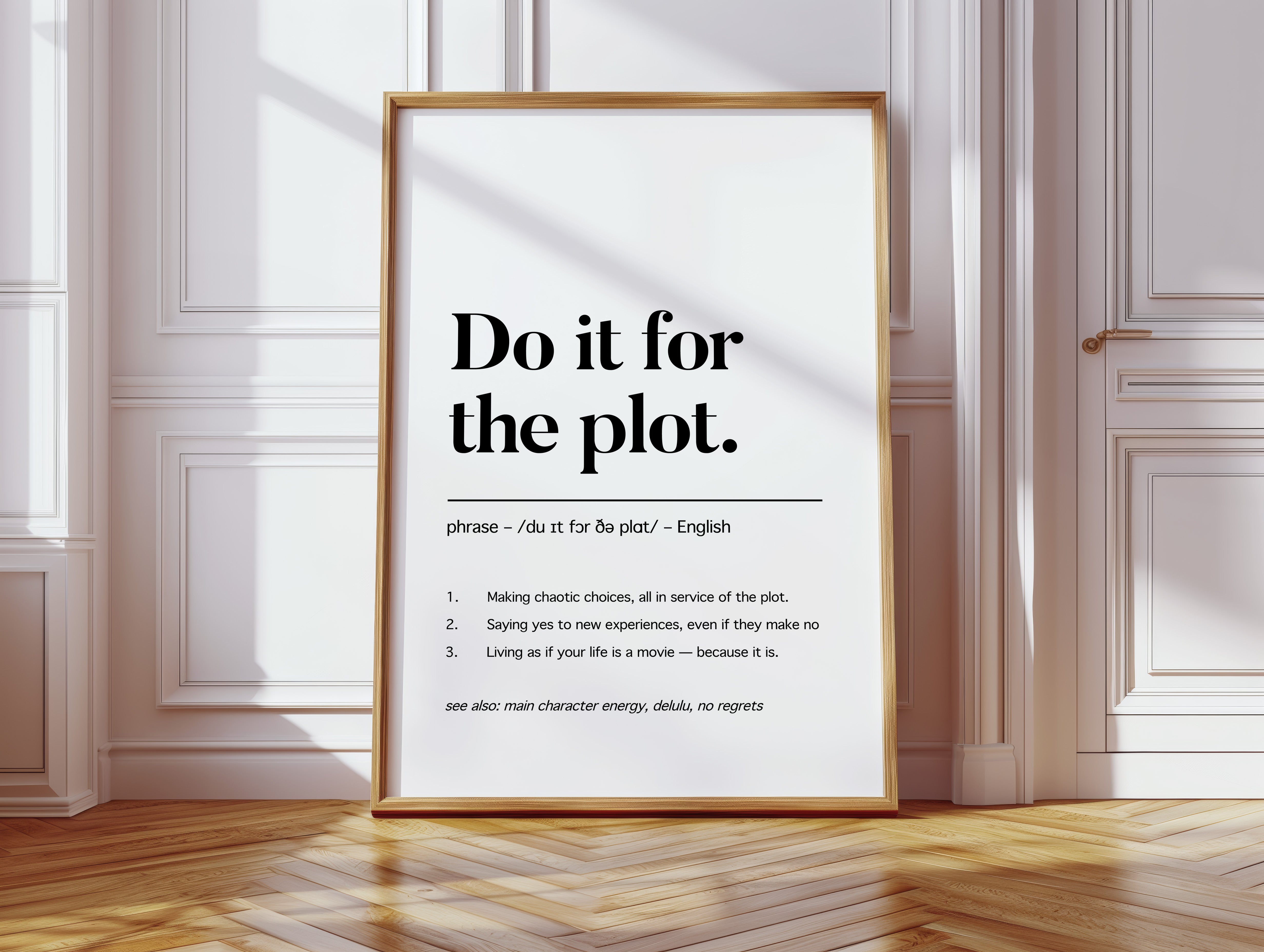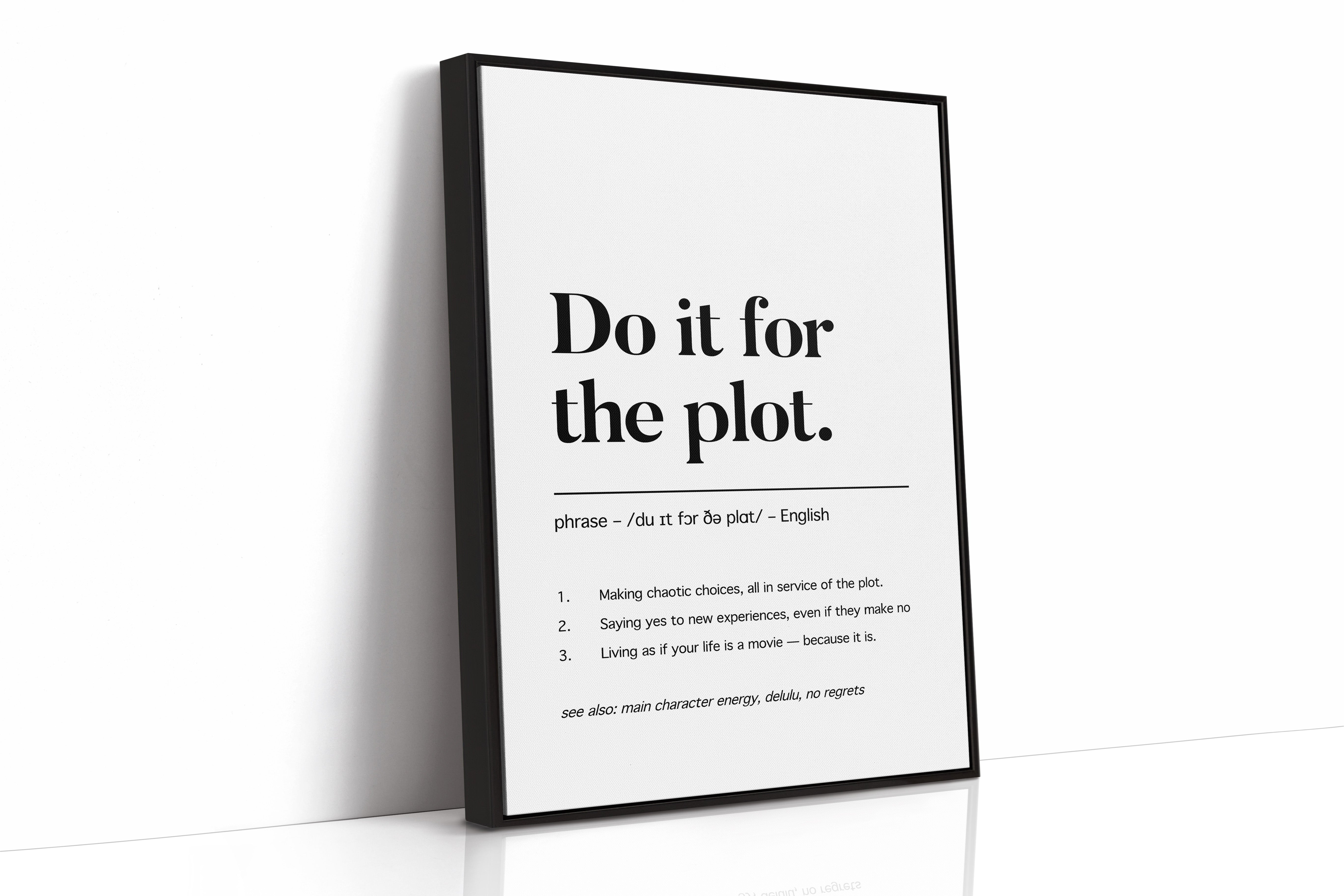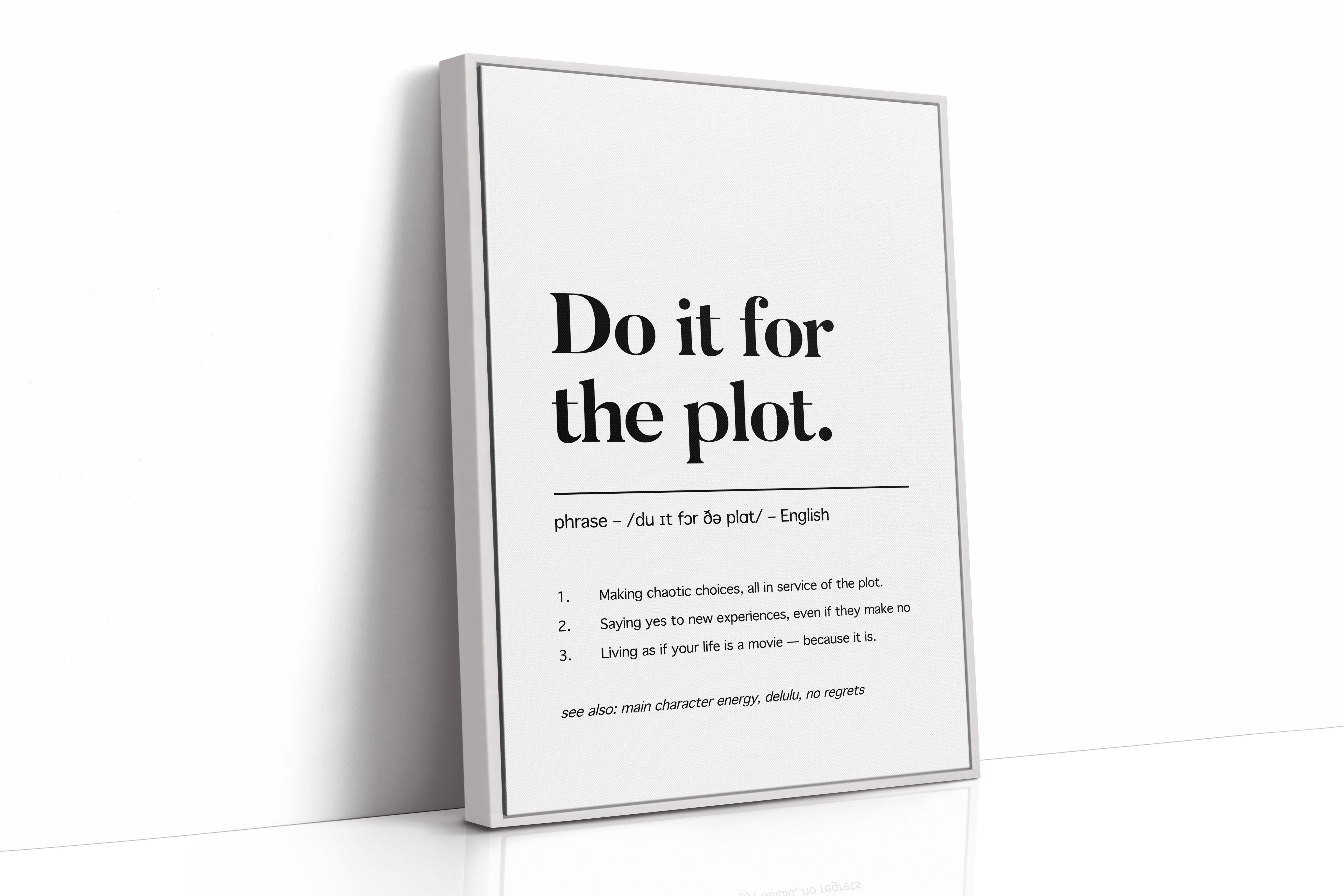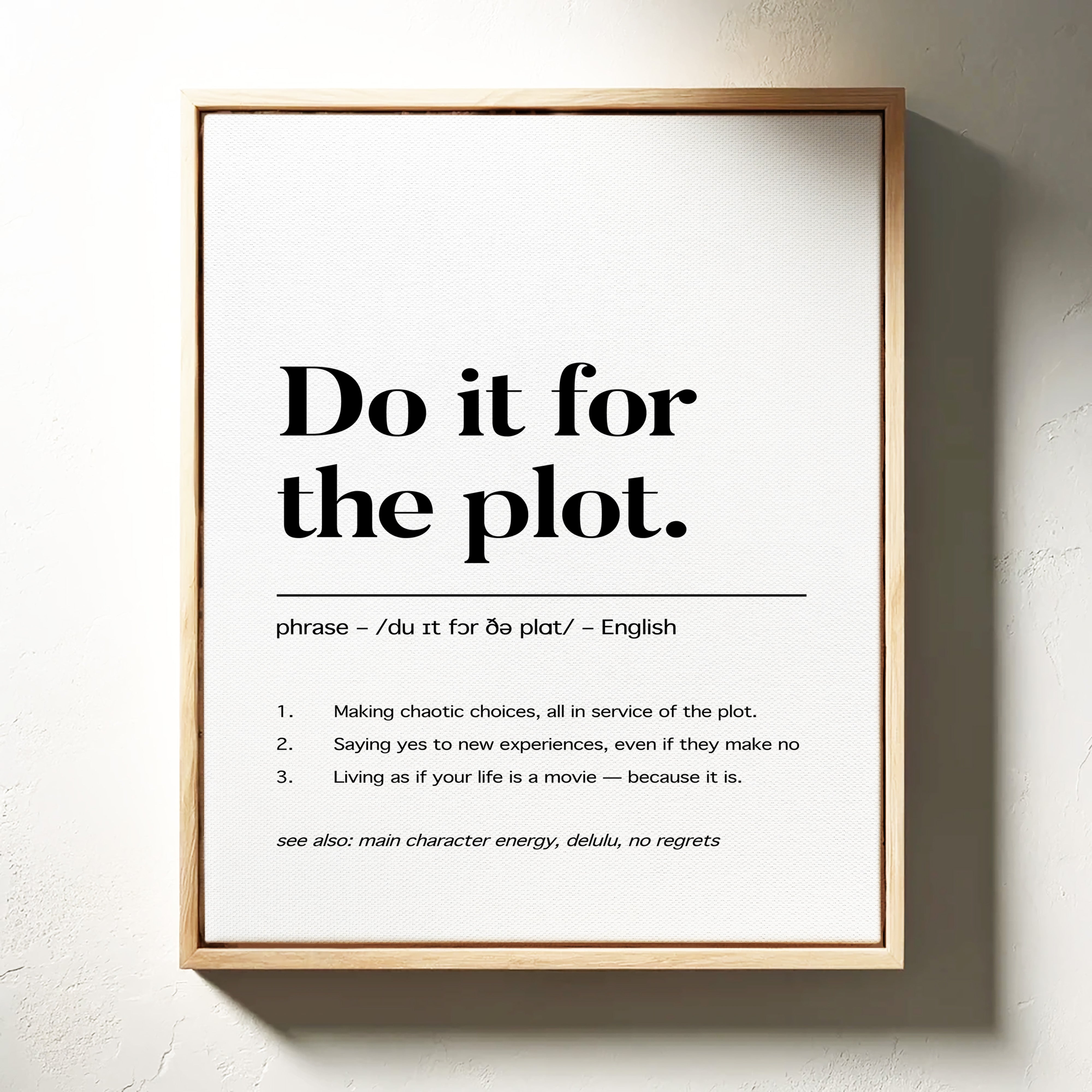 Black letters stand stark against pristine white, carrying a manifesto for adventurous living. The typography dances between classic serif elegance and modern boldness, creating a powerful statement about embracing life's narrative. Each word carries weight, while the phonetic spelling and numbered points below add layers of meaning and accessibility. This piece speaks to the intersection of spontaneity and purpose, suggesting that every choice contributes to our personal story. This statement piece works beautifully in a home office, creative studio, or anywhere you need a daily reminder to live boldly and embrace life's plot twists.