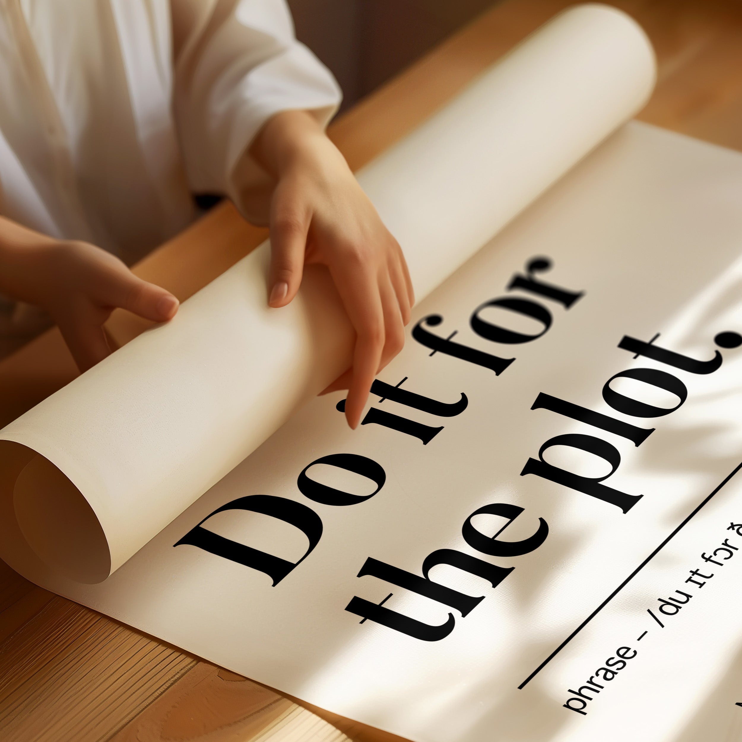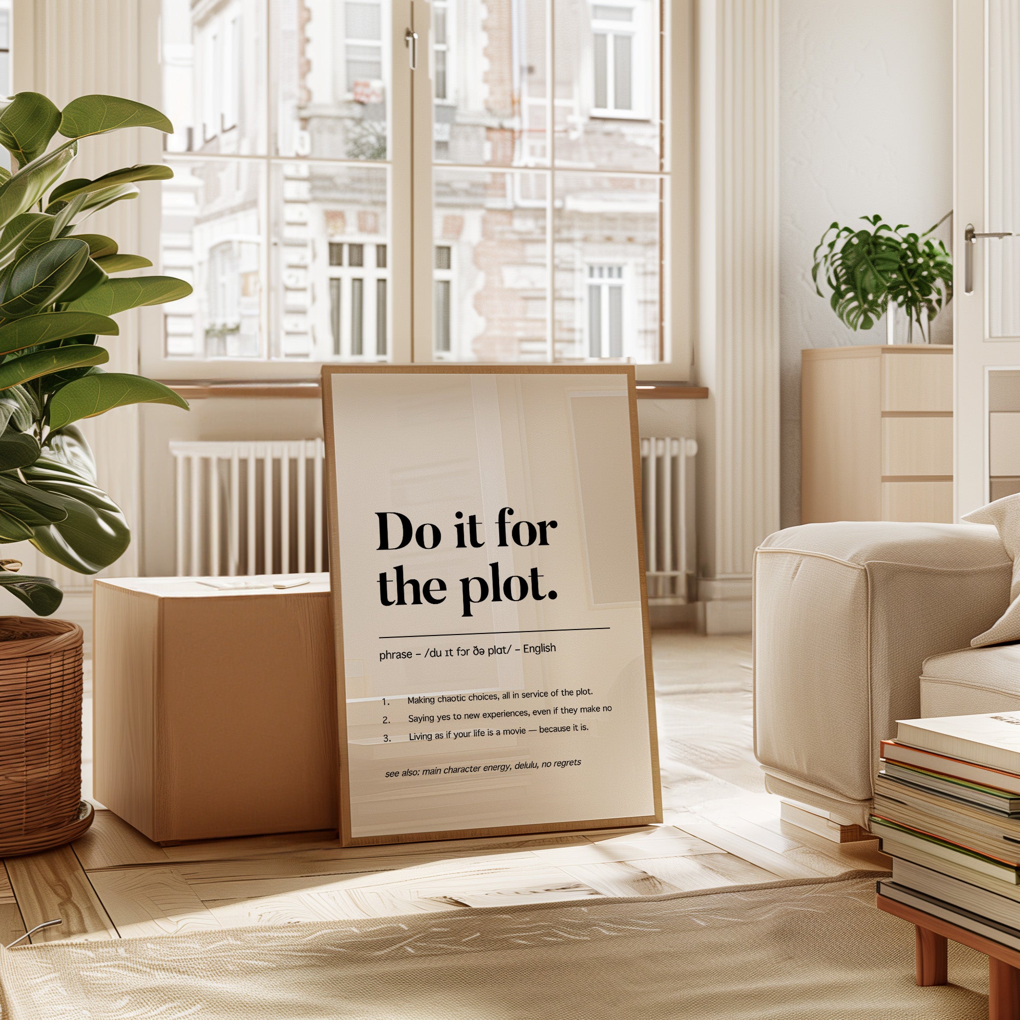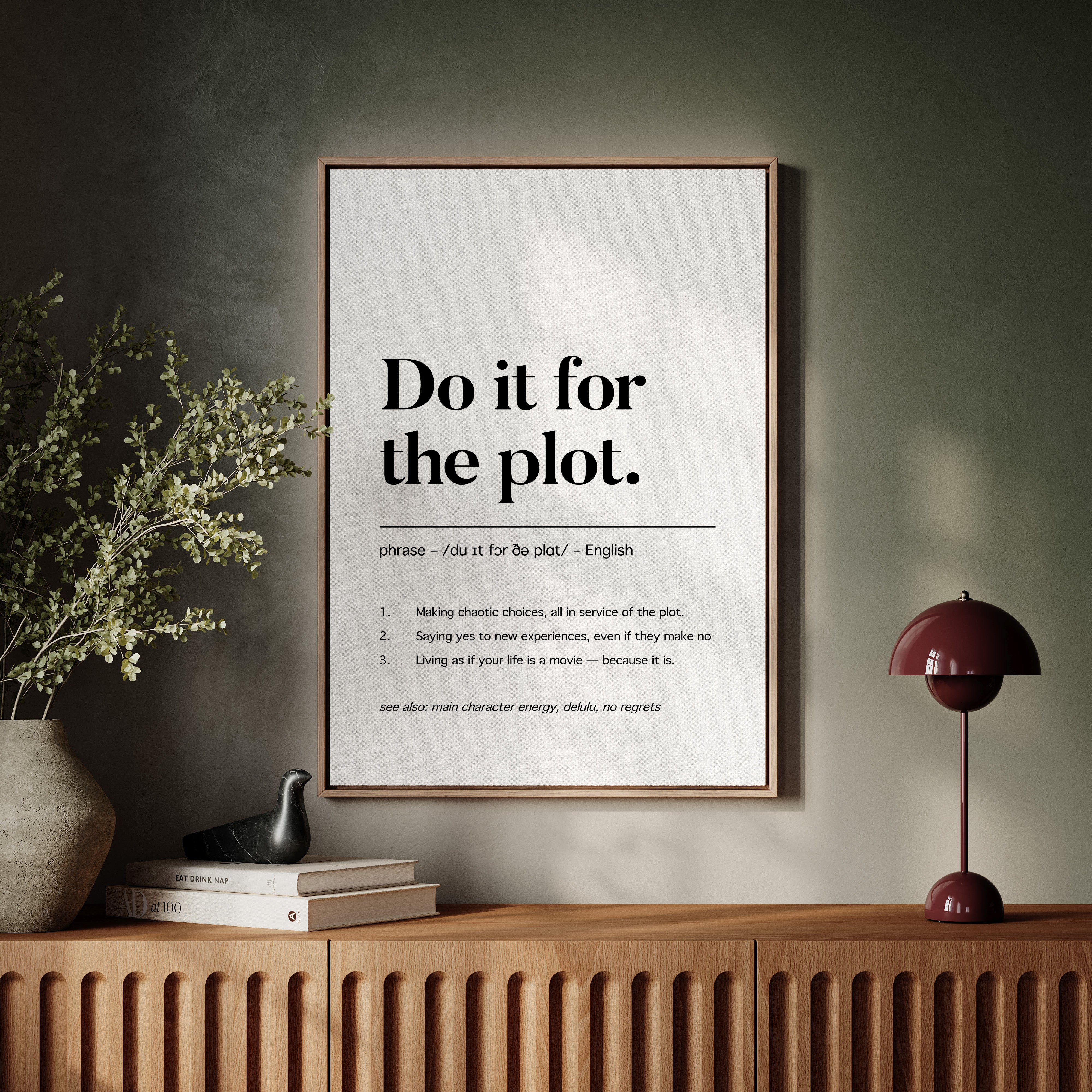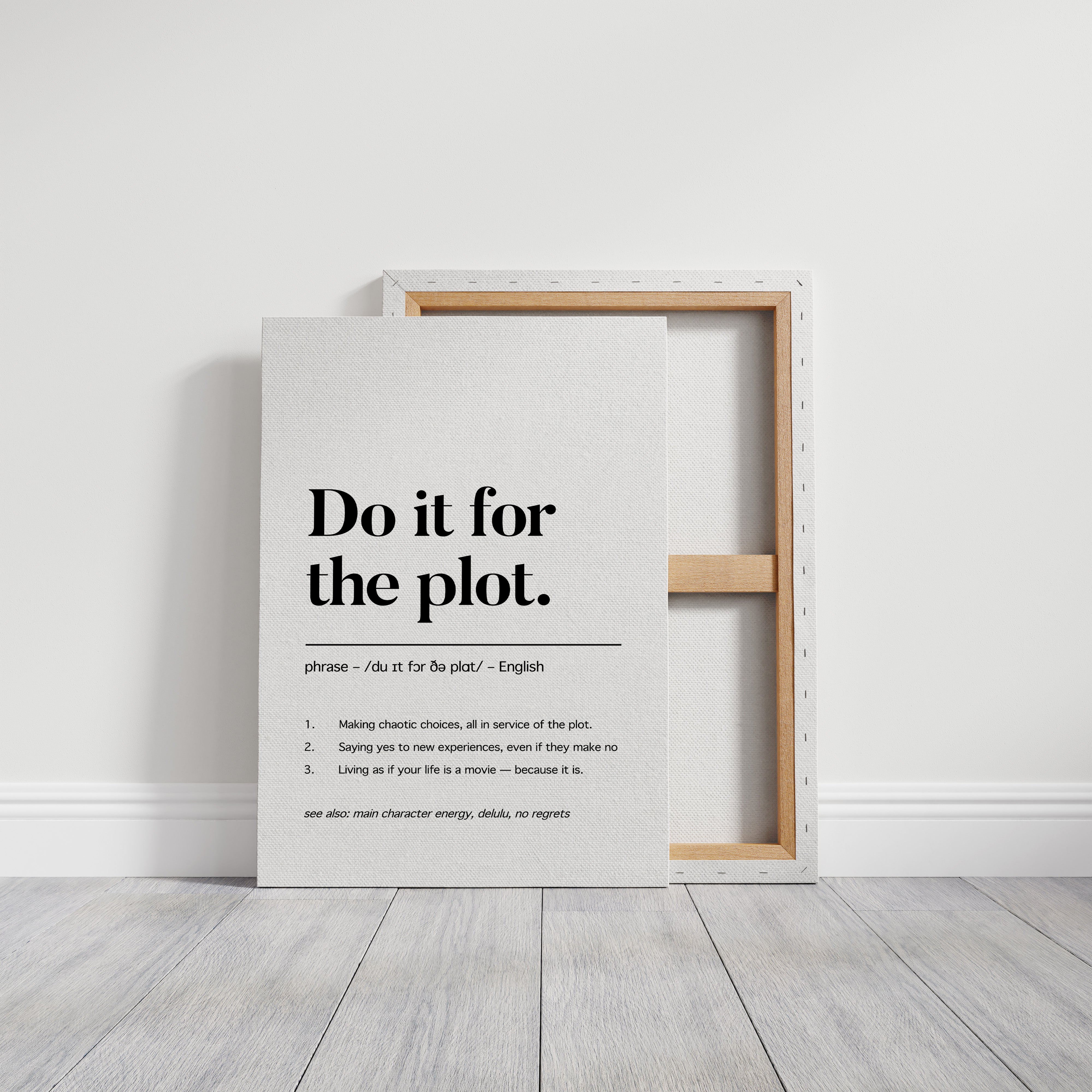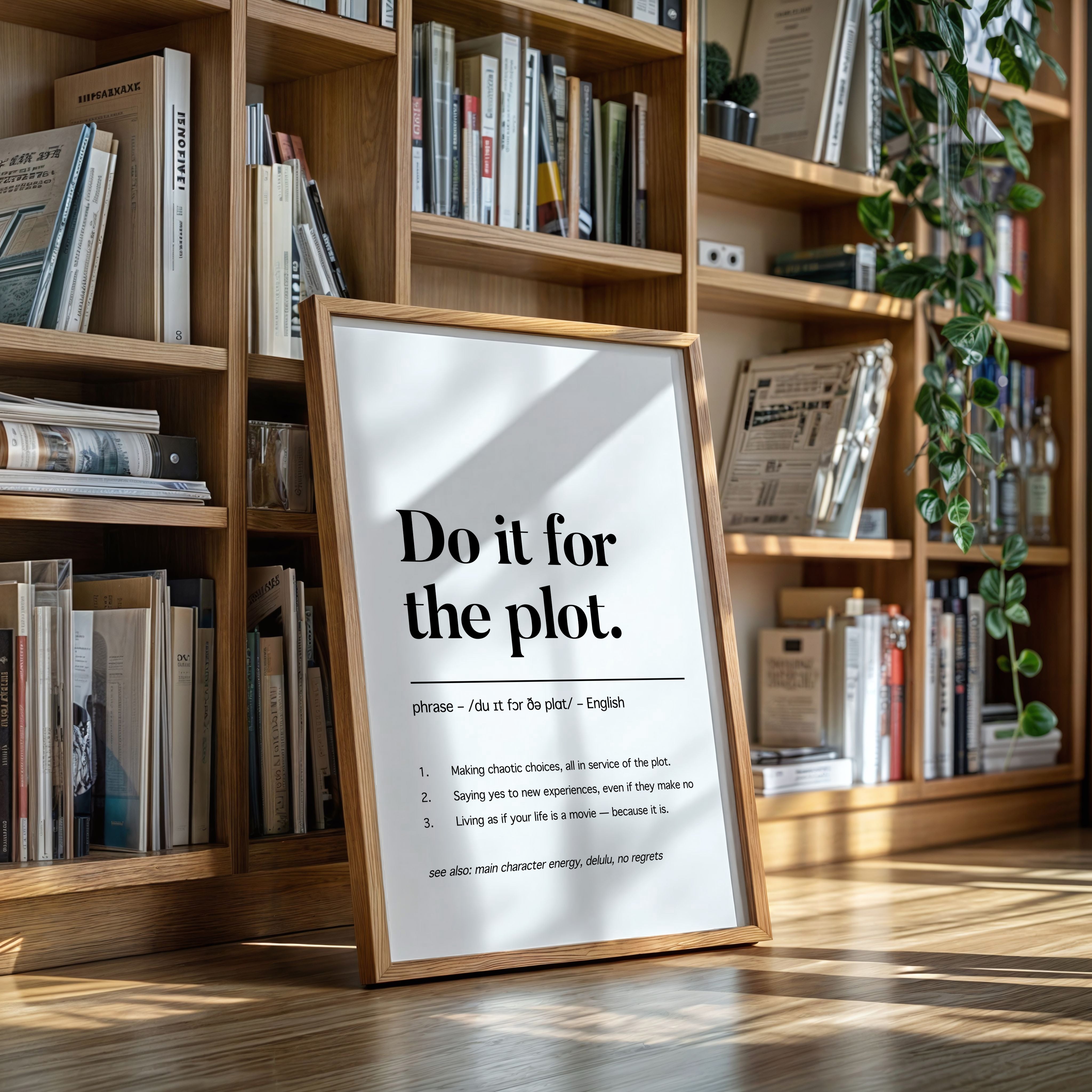 Black letters stand stark against pristine white, carrying a manifesto for adventurous living. The typography dances between classic serif elegance and modern boldness, creating a powerful statement about embracing life's narrative. Each word carries weight, while the phonetic spelling and numbered points below add layers of meaning and accessibility. This piece speaks to the intersection of spontaneity and purpose, suggesting that every choice contributes to our personal story. This statement piece works beautifully in a home office, creative studio, or anywhere you need a daily reminder to live boldly and embrace life's plot twists.