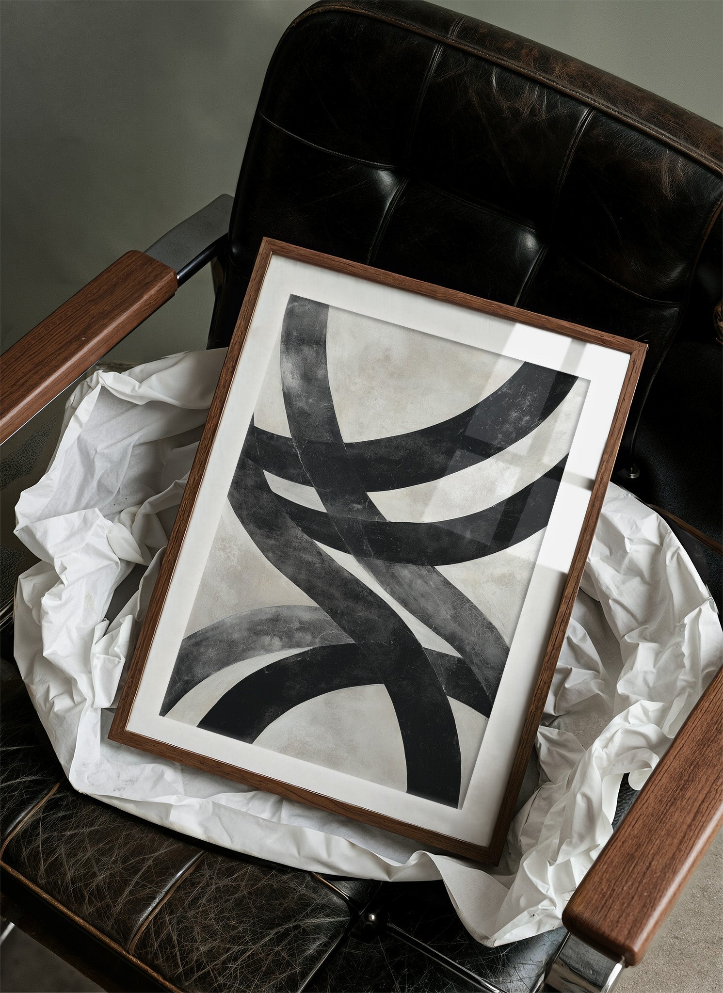 Sweeping black brushstrokes create a dramatic dance against a pristine white canvas, commanding attention in this contemporary space. The bold, organic curves flow with deliberate confidence, creating a powerful interplay of positive and negative space that speaks to both strength and grace. The minimal color palette allows the composition's movement to take center stage, while the modern interior setting provides a perfect backdrop for its theatrical presence. This statement piece would transform any minimal contemporary space, serving as a sophisticated focal point in an open-concept living area or adding dramatic flair to a modern office entrance.