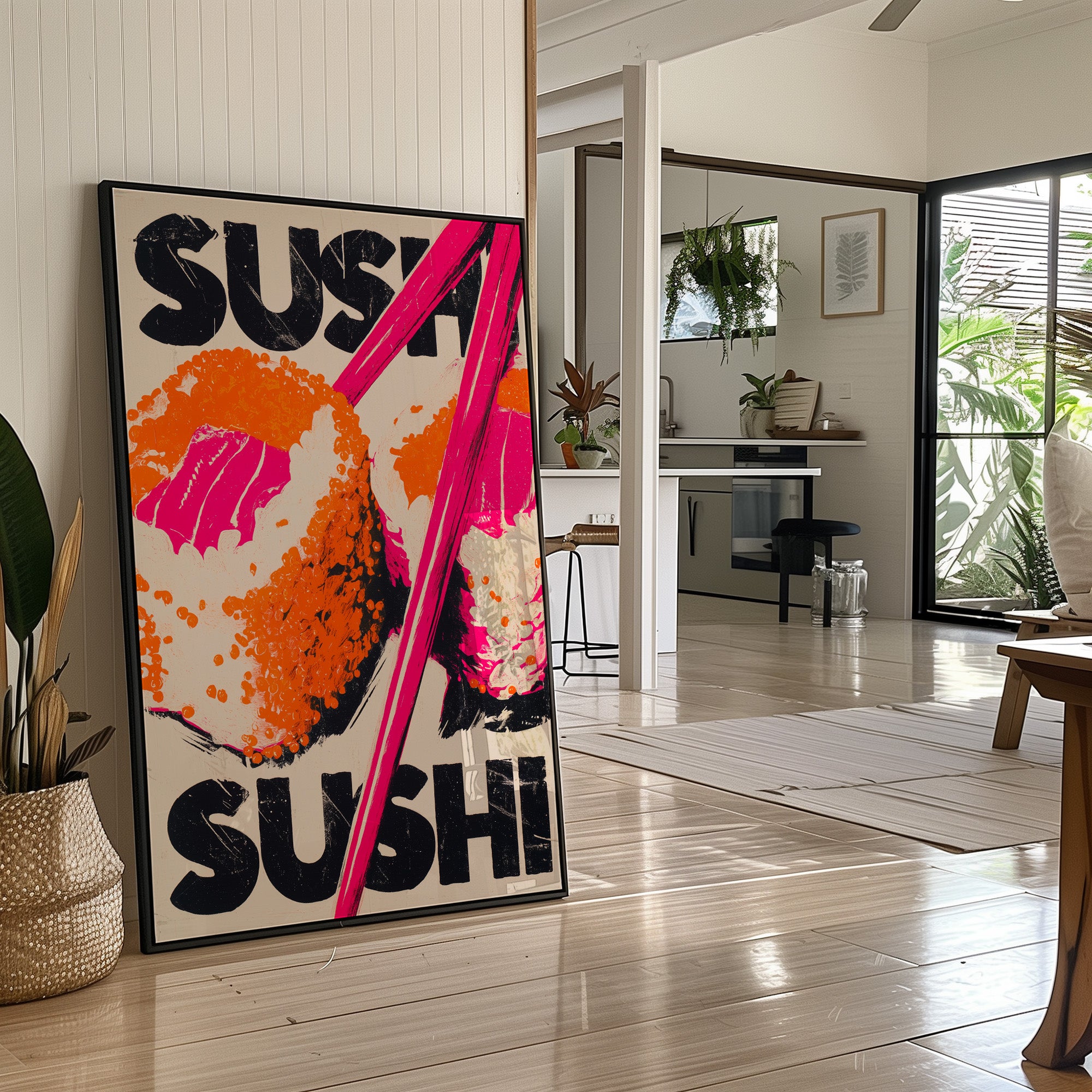 A striking typographic piece commands attention with its raw urban energy, where ""SUSH"" repeats in bold black letters against a neutral backdrop. Explosive splashes of hot pink and vibrant orange create dynamic diagonal movement, suggesting the pulse of city life. The composition balances structured typography with spontaneous brush strokes, while the wooden frame adds a sophisticated finish to the contemporary design. This statement piece would transform a modern home office or creative studio, bringing bold energy and artistic flair to minimal interiors.