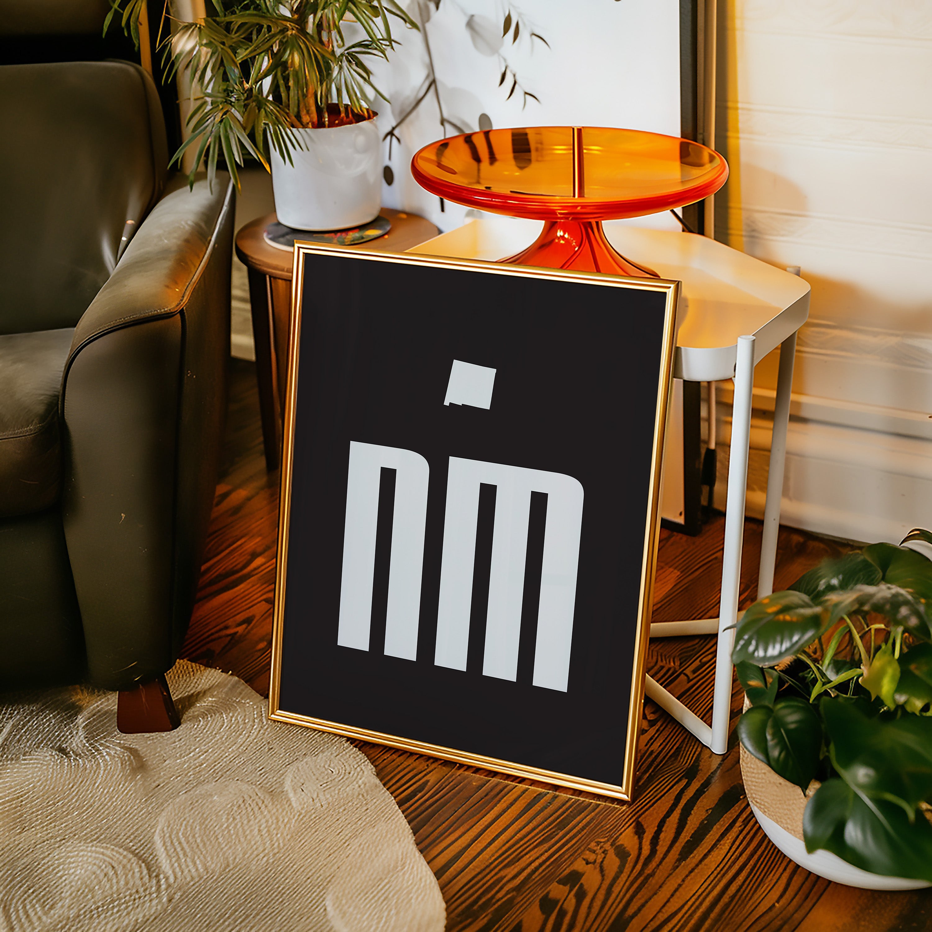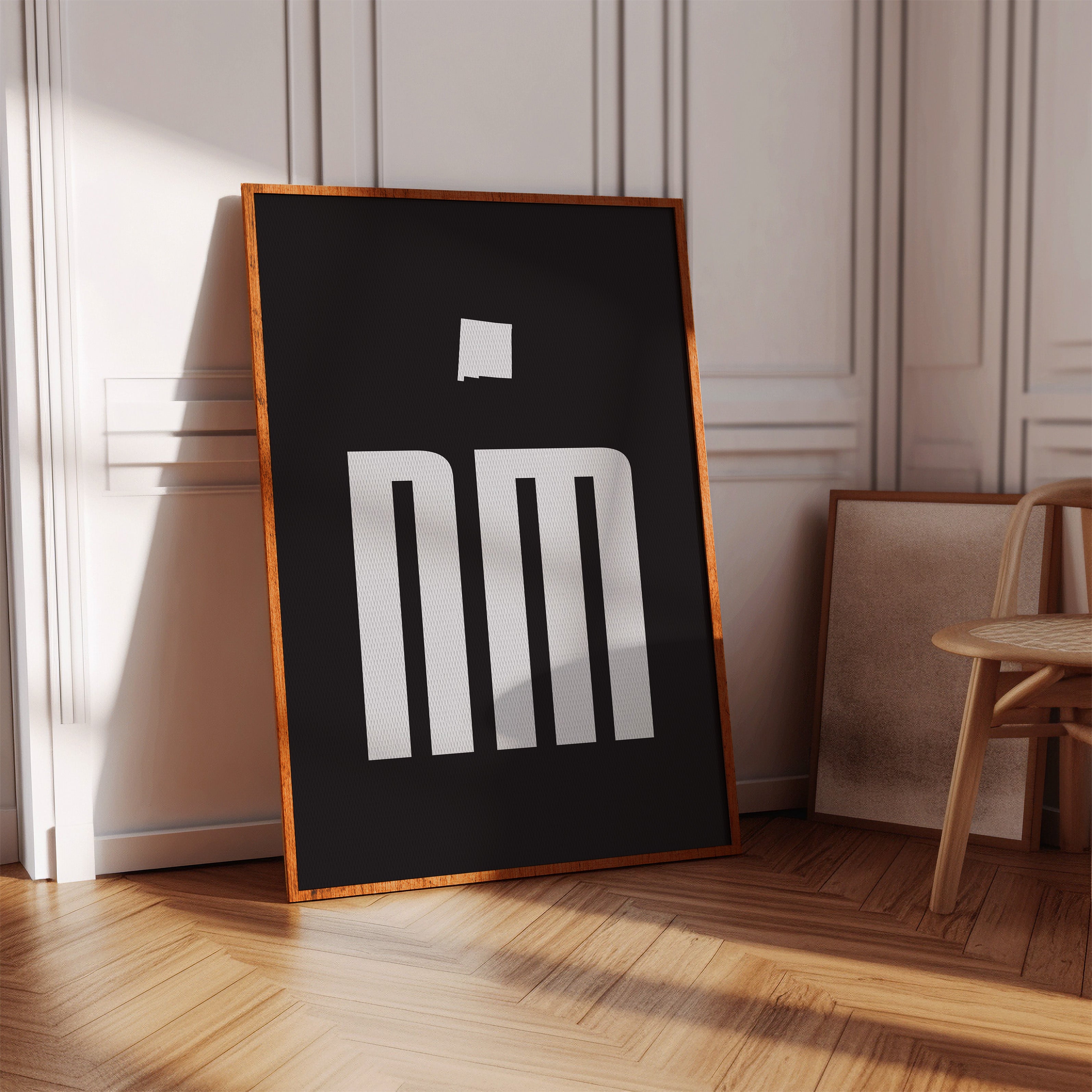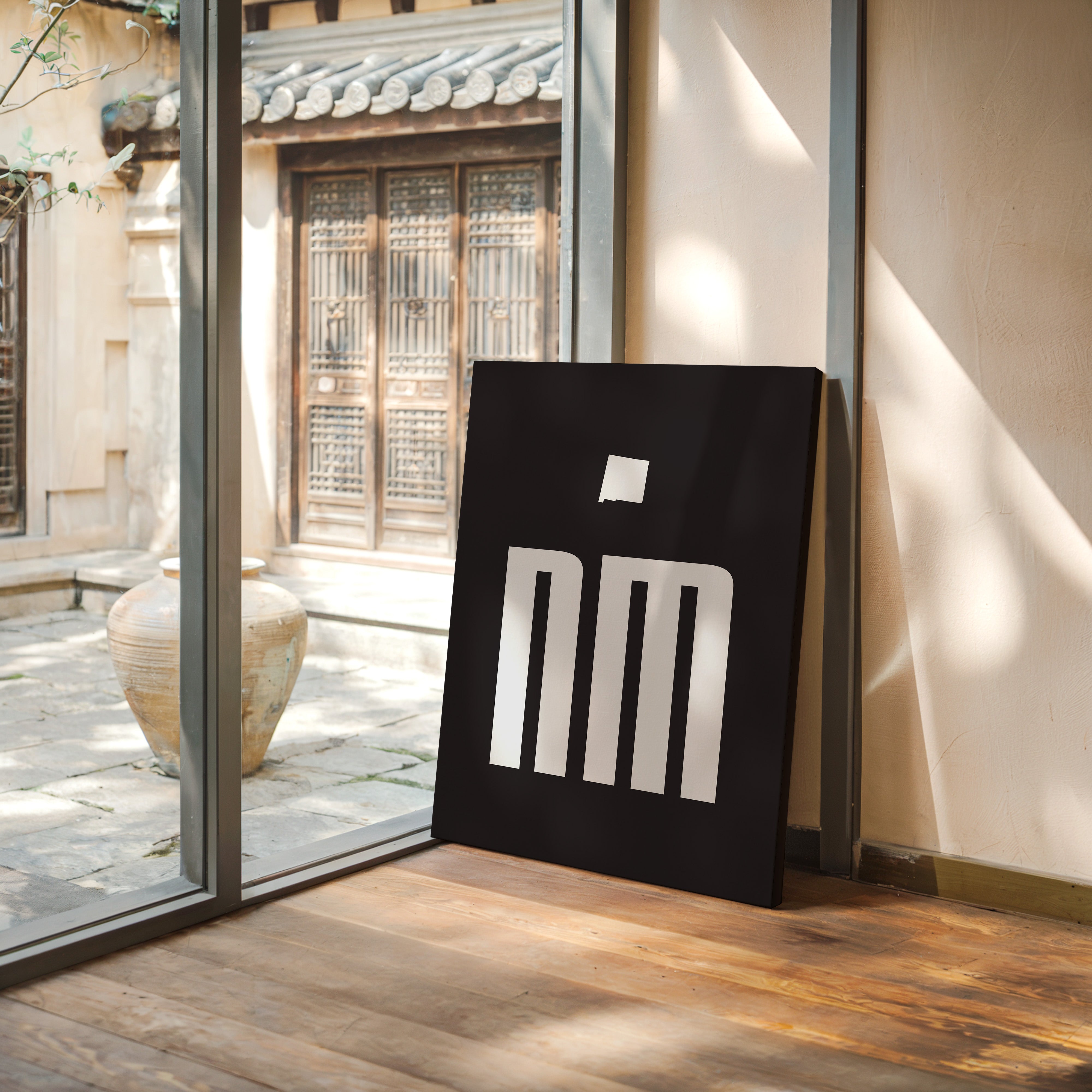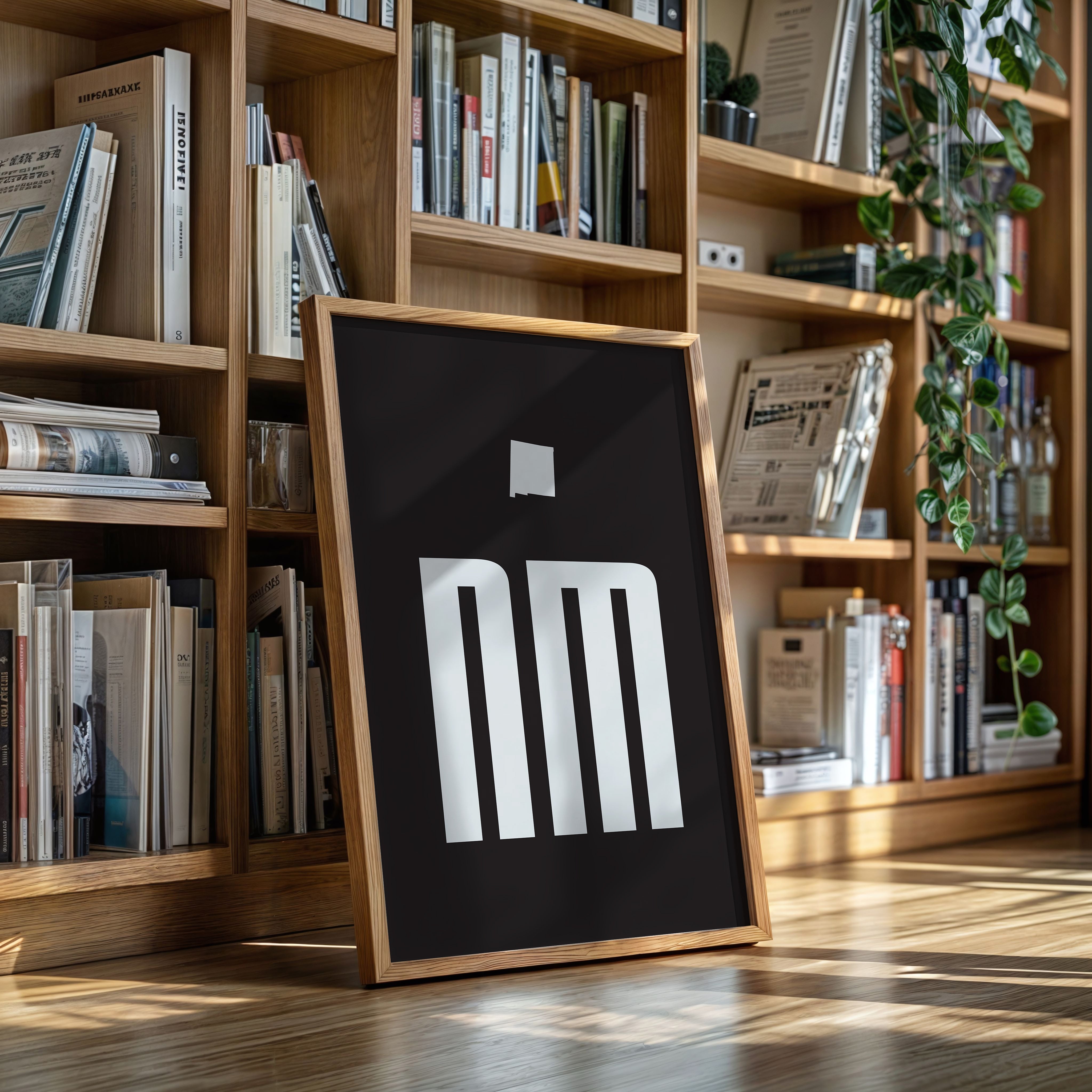 Stark white forms pierce through darkness with architectural precision, creating a powerful statement of minimalist design. The geometric letterforms command attention against the deep black background, their clean lines and negative space dancing in perfect balance. This striking composition speaks to the beauty of simplicity while suggesting both strength and sophistication in its execution. This piece would make a compelling focal point in a modern office space, creative studio, or contemporary living room where its bold presence can inspire and energize the environment.