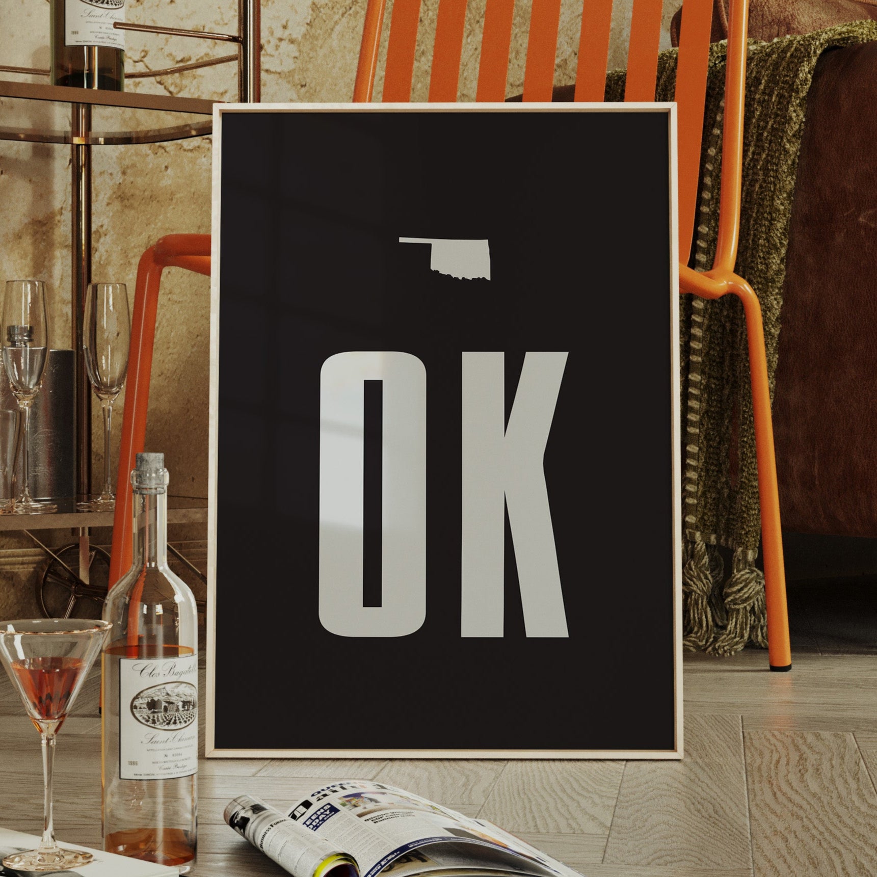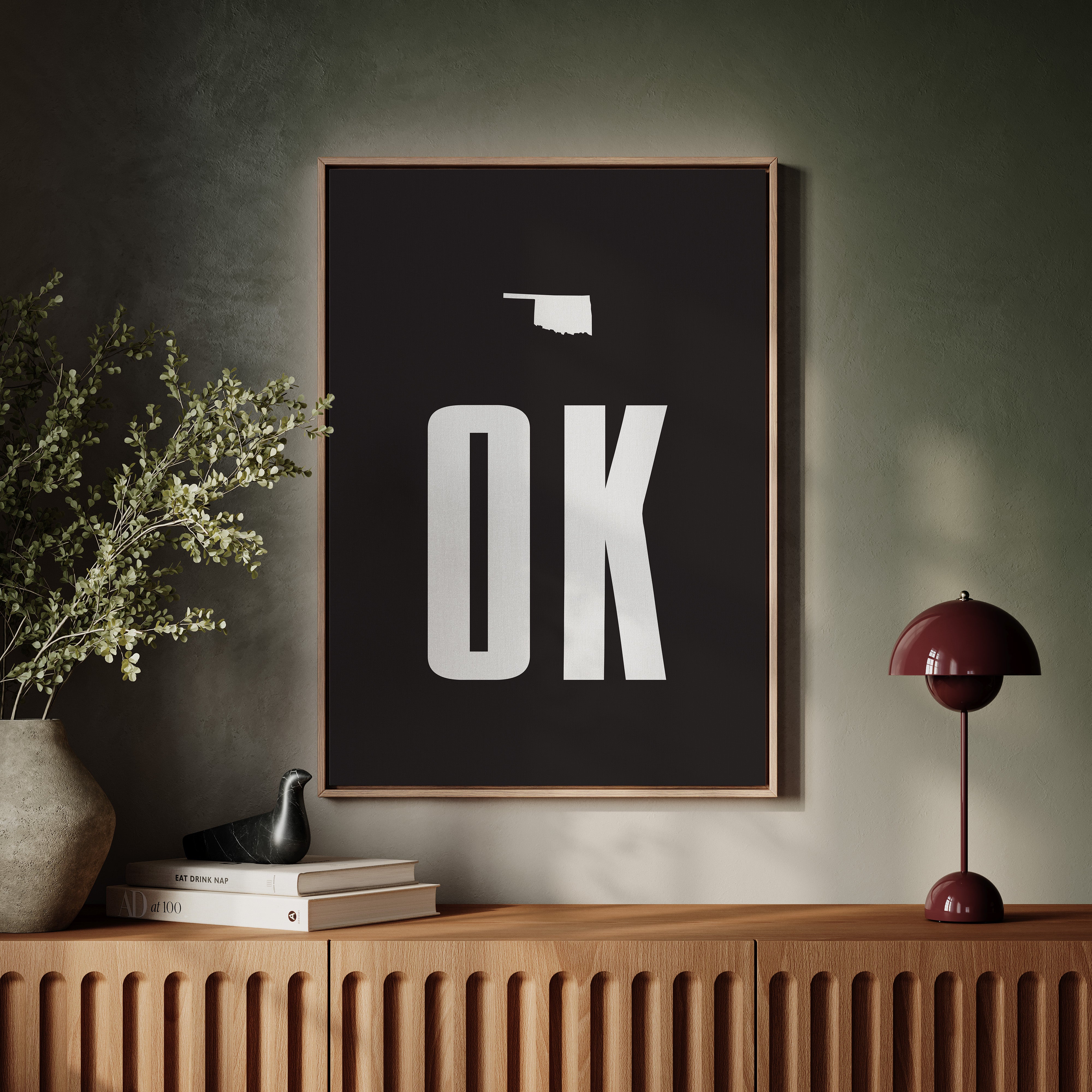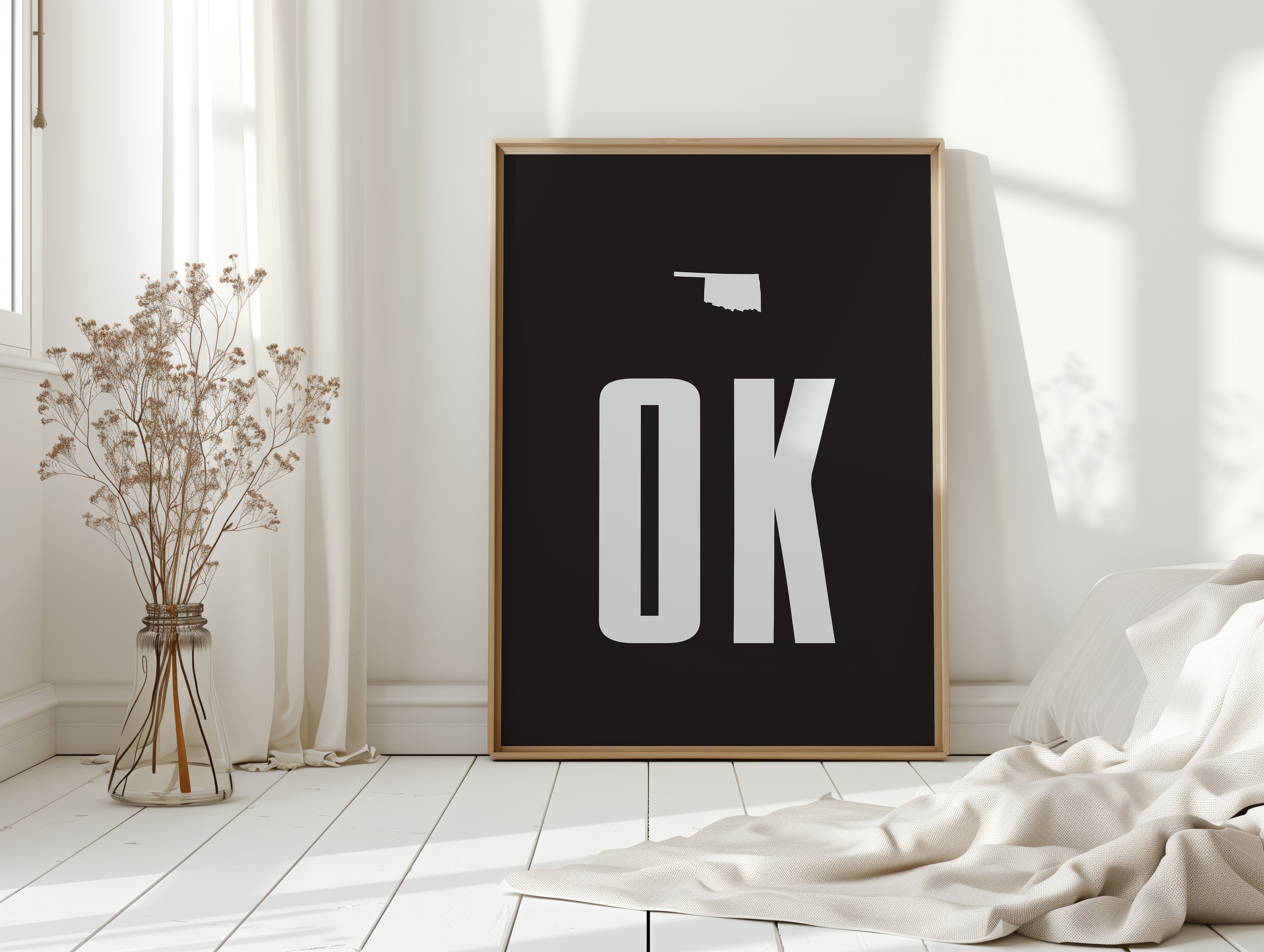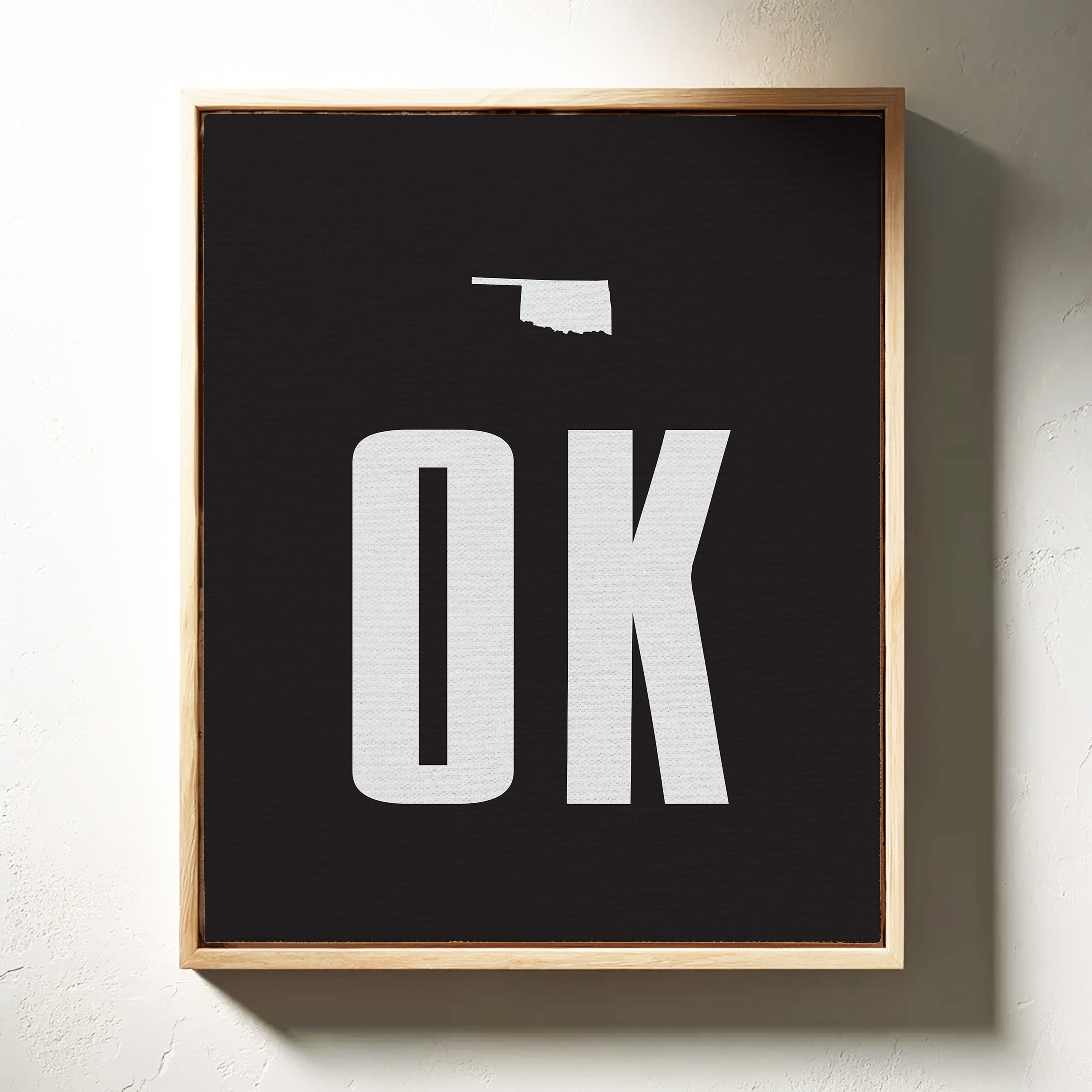 Against a deep obsidian backdrop, stark white typography commands attention with understated confidence. The minimalist design pairs the state silhouette of Oklahoma with its abbreviated form ""OK,"" creating a powerful statement of place and identity. The bold, modern letterforms stand as pillars of strength, while negative space works to amplify their presence. This contemporary interpretation of state pride strips away excess to reveal pure geometric forms. The contrast between the robust typography and the delicate state outline creates a sophisticated tension that speaks to both heritage and modernity. This striking piece would make a bold statement in a modern office, creative studio, or any space celebrating Oklahoma roots with contemporary style.