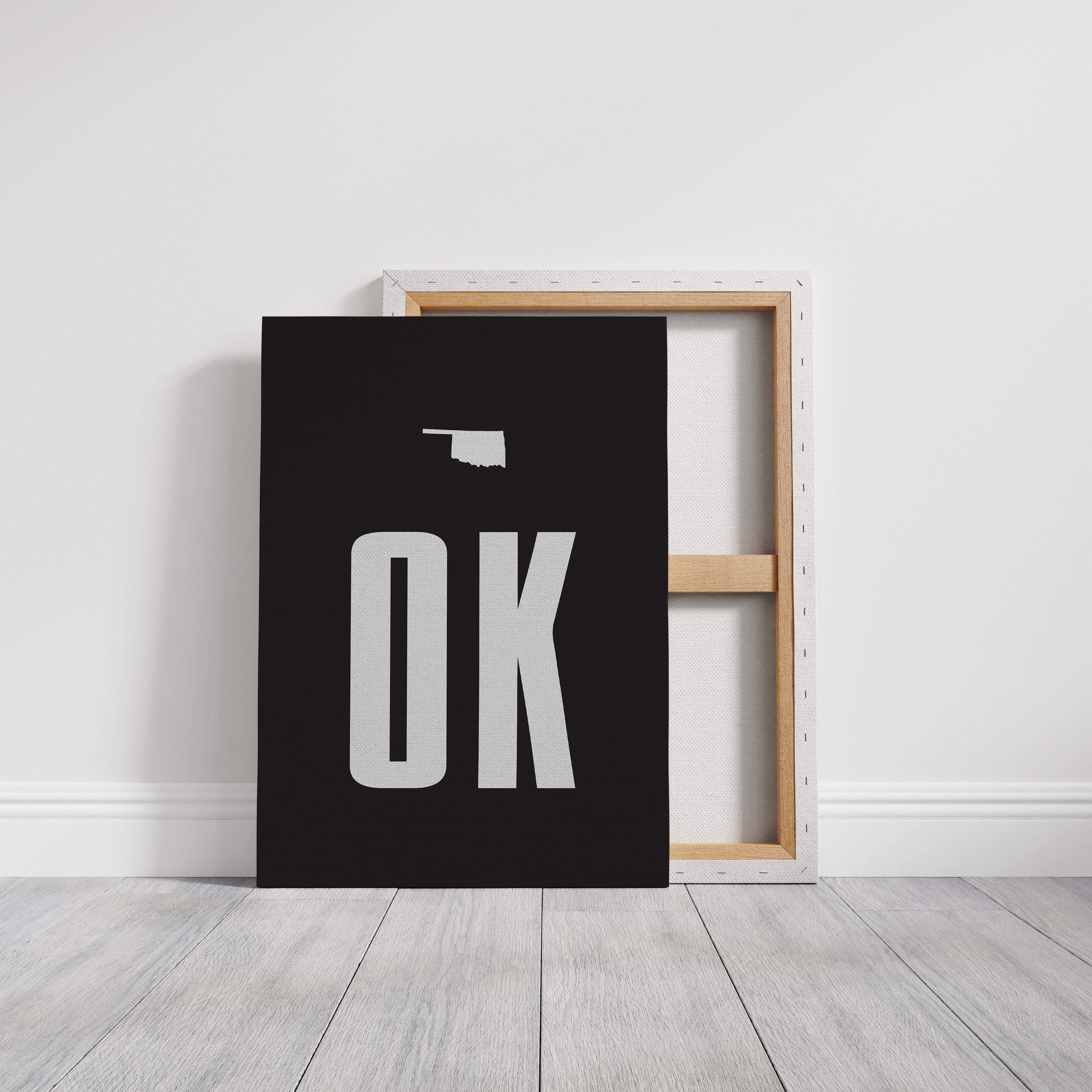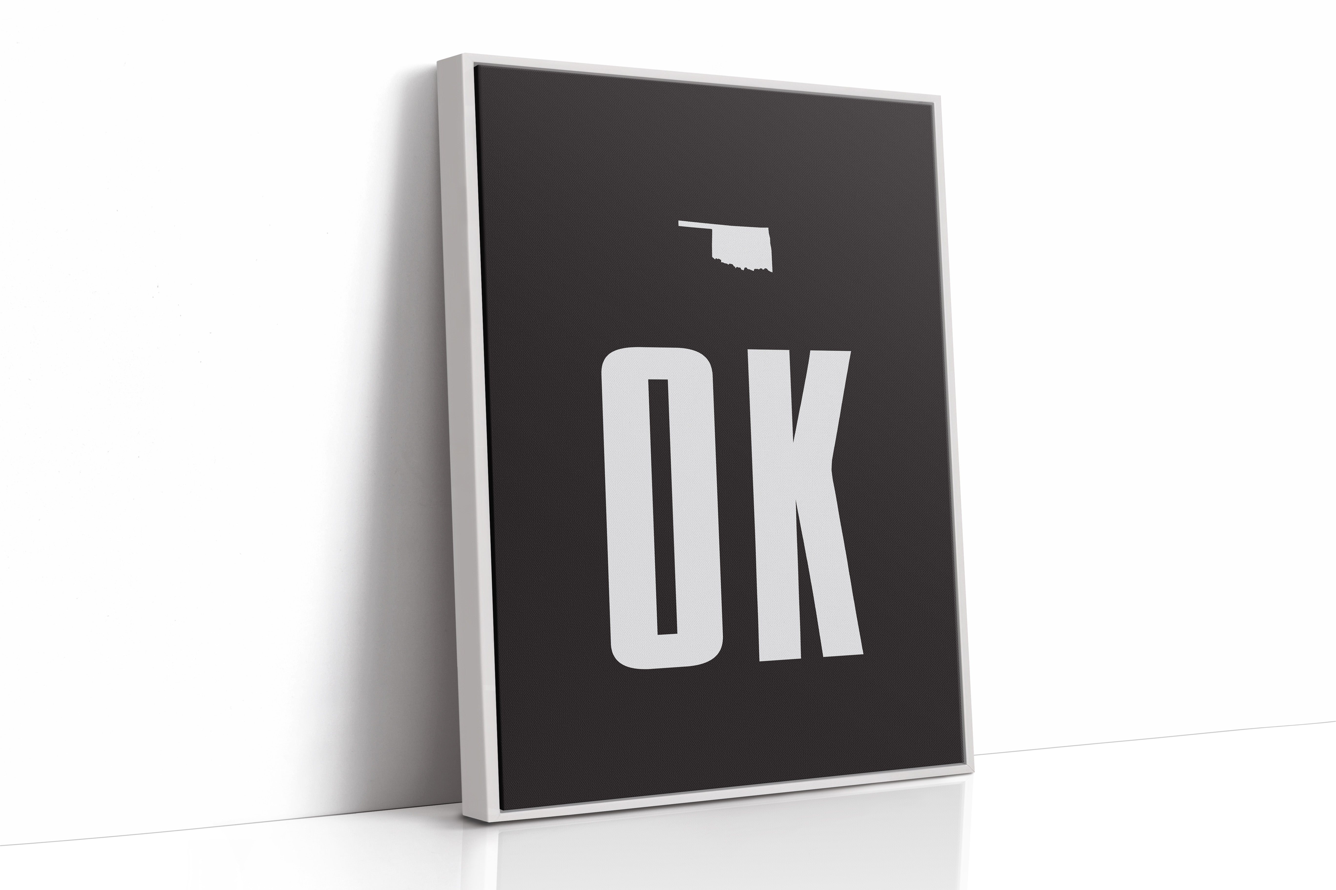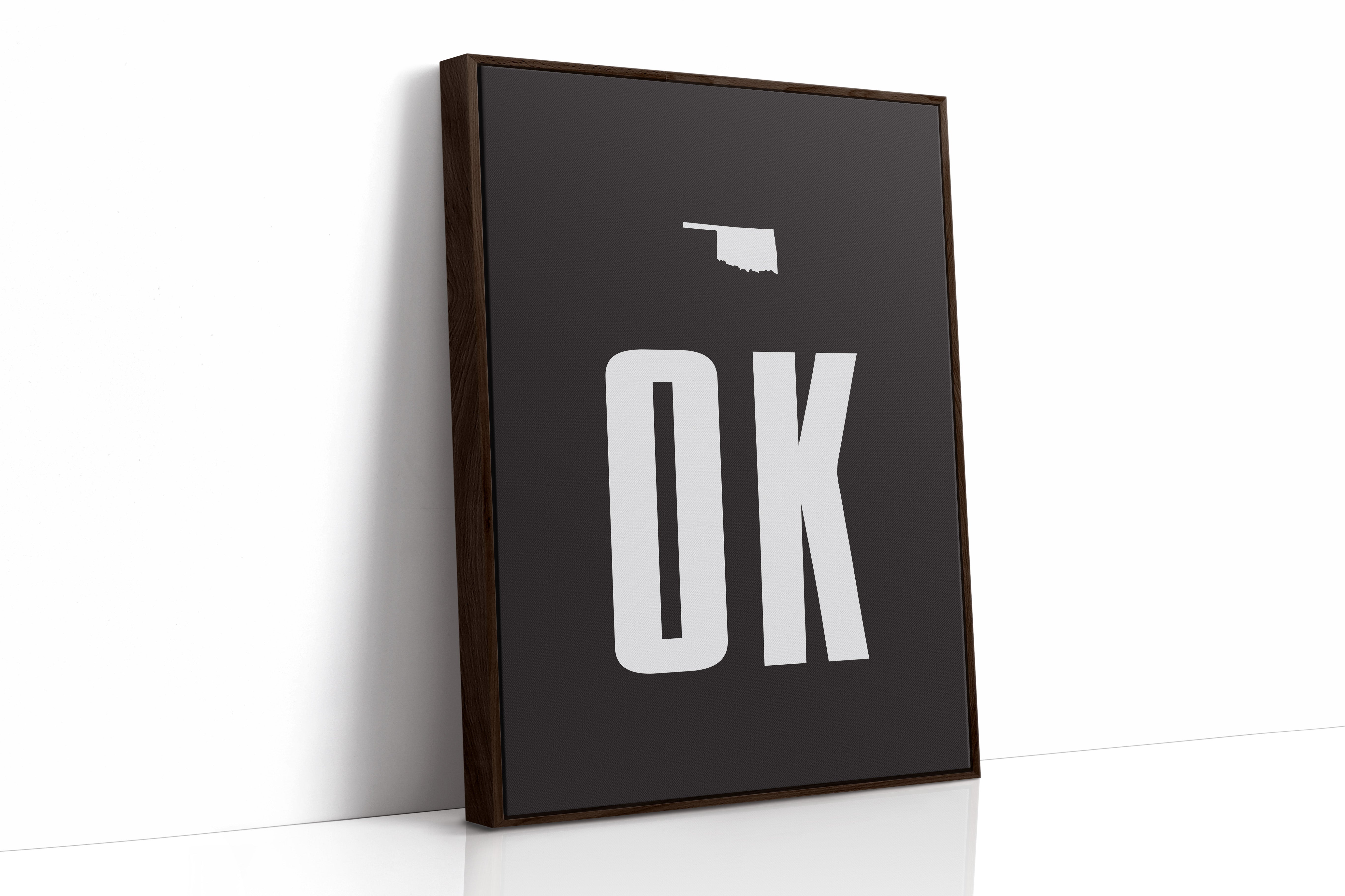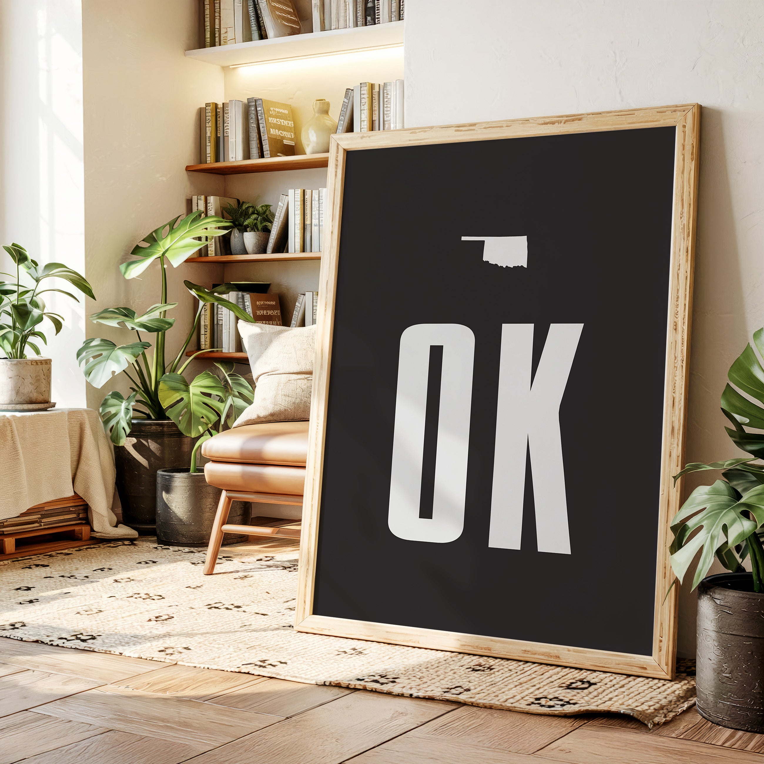 Against a deep obsidian backdrop, stark white typography commands attention with understated confidence. The minimalist design pairs the state silhouette of Oklahoma with its abbreviated form ""OK,"" creating a powerful statement of place and identity. The bold, modern letterforms stand as pillars of strength, while negative space works to amplify their presence. This contemporary interpretation of state pride strips away excess to reveal pure geometric forms. The contrast between the robust typography and the delicate state outline creates a sophisticated tension that speaks to both heritage and modernity. This striking piece would make a bold statement in a modern office, creative studio, or any space celebrating Oklahoma roots with contemporary style.