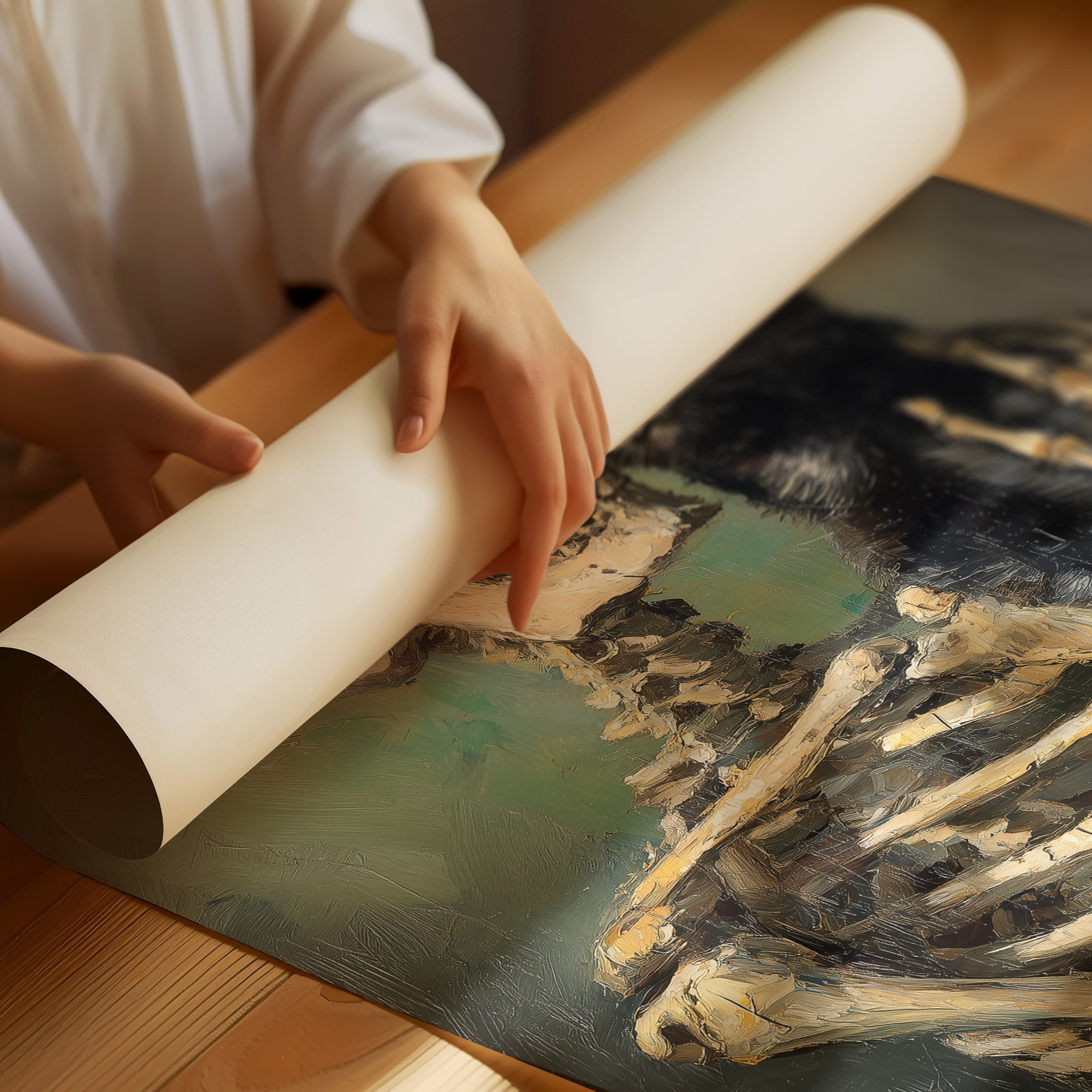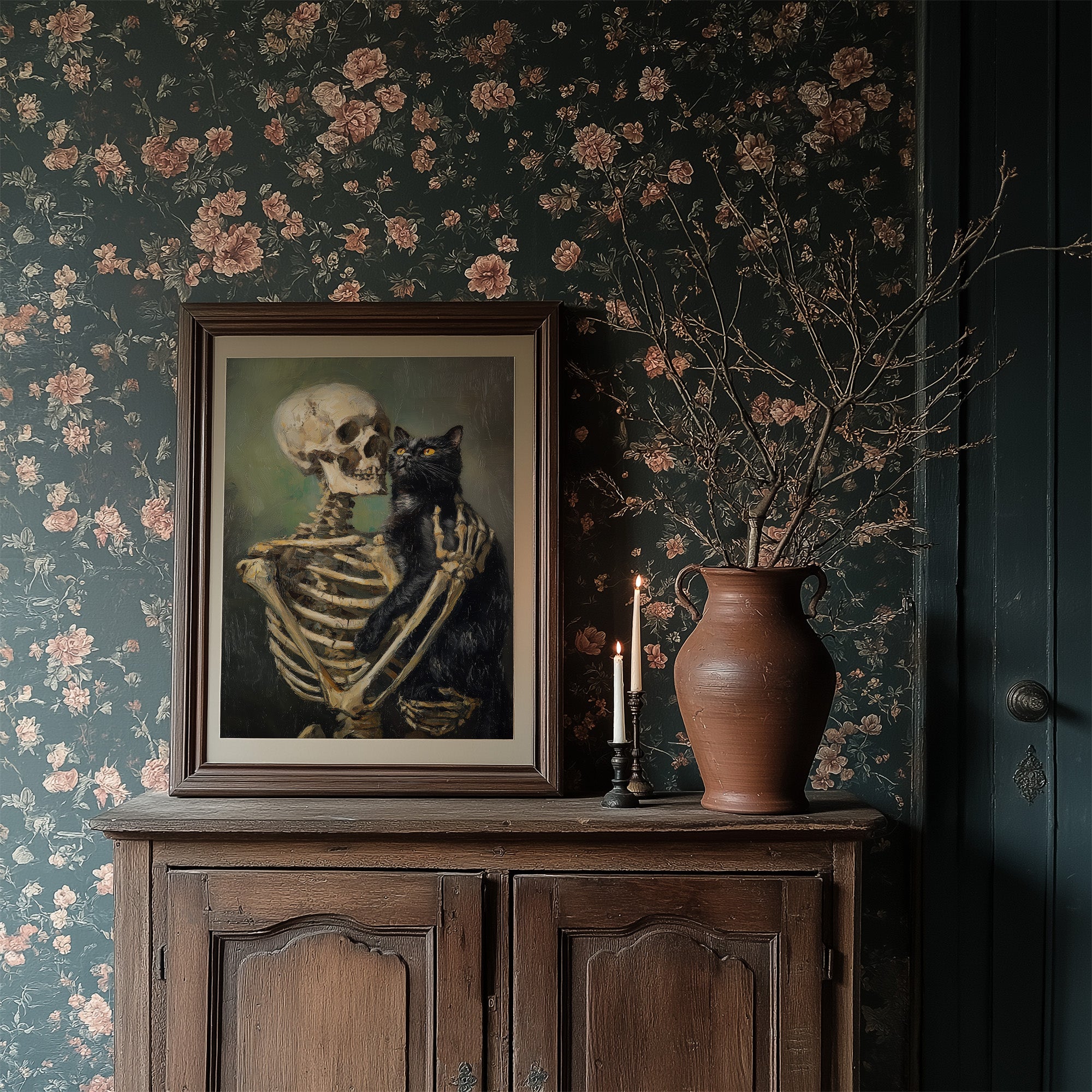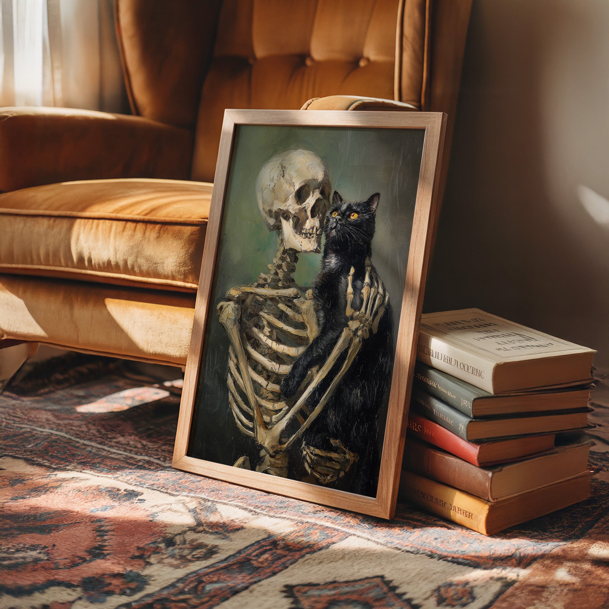 A haunting juxtaposition where death cradles life in bony fingers. The sleek black cat with piercing amber eyes nestles within a skeleton's ribcage, creating a striking visual paradox against the muted green background. The painting's somber palette and classical technique evoke memento mori traditions while reimagining them through a contemporary lens that celebrates the mysterious bond between mortality and the feline spirit. This statement piece commands attention in a study, library, or any space where thoughtful contemplation and bold aesthetic choices converge.