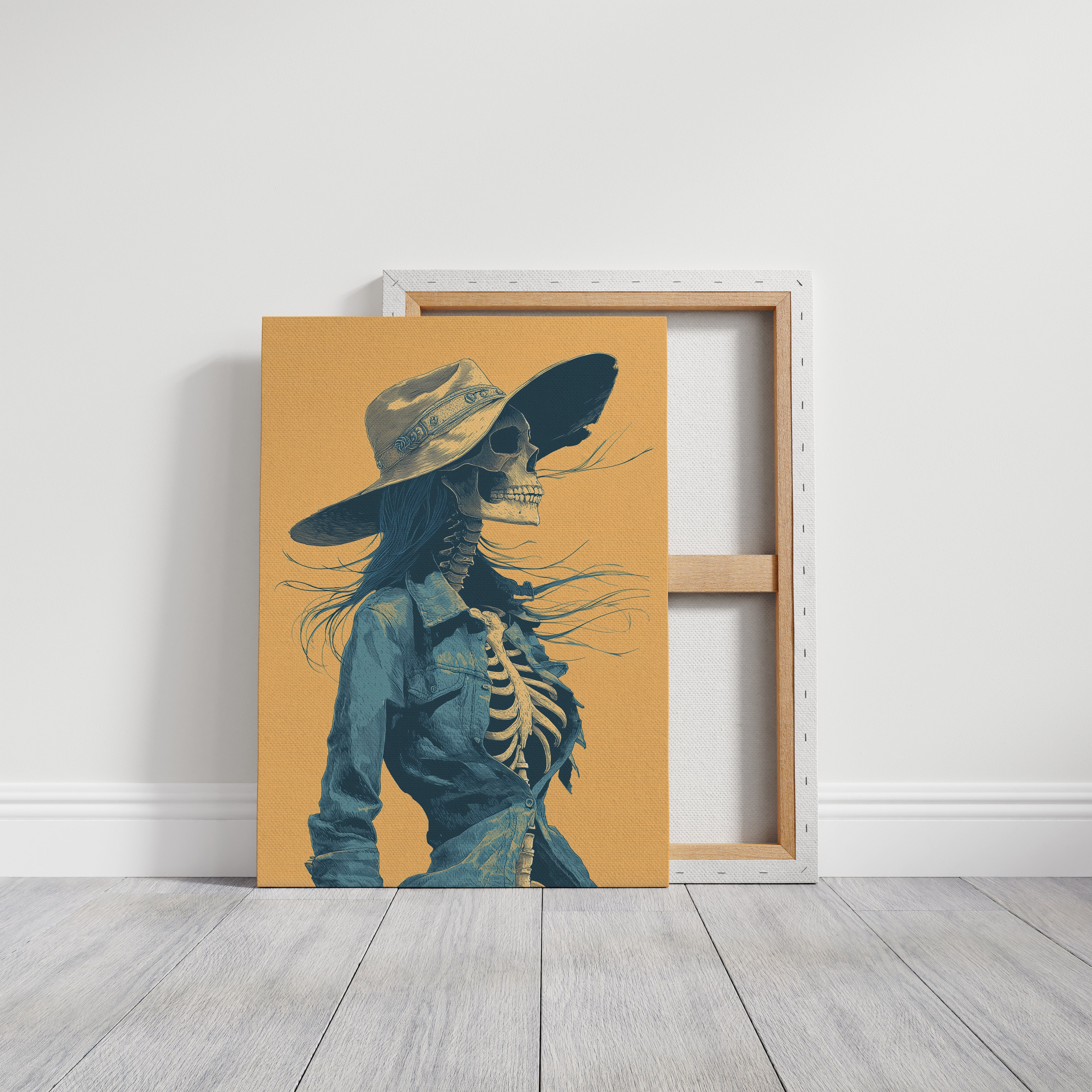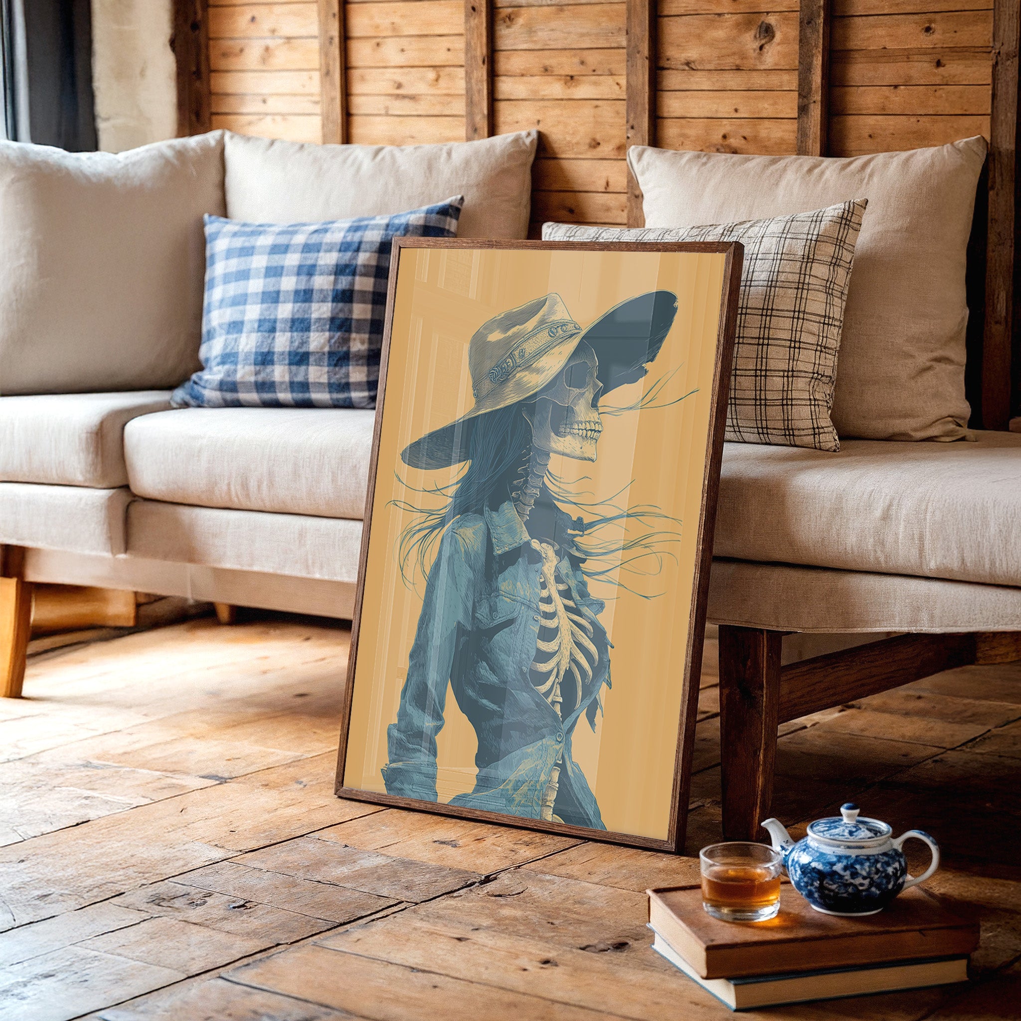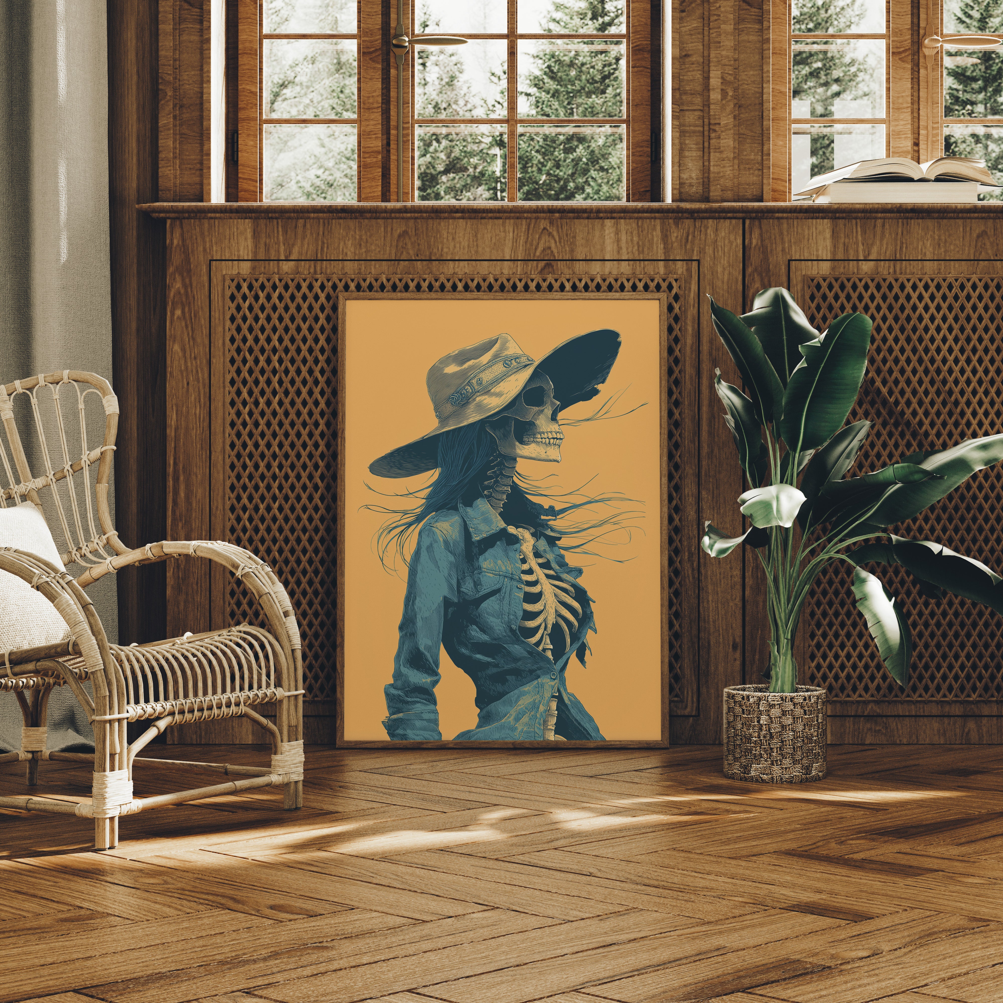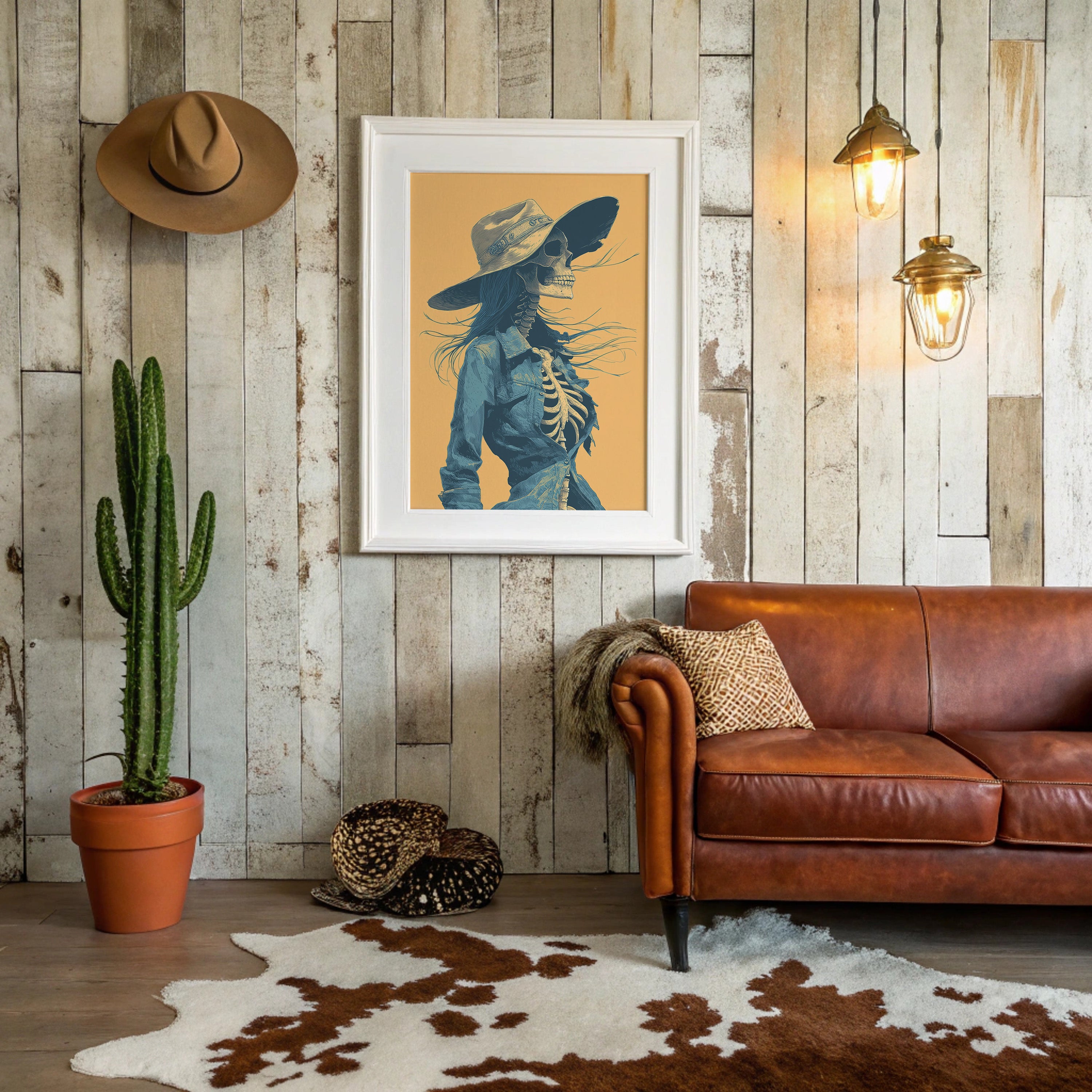 A haunting silhouette emerges from a sun-bleached canvas, where teal meets warm amber in an otherworldly dance. The figure stands defiant yet graceful, with flowing hair catching an invisible wind while skeletal elements peek through, creating an artful tension between life and the eternal. This contemporary interpretation of western mythology blends macabre elegance with desert mystique. Perfect for adding a bold statement to modern ranch homes, urban lofts, or any space seeking to blur the lines between edgy and sophisticated.