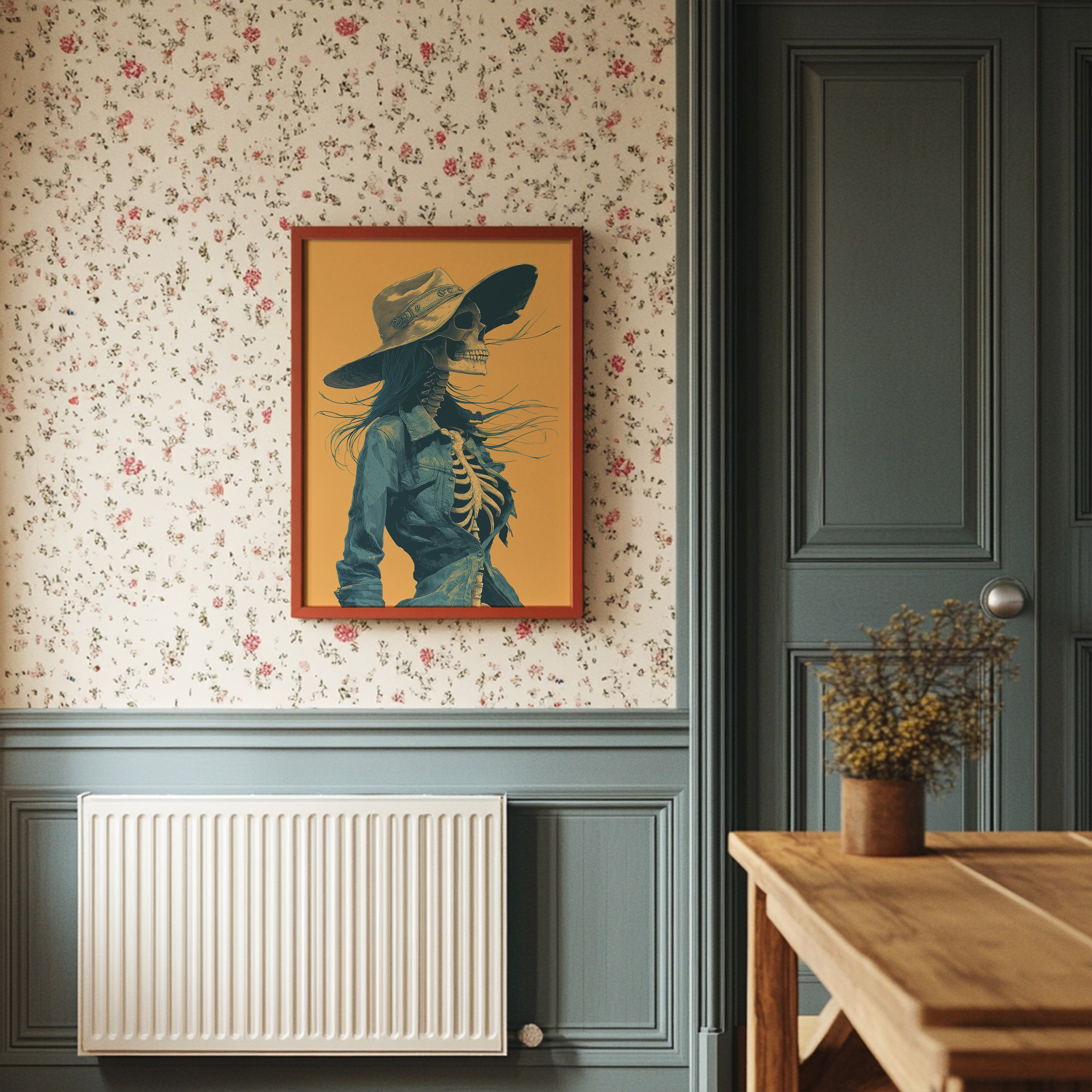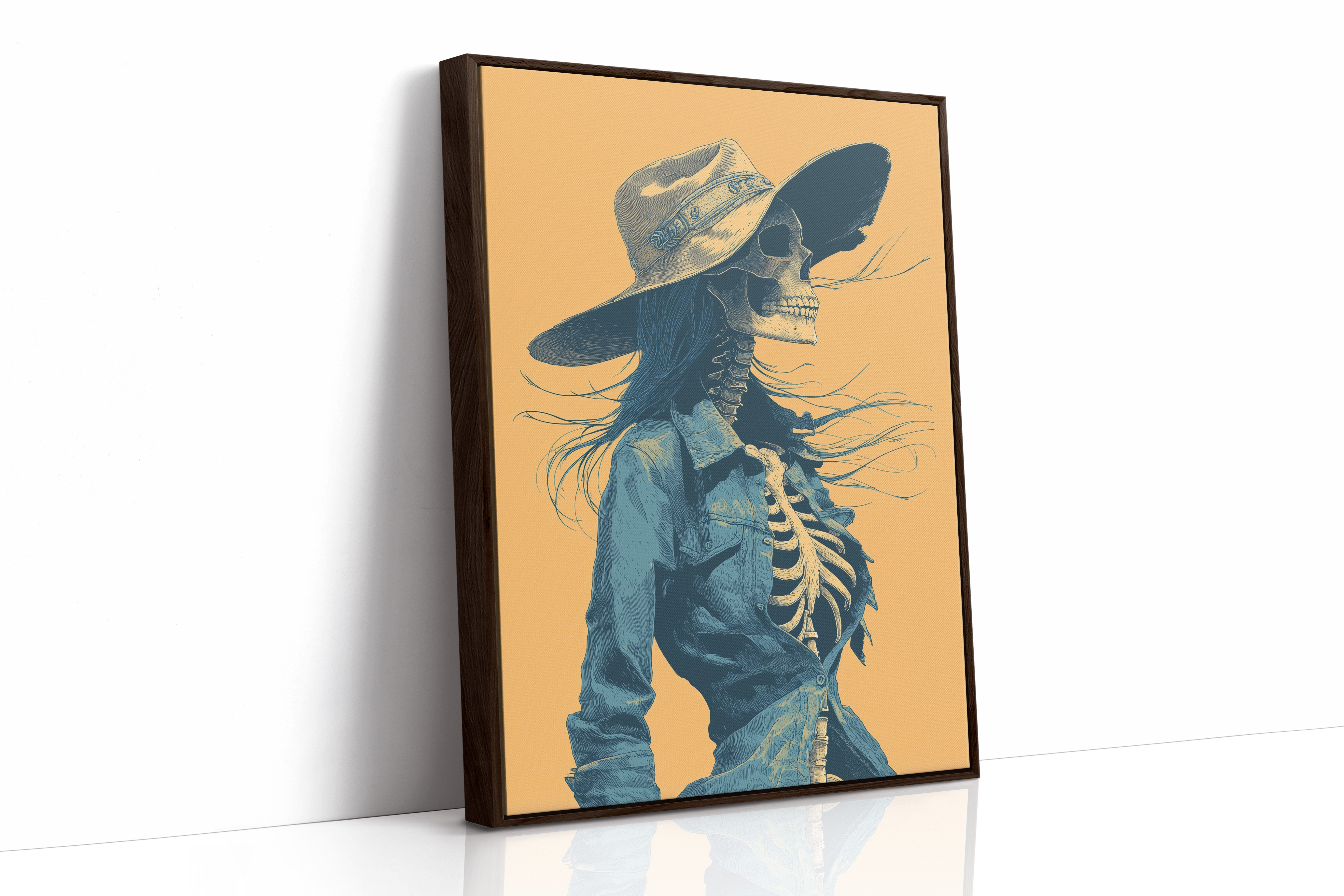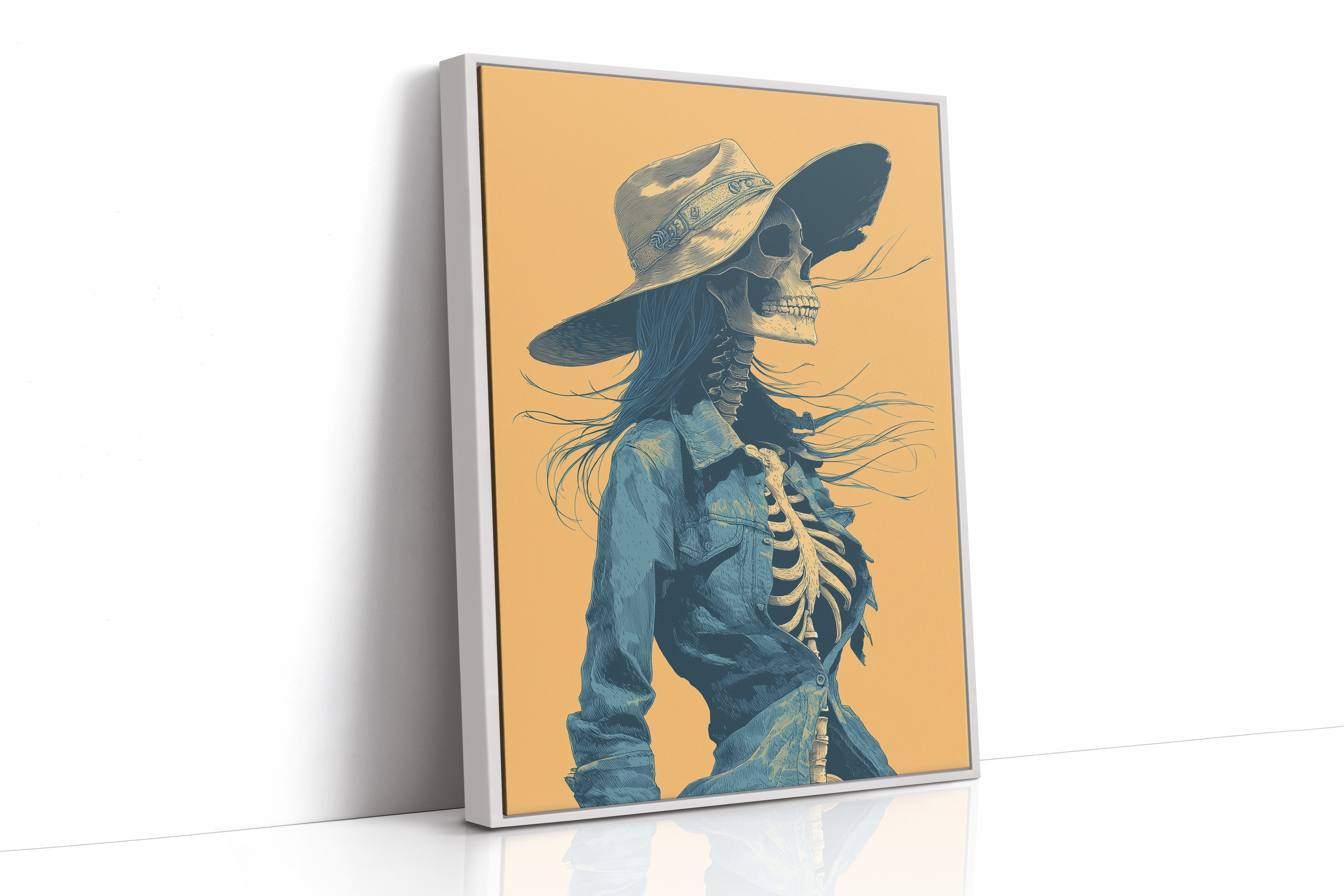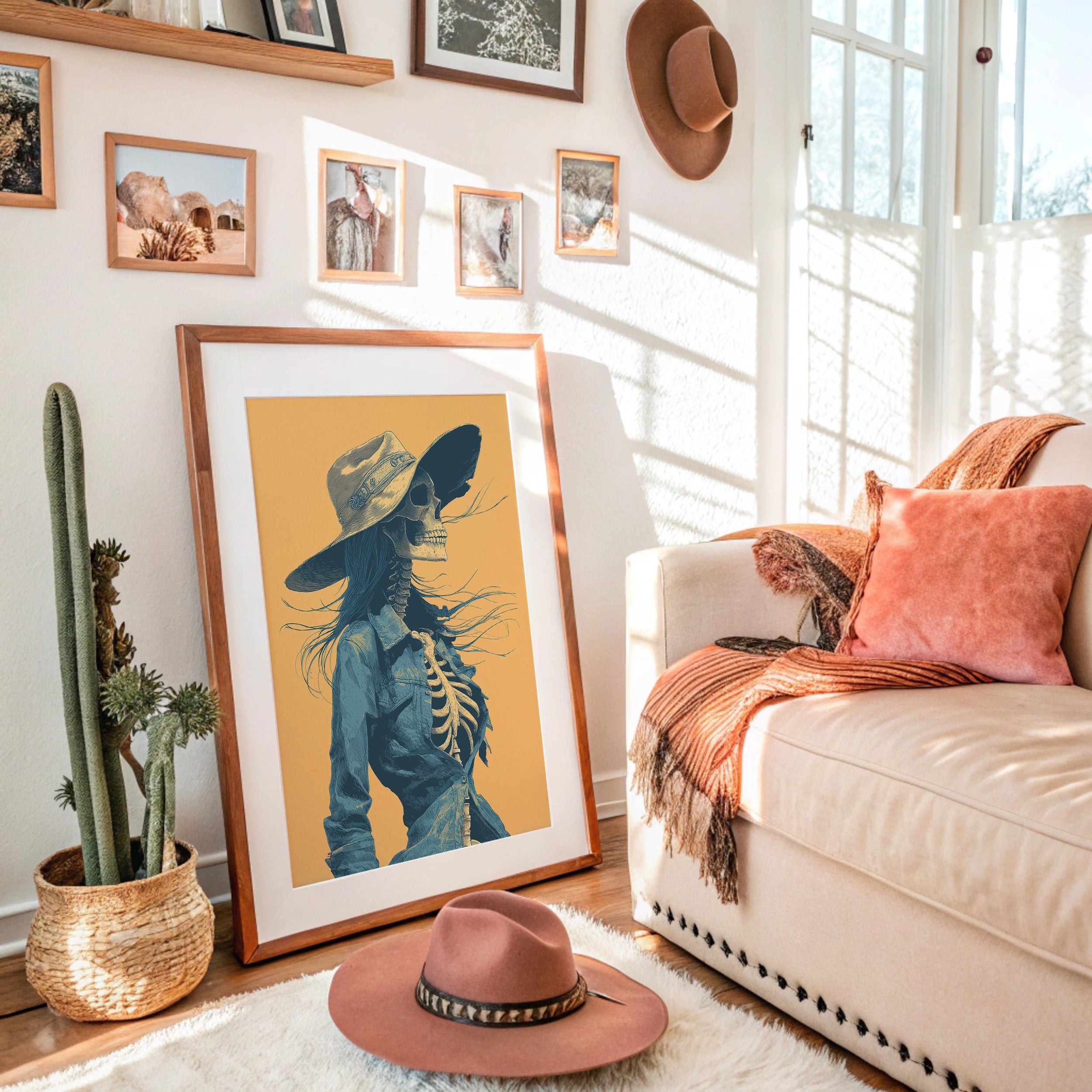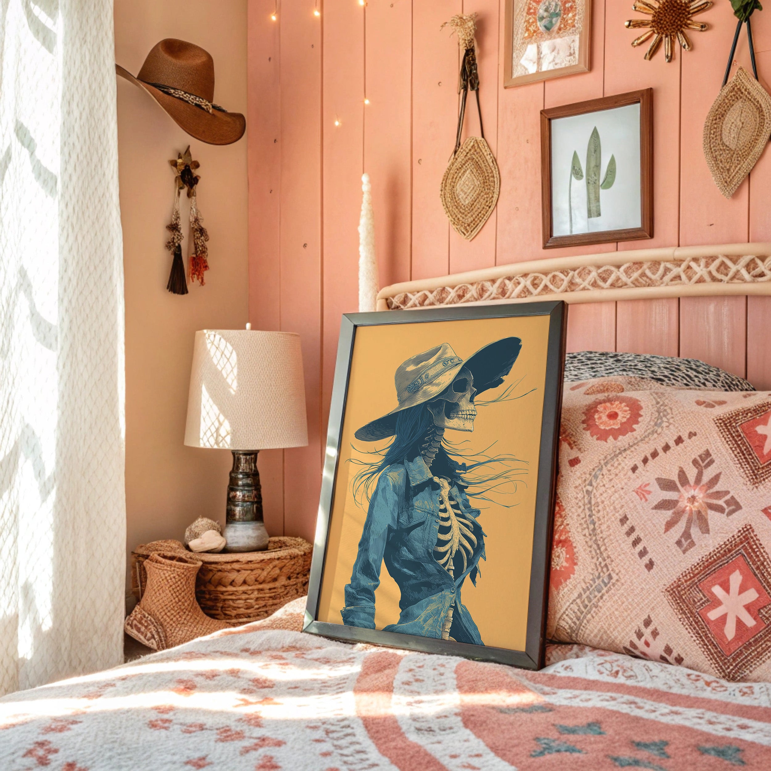 A haunting silhouette emerges from a sun-bleached canvas, where teal meets warm amber in an otherworldly dance. The figure stands defiant yet graceful, with flowing hair catching an invisible wind while skeletal elements peek through, creating an artful tension between life and the eternal. This contemporary interpretation of western mythology blends macabre elegance with desert mystique. Perfect for adding a bold statement to modern ranch homes, urban lofts, or any space seeking to blur the lines between edgy and sophisticated.