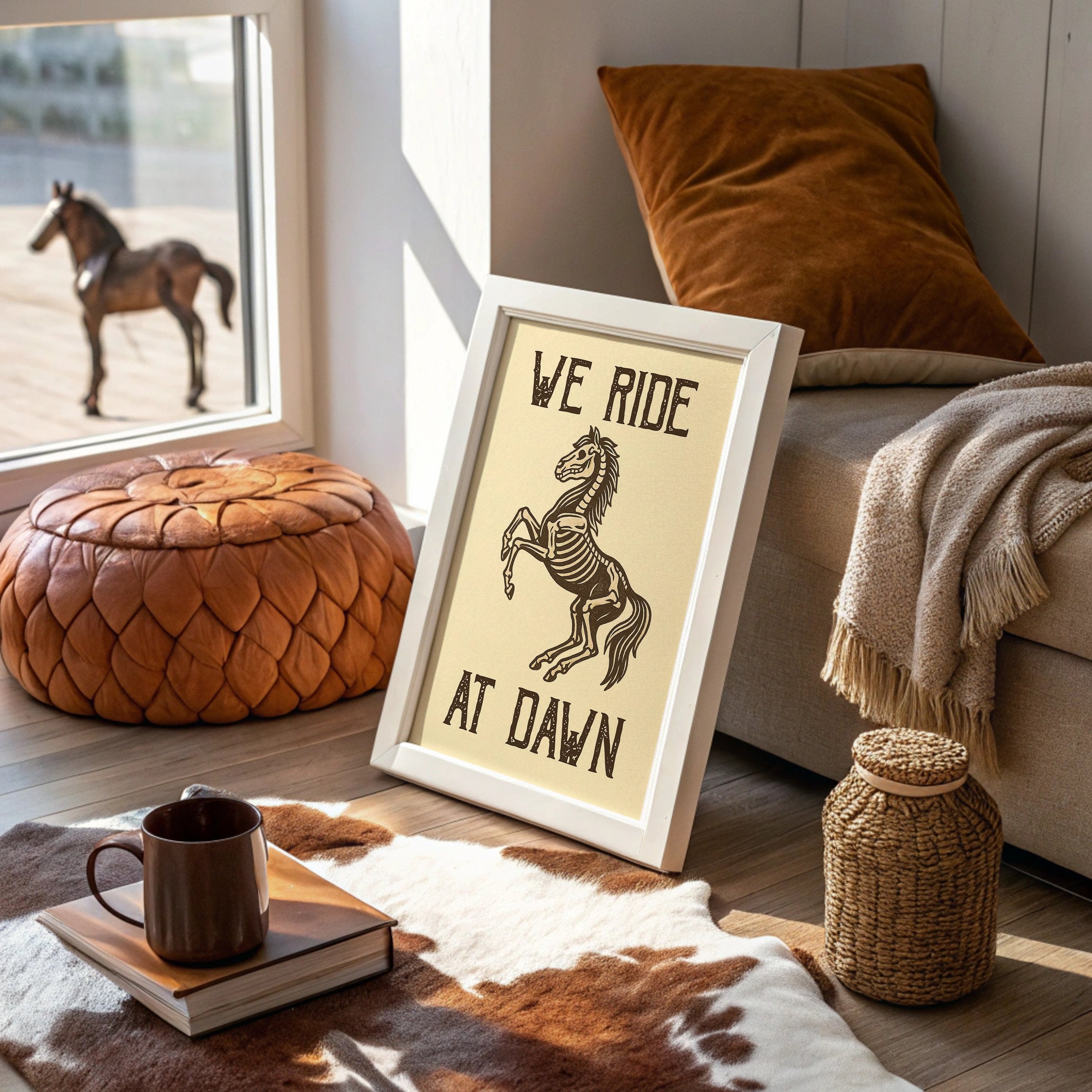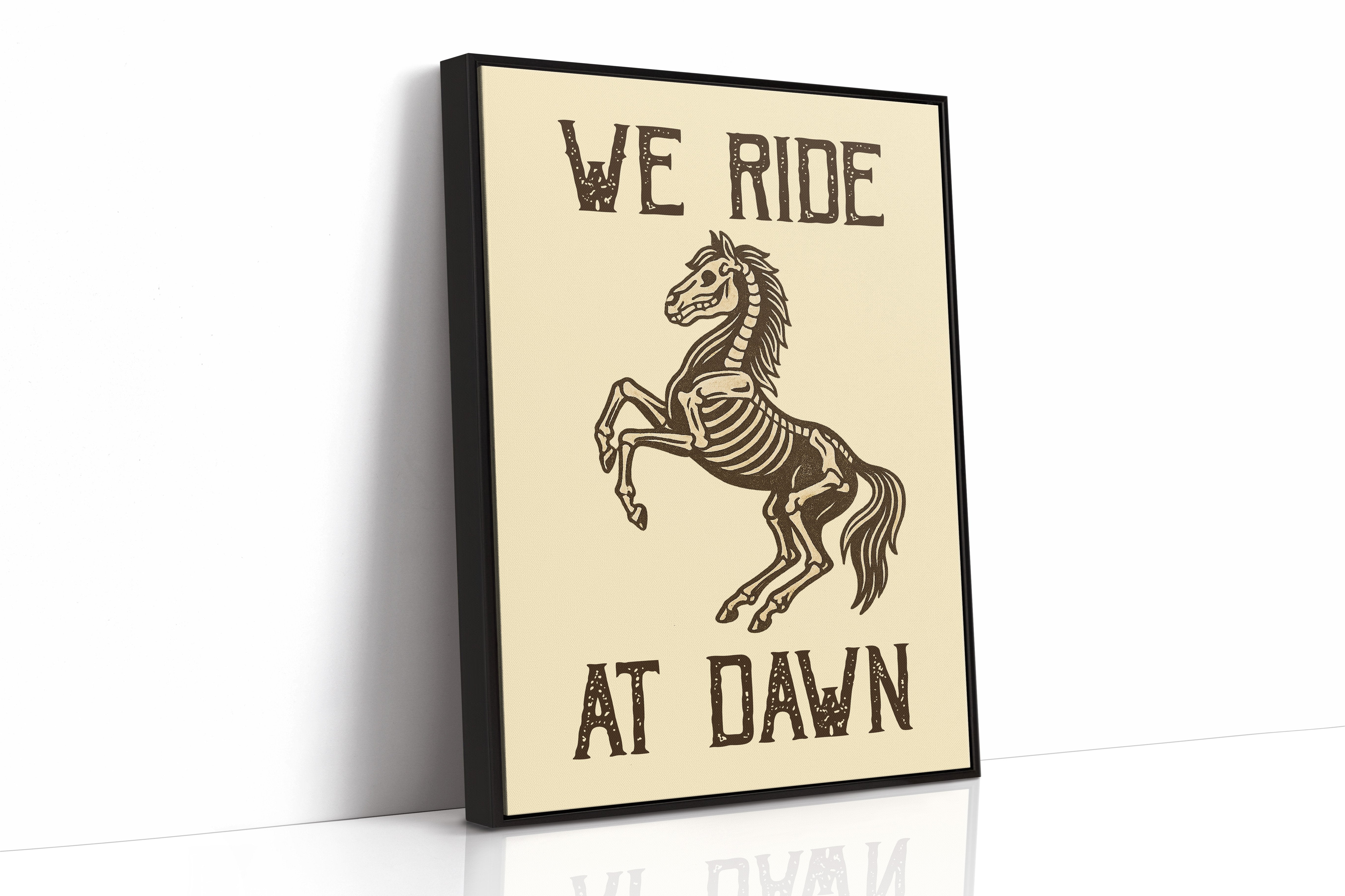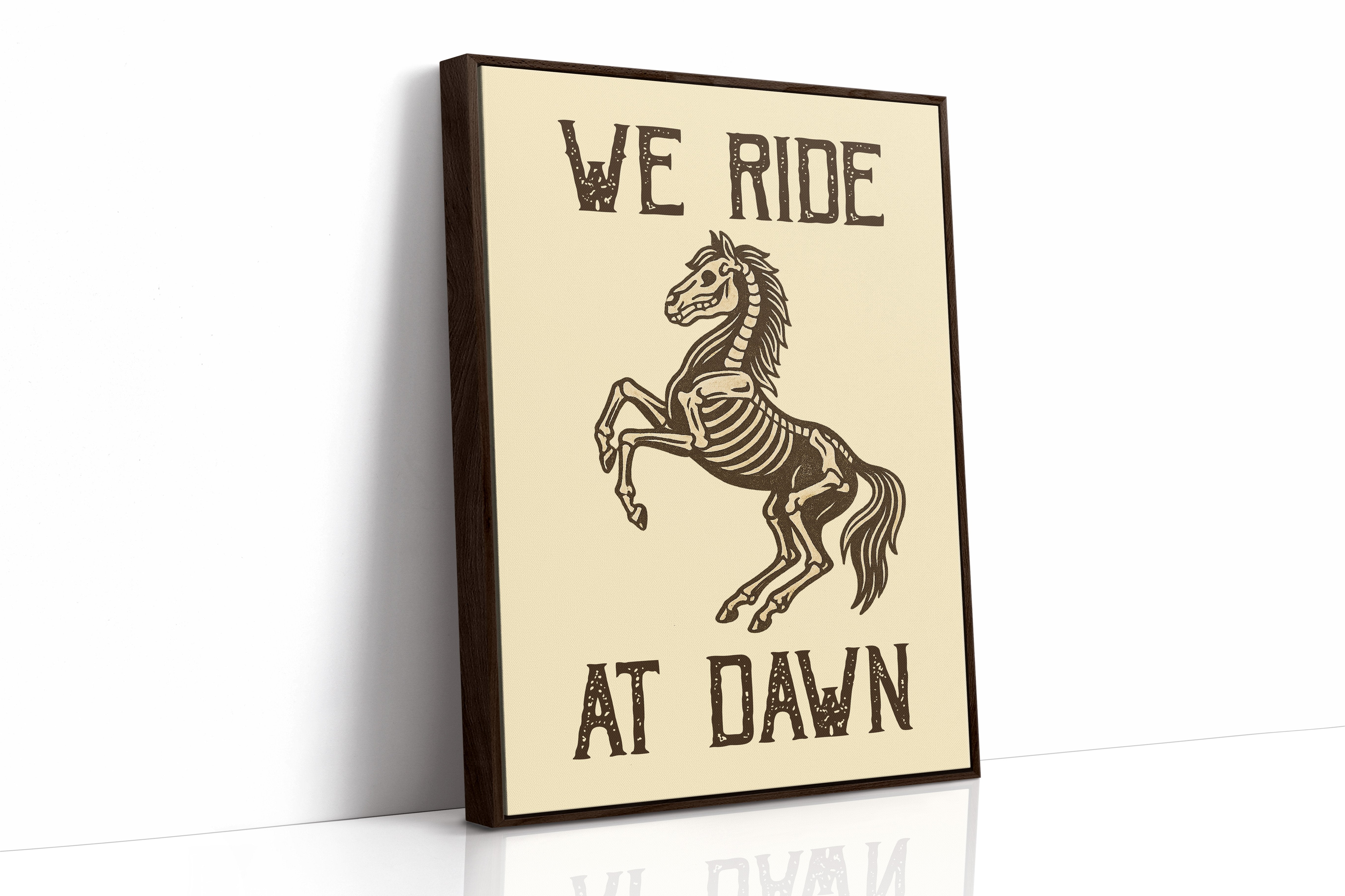 The skeleton of a wild stallion rears against a weathered parchment backdrop, caught between life and afterlife. Deep brown lines trace the anatomy of freedom, each bone telling stories of gallops across forgotten plains. The vintage typography frames this macabre yet beautiful celebration of the untamed spirit, reminiscent of old Western wanted posters and carnival announcements.