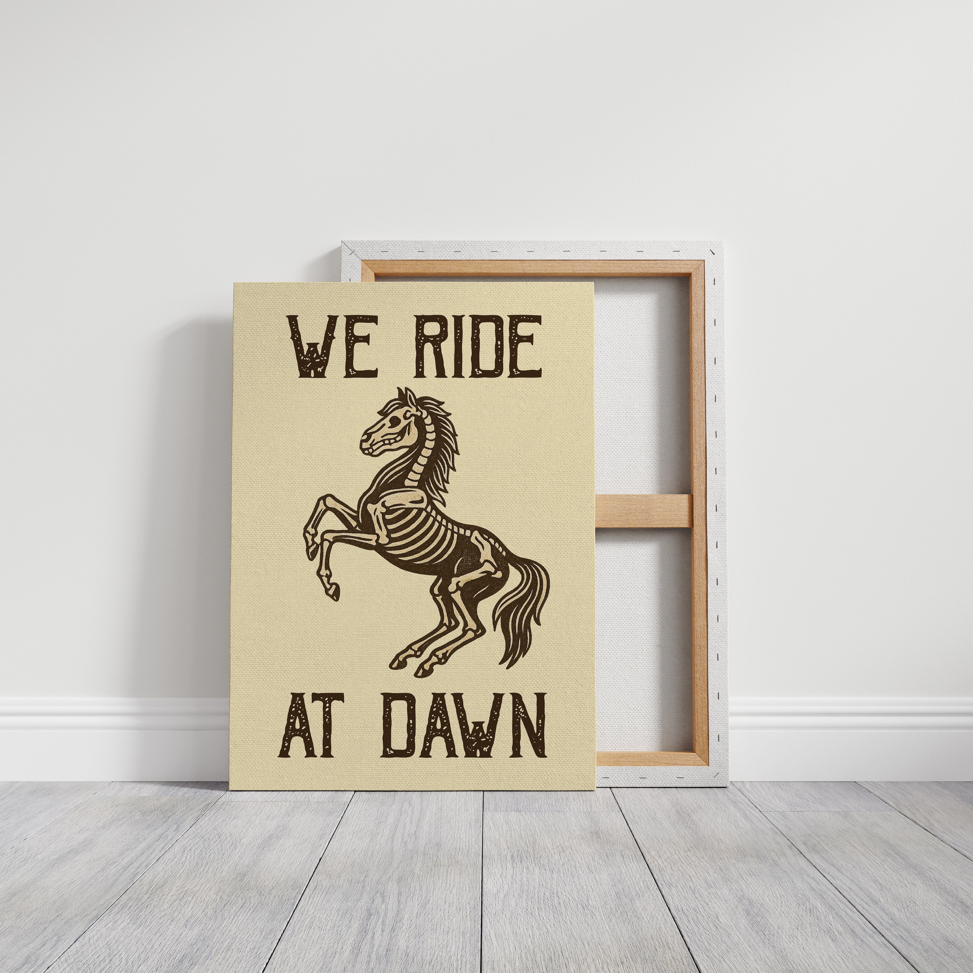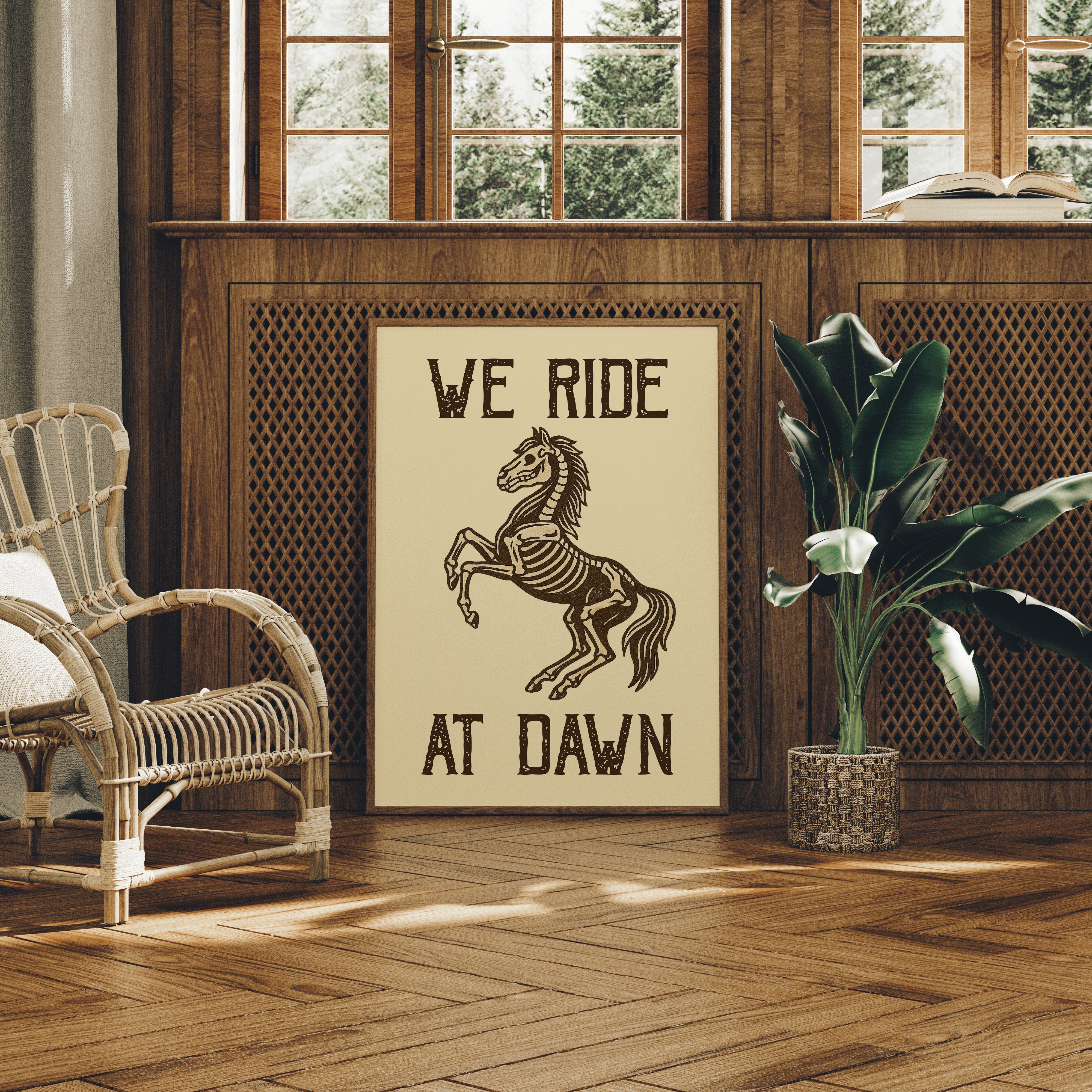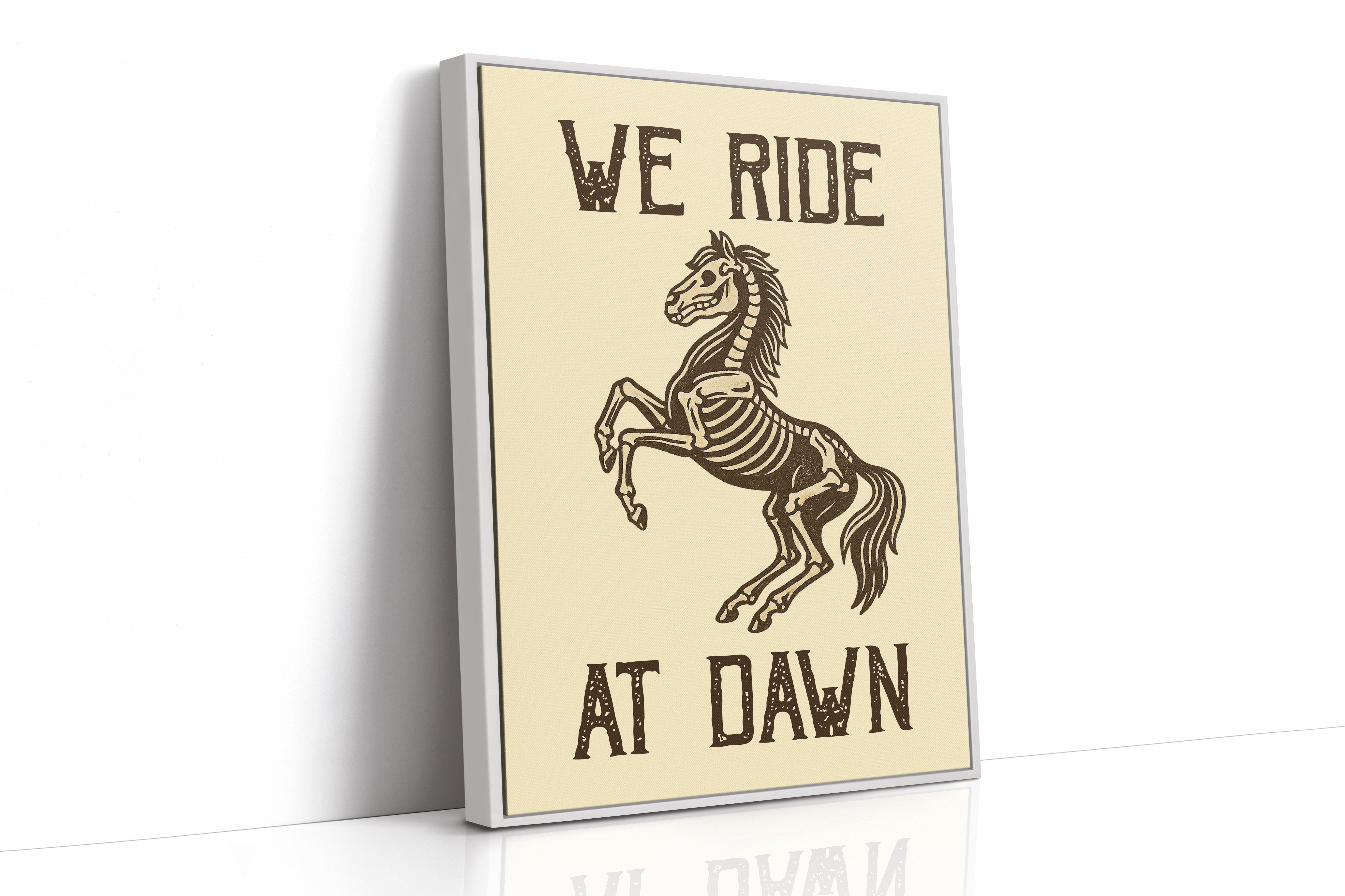 The skeleton of a wild stallion rears against a weathered parchment backdrop, caught between life and afterlife. Deep brown lines trace the anatomy of freedom, each bone telling stories of gallops across forgotten plains. The vintage typography frames this macabre yet beautiful celebration of the untamed spirit, reminiscent of old Western wanted posters and carnival announcements.