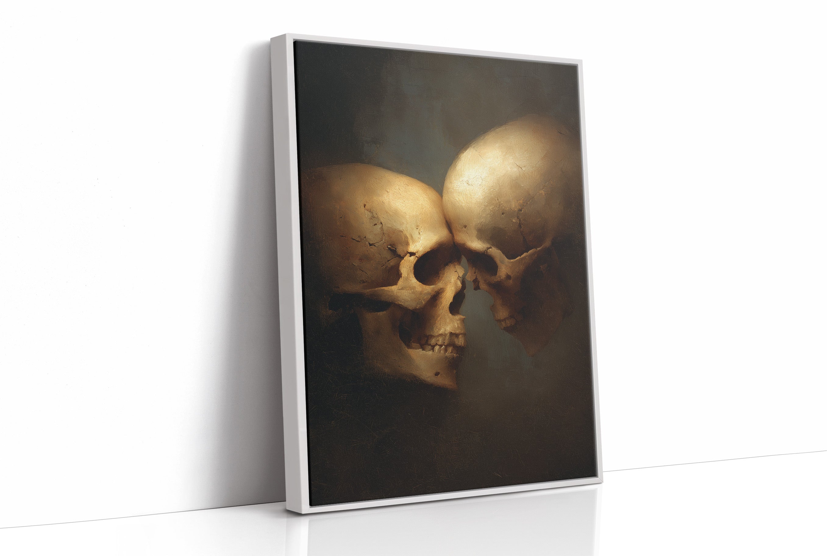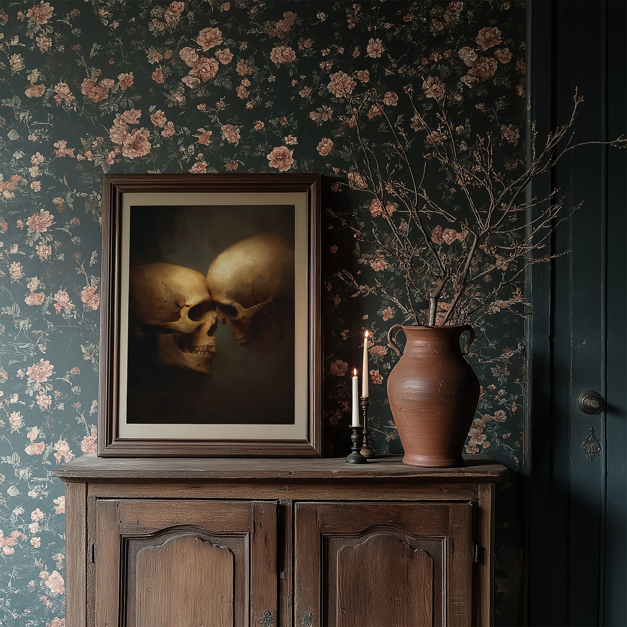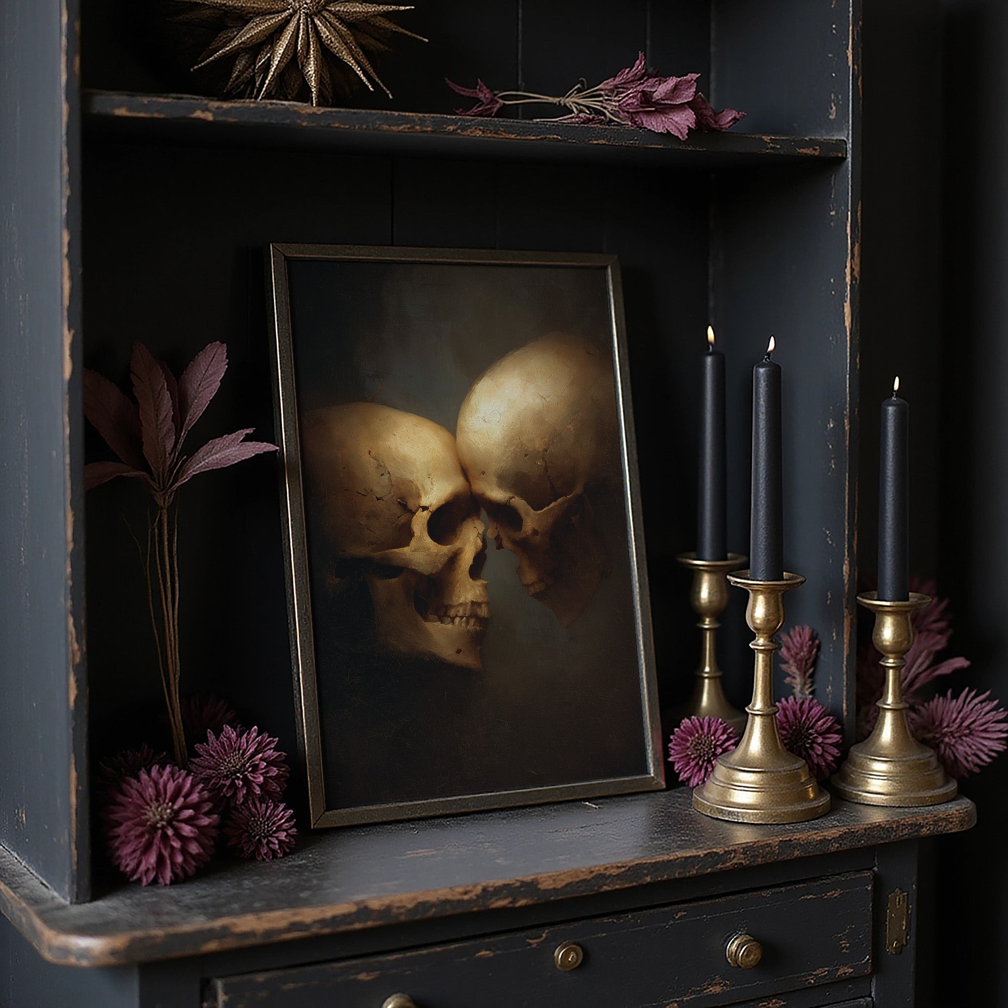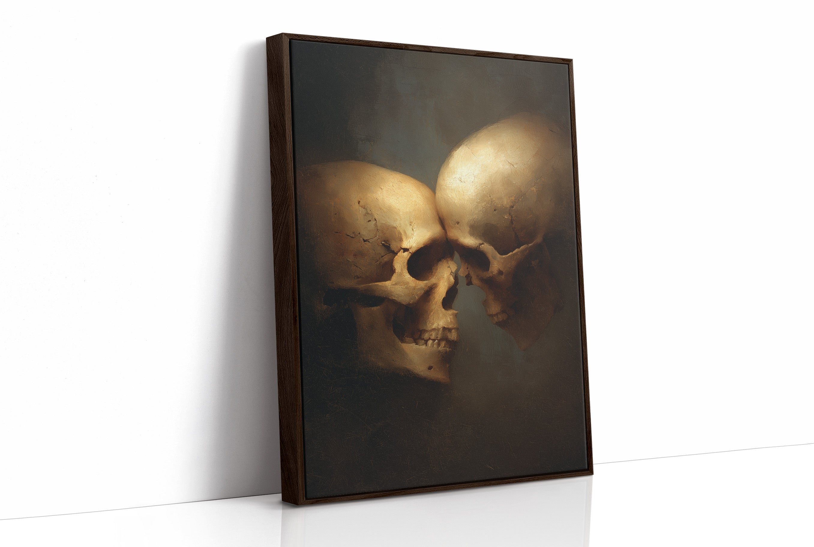 A haunting stillness emerges from the amber-toned skull floating in misty darkness, commanding attention with its somber dignity. The textured bone surface catches light with subtle warmth against the shadowy background, creating a meditation on mortality that feels both intimate and universal. This striking piece makes a bold statement in a study, library, or sophisticated dining space where thoughtful conversation flows.