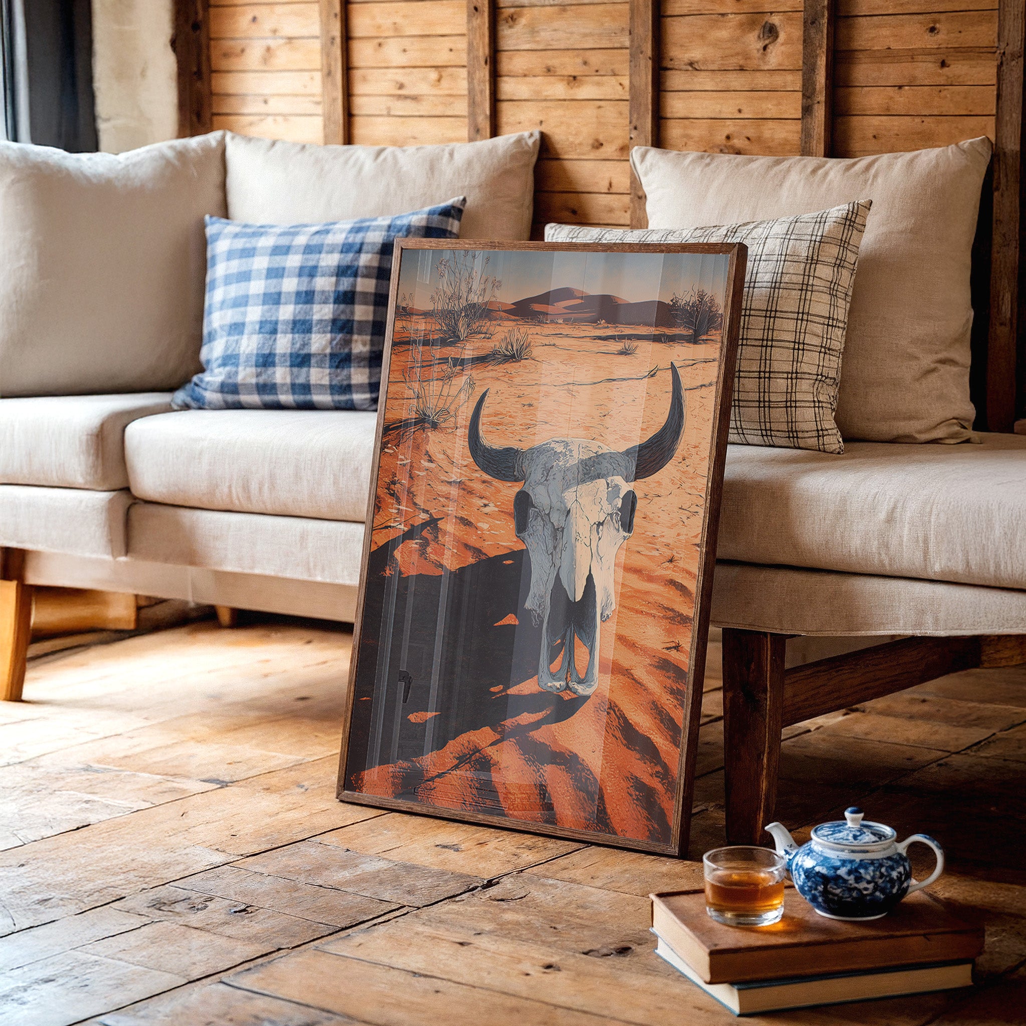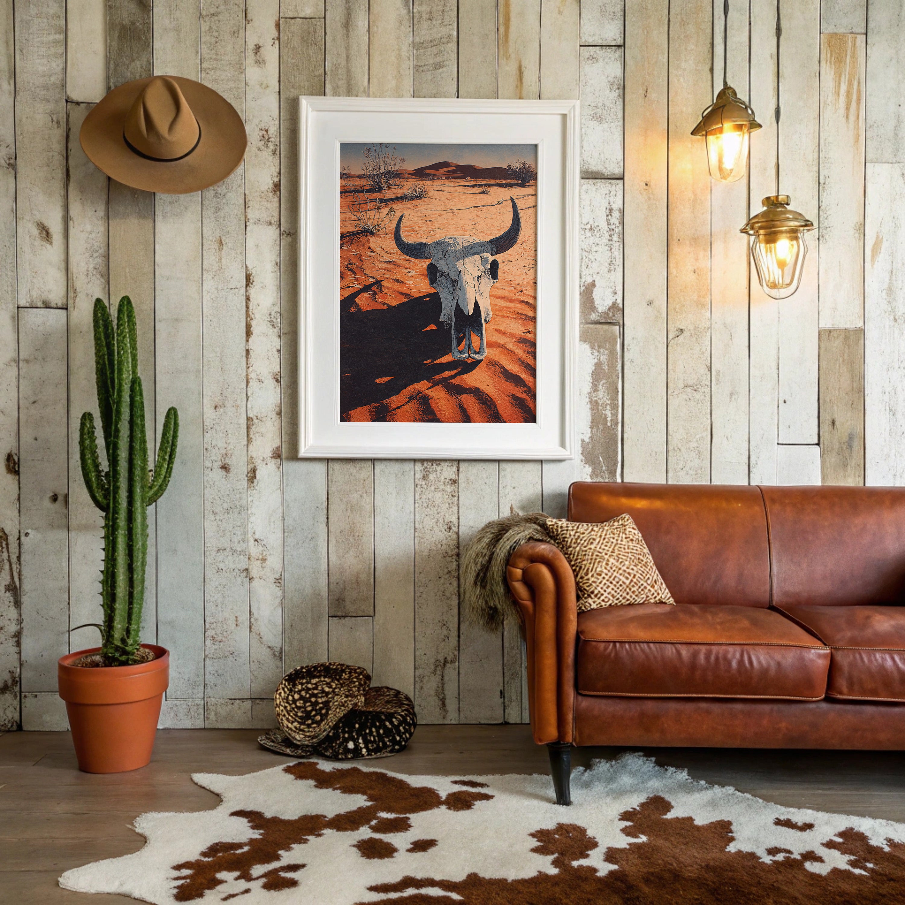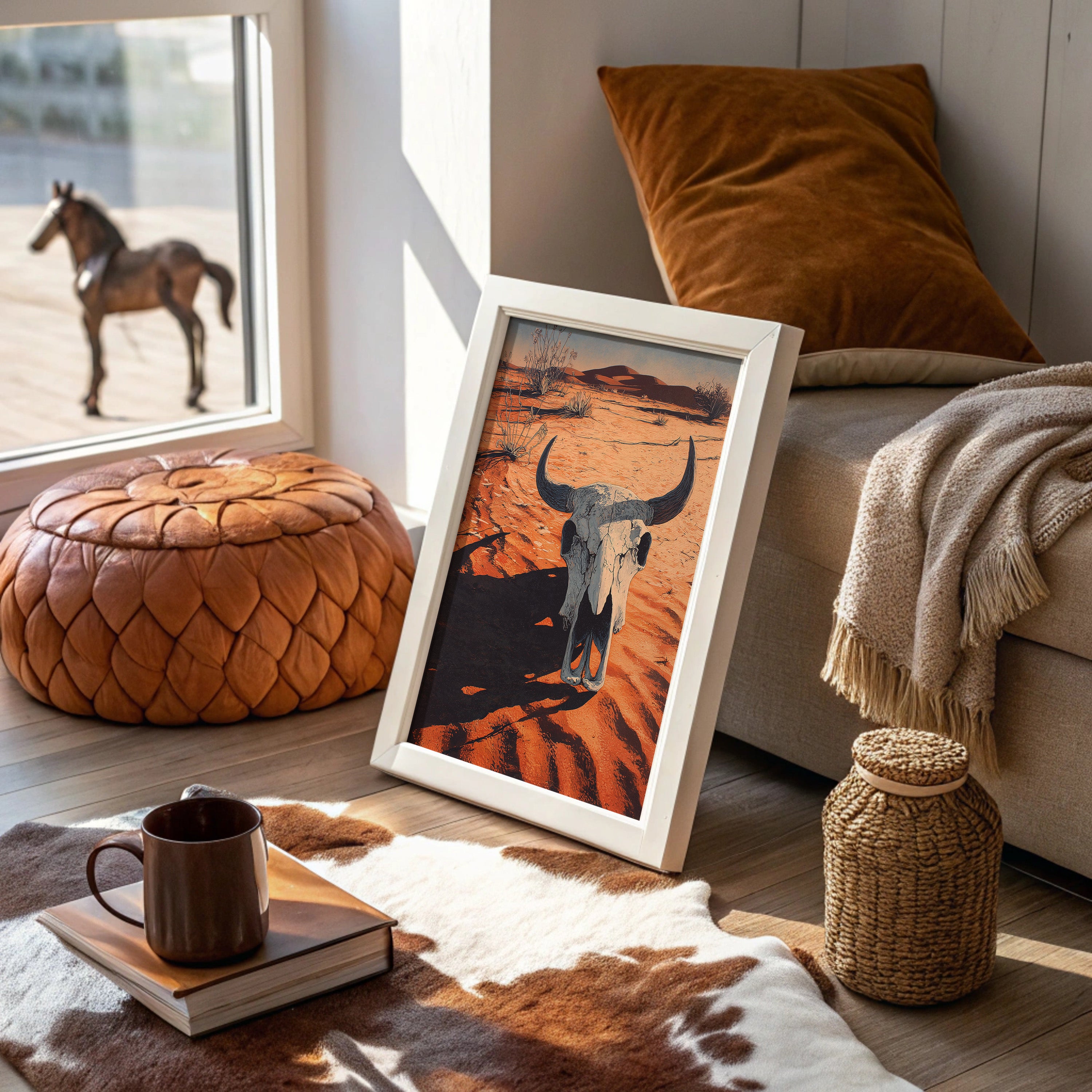 Sun-bleached memories rest against fiery sand dunes, where a lone skull tells stories of wild frontiers. The stark white bones create dramatic contrast against the rich orange desert landscape, while distant mountains paint purple silhouettes on the horizon. This striking southwestern scene captures both the rugged beauty and untamed spirit of arid lands. Perfect for adding authentic character to modern ranch homes, southwestern living spaces, or any room seeking to evoke the raw poetry of desert landscapes.