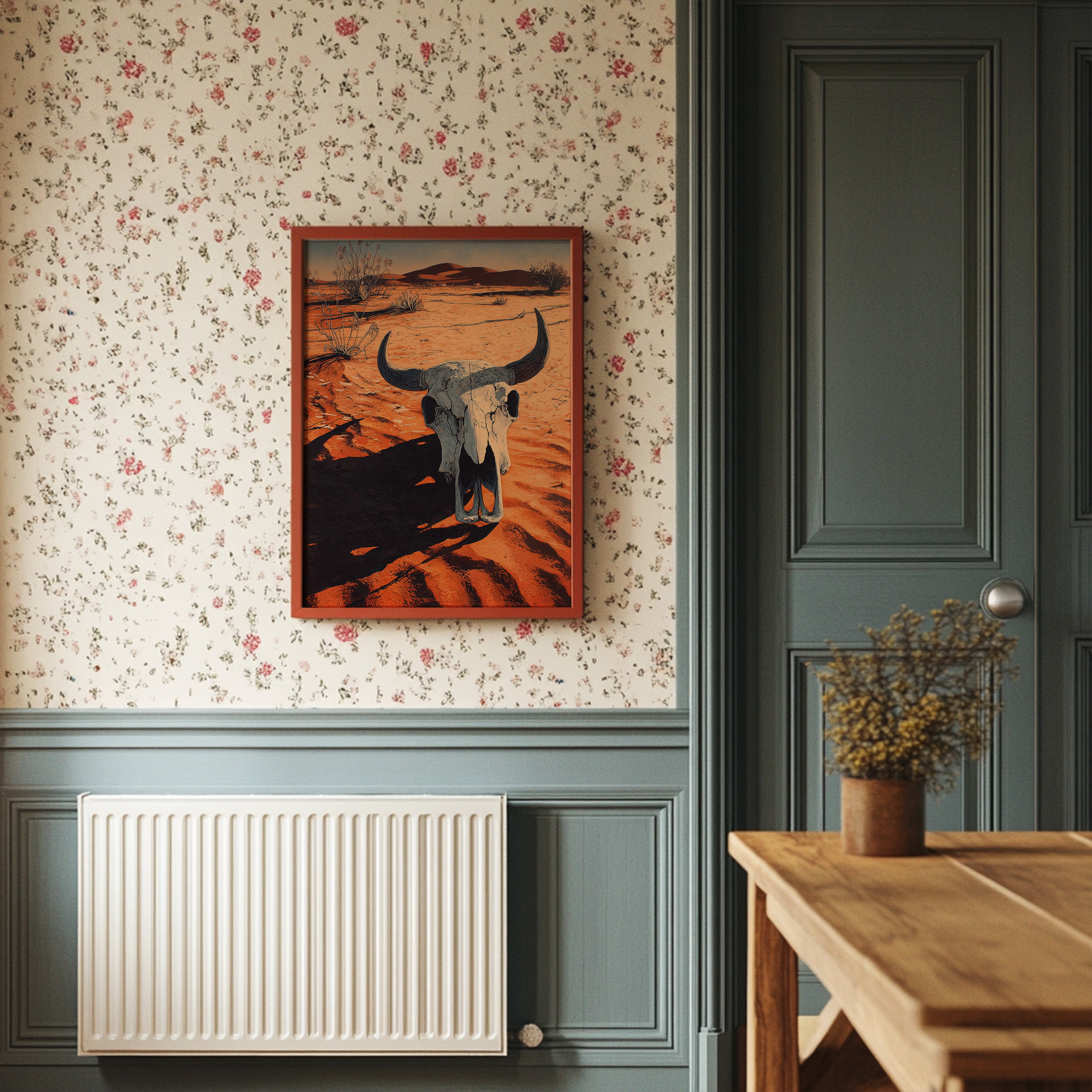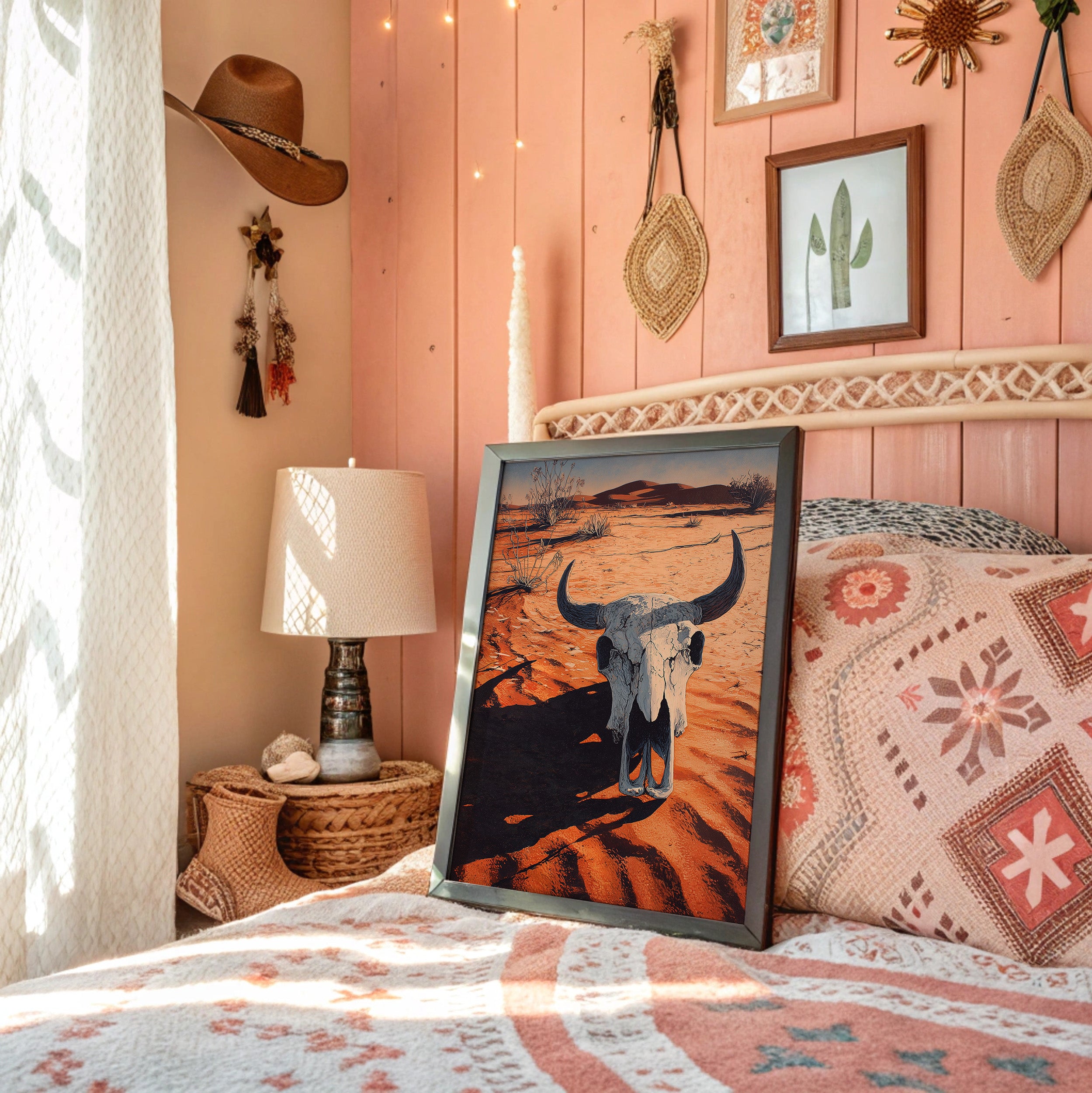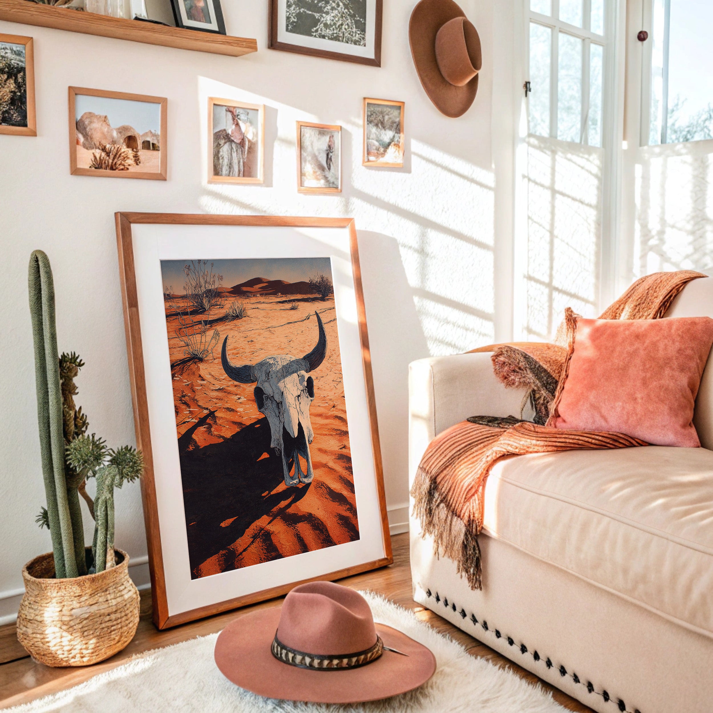 Sun-bleached memories rest against fiery sand dunes, where a lone skull tells stories of wild frontiers. The stark white bones create dramatic contrast against the rich orange desert landscape, while distant mountains paint purple silhouettes on the horizon. This striking southwestern scene captures both the rugged beauty and untamed spirit of arid lands. Perfect for adding authentic character to modern ranch homes, southwestern living spaces, or any room seeking to evoke the raw poetry of desert landscapes.