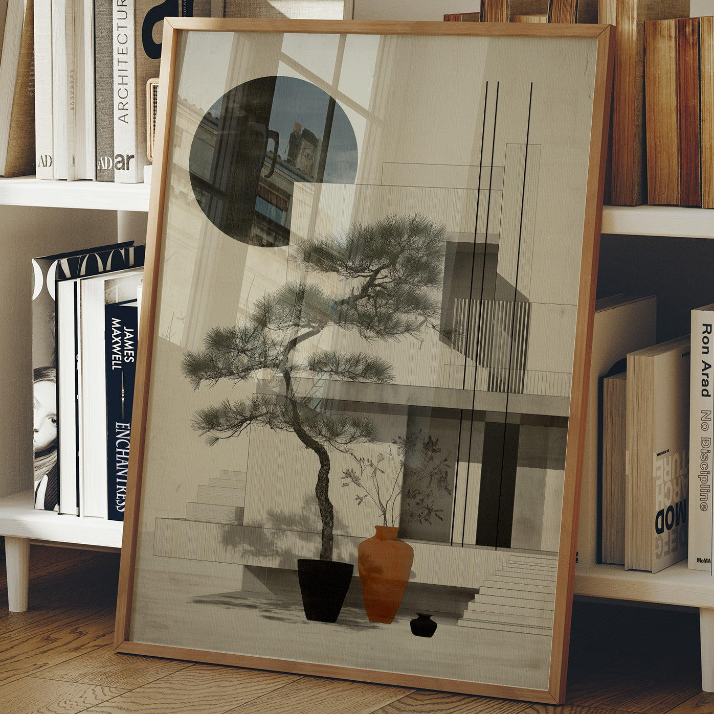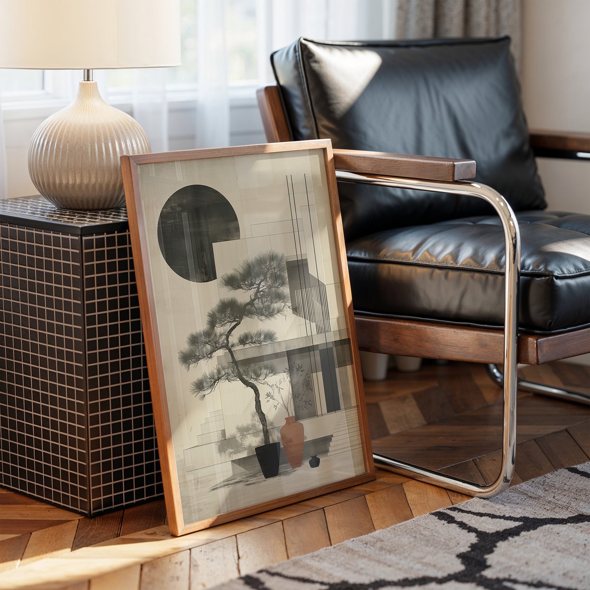 Sunlight streams across hardwood floors, casting gentle shadows that dance with a minimalist Japanese-inspired scene. The delicate lines of a bonsai tree stretch gracefully against geometric shapes and a bold circle, creating a harmonious balance between nature and modern design. The monochromatic palette in soft greys and creams speaks to tranquility while subtle textures add depth and sophistication. This piece would bring zen-like serenity to a contemporary living room or meditation space, perfectly complementing modern furniture and natural materials.