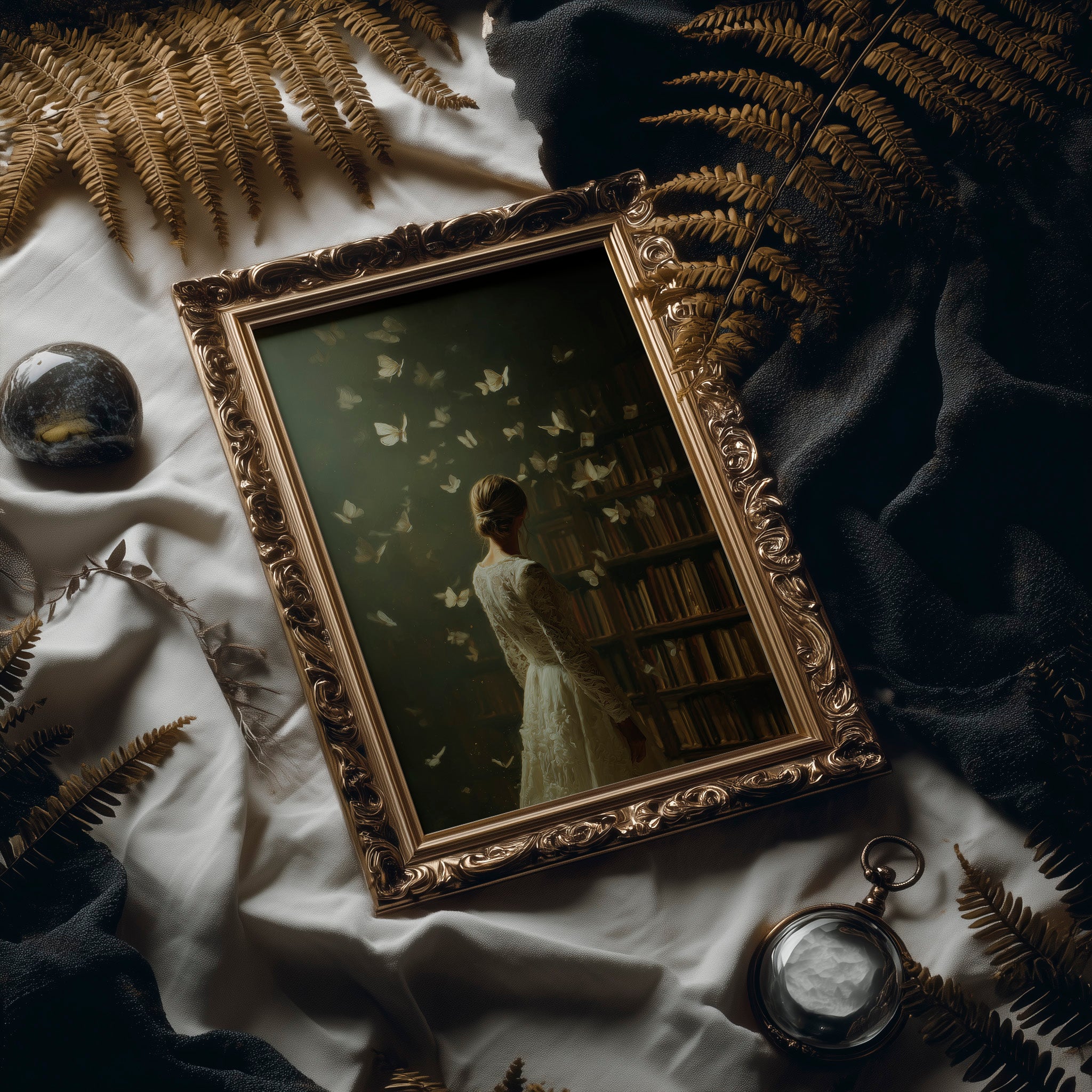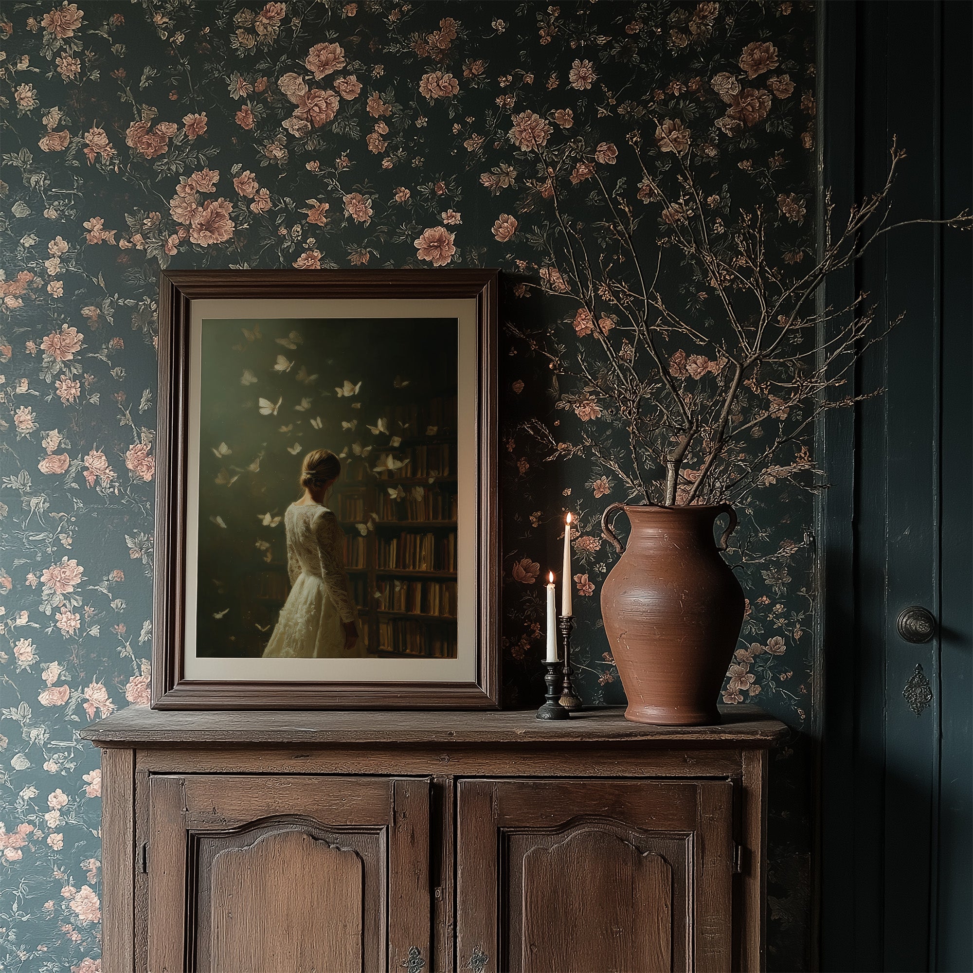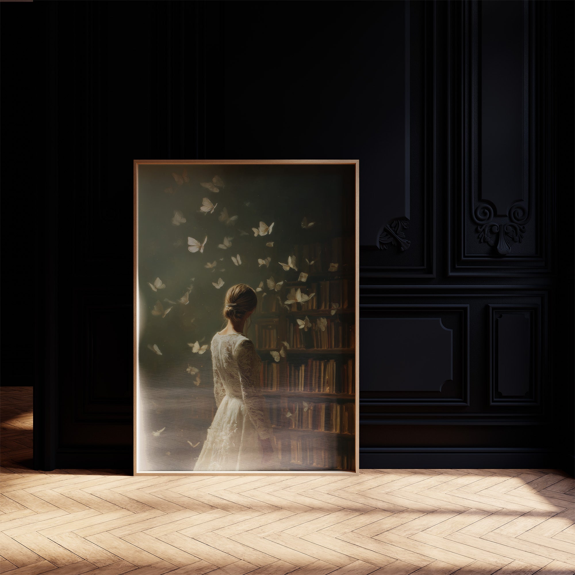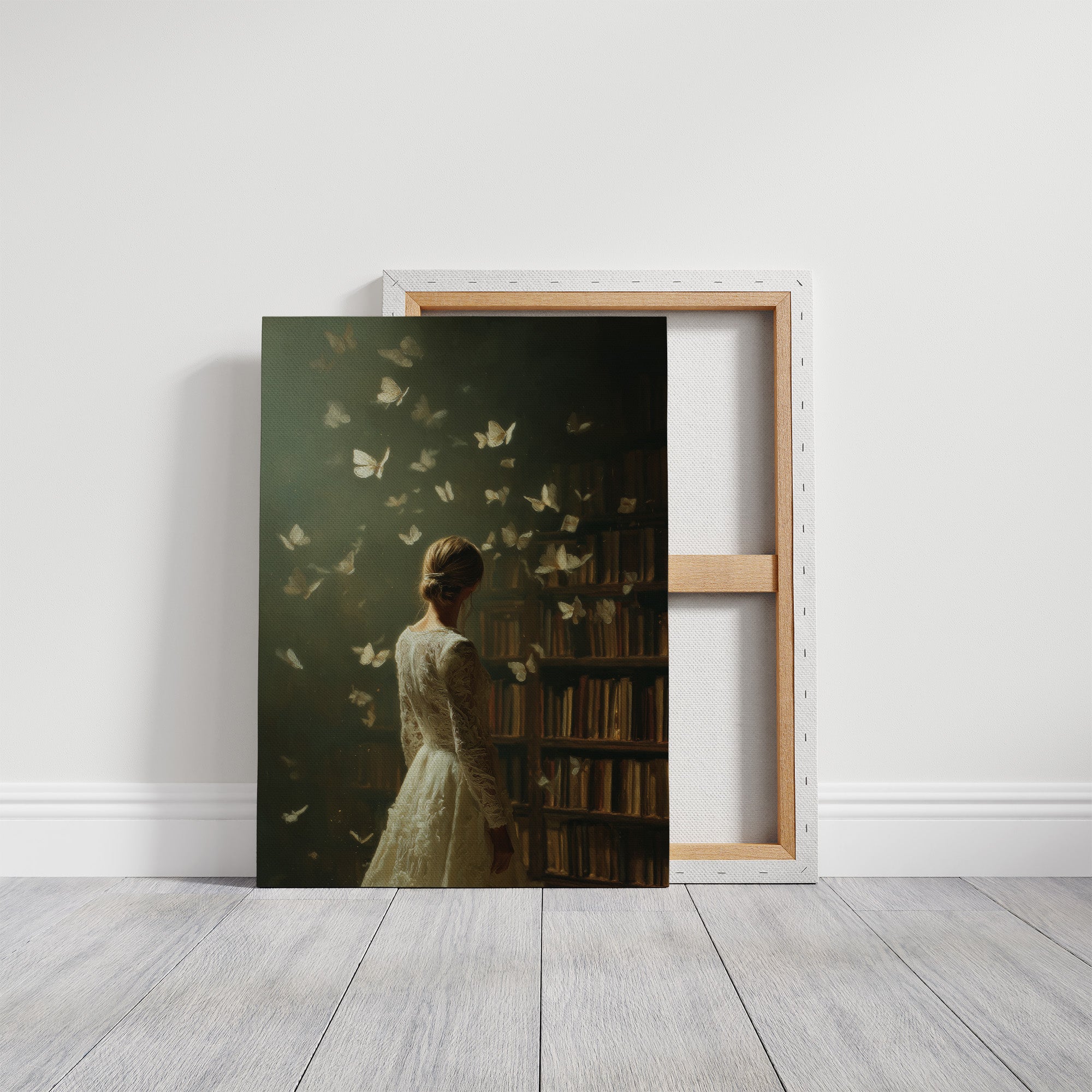A moment suspended in time as delicate butterflies emerge from ancient bookshelves, surrounding a solitary figure in white lace. The muted olive backdrop creates a dreamlike atmosphere where literature transforms into living wings, each page taking flight. The elegant composition balances nostalgia and wonder, inviting viewers into a world where stories transcend their bindings. This ethereal piece brings contemplative beauty to reading nooks, home libraries, or quiet bedroom retreats where imagination reigns.