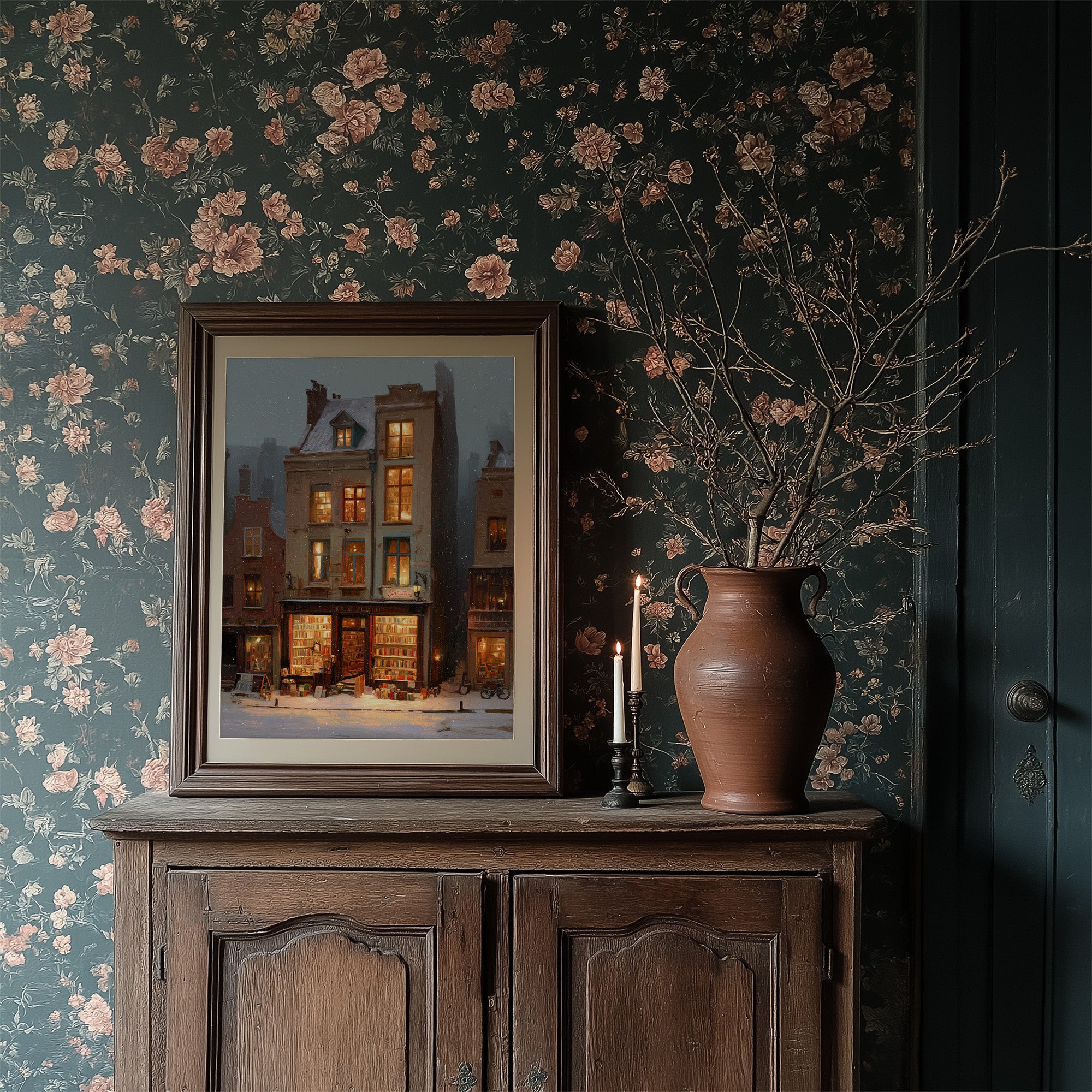 Snowflakes drift lazily past windows that spill golden light onto cobblestone streets, inviting passersby into a world of stories. The narrow European bookshop rises four stories tall, its shelves visible through large display windows, promising literary treasures within warm walls. Rich amber tones contrast against the cool blue-gray of winter twilight, creating an irresistible haven for book lovers and dreamers alike.