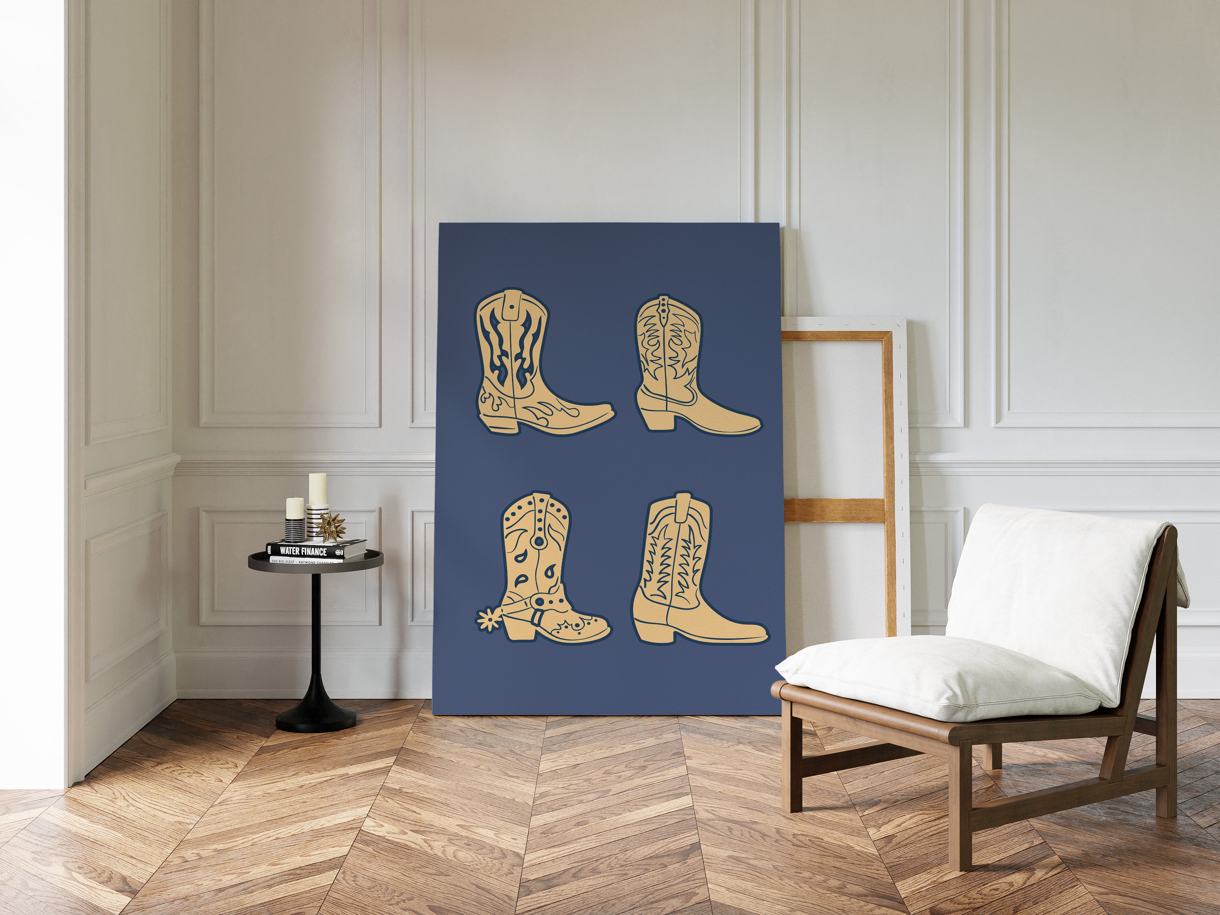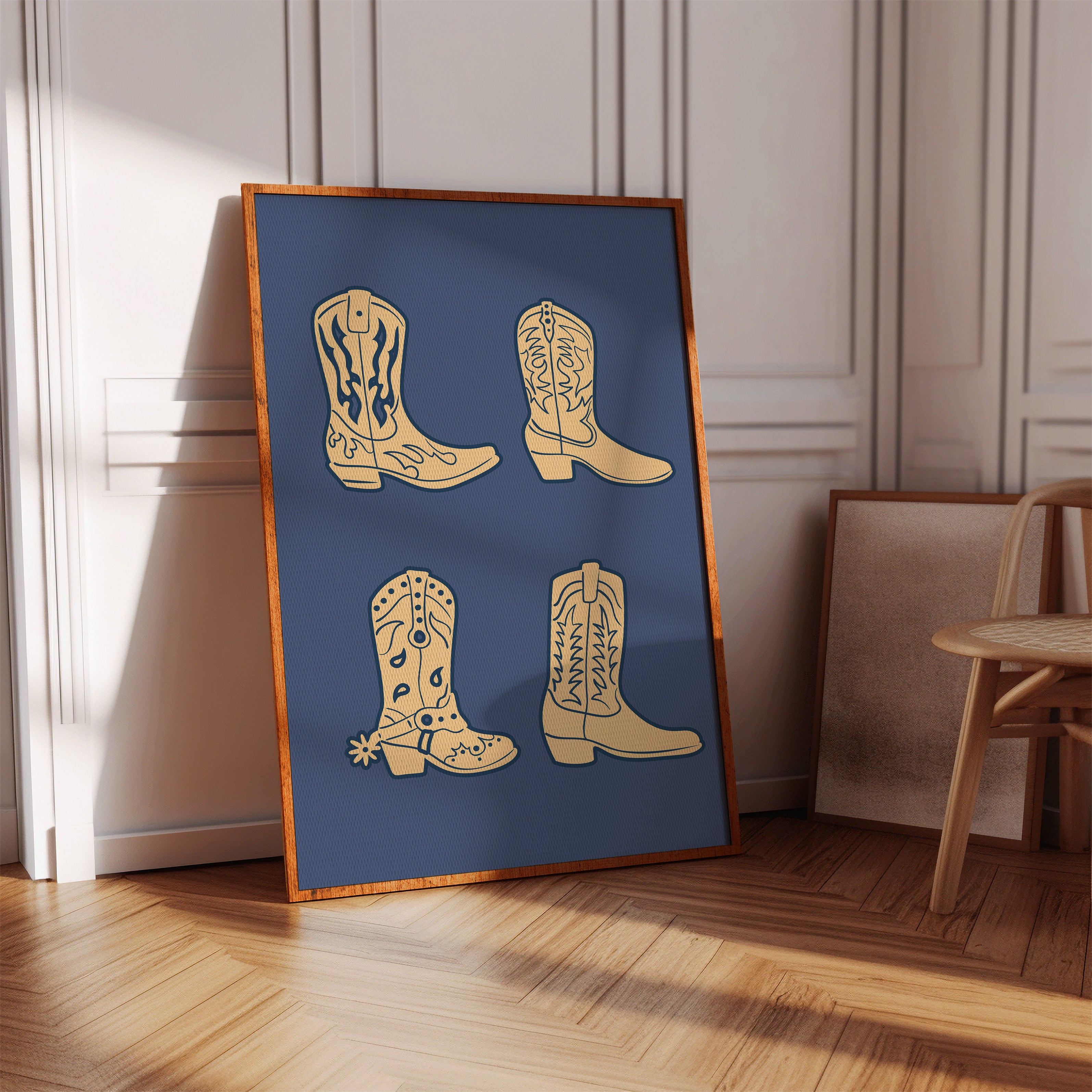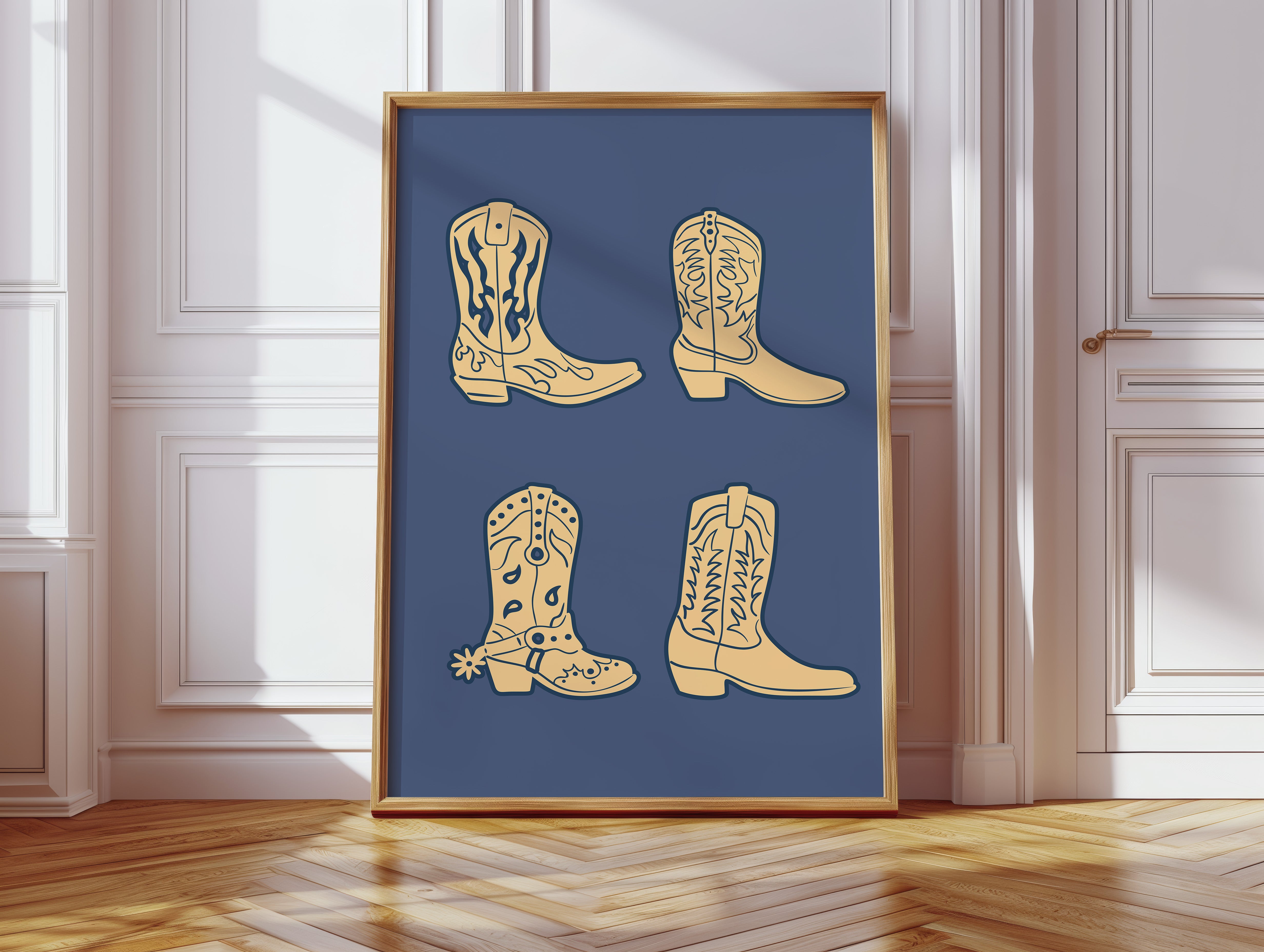 Cream-colored silhouettes dance against deep navy, each boot carrying stories of dusty trails and open skies. This contemporary interpretation brings classic Western motifs into modern minimalist design. The simple yet striking composition features four distinct cowboy boots, each adorned with traditional stitching patterns and decorative elements that speak to the rich heritage of ranch life. Against the solid background, these iconic shapes become powerful symbols of American culture and adventure. Perfect for adding a sophisticated Western accent to a modern home office or creating an eye-catching focal point in a rustic-contemporary living space.