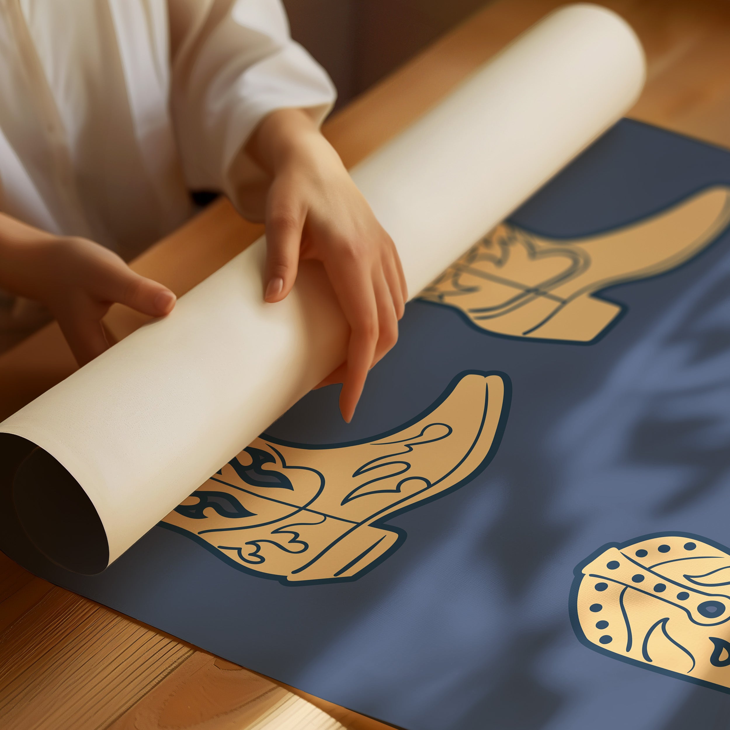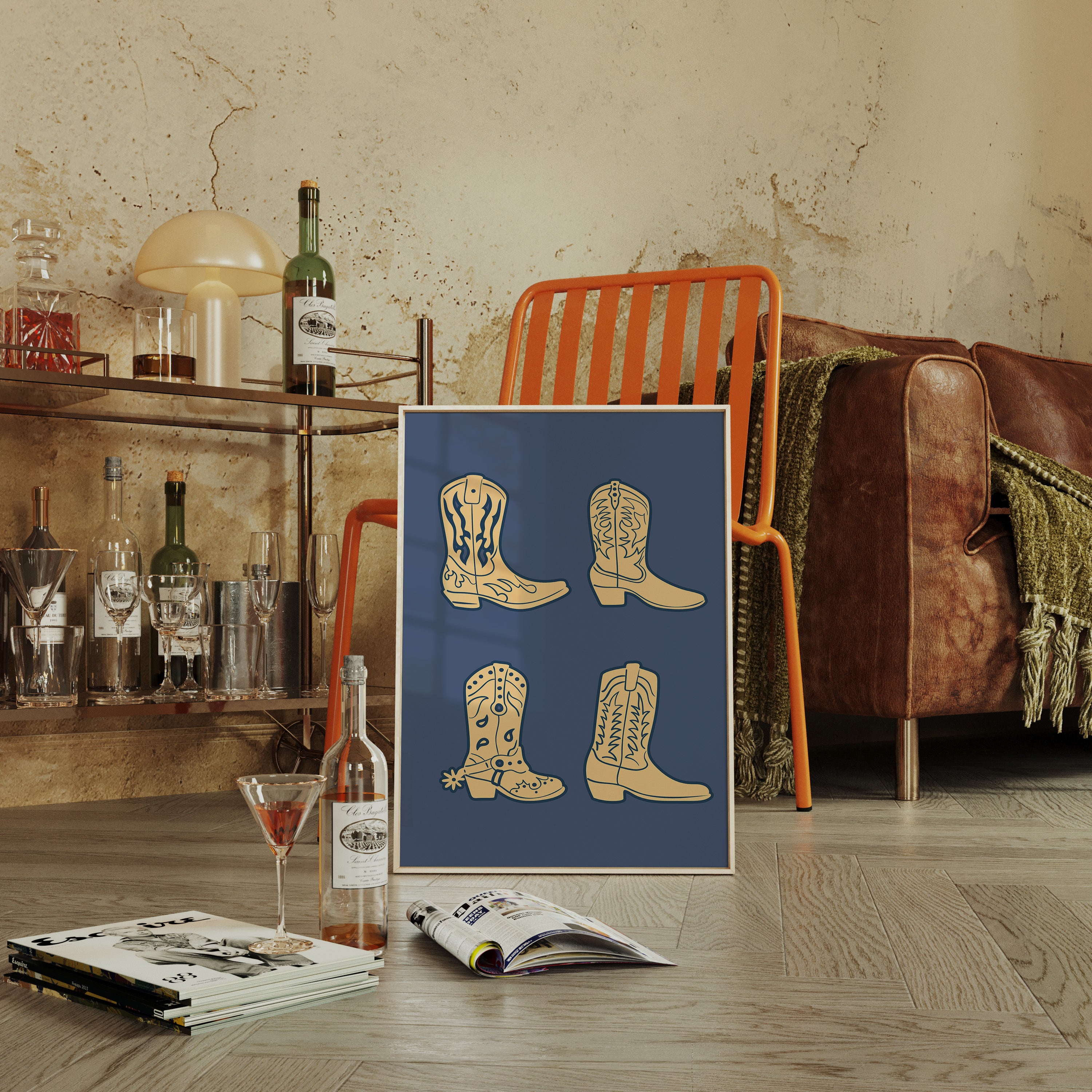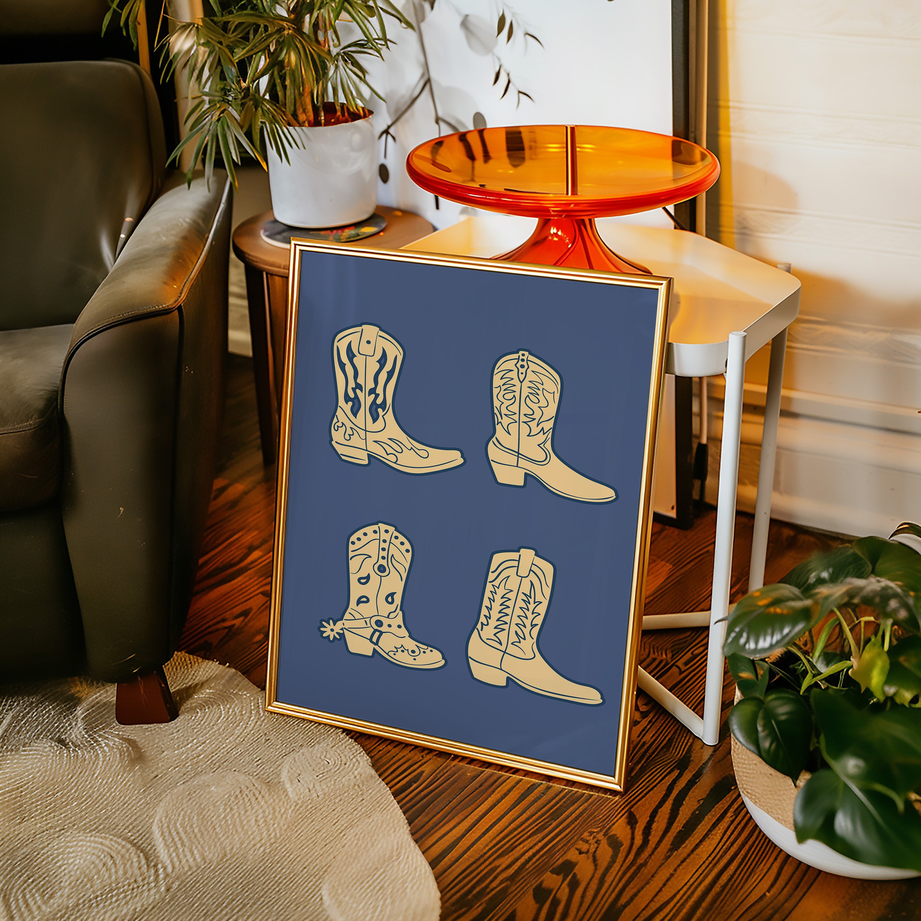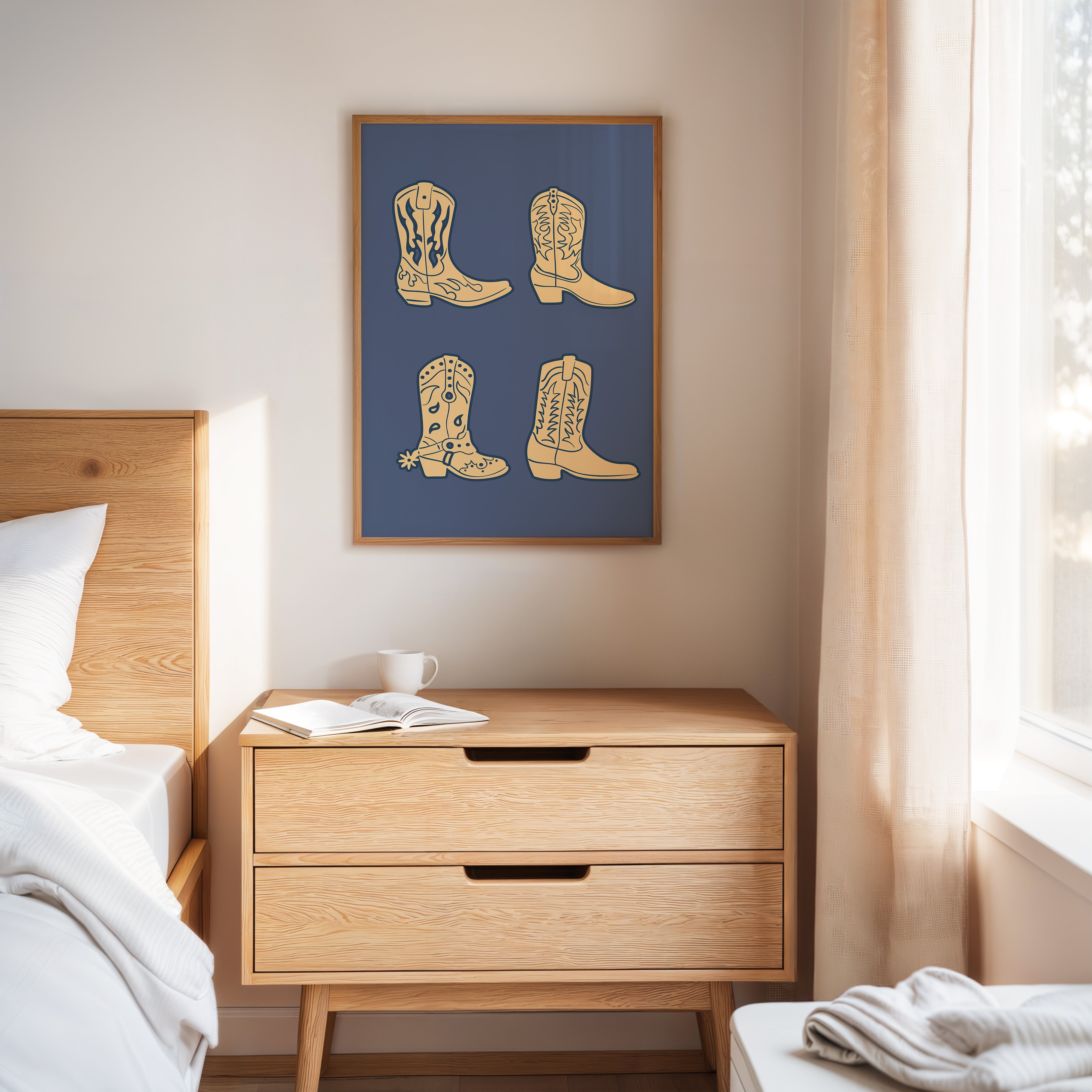 Cream-colored silhouettes dance against deep navy, each boot carrying stories of dusty trails and open skies. This contemporary interpretation brings classic Western motifs into modern minimalist design. The simple yet striking composition features four distinct cowboy boots, each adorned with traditional stitching patterns and decorative elements that speak to the rich heritage of ranch life. Against the solid background, these iconic shapes become powerful symbols of American culture and adventure. Perfect for adding a sophisticated Western accent to a modern home office or creating an eye-catching focal point in a rustic-contemporary living space.