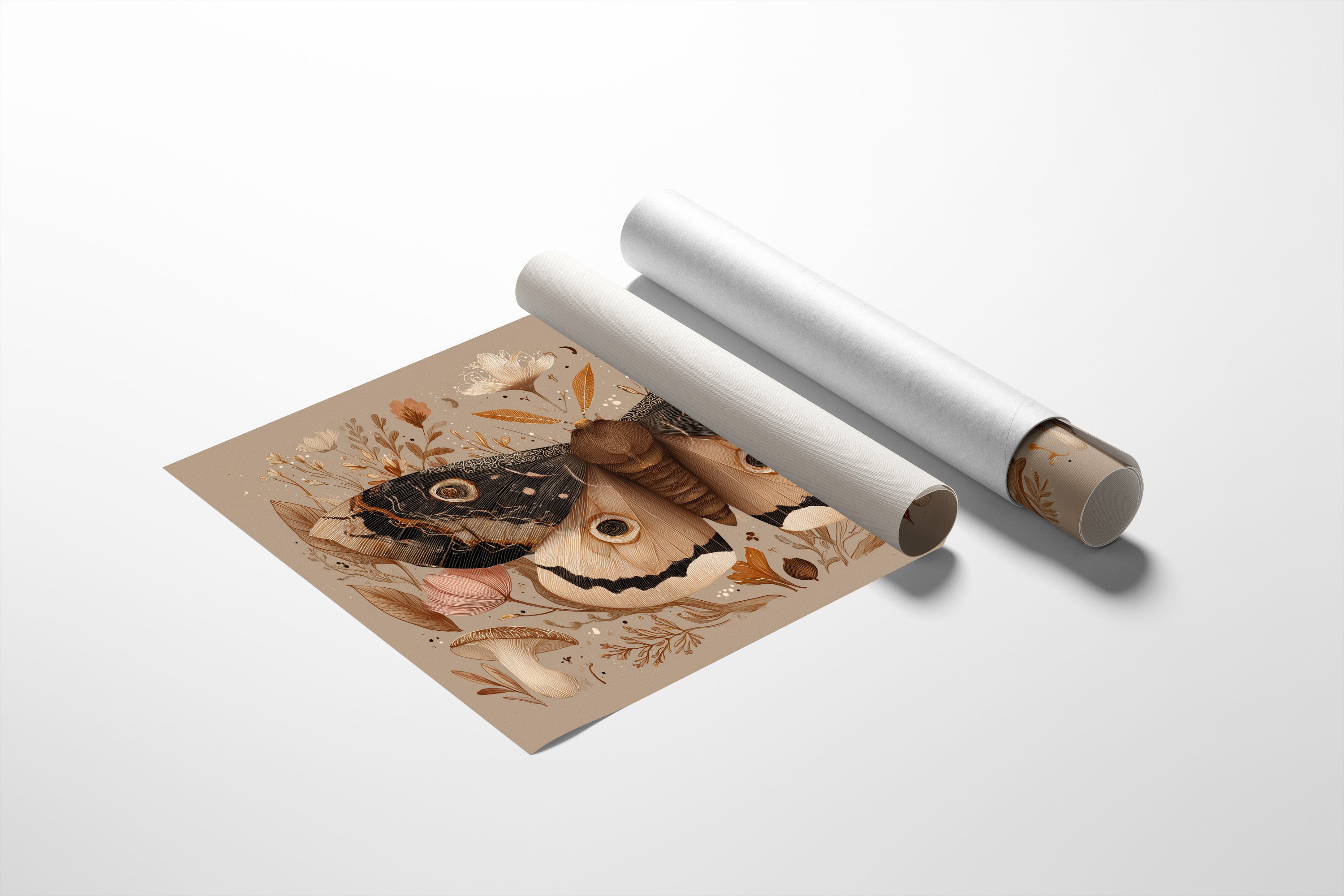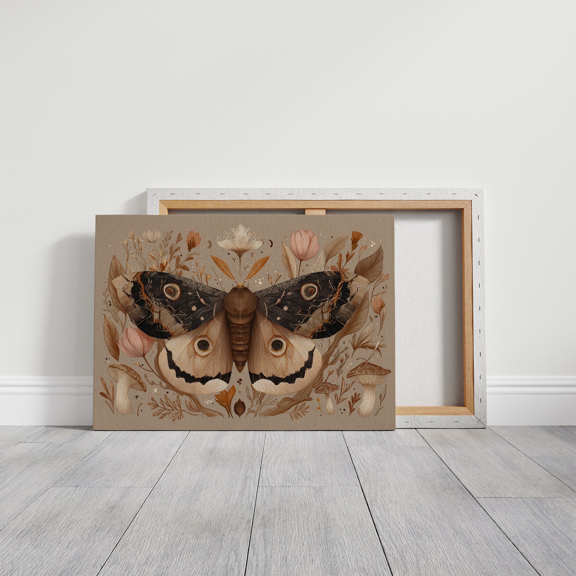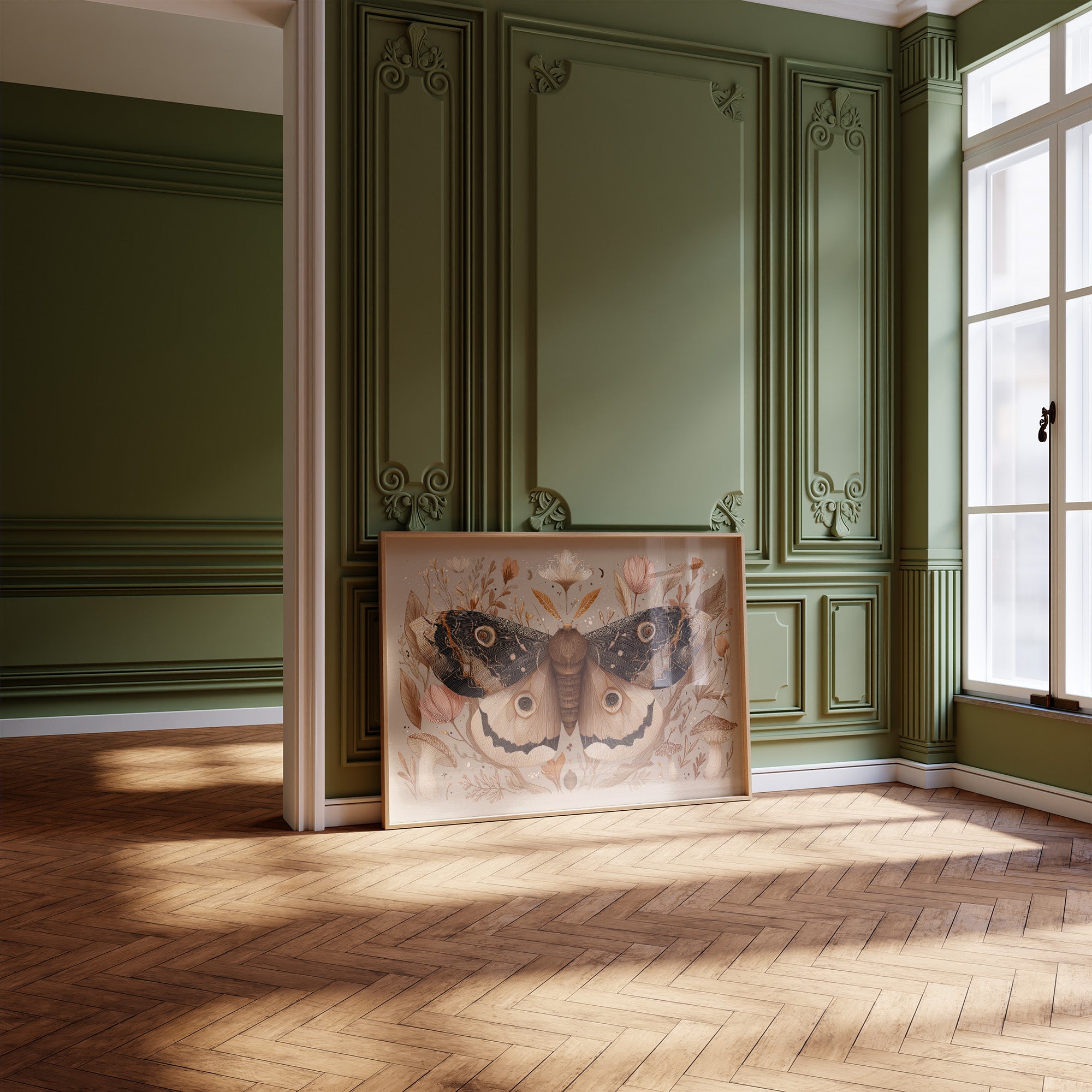 A delicate illustration of a moth rests against a backdrop of countless stories waiting to be discovered. The elegant insect, rendered in navy blue and cream with eye-like markings, is surrounded by soft blush florals and amber botanicals, creating a harmonious natural study. The warm wooden bookshelves behind frame this moment of quiet beauty, where science and art merge in perfect balance. This piece brings scholarly charm and natural wonder to a home office, reading nook, or any space where curiosity and contemplation are valued.