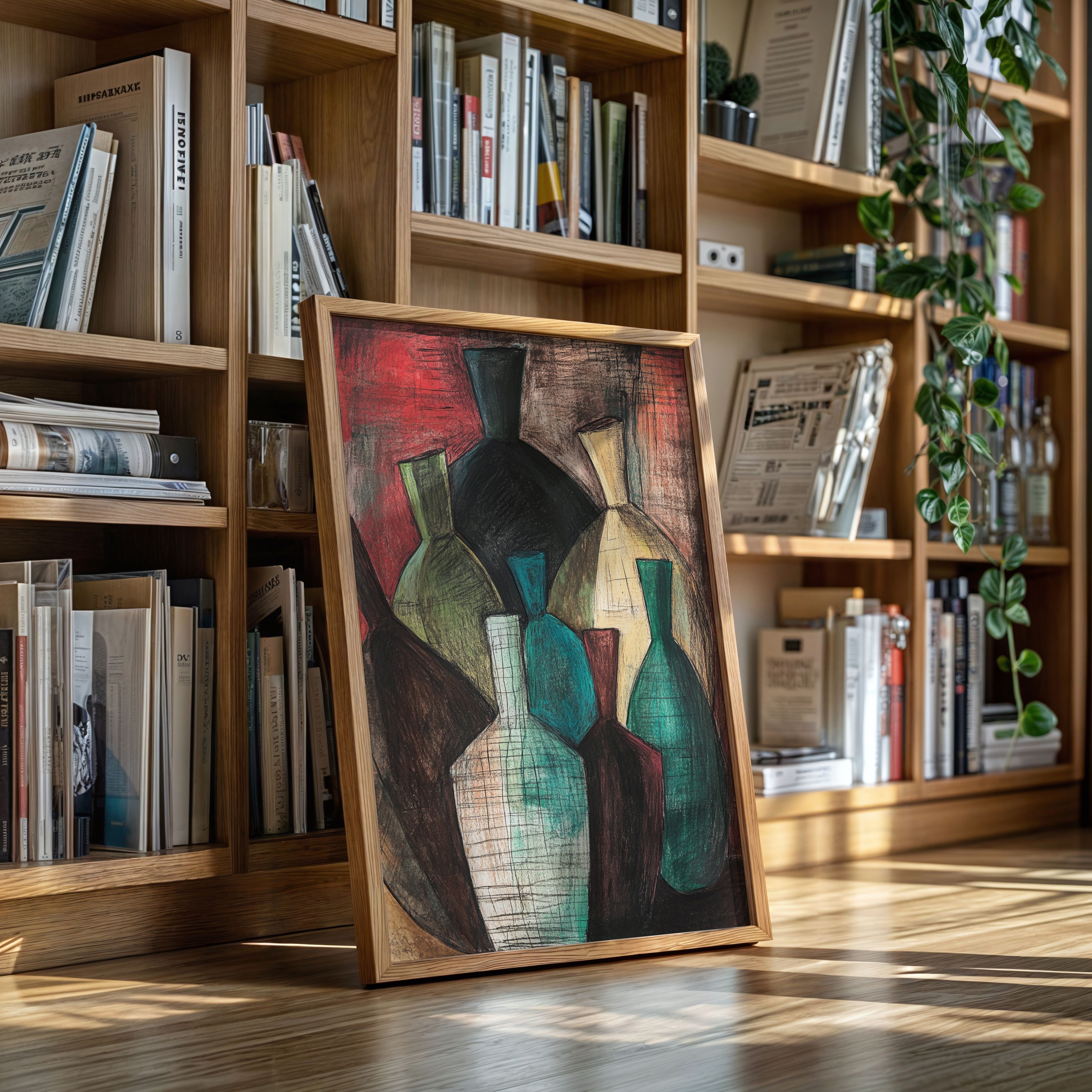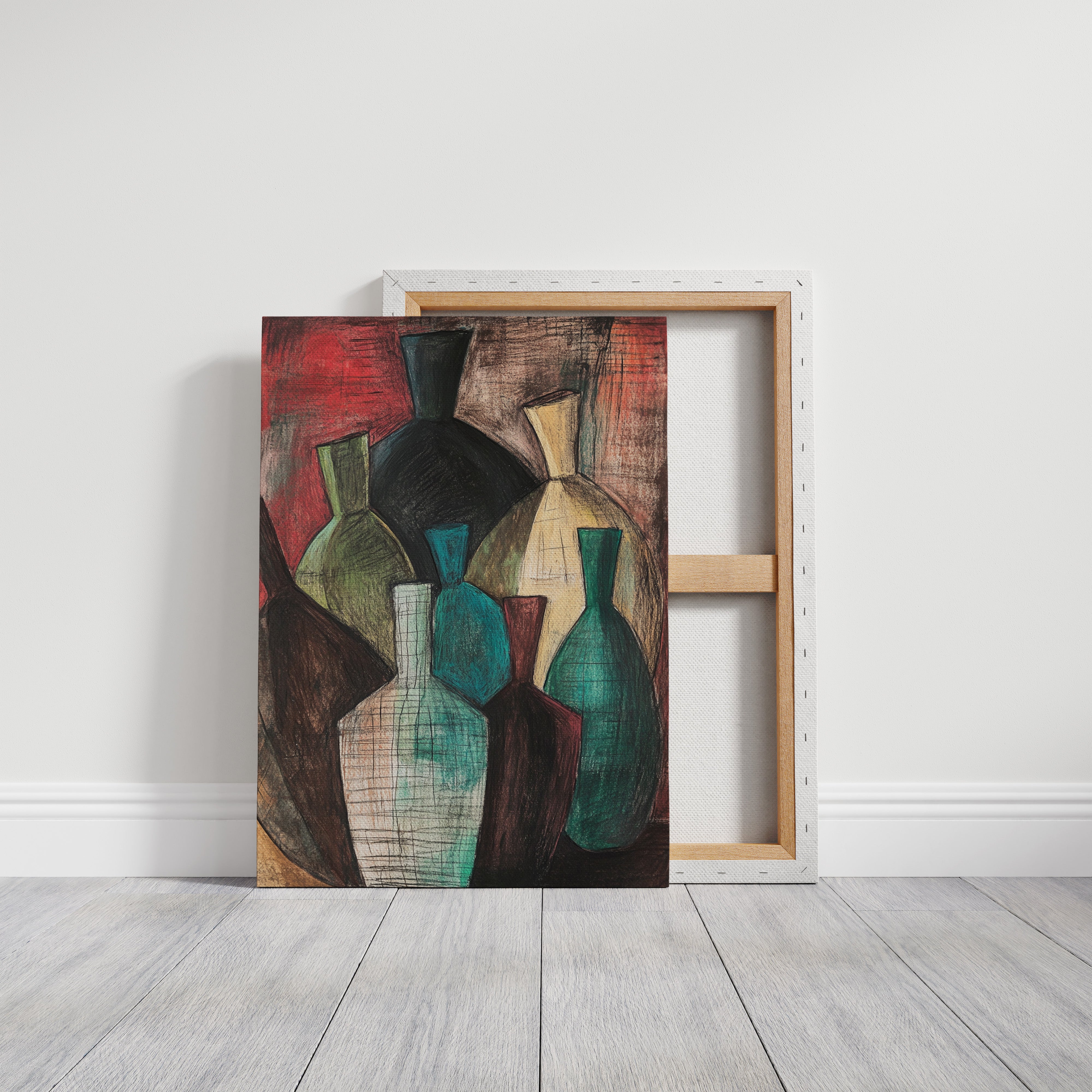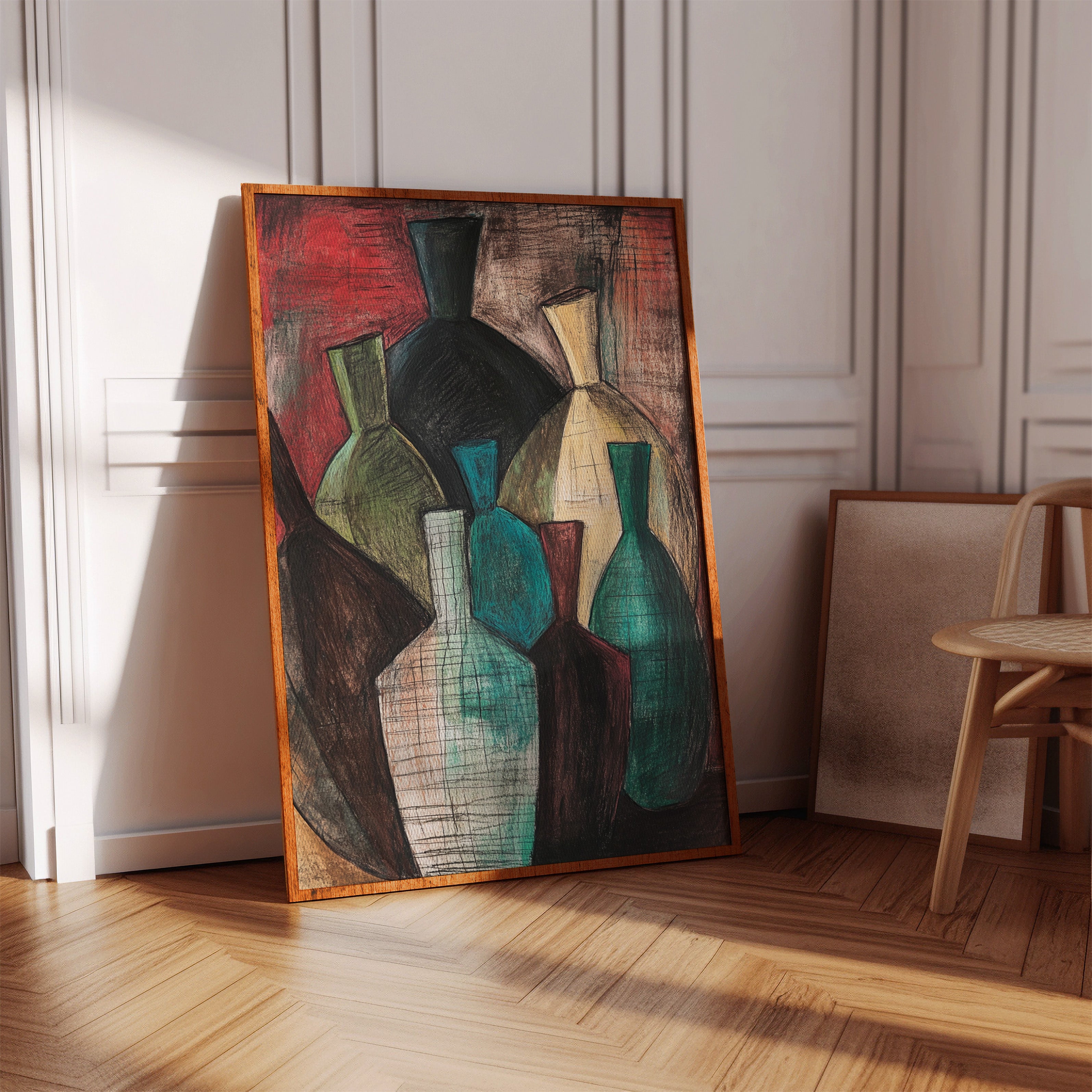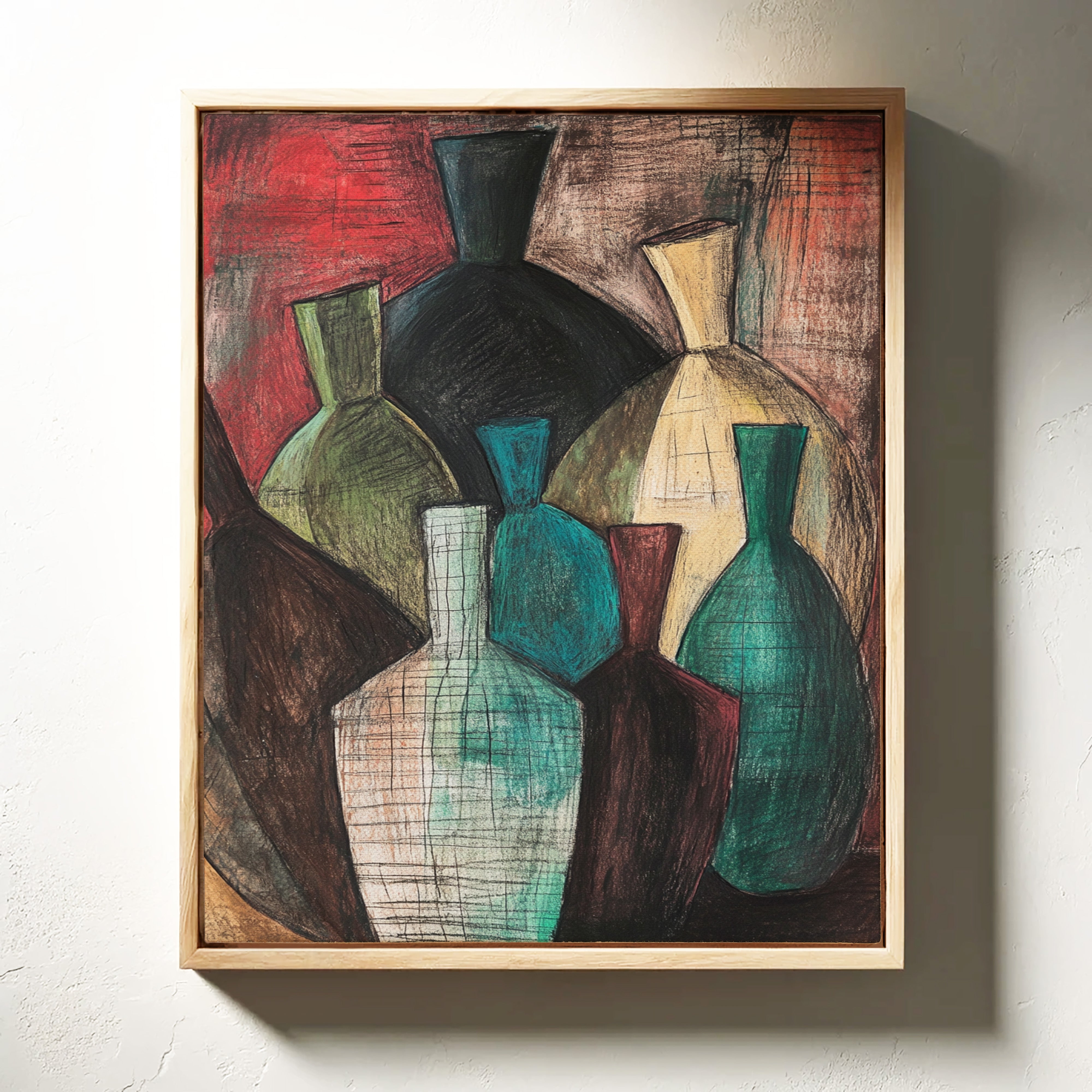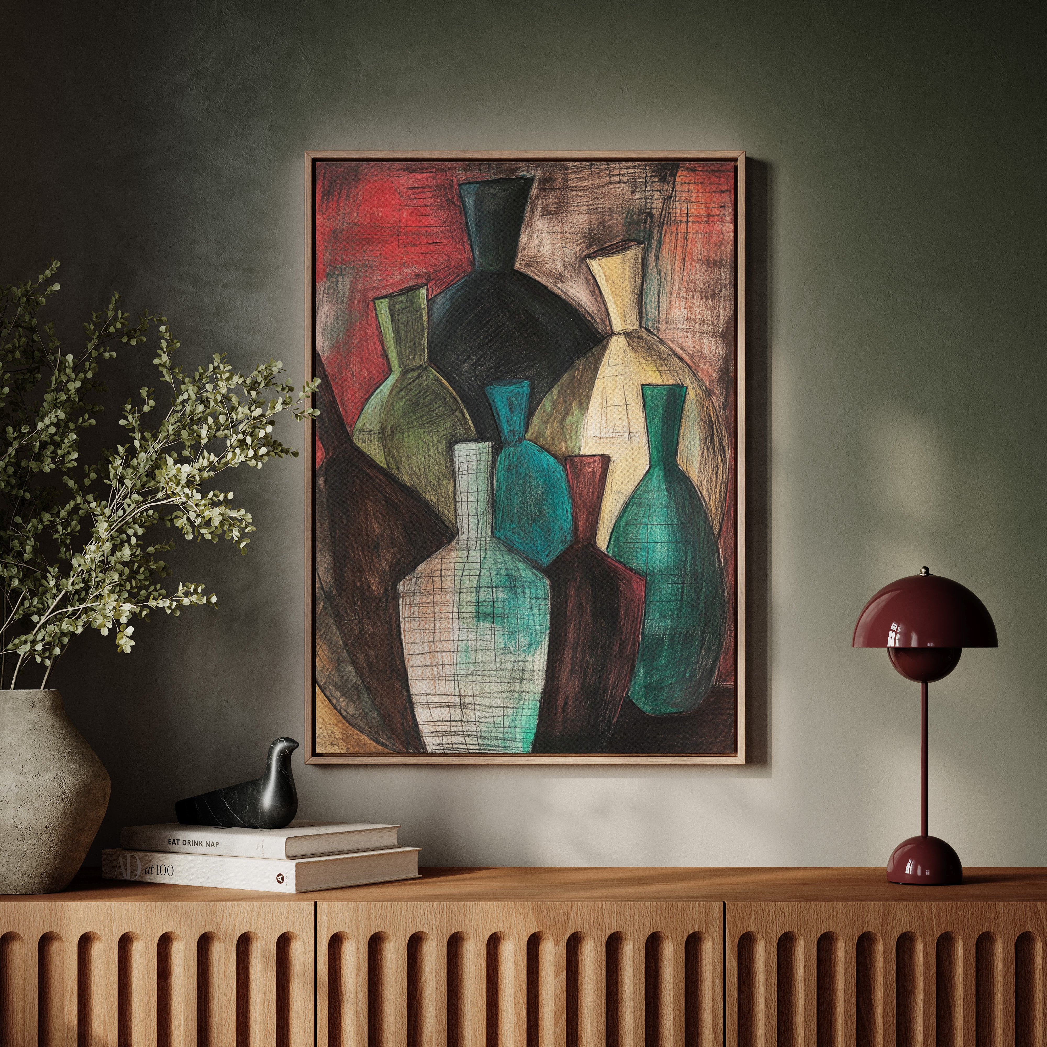 Geometric forms emerge from darkness, their elongated necks reaching skyward like silent sentinels at dusk. Rich turquoise and sage vessels stand in elegant conversation against a moody backdrop of deep crimsons and charcoal shadows. The angular composition creates a rhythmic dance of light and shadow, where each bottle's unique silhouette contributes to a sophisticated geometric harmony. Perfect for a modern dining room or upscale bar area, this piece adds a touch of artistic sophistication while celebrating the timeless beauty of simple forms.