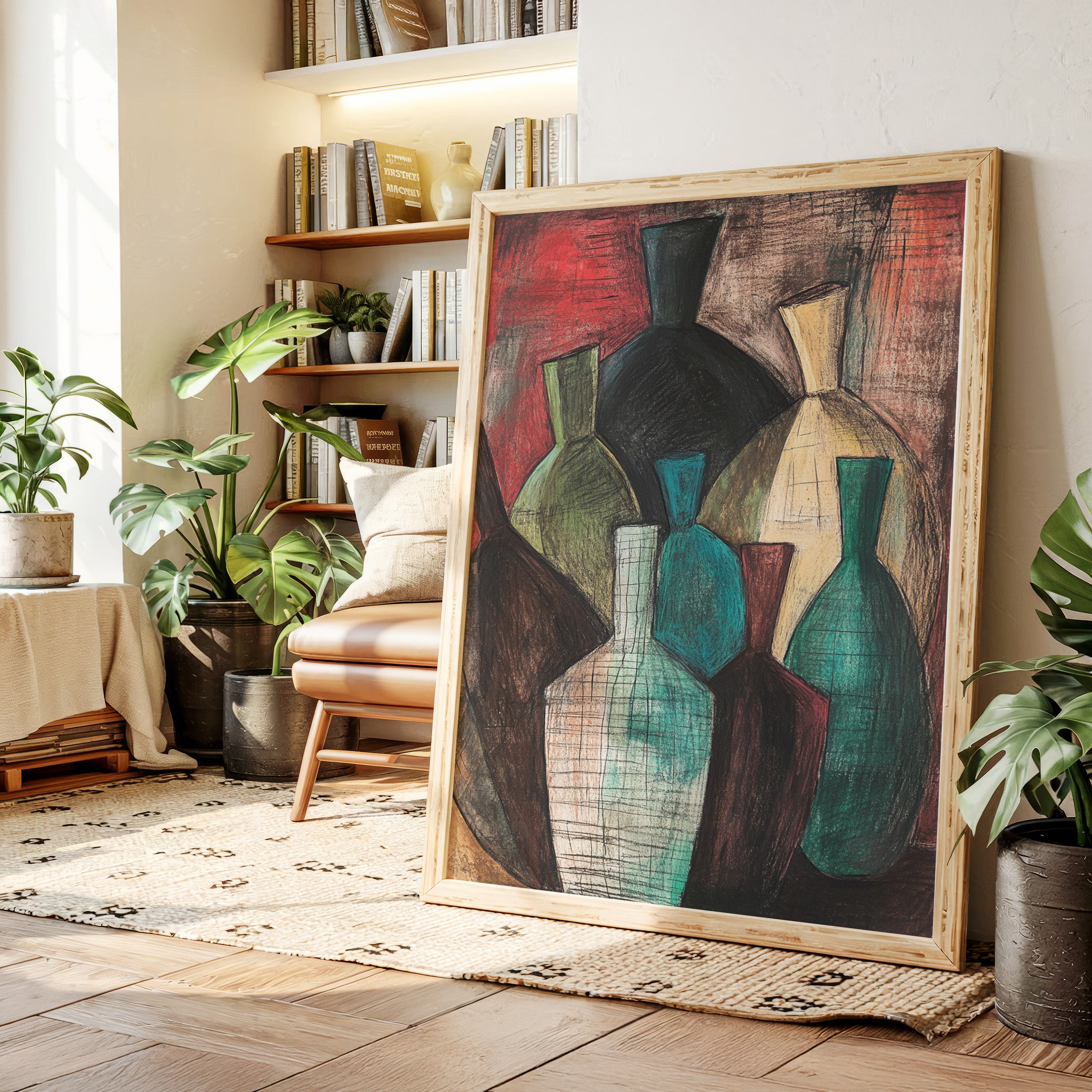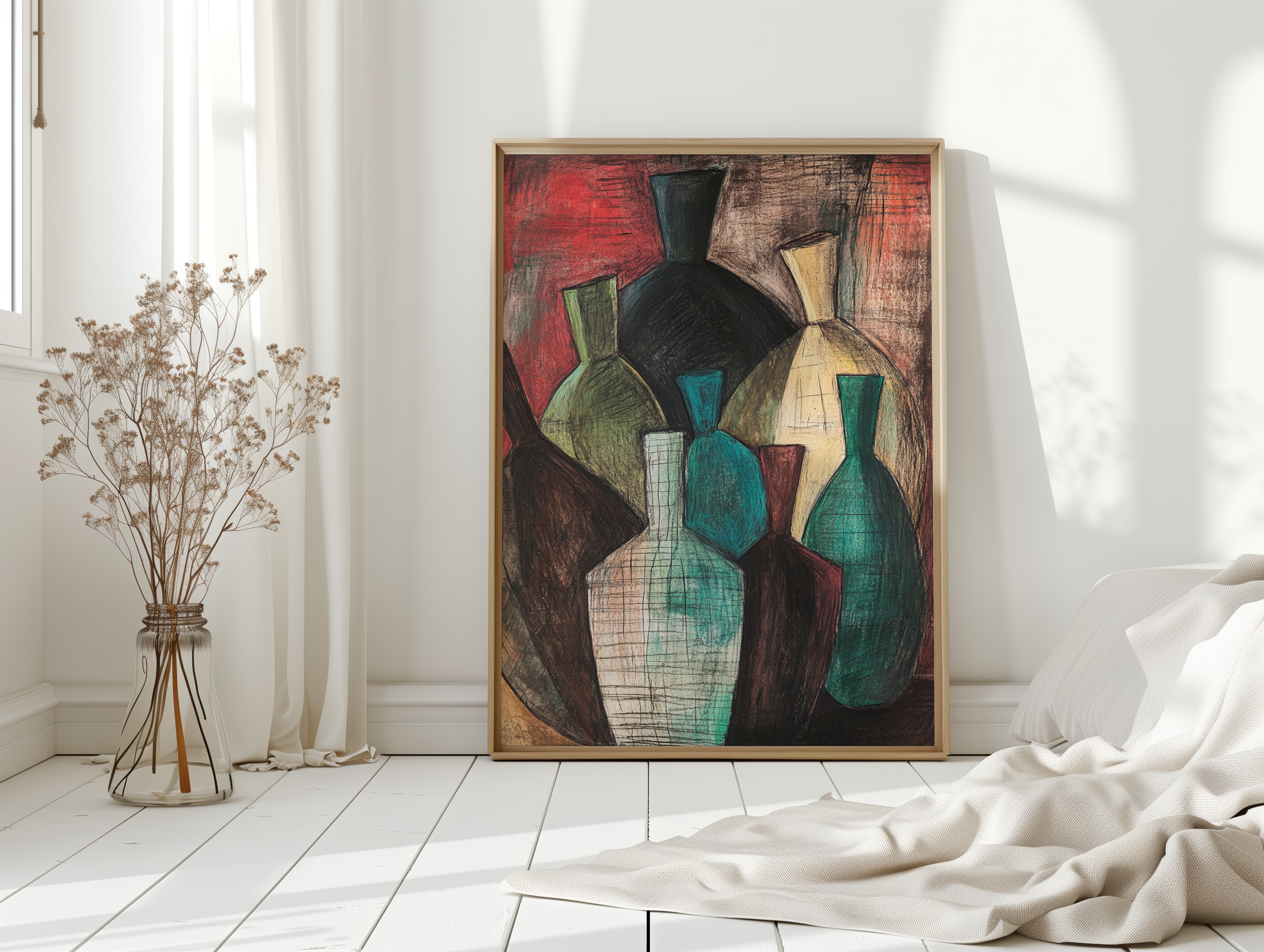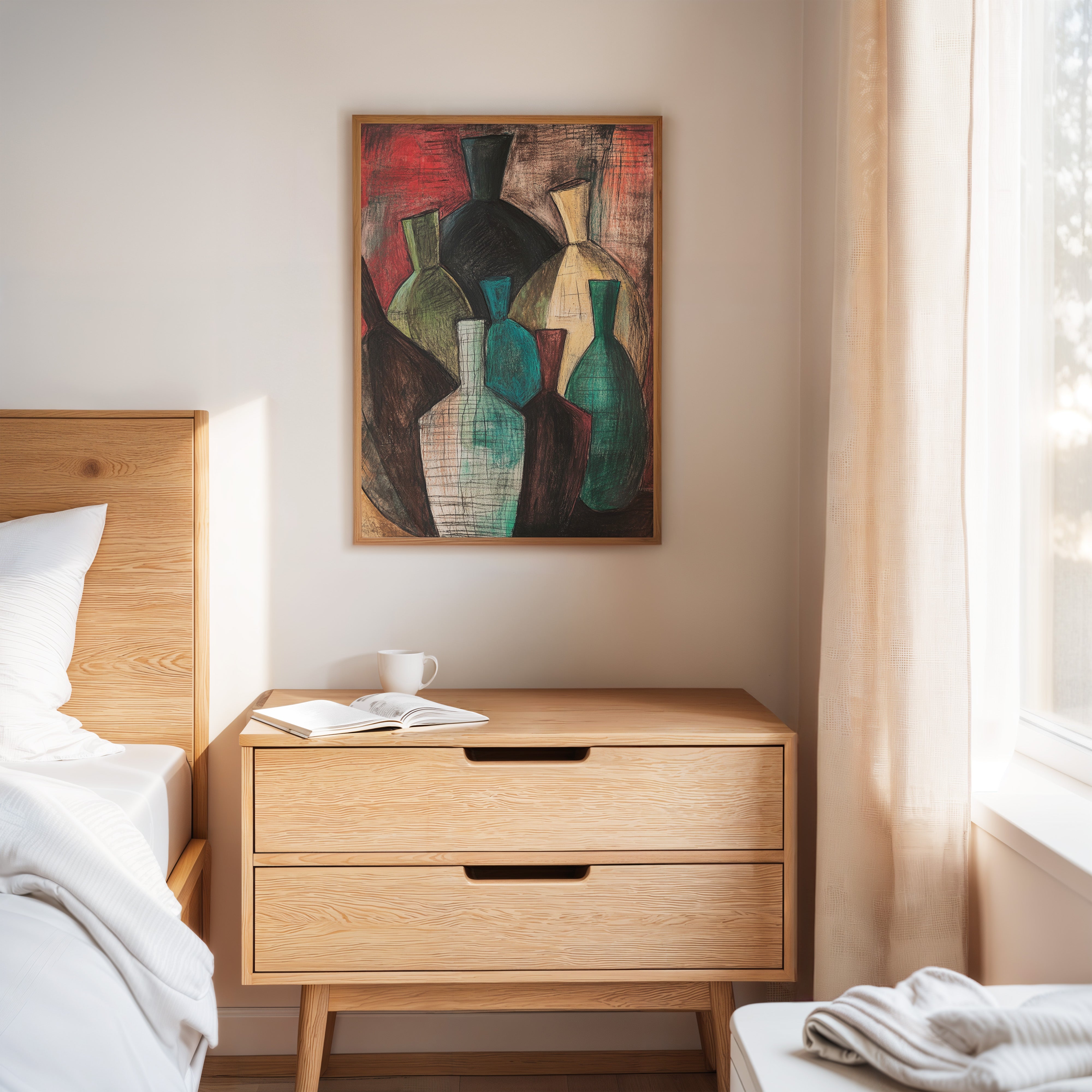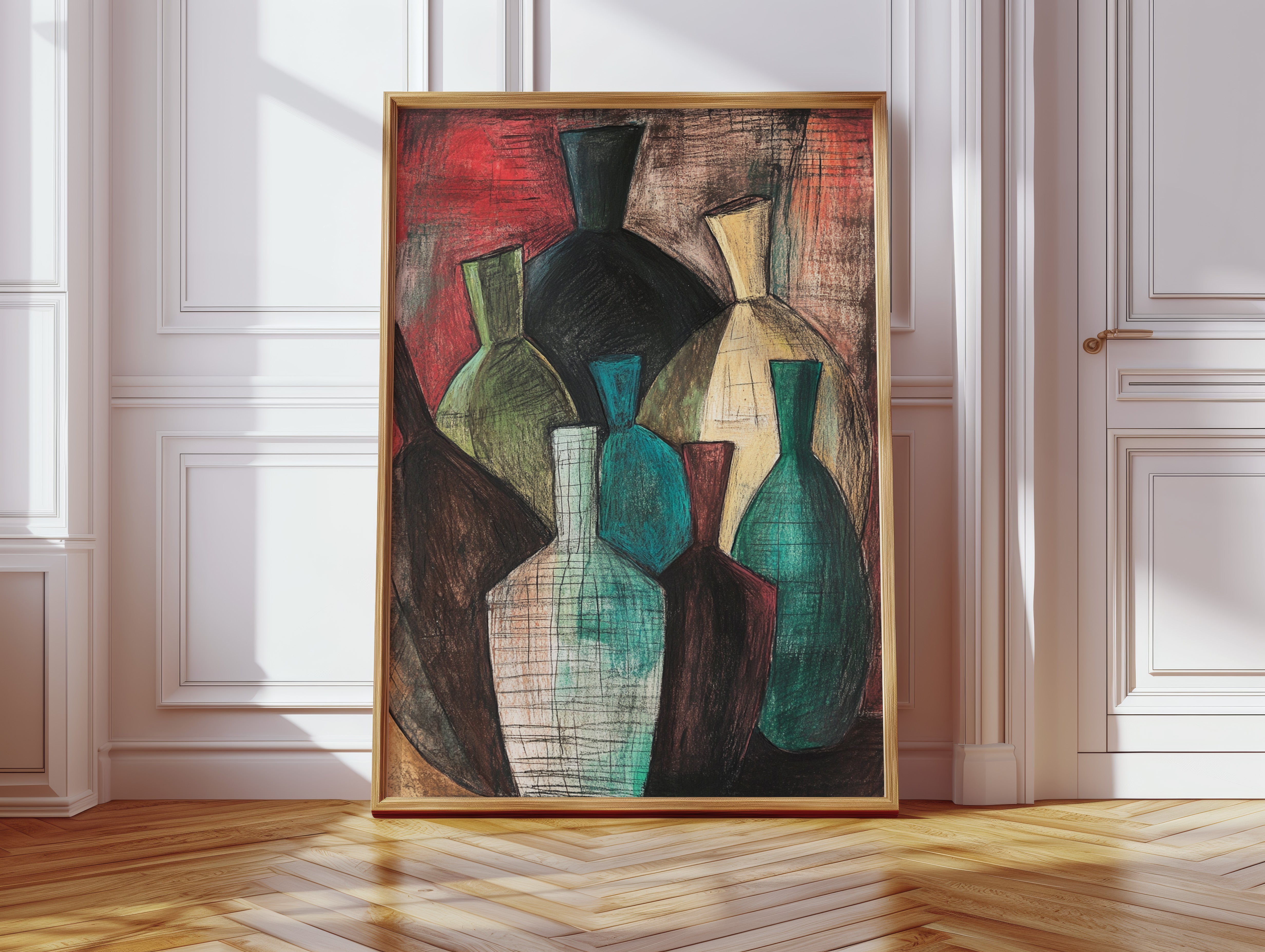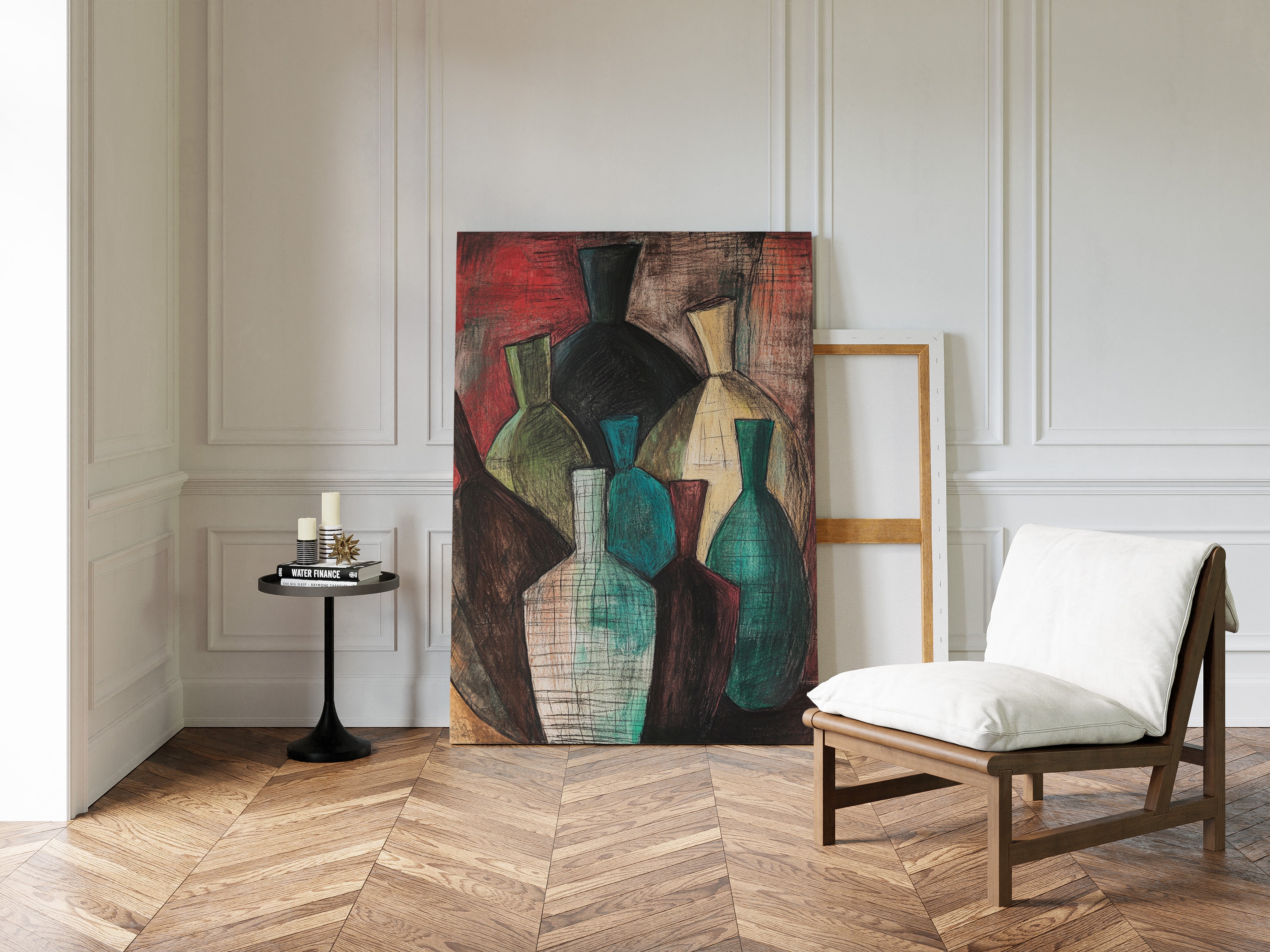 Geometric forms emerge from darkness, their elongated necks reaching skyward like silent sentinels at dusk. Rich turquoise and sage vessels stand in elegant conversation against a moody backdrop of deep crimsons and charcoal shadows. The angular composition creates a rhythmic dance of light and shadow, where each bottle's unique silhouette contributes to a sophisticated geometric harmony. Perfect for a modern dining room or upscale bar area, this piece adds a touch of artistic sophistication while celebrating the timeless beauty of simple forms.