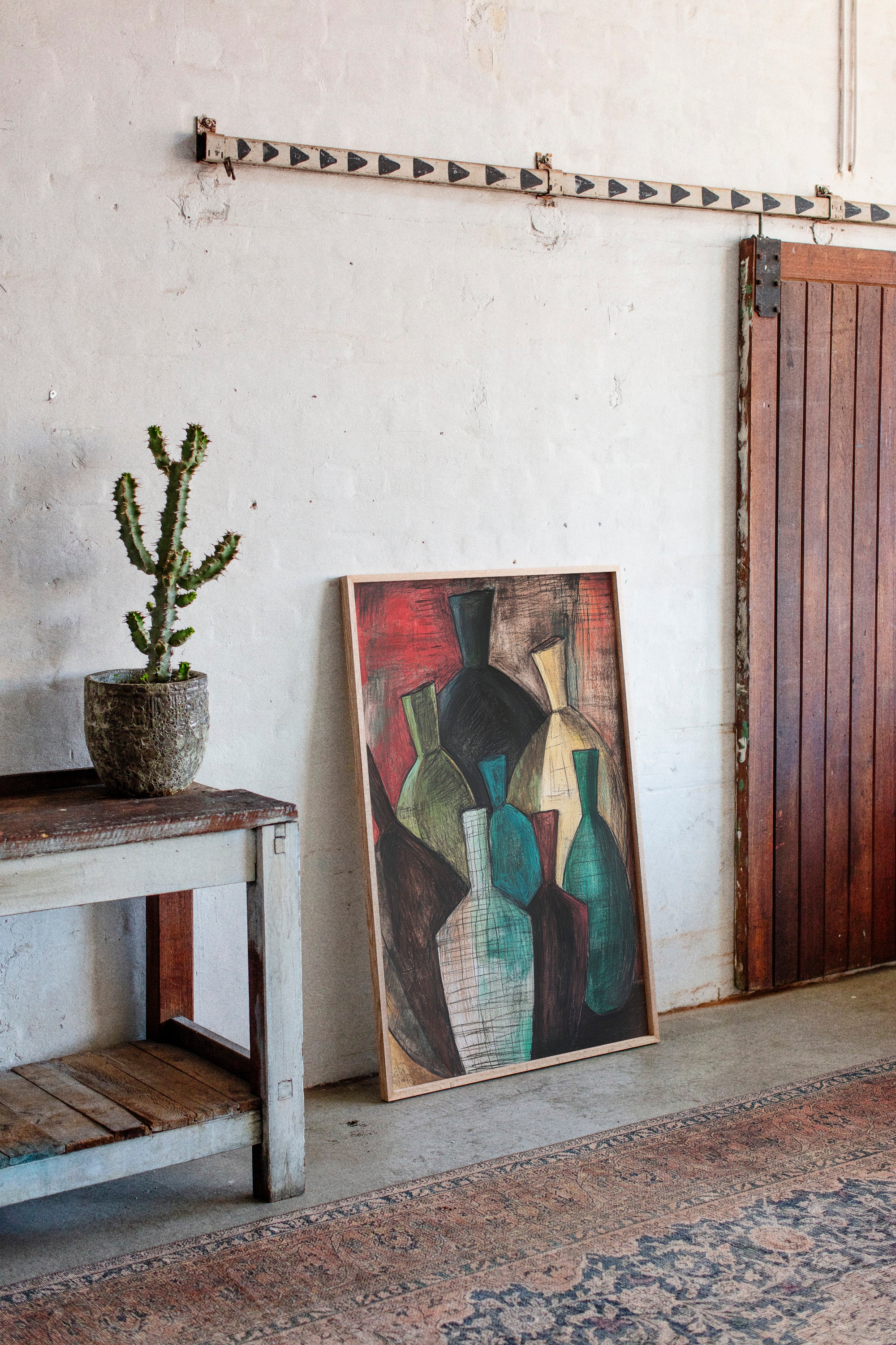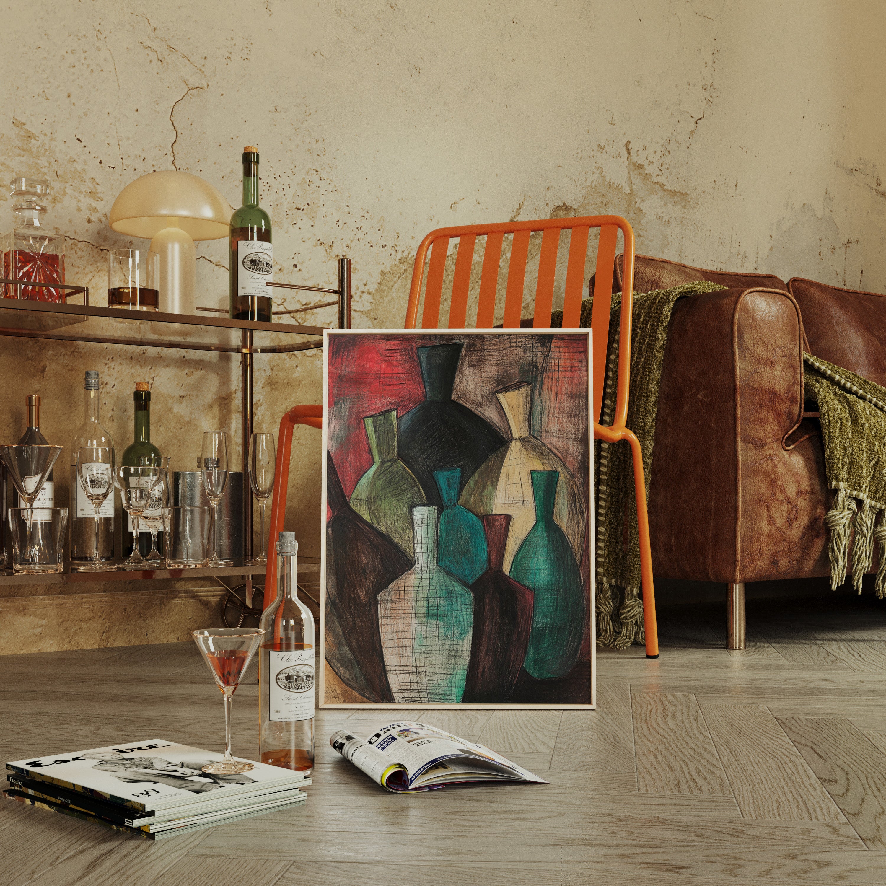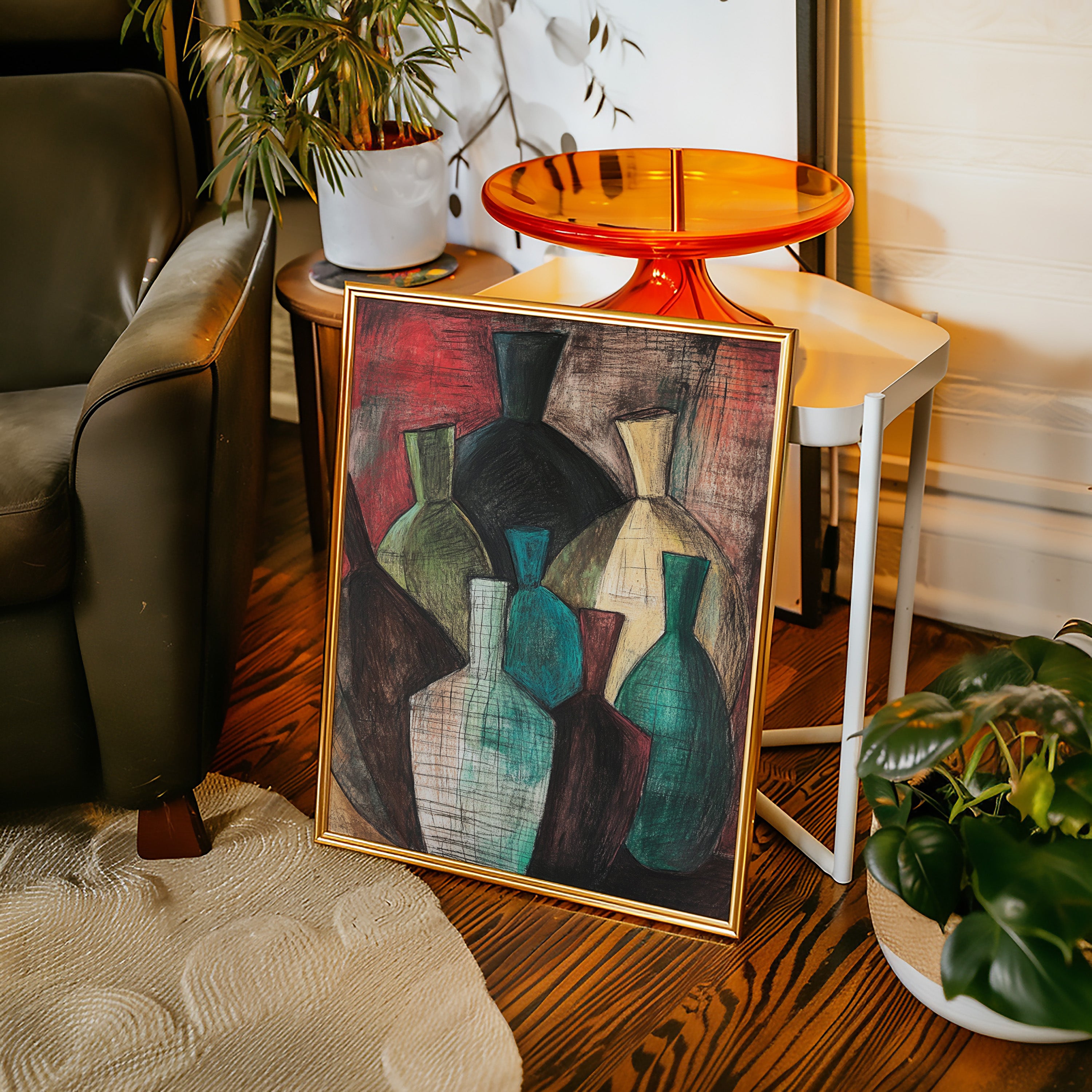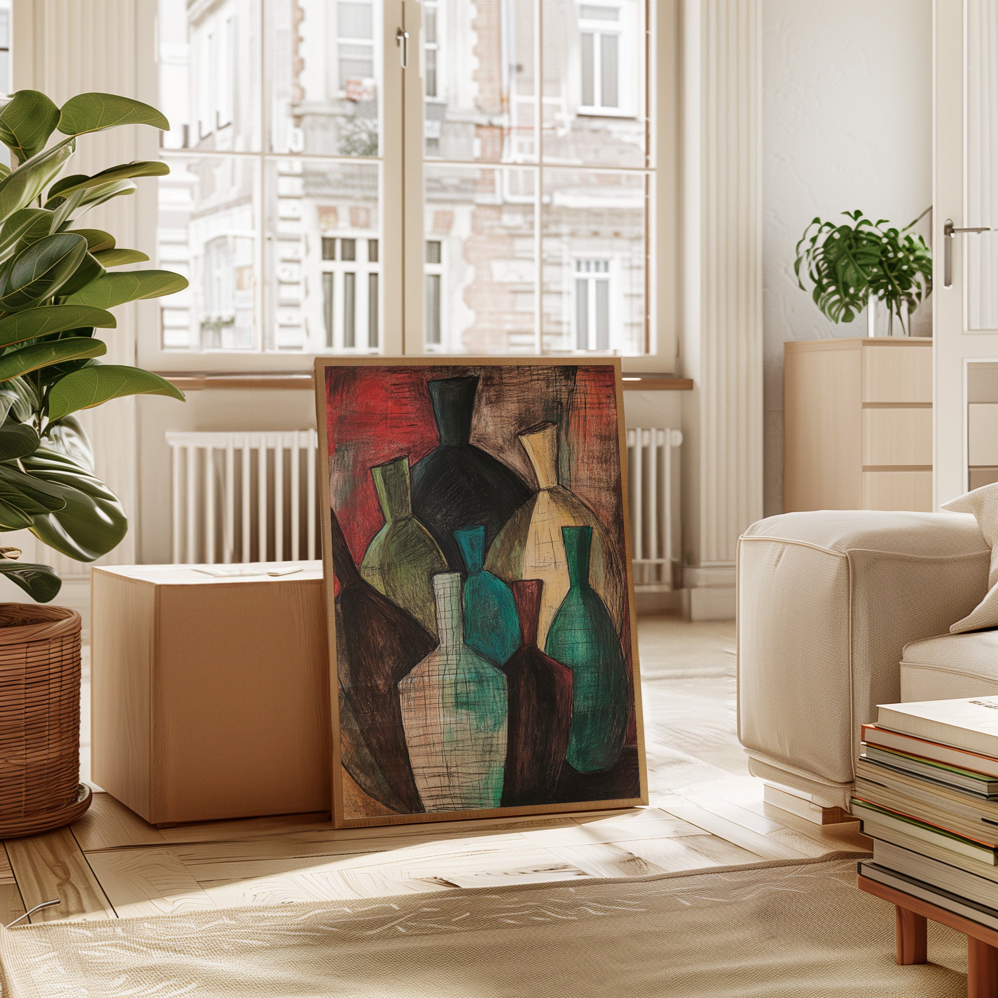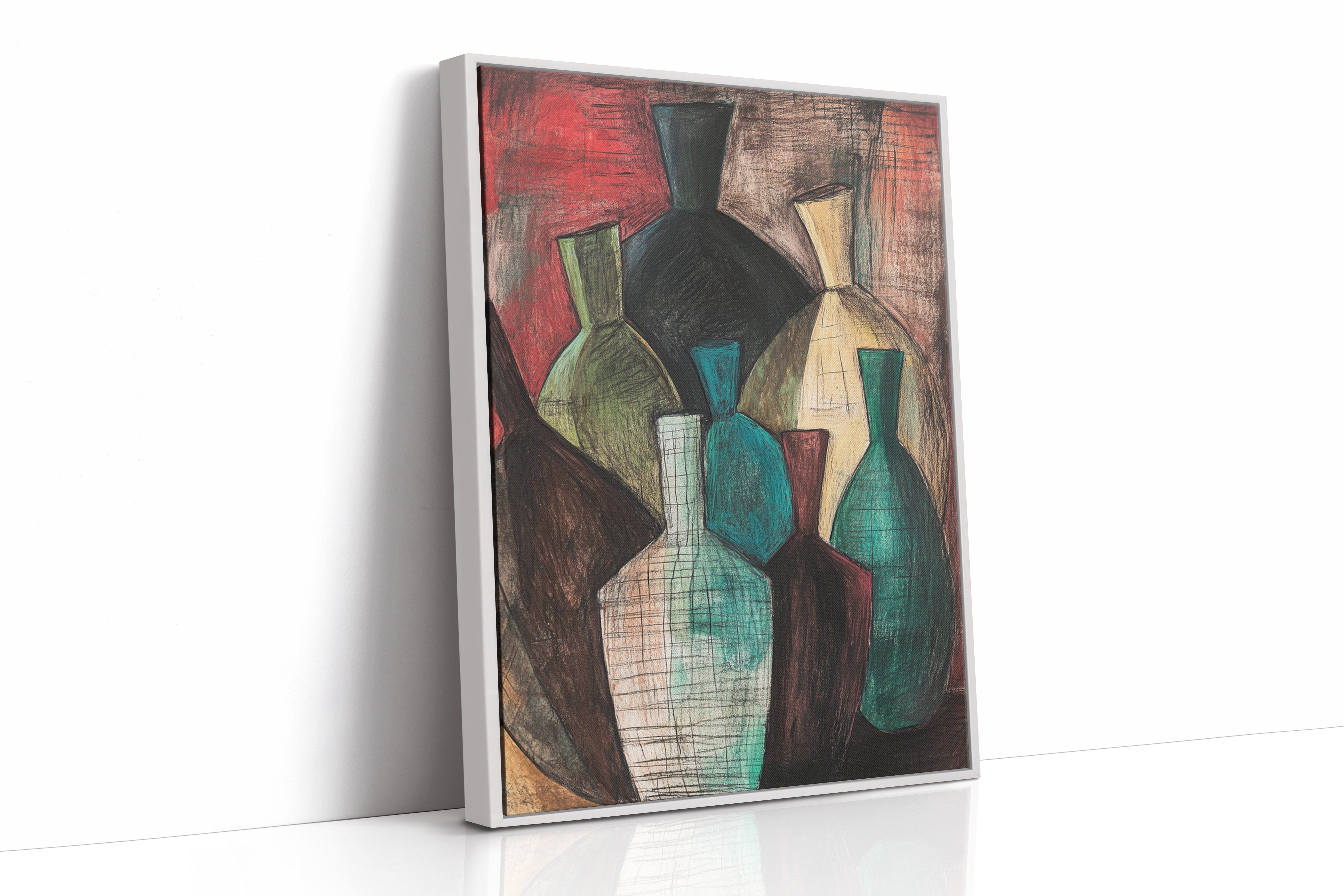 Geometric forms emerge from darkness, their elongated necks reaching skyward like silent sentinels at dusk. Rich turquoise and sage vessels stand in elegant conversation against a moody backdrop of deep crimsons and charcoal shadows. The angular composition creates a rhythmic dance of light and shadow, where each bottle's unique silhouette contributes to a sophisticated geometric harmony. Perfect for a modern dining room or upscale bar area, this piece adds a touch of artistic sophistication while celebrating the timeless beauty of simple forms.