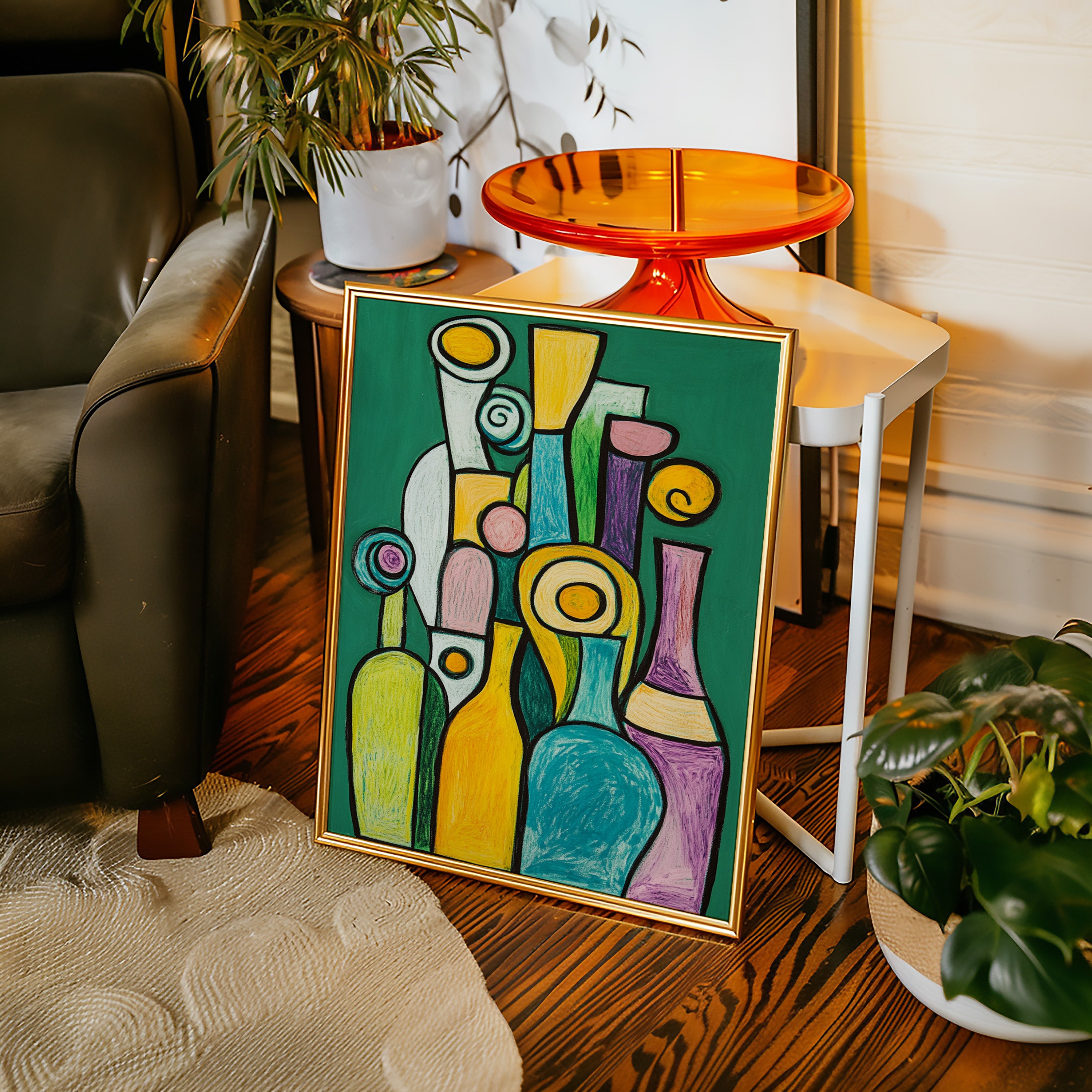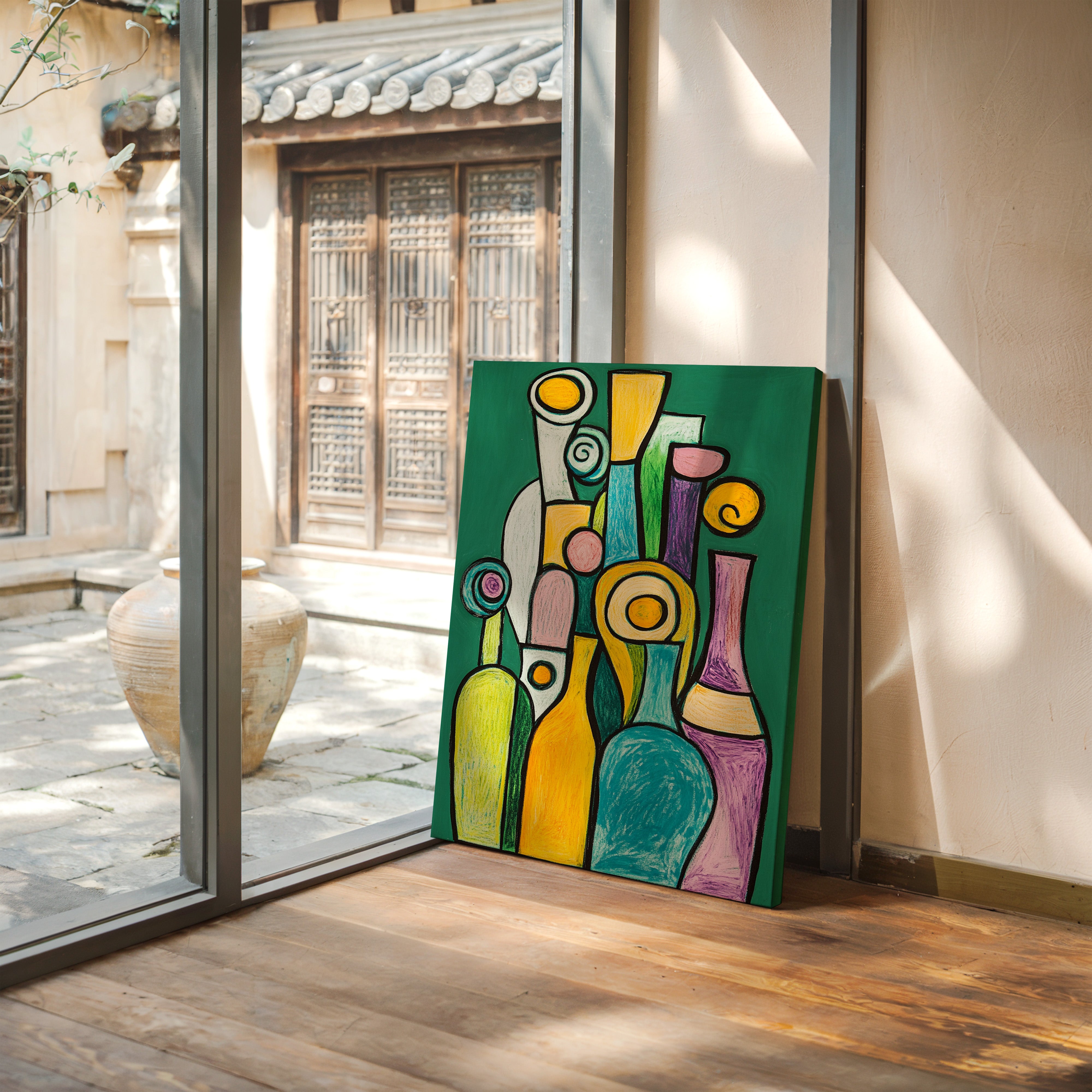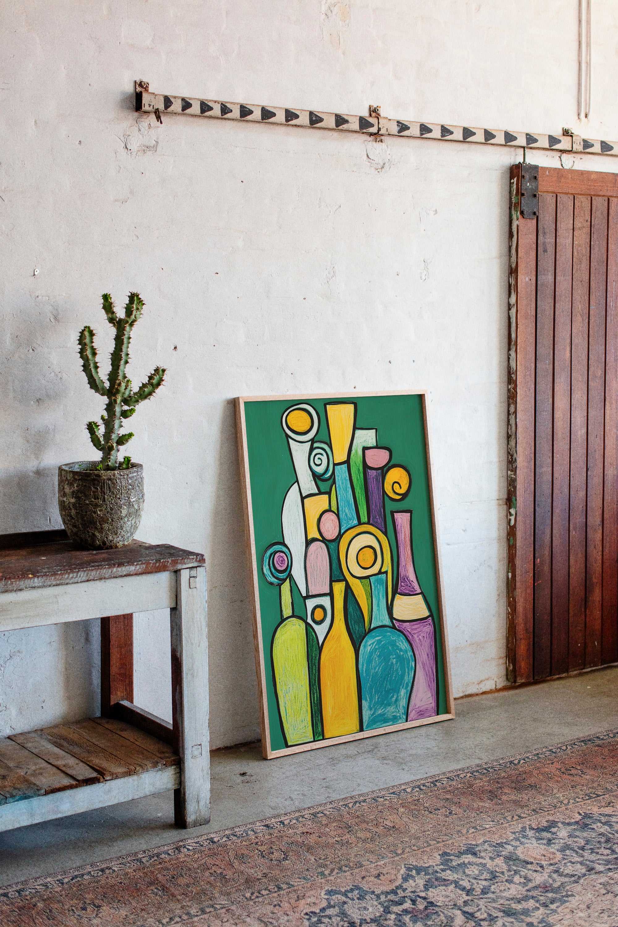 Vibrant vessels rise like musical notes against a deep emerald backdrop, their forms swaying and intertwining in playful harmony. Bold strokes of yellow, turquoise, and lavender create a rhythmic composition, while black outlines give each bottle a distinct personality and presence. The abstract interpretation transforms ordinary objects into a celebration of form and color, suggesting both movement and stillness in their careful arrangement. Perfect for adding a pop of modern sophistication to a dining room, home bar, or any space seeking a touch of artistic whimsy.