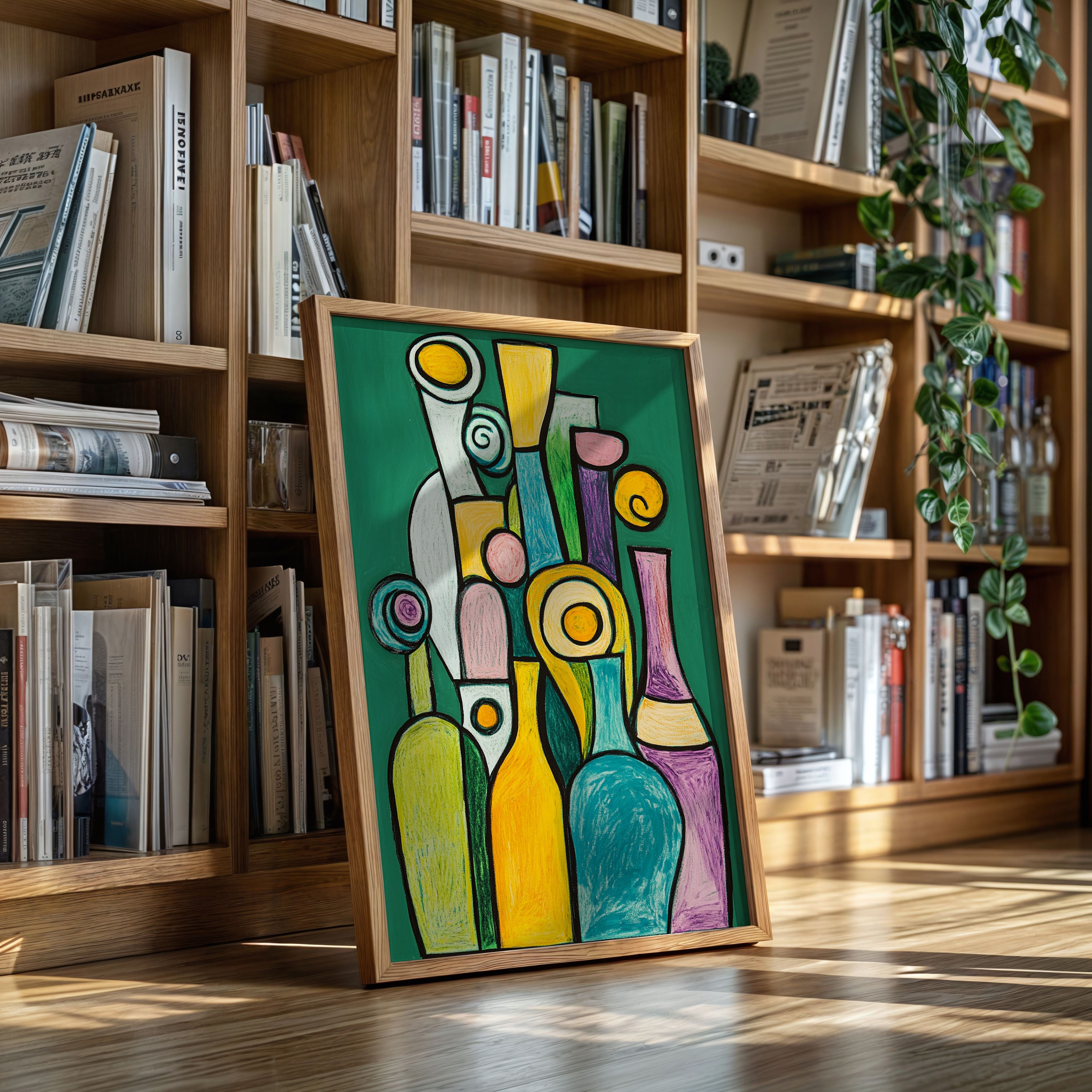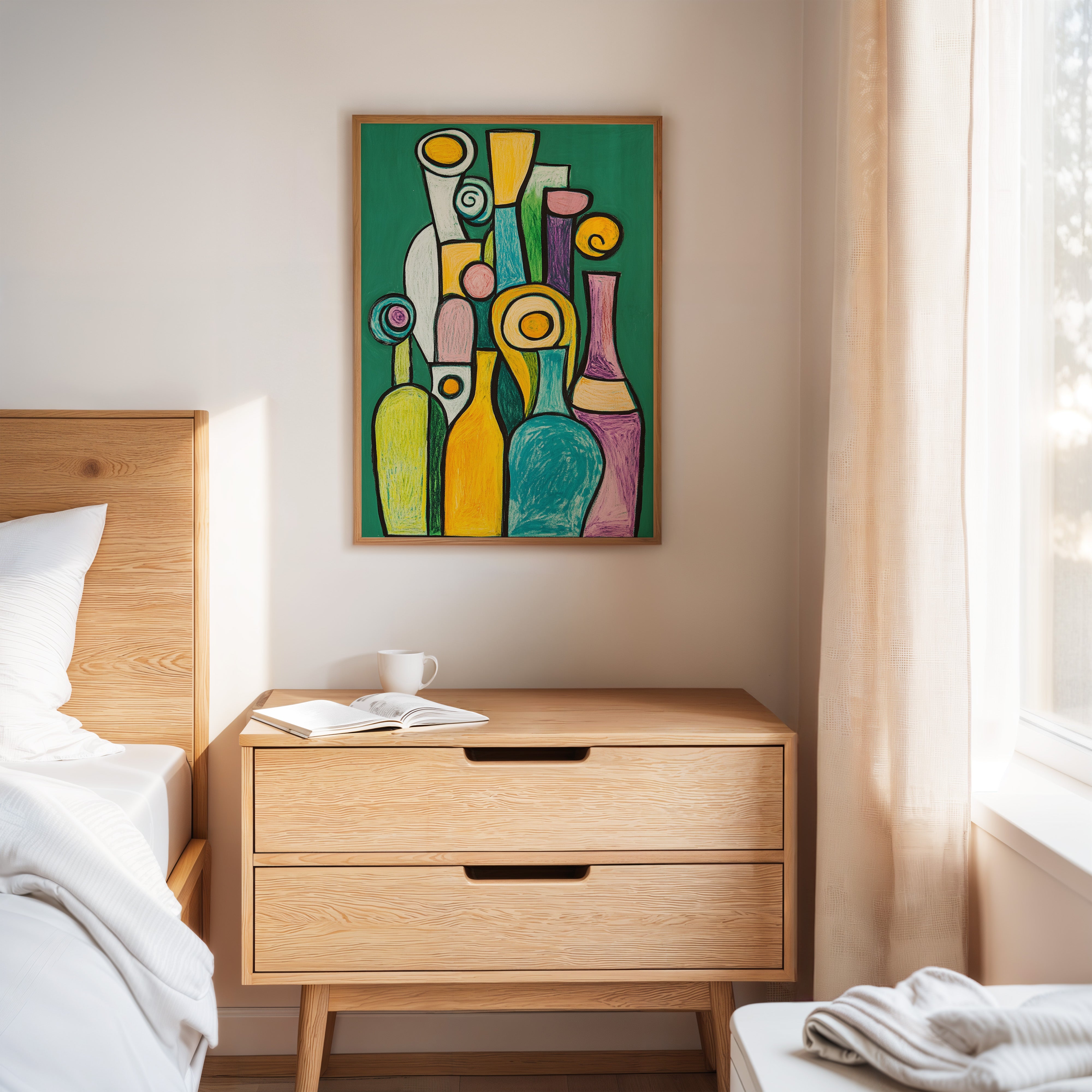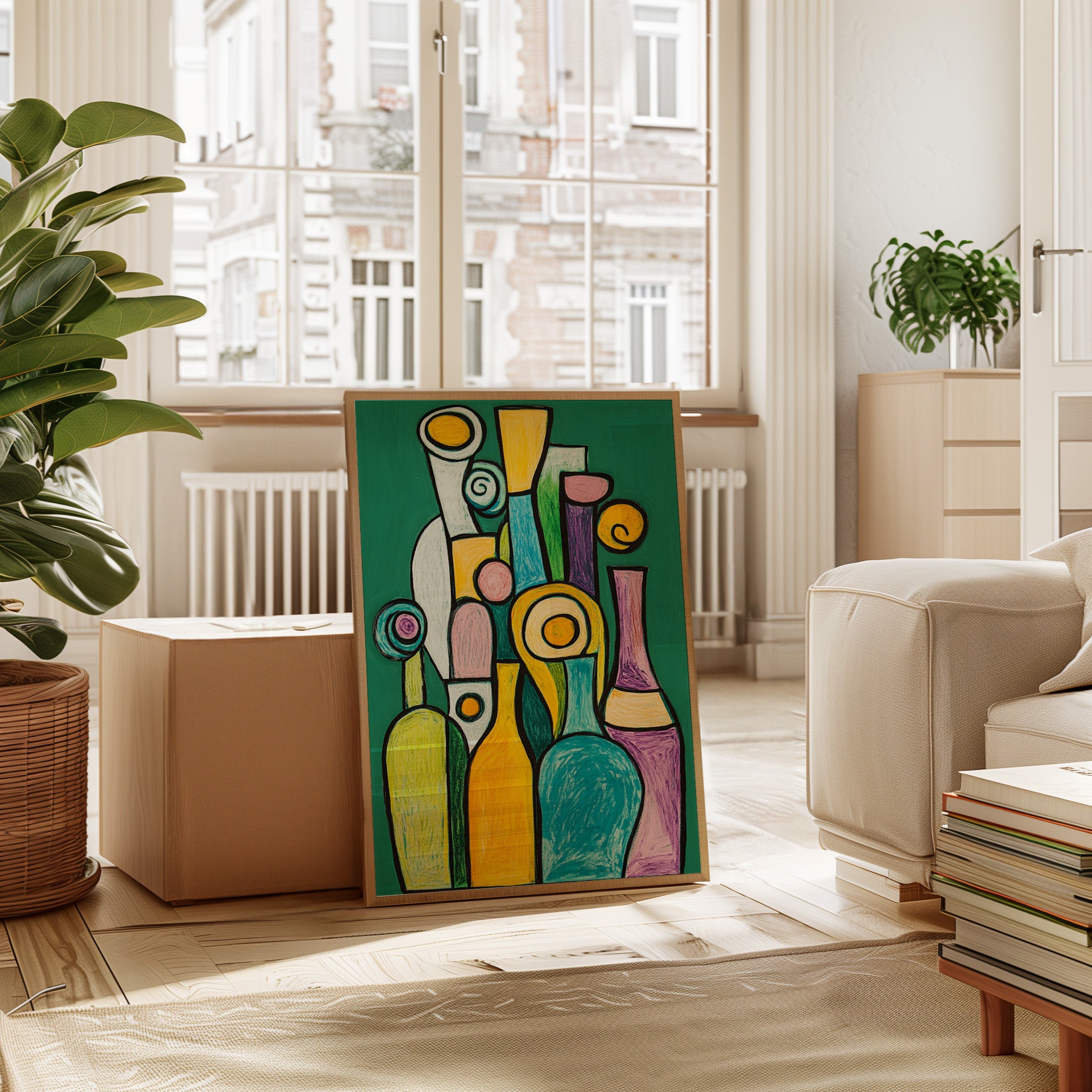 Vibrant vessels rise like musical notes against a deep emerald backdrop, their forms swaying and intertwining in playful harmony. Bold strokes of yellow, turquoise, and lavender create a rhythmic composition, while black outlines give each bottle a distinct personality and presence. The abstract interpretation transforms ordinary objects into a celebration of form and color, suggesting both movement and stillness in their careful arrangement. Perfect for adding a pop of modern sophistication to a dining room, home bar, or any space seeking a touch of artistic whimsy.