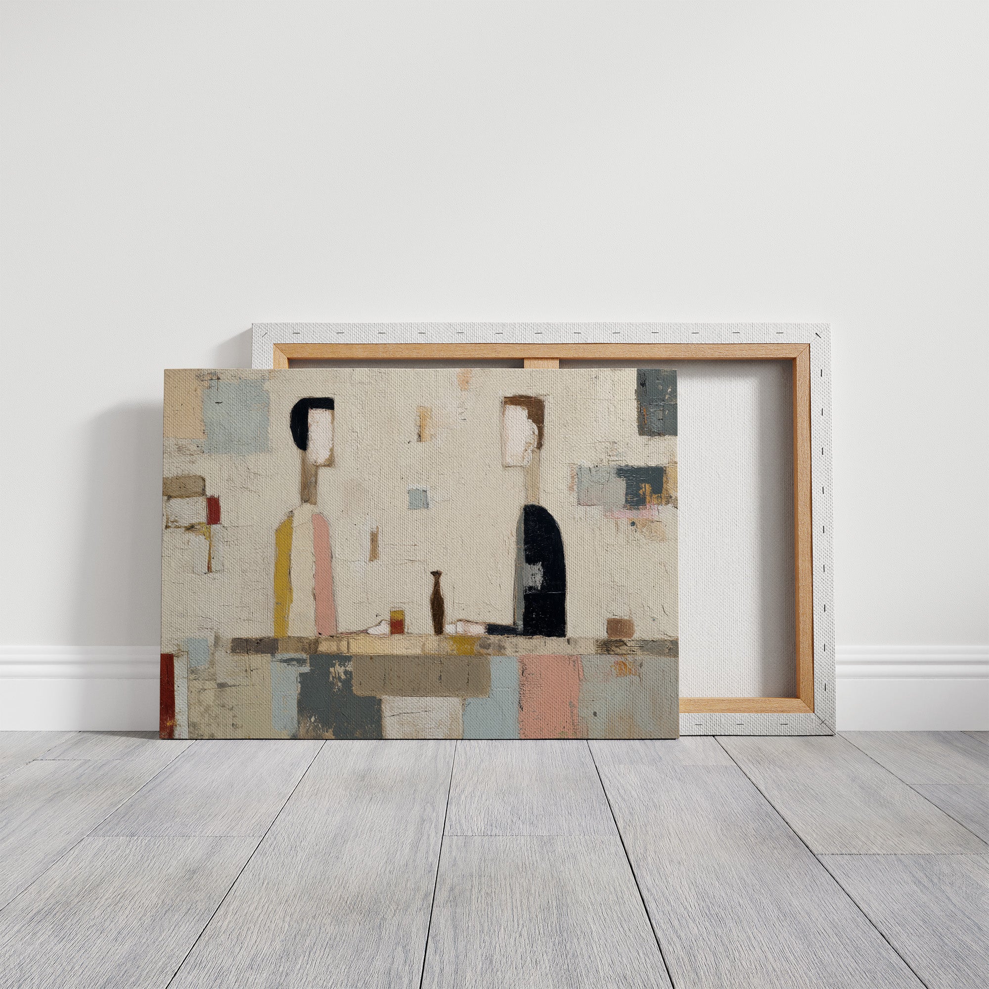 Two bottles rest on a shelf, their forms simplified into dark shapes against a weathered wall of cream and soft pastels. The scene feels suspended in afternoon quiet, where time moves slowly and objects become companions in stillness. The textured surface carries whispers of age scratched paint, faded blocks of mustard yellow, dusty pink, and muted slate blue that overlap like memories layering upon one another. Each brushstroke suggests a history, a room lived in, a shelf that holds more than glass. Perfect for modern living spaces, dining rooms, or kitchen nooks where understated elegance meets thoughtful design. This work invites you to pause, to notice the poetry in simple arrangements and the quiet dignity of ordinary things.