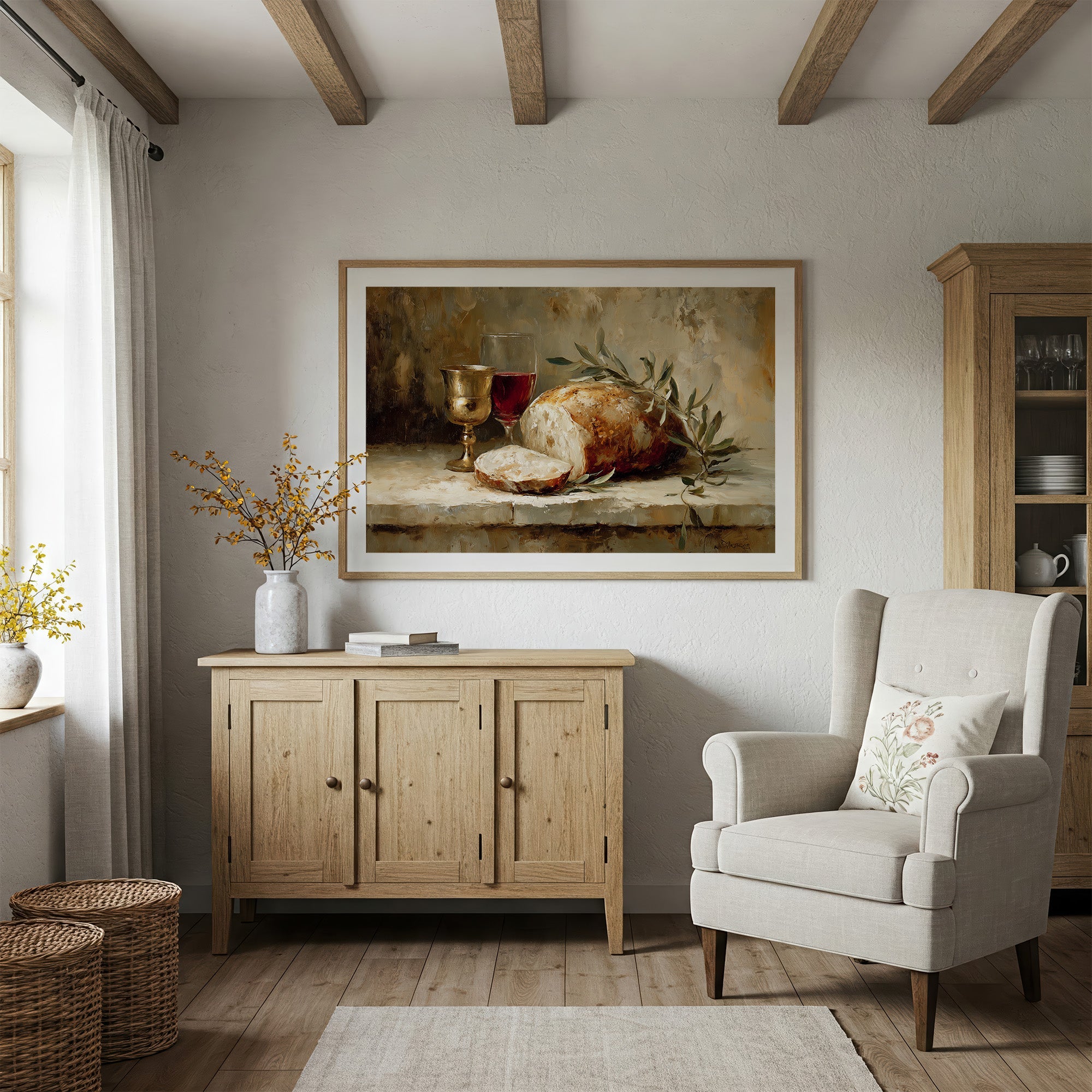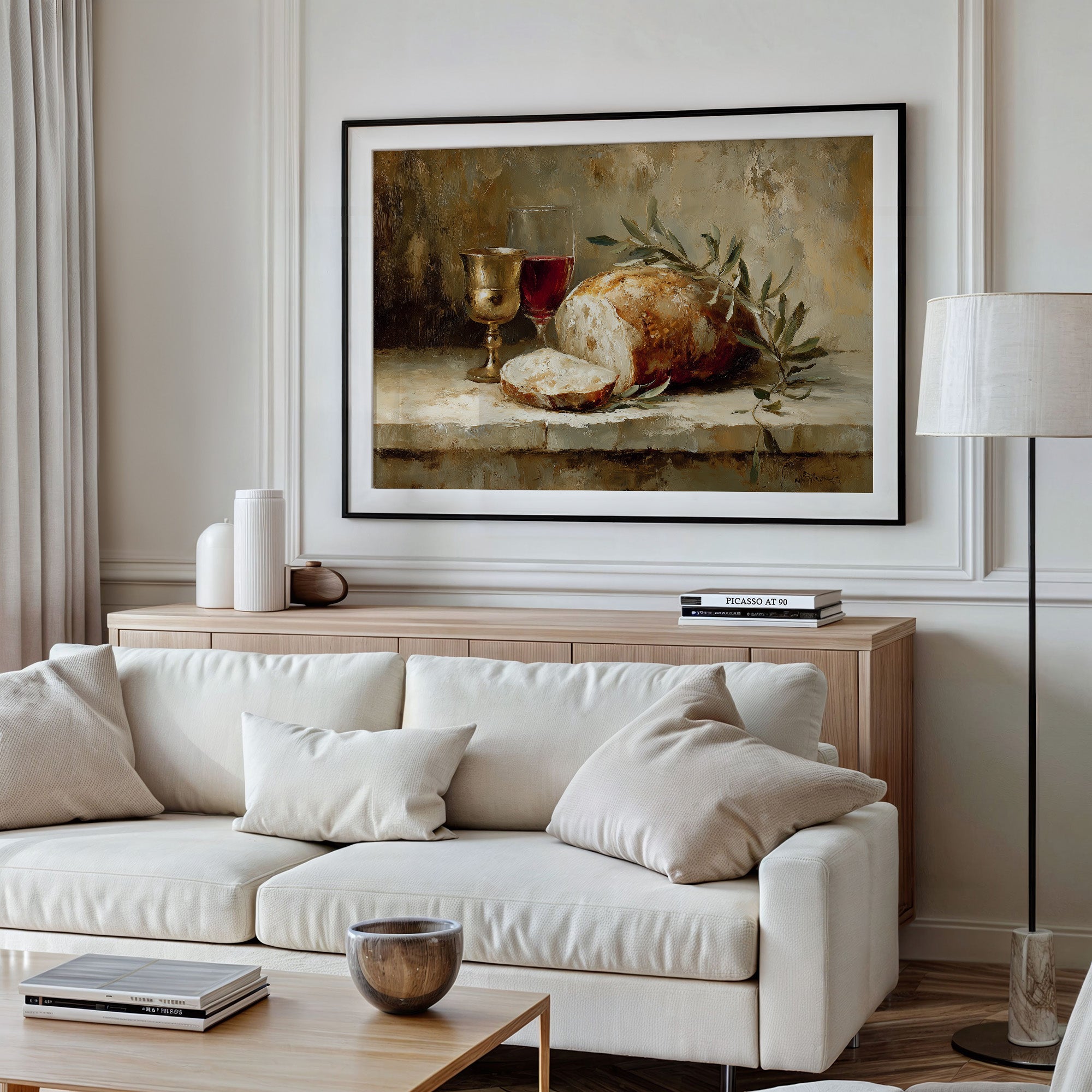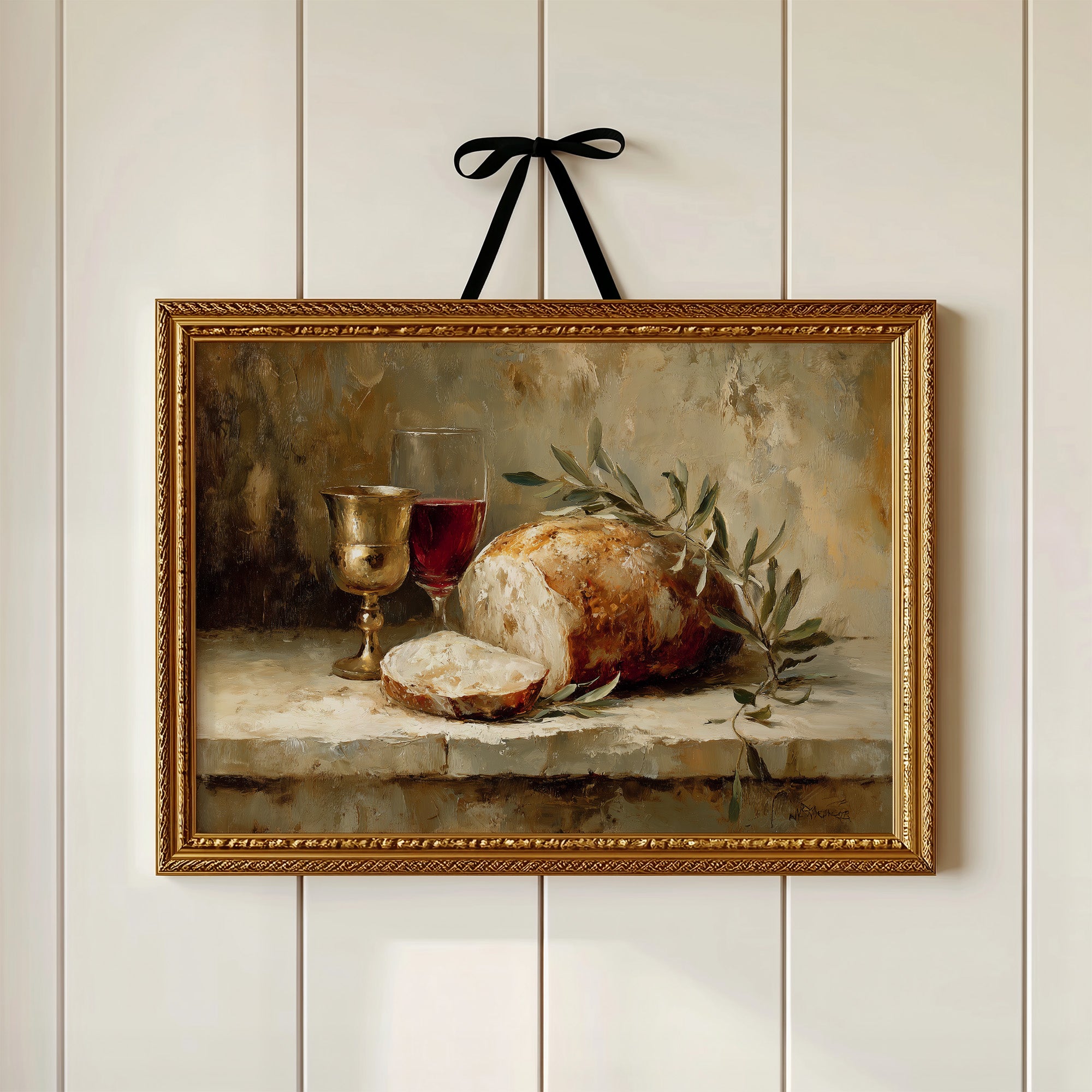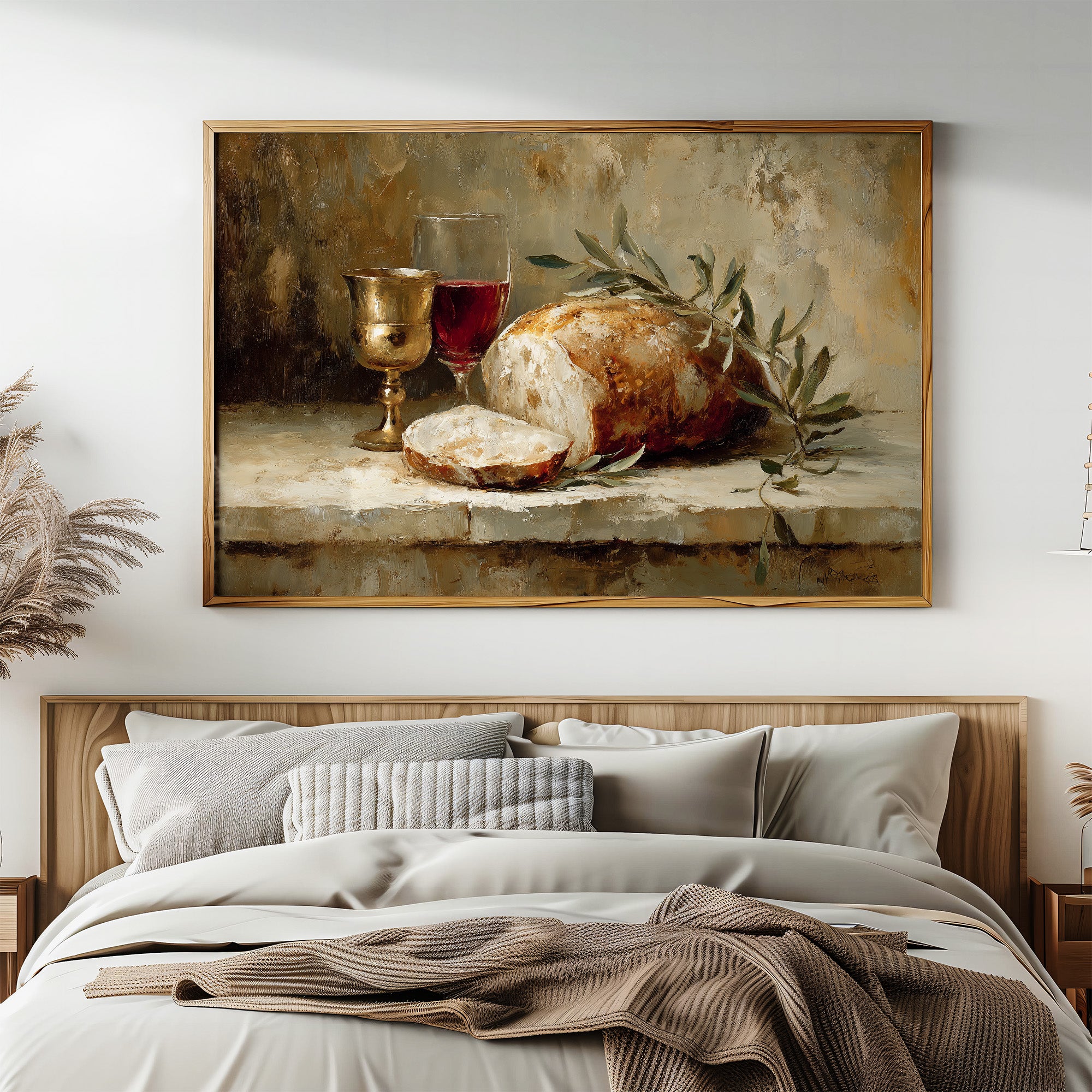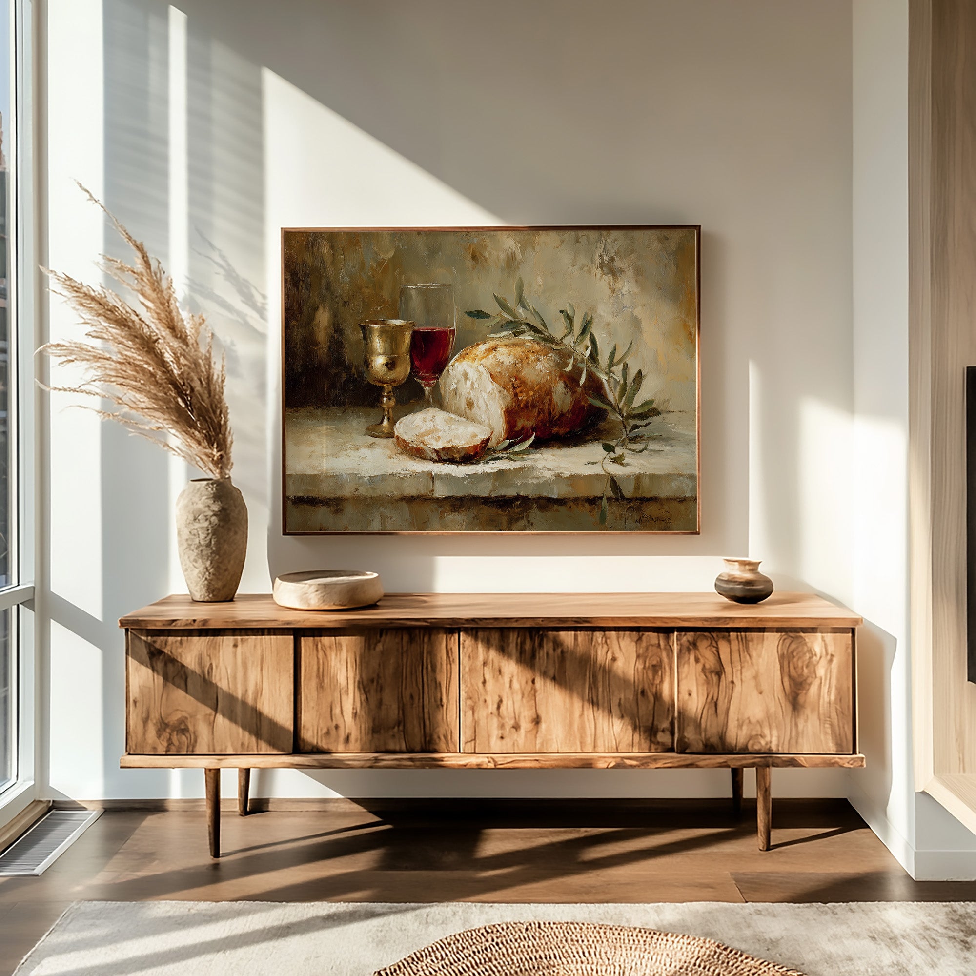 Warmth radiates from this classical still life nestled among literary companions. Rich burgundy wine catches the light in its goblet, while crusty artisanal bread rests beside delicate olive branches, all rendered in sumptuous brushstrokes of cream, amber, and forest green. The painting's golden frame complements the earthy palette, creating a moment of timeless abundance amid the surrounding bookshelves and dried pampas grass. This piece brings old-world elegance to a reading nook, study, or dining area.