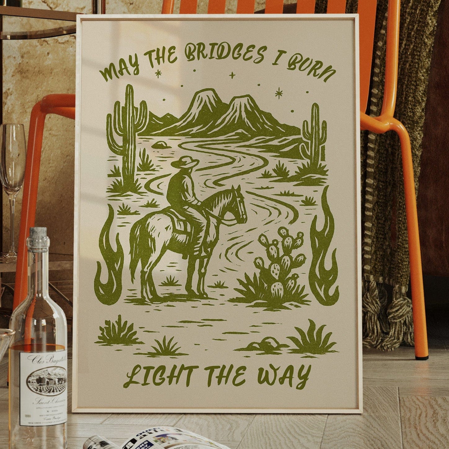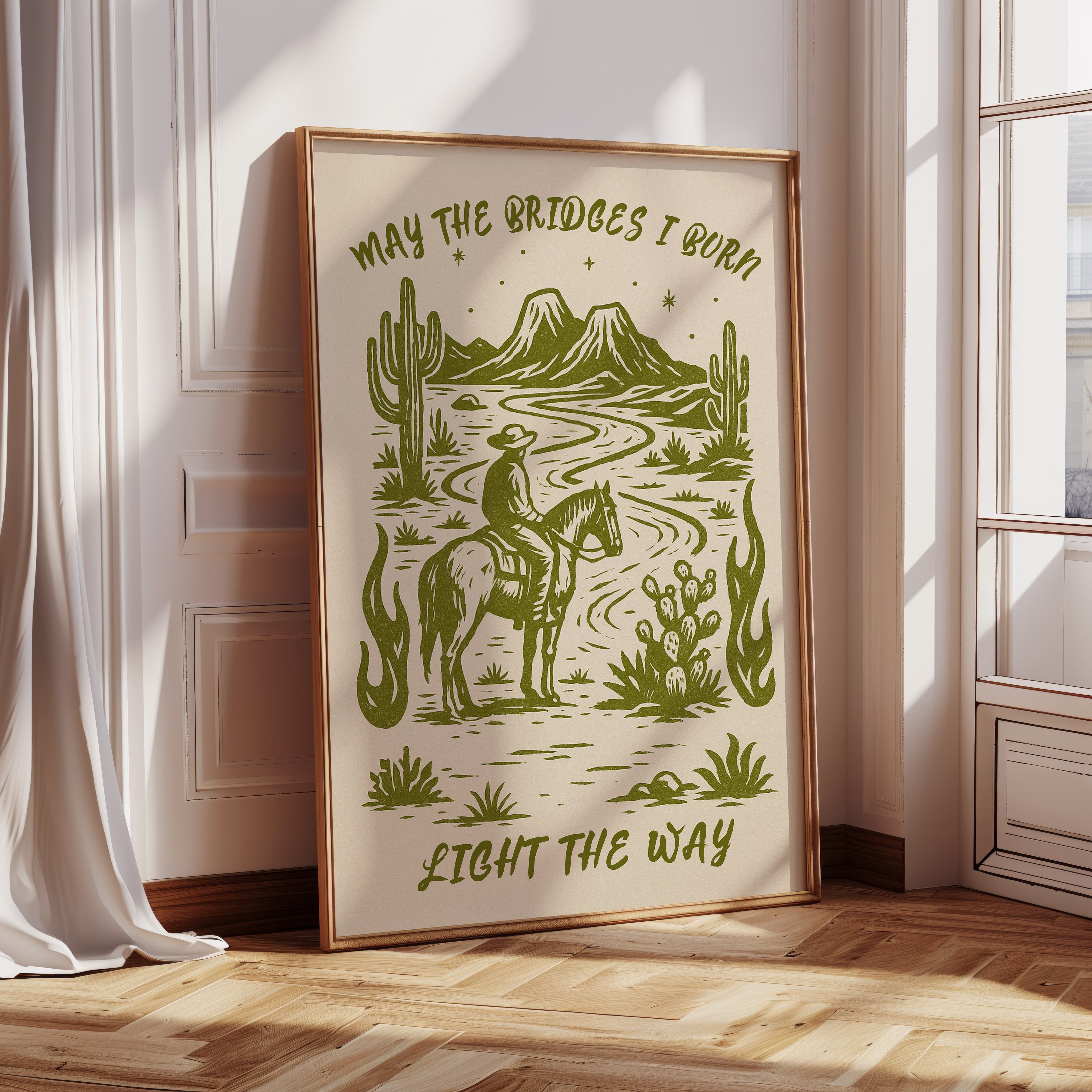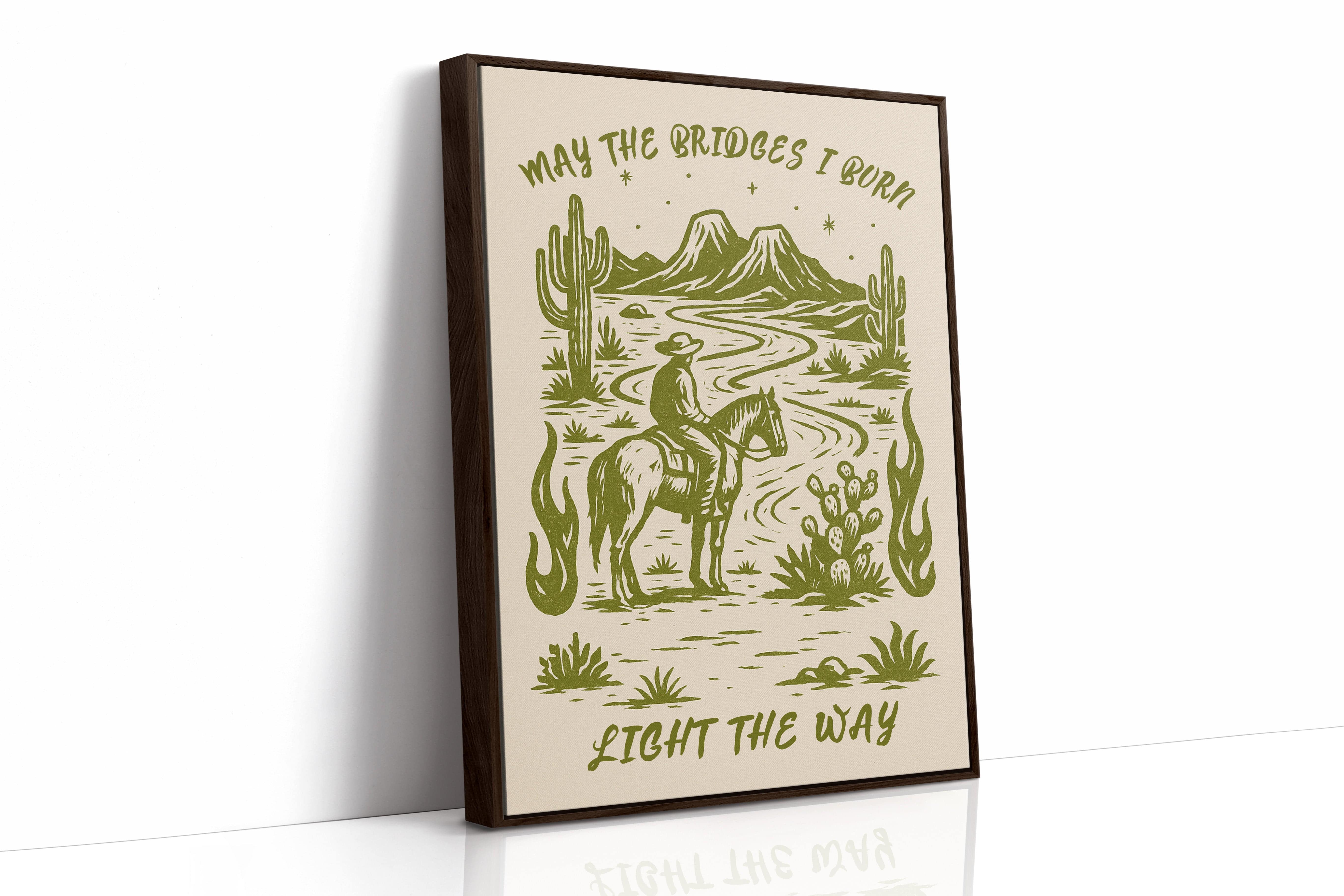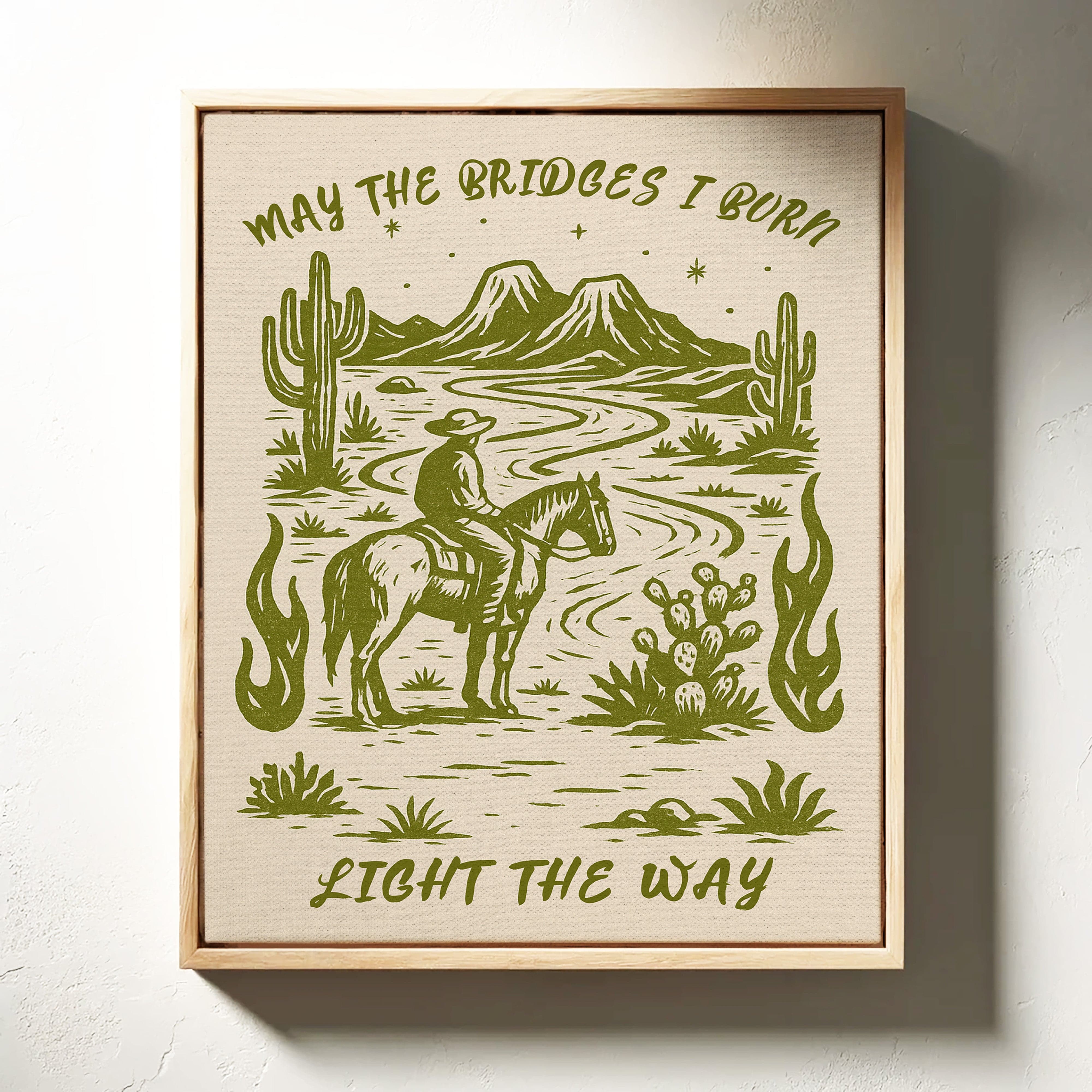 Vintage Western desert print with the quote “May the bridges I burn light the way,” featuring a cowboy on horseback under desert skies.