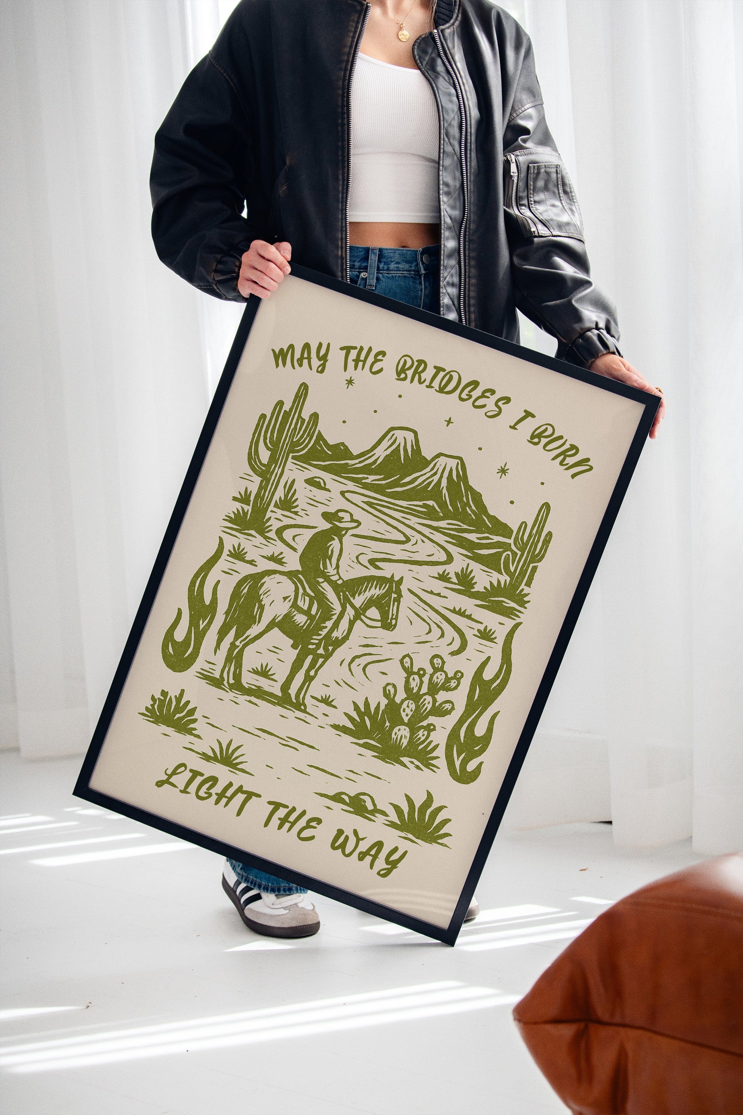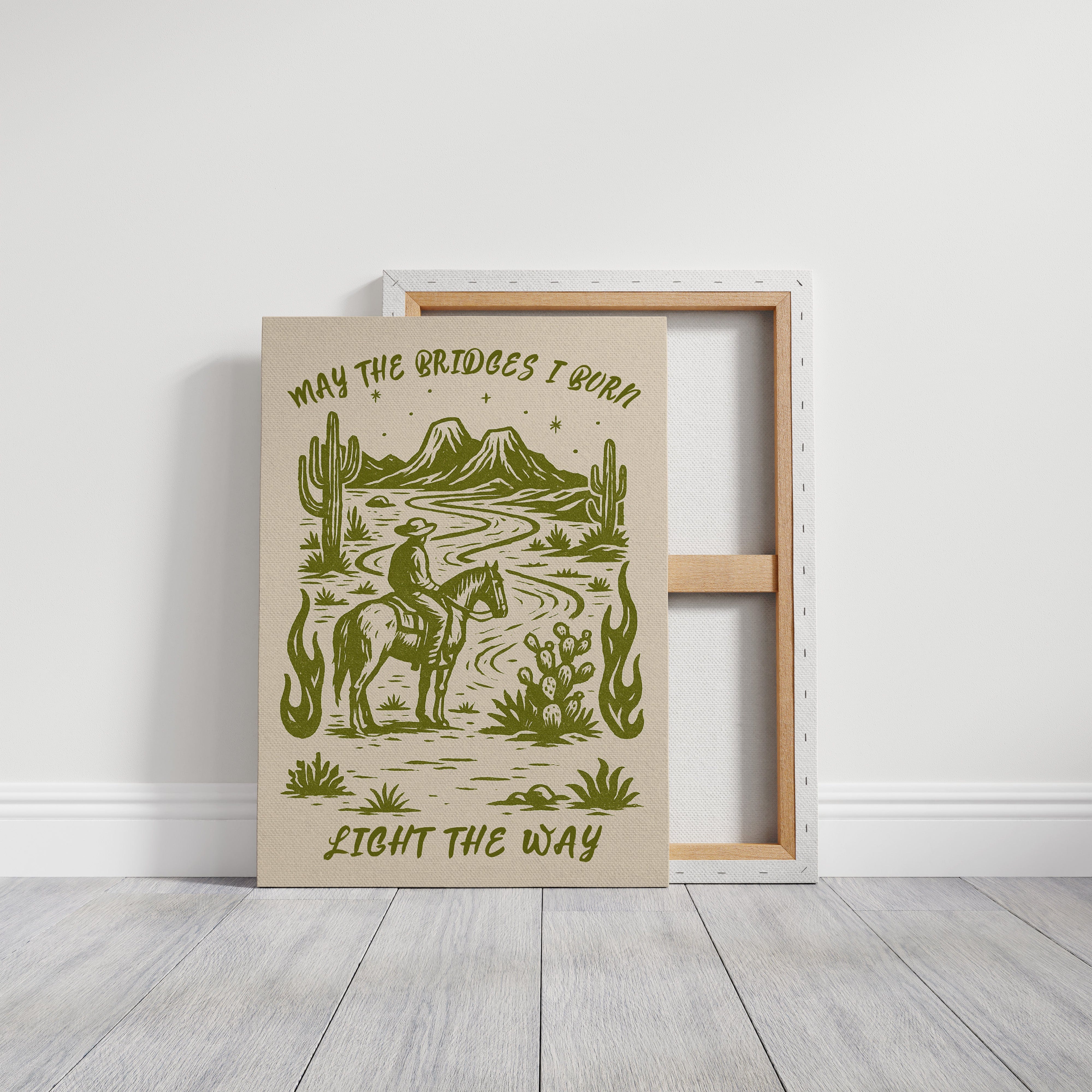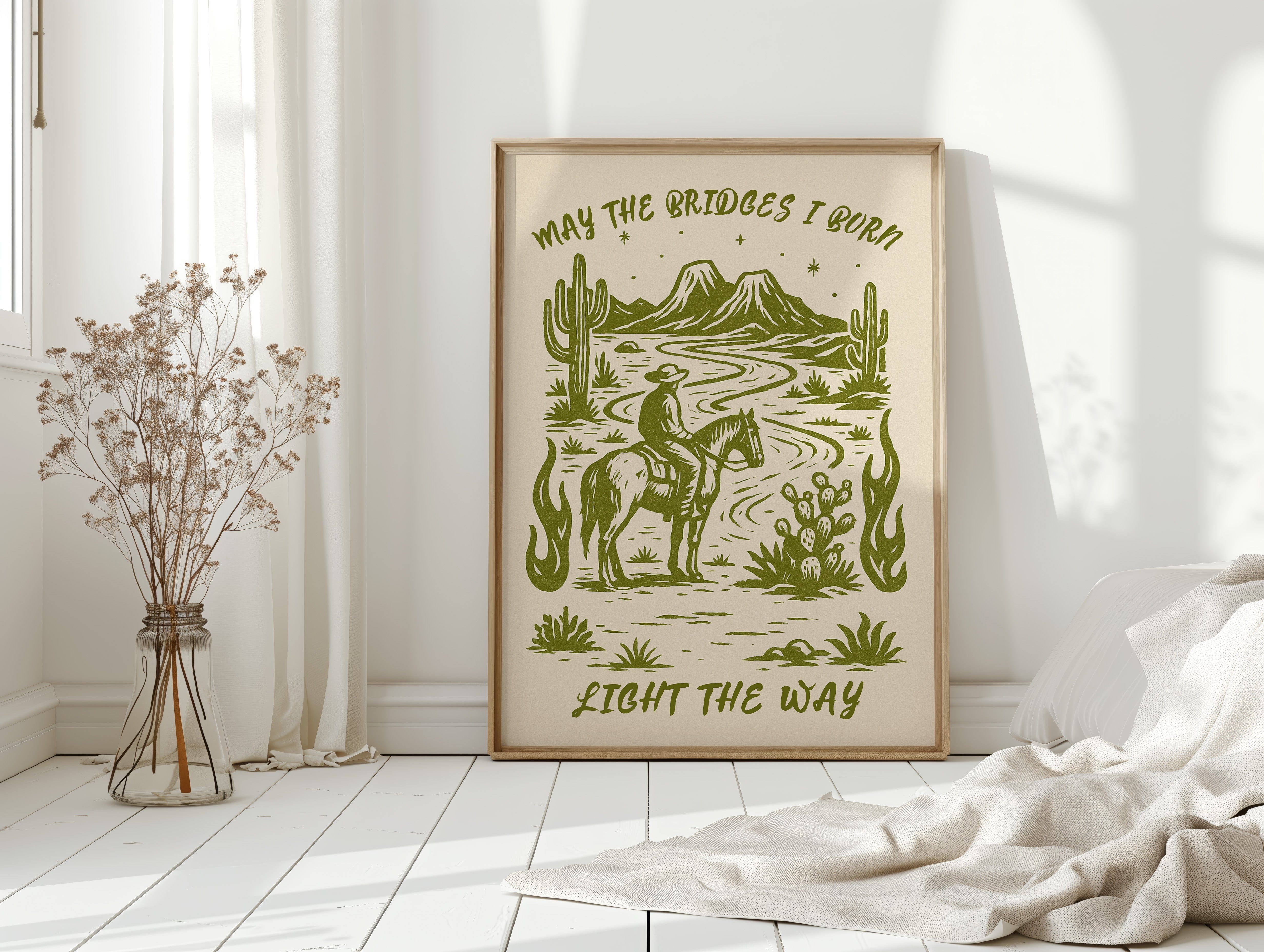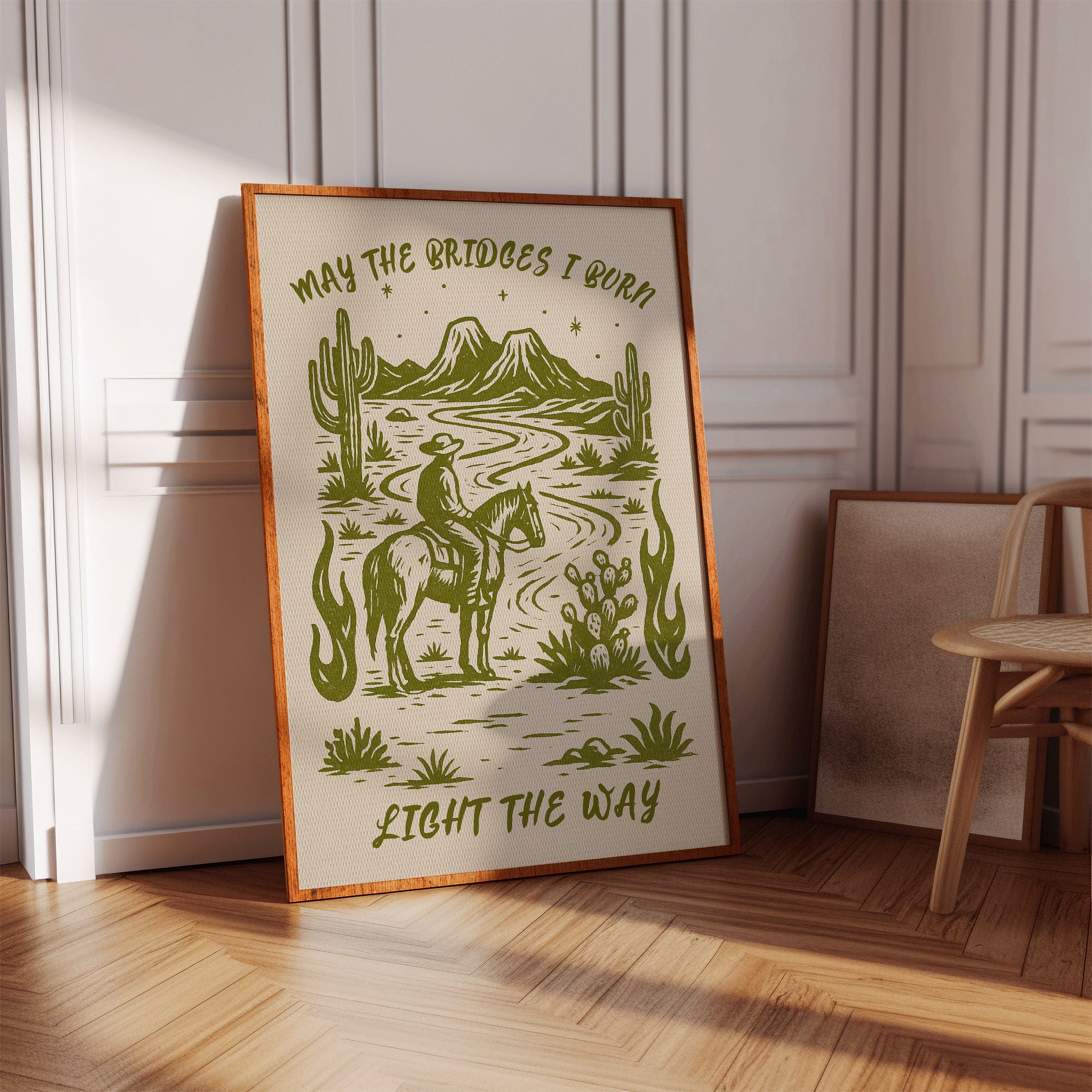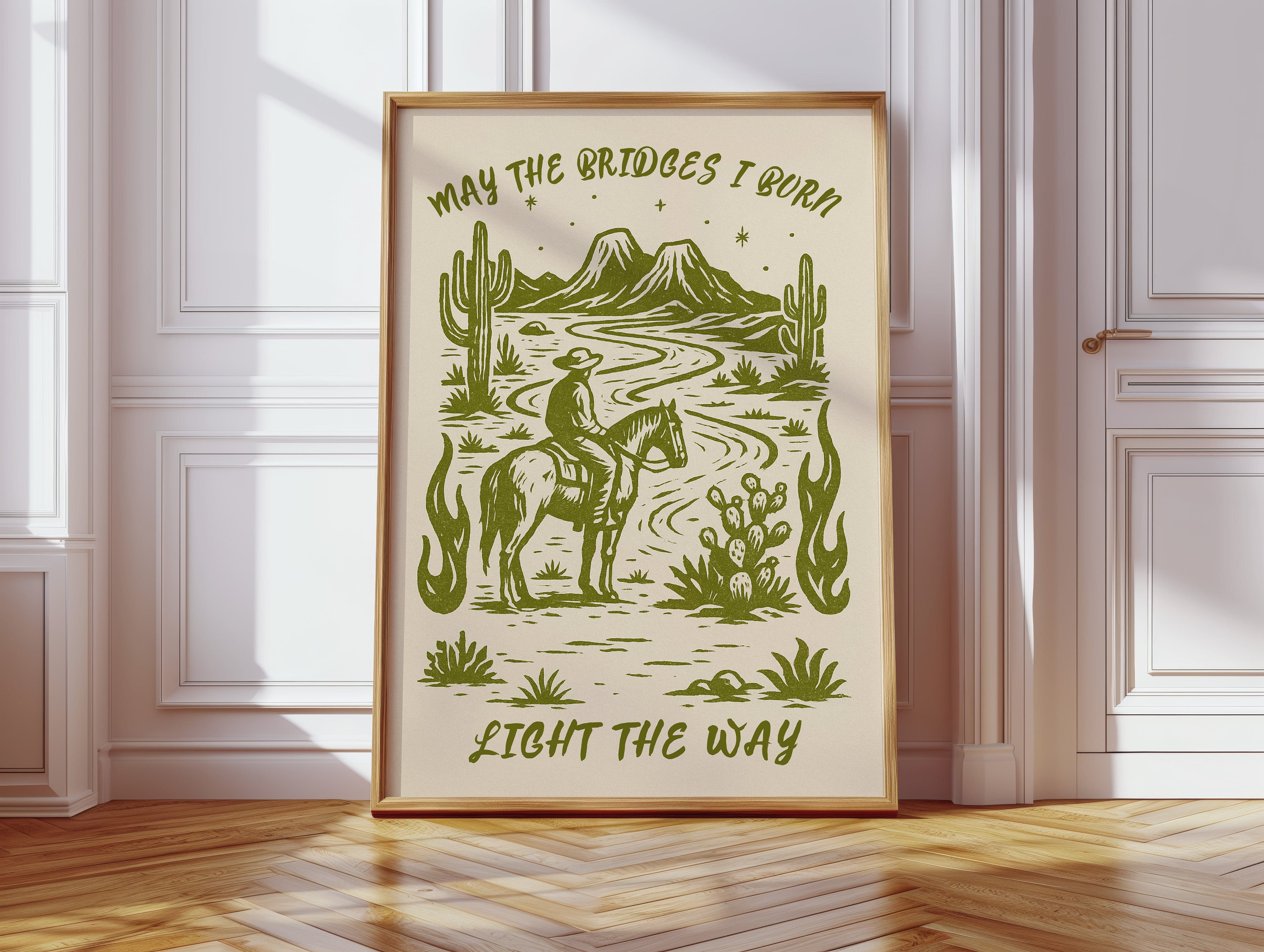 Vintage Western desert print with the quote “May the bridges I burn light the way,” featuring a cowboy on horseback under desert skies.