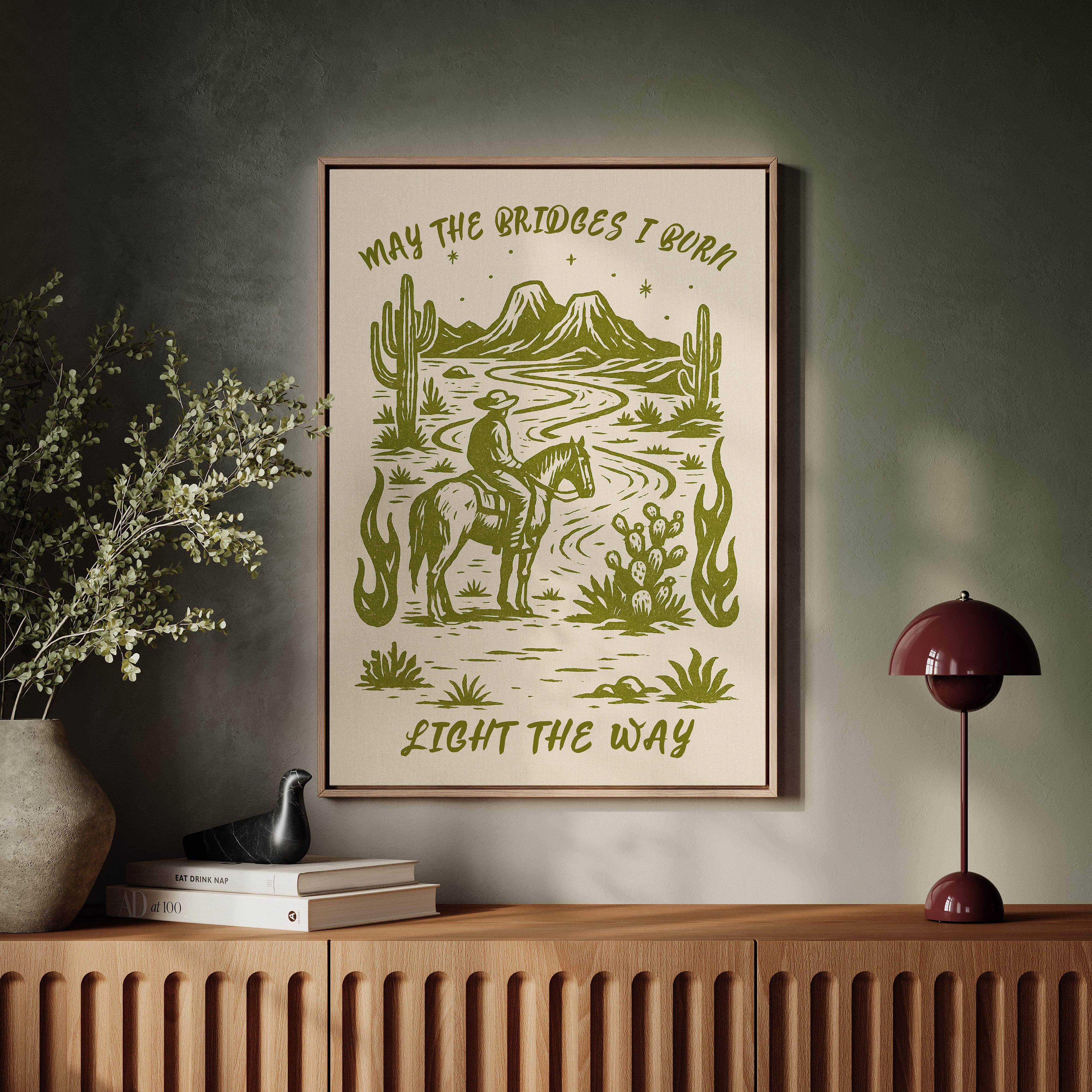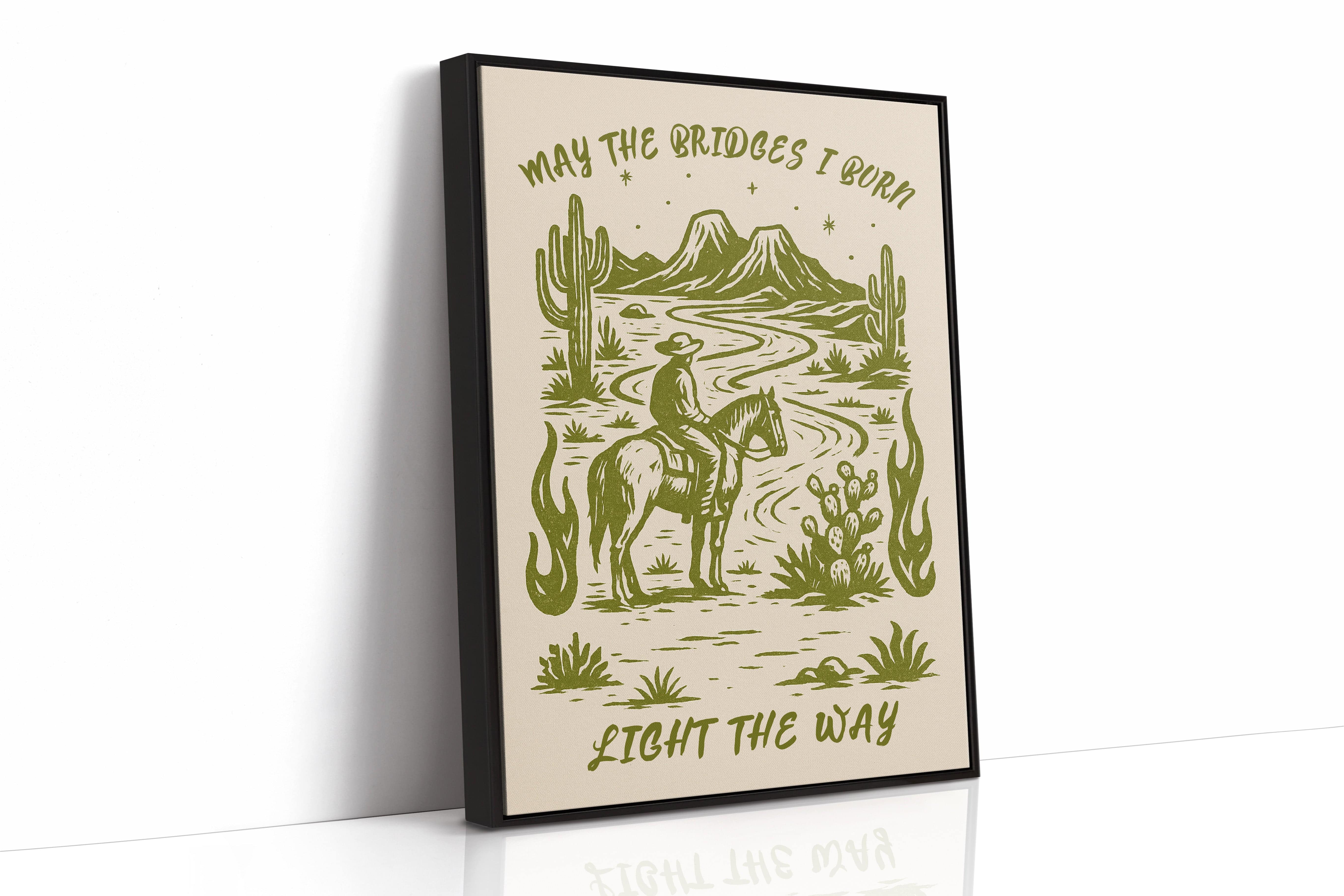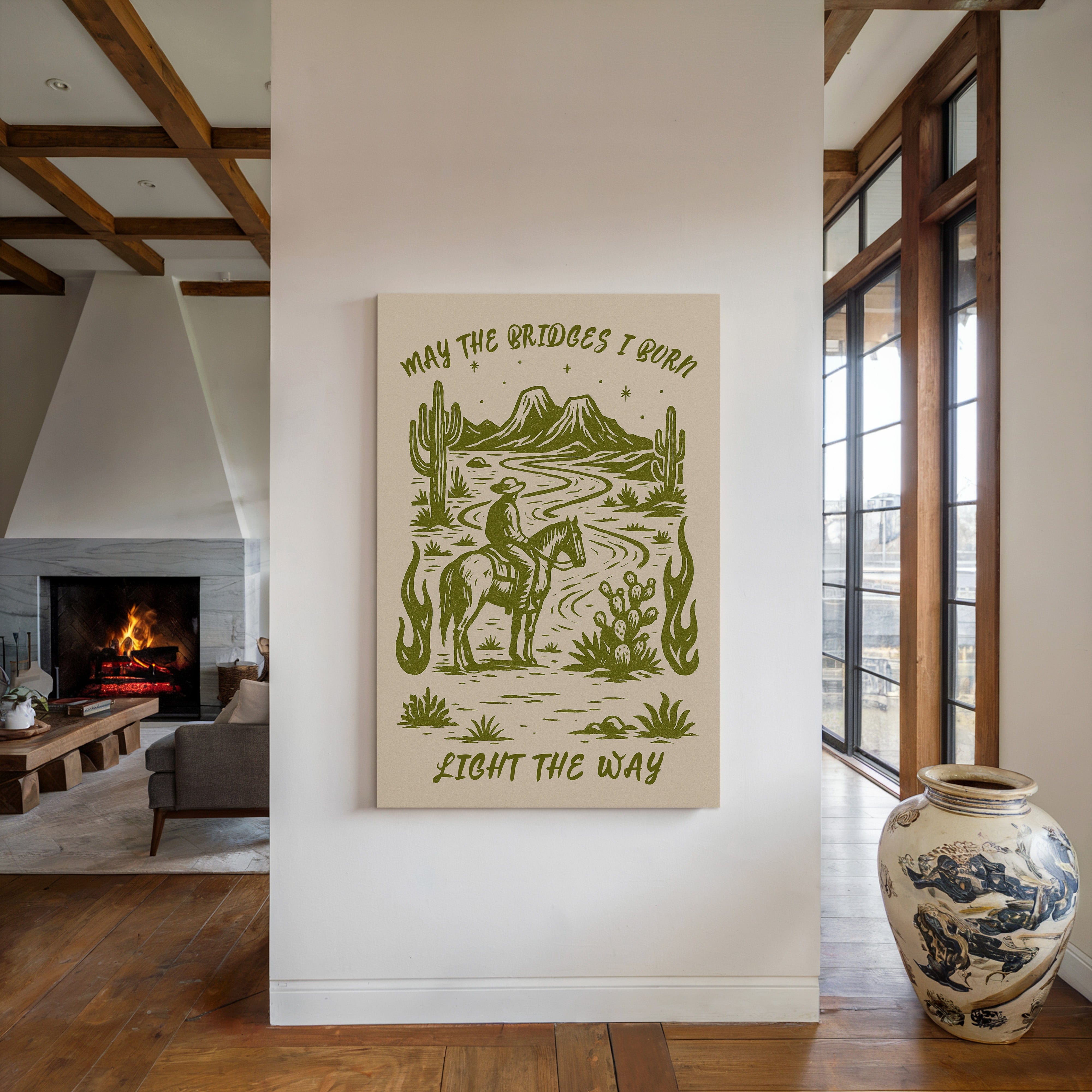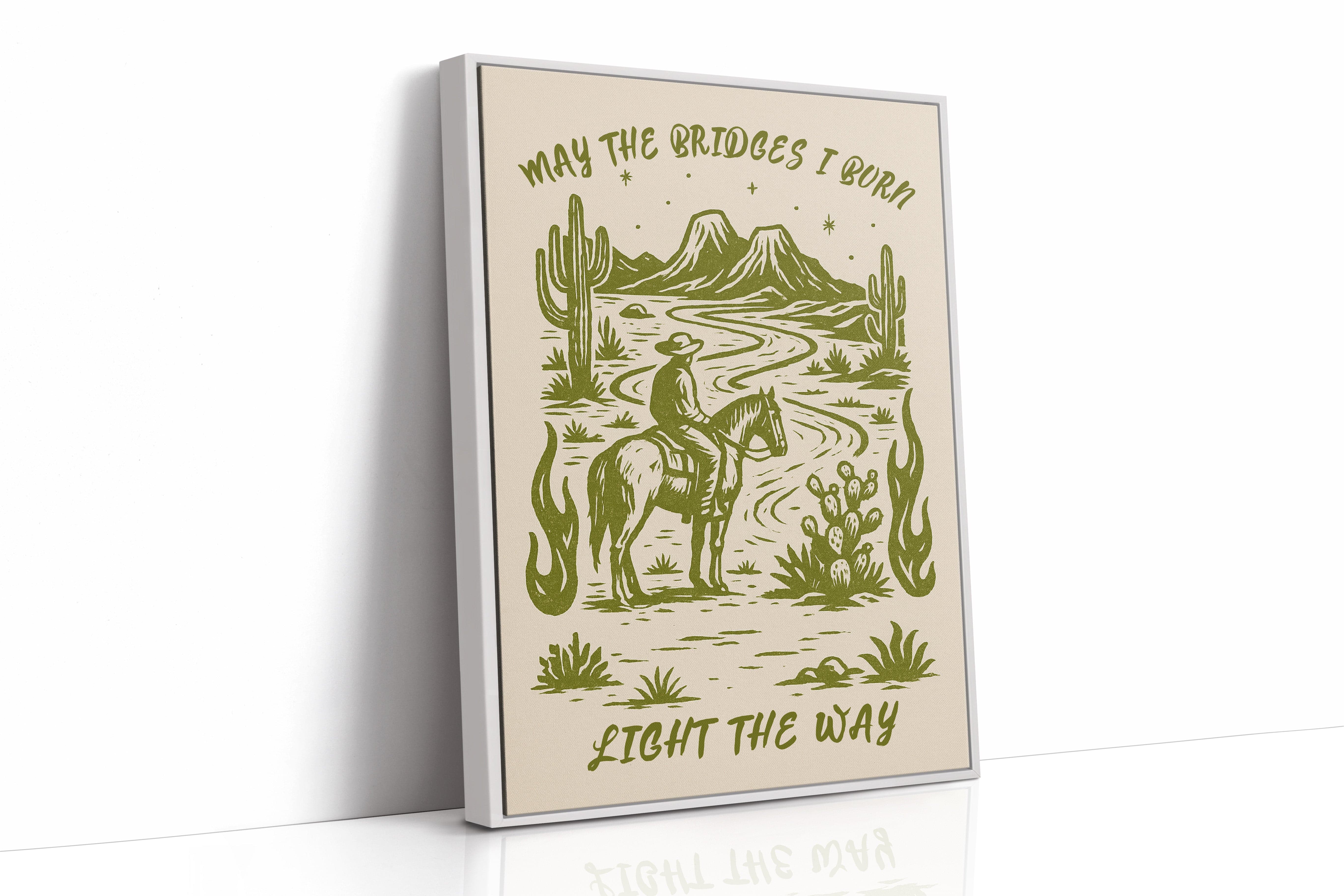Vintage Western desert print with the quote “May the bridges I burn light the way,” featuring a cowboy on horseback under desert skies.