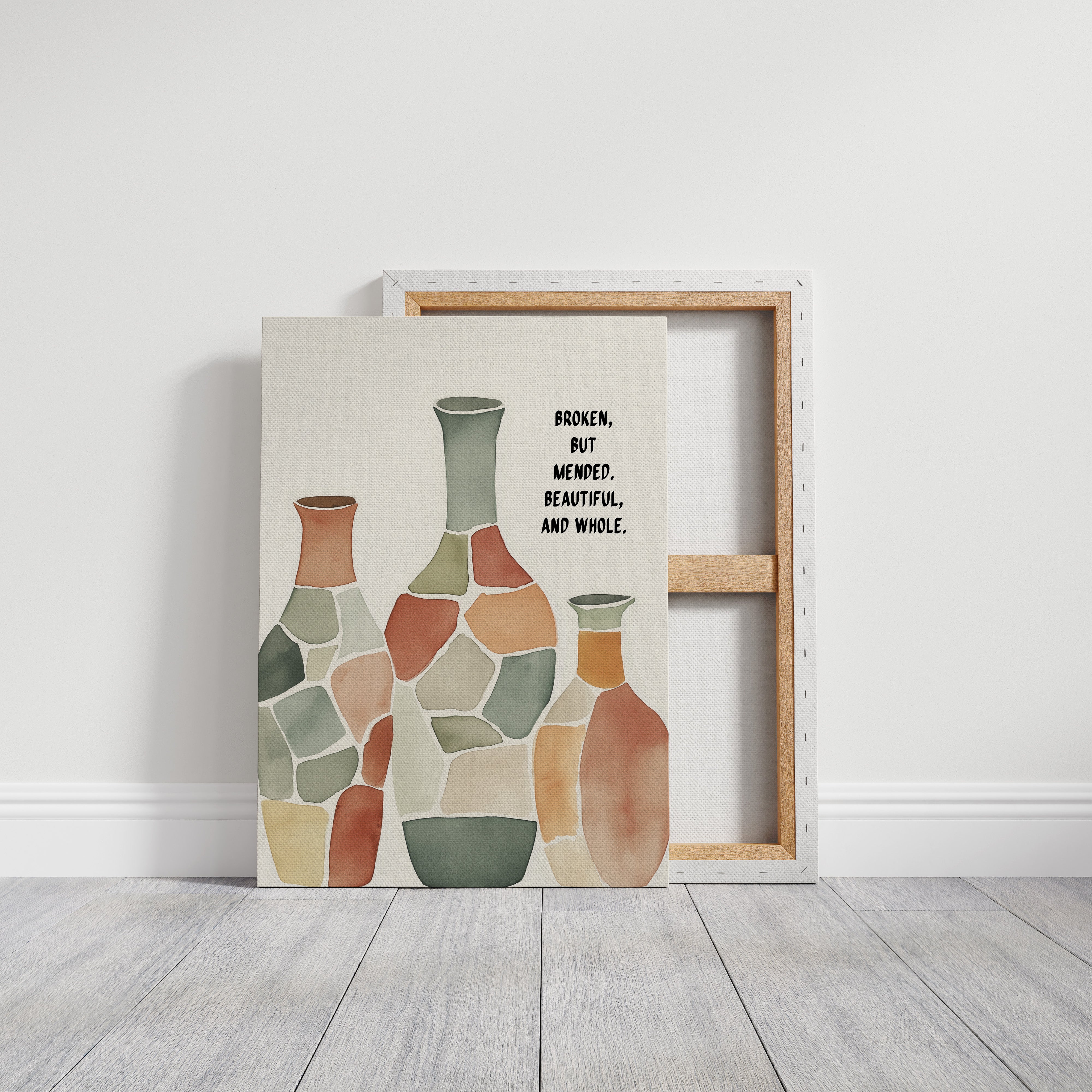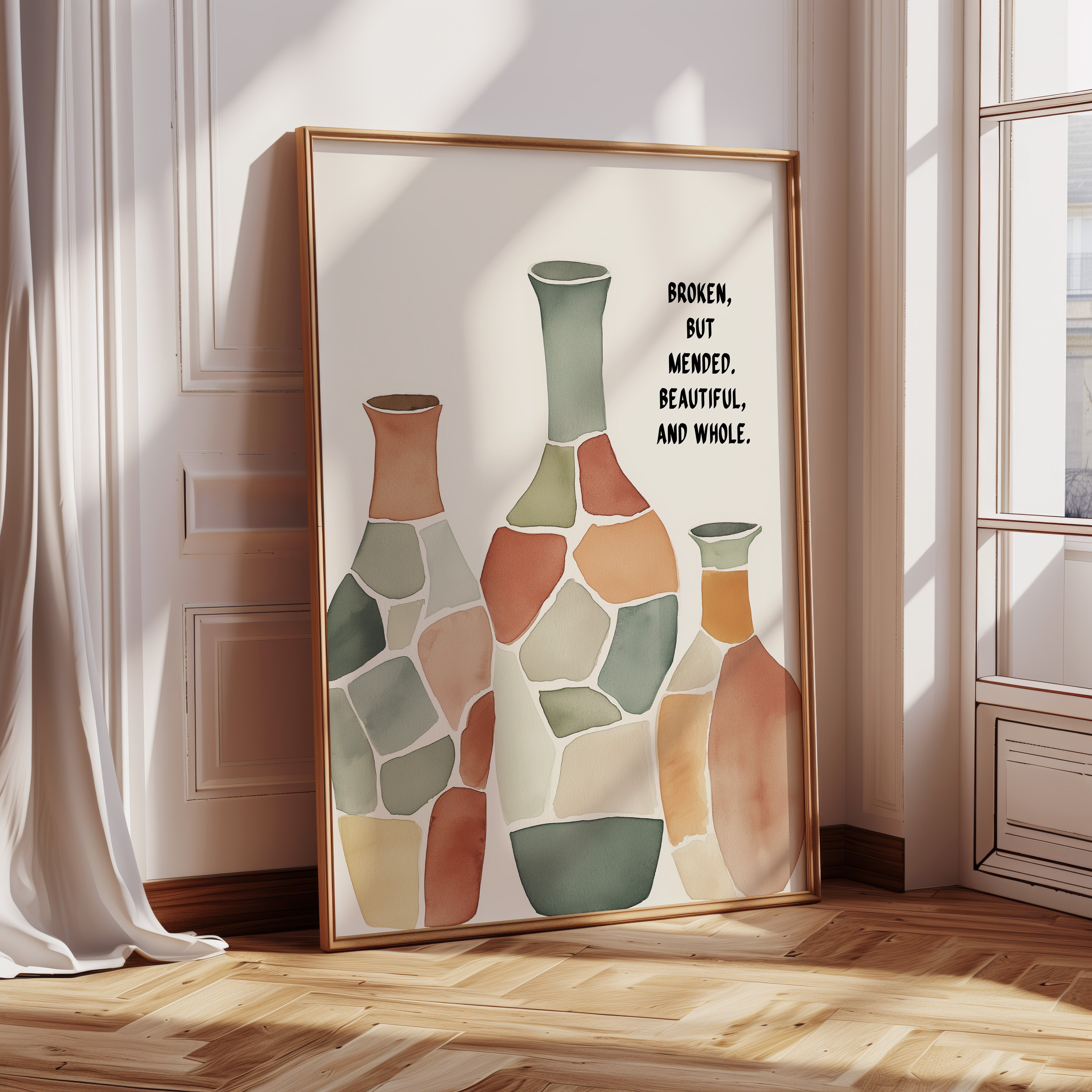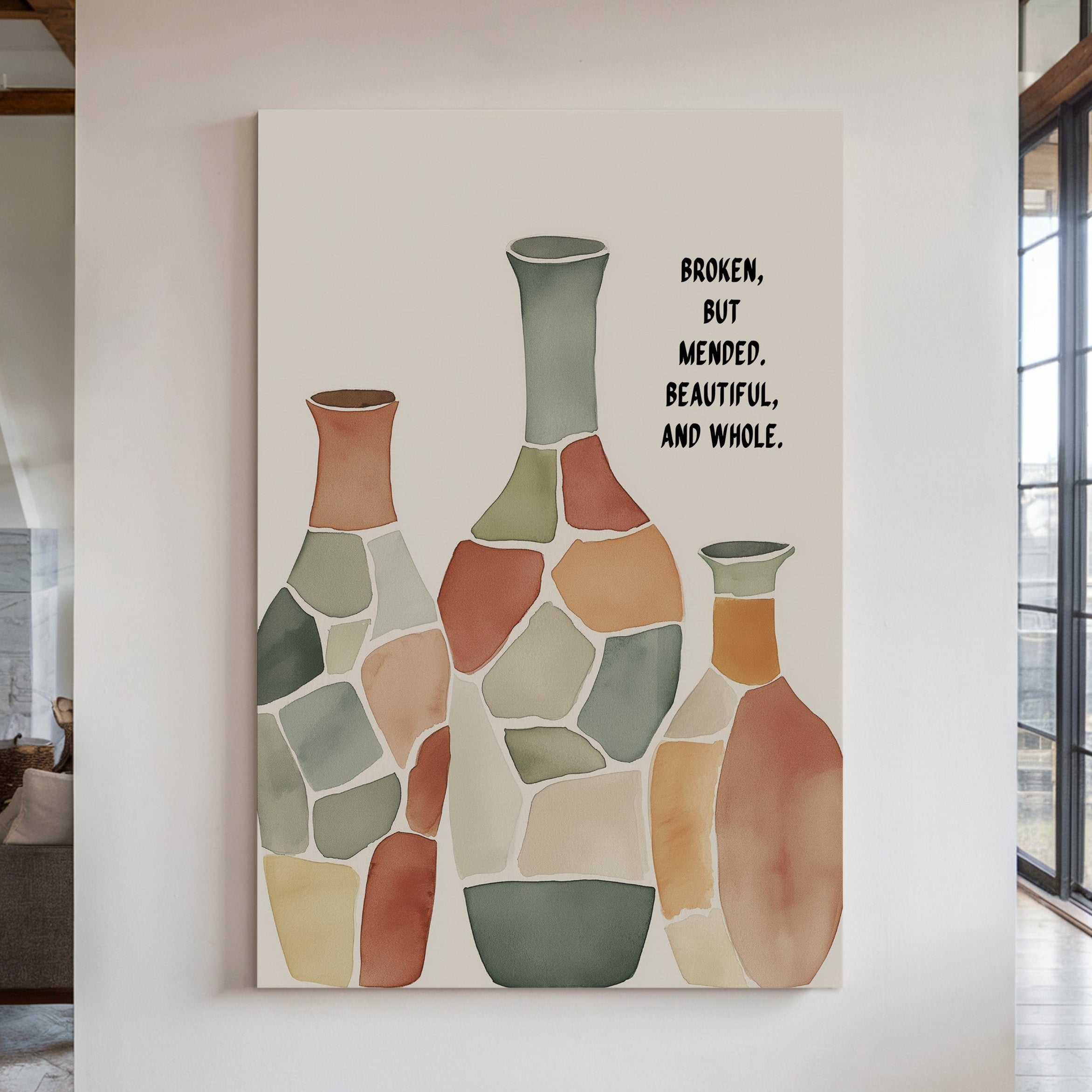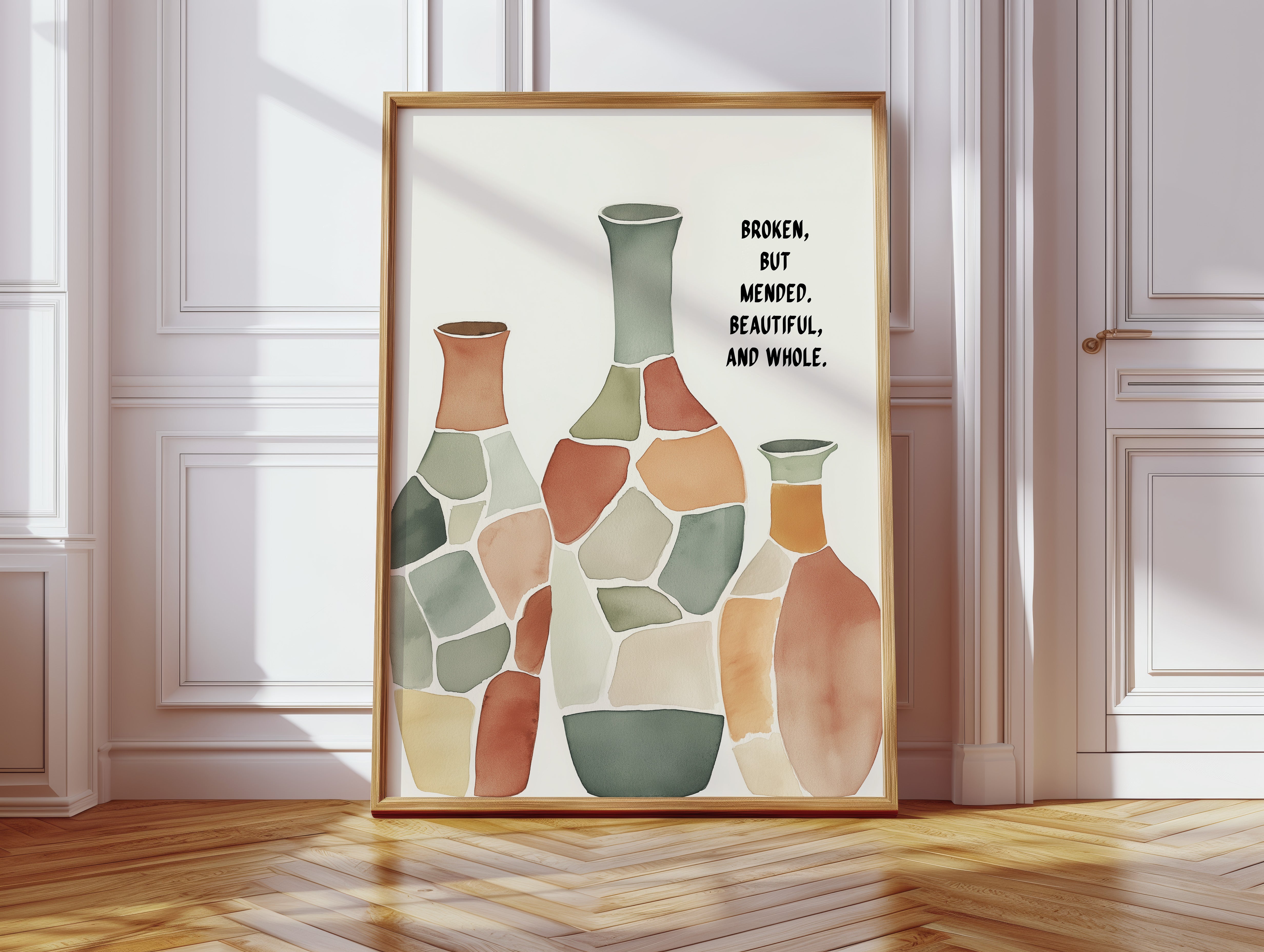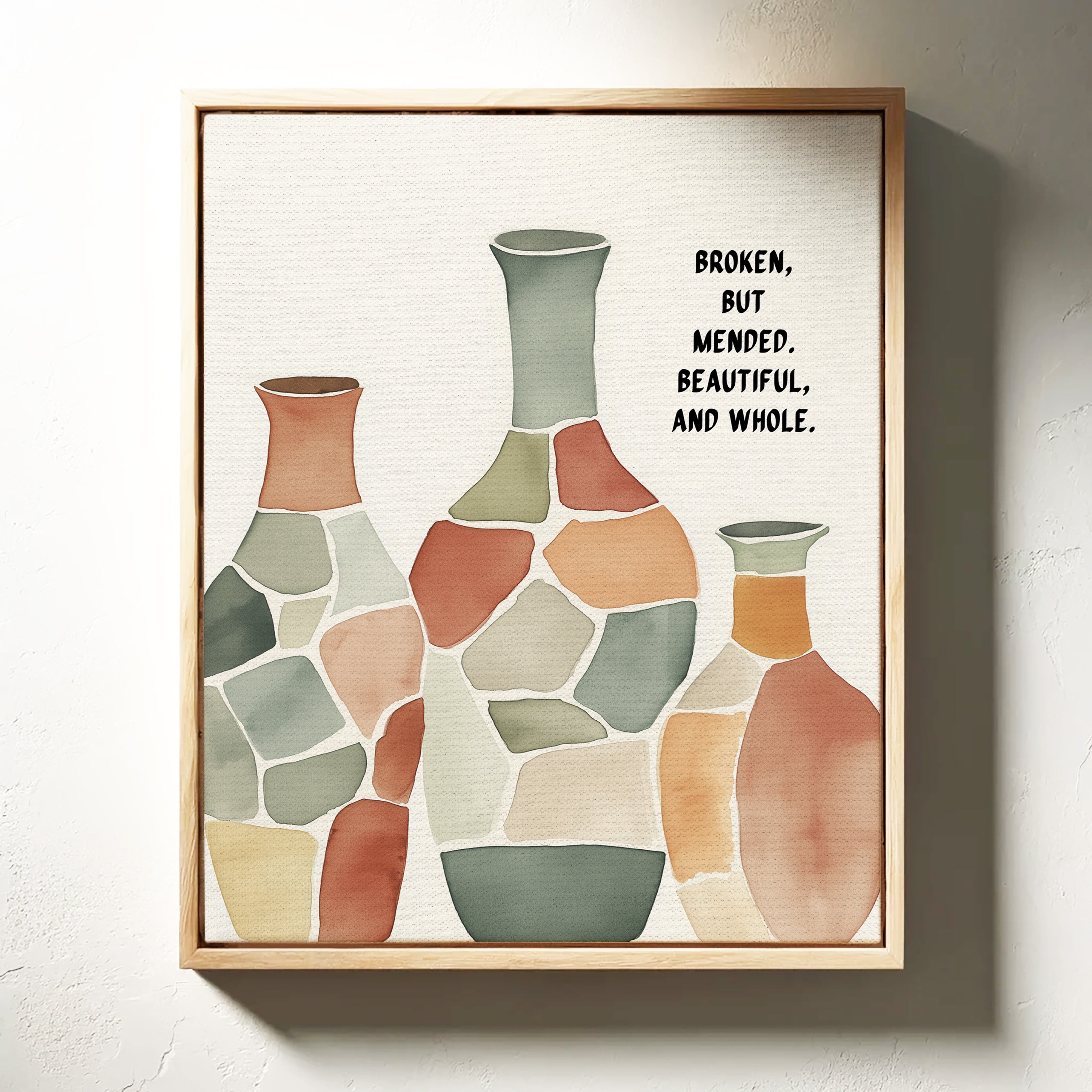 Soft and soulful, this watercolor of patchwork vases speaks of healing—broken yet whole, scarred yet beautiful, made strong through restoration.
