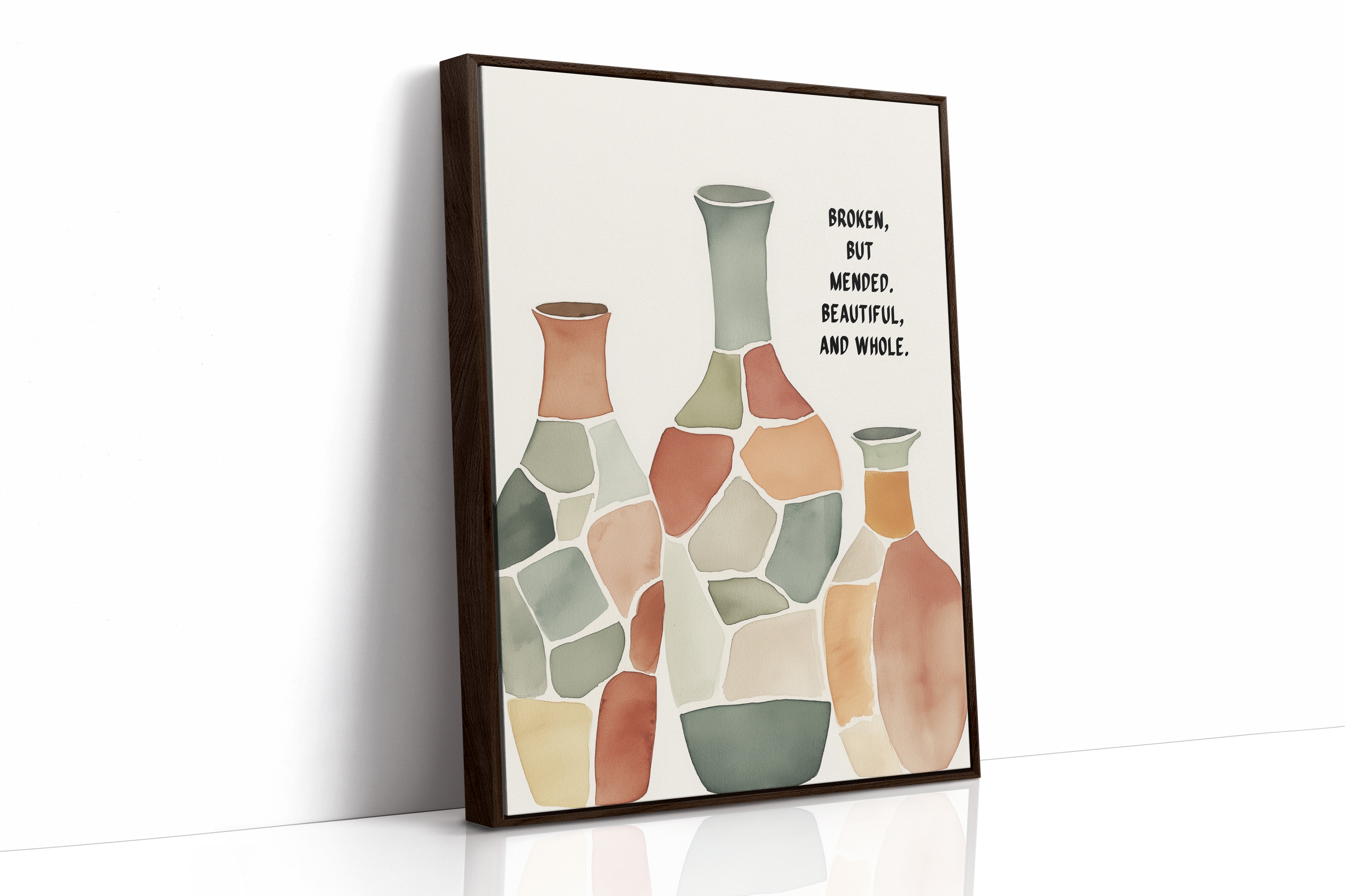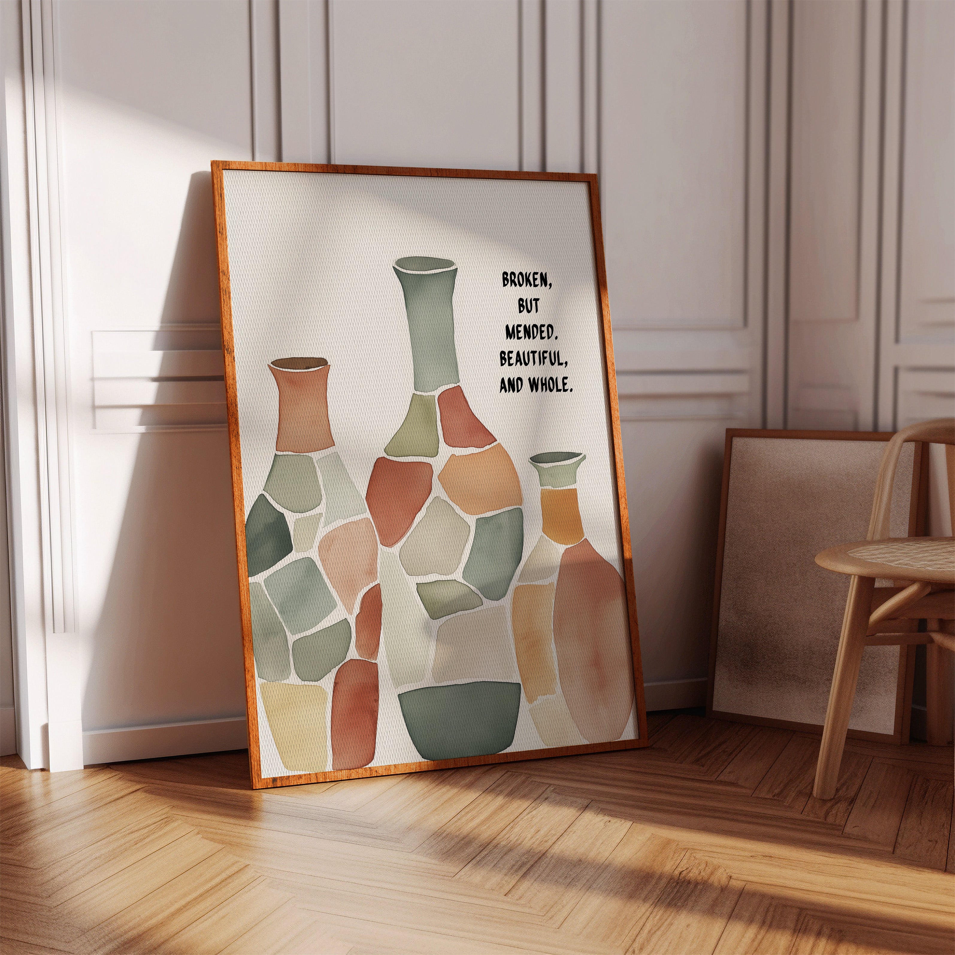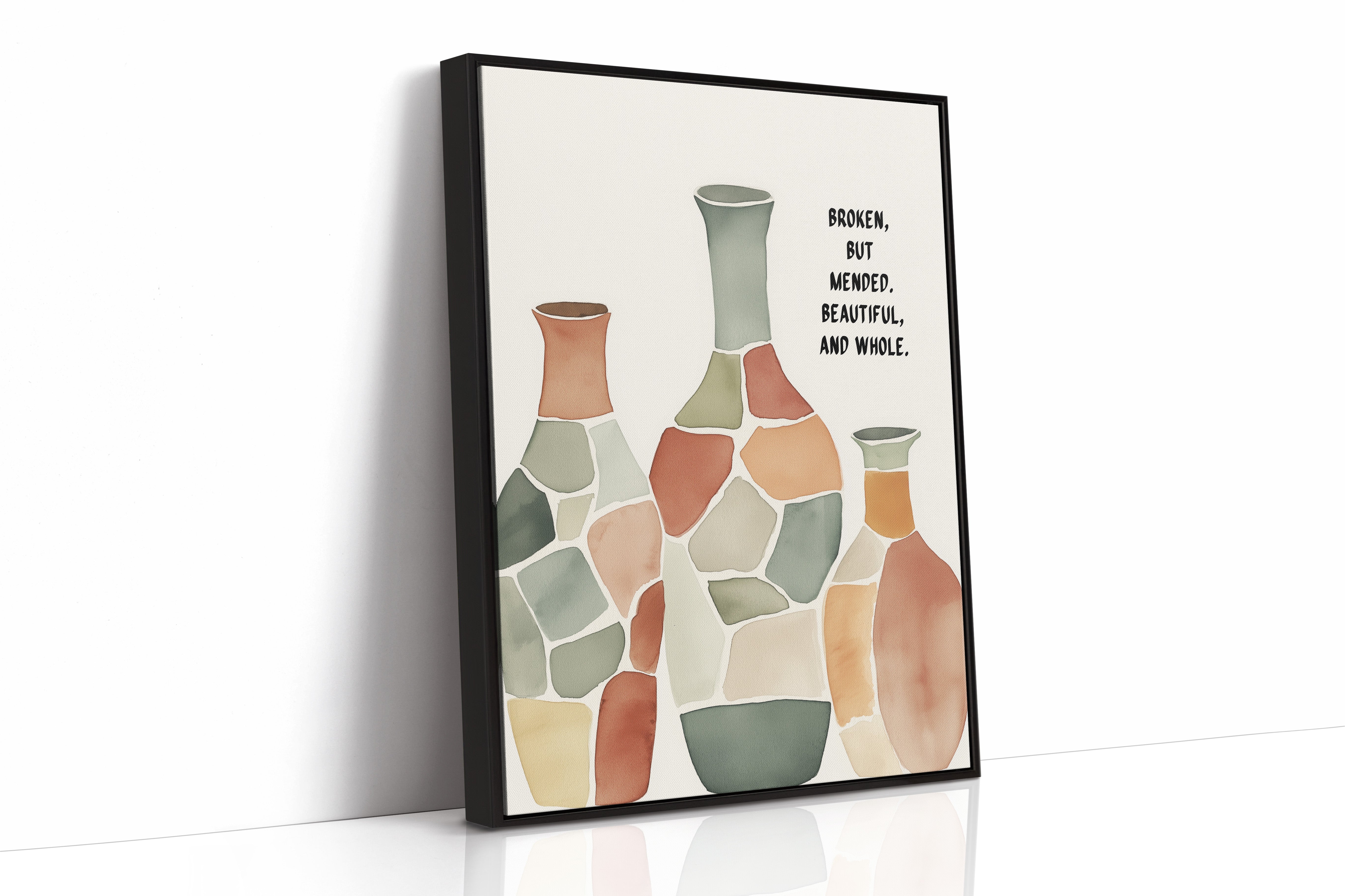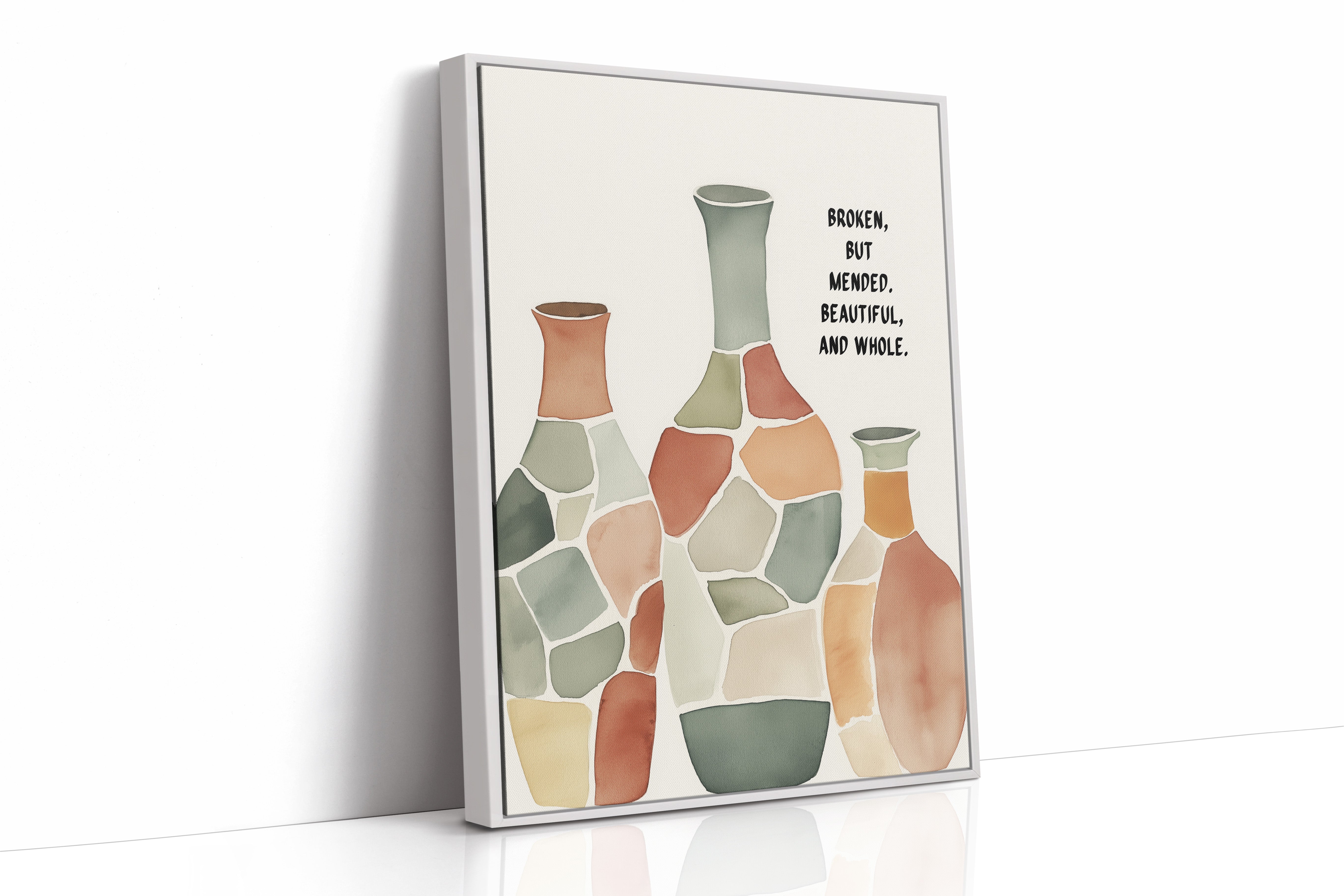 Soft and soulful, this watercolor of patchwork vases speaks of healing—broken yet whole, scarred yet beautiful, made strong through restoration.
