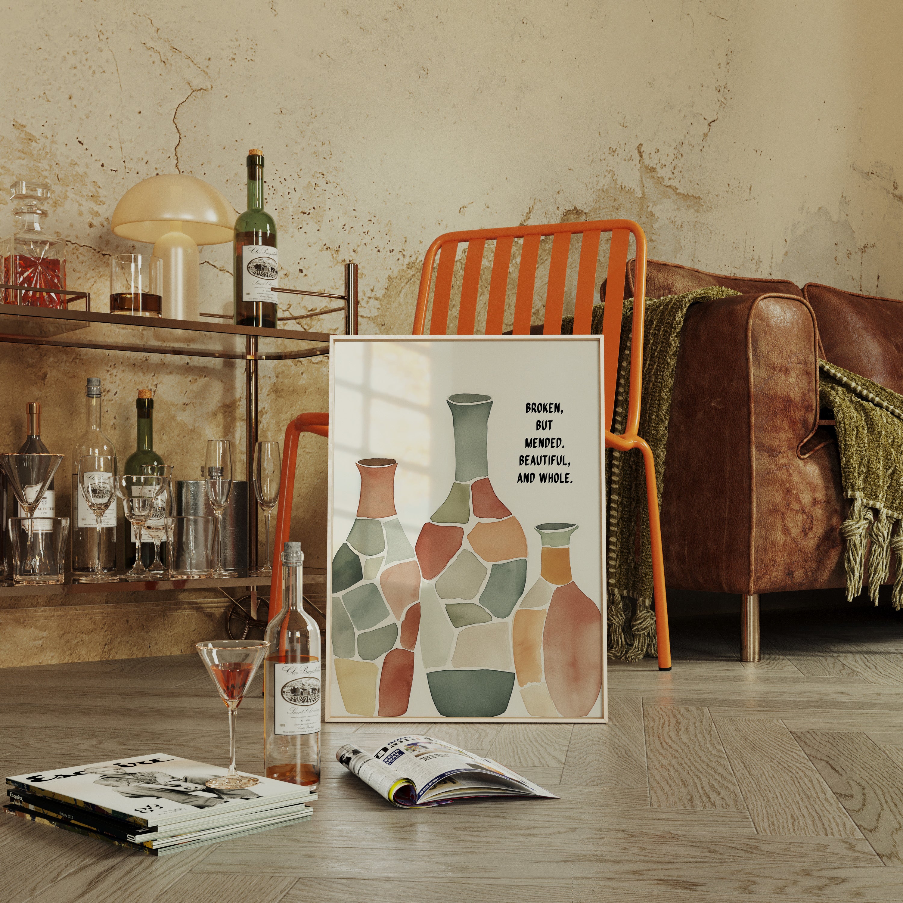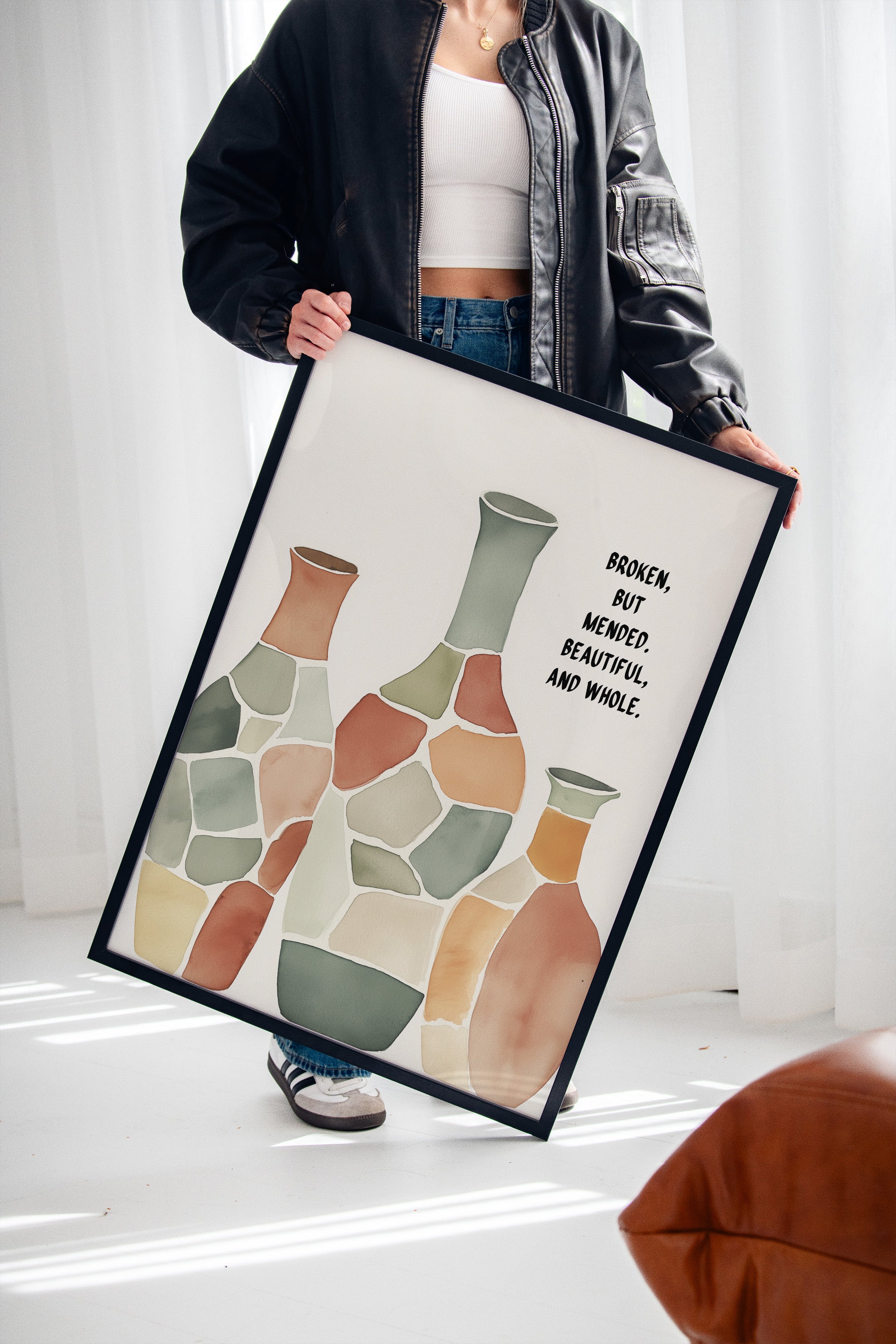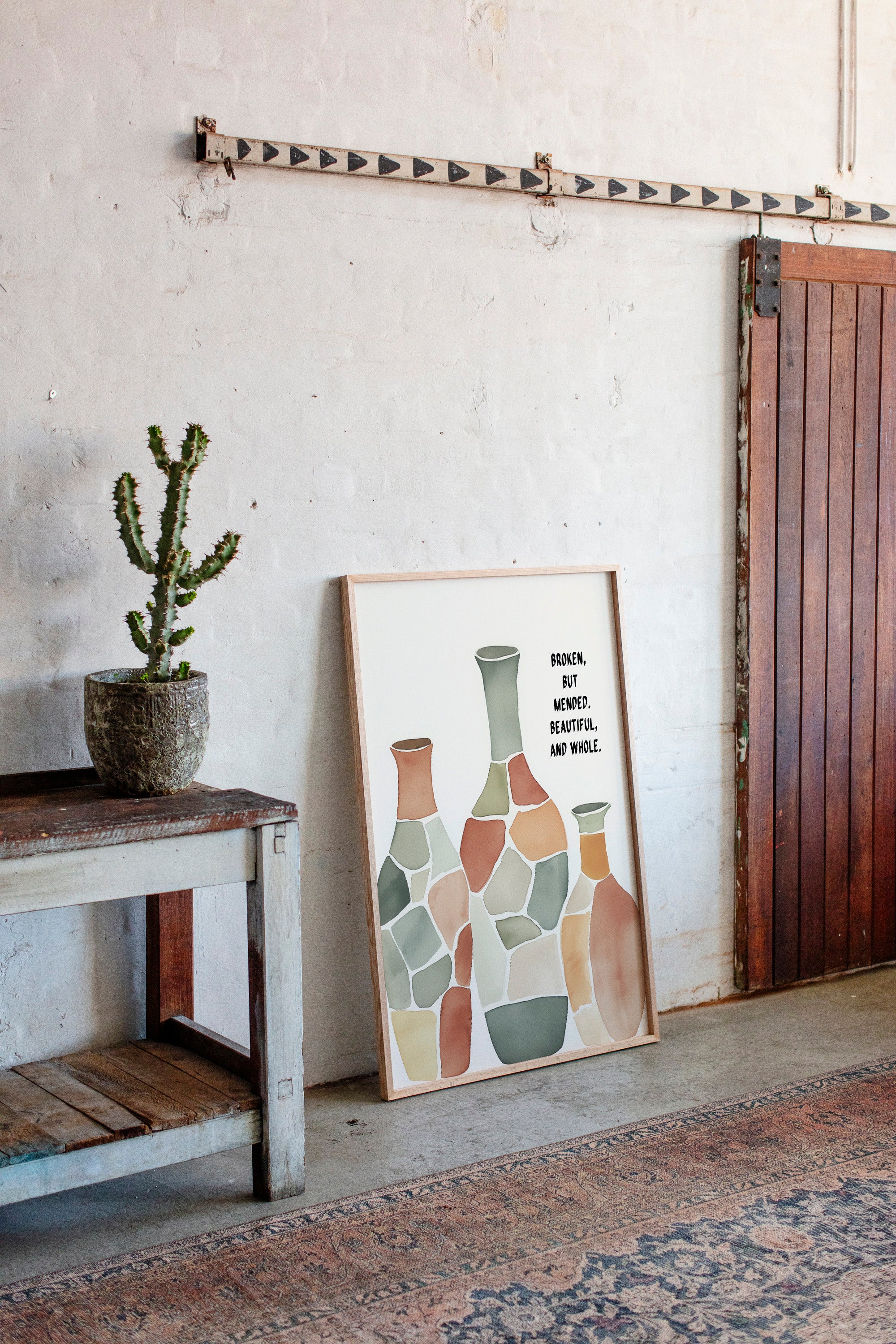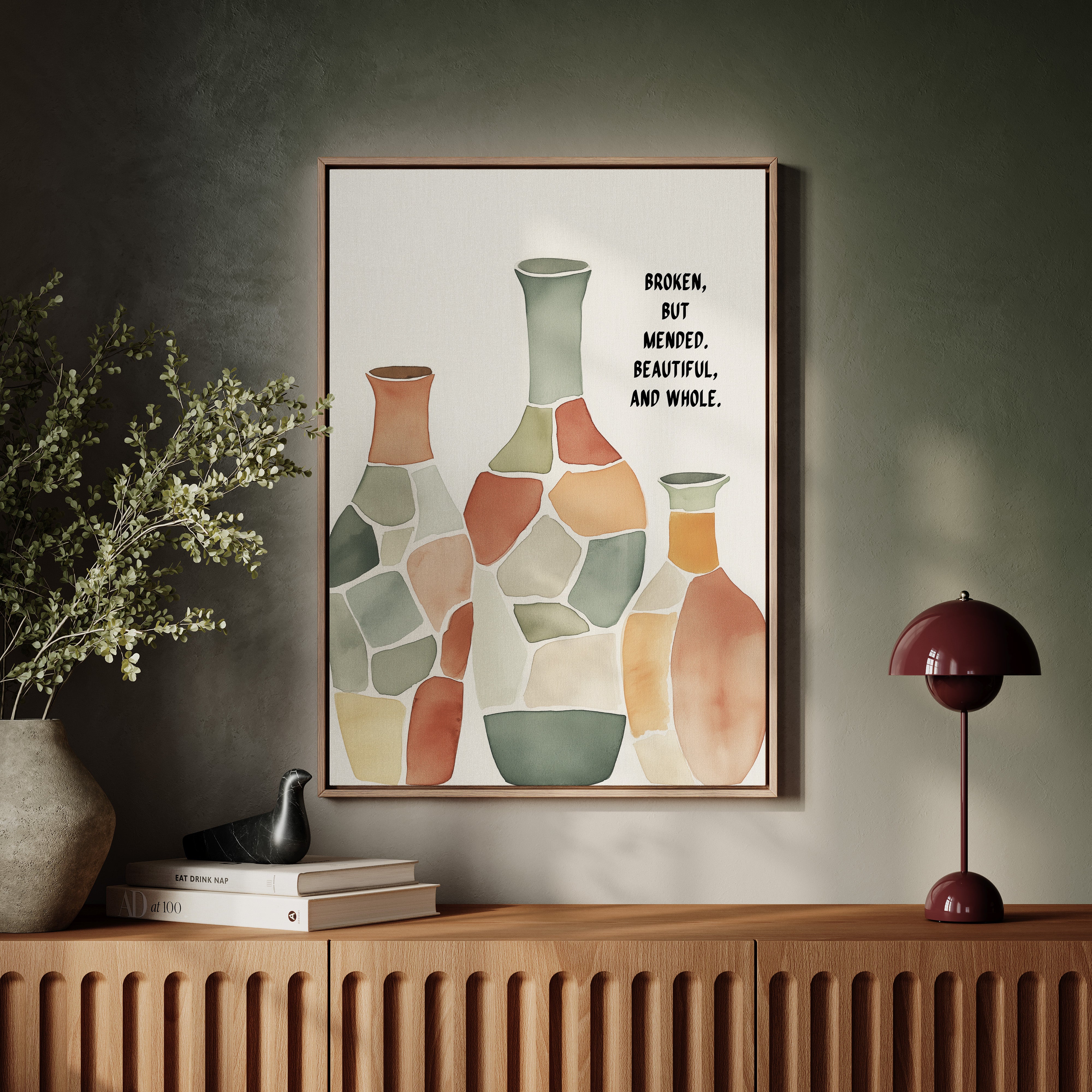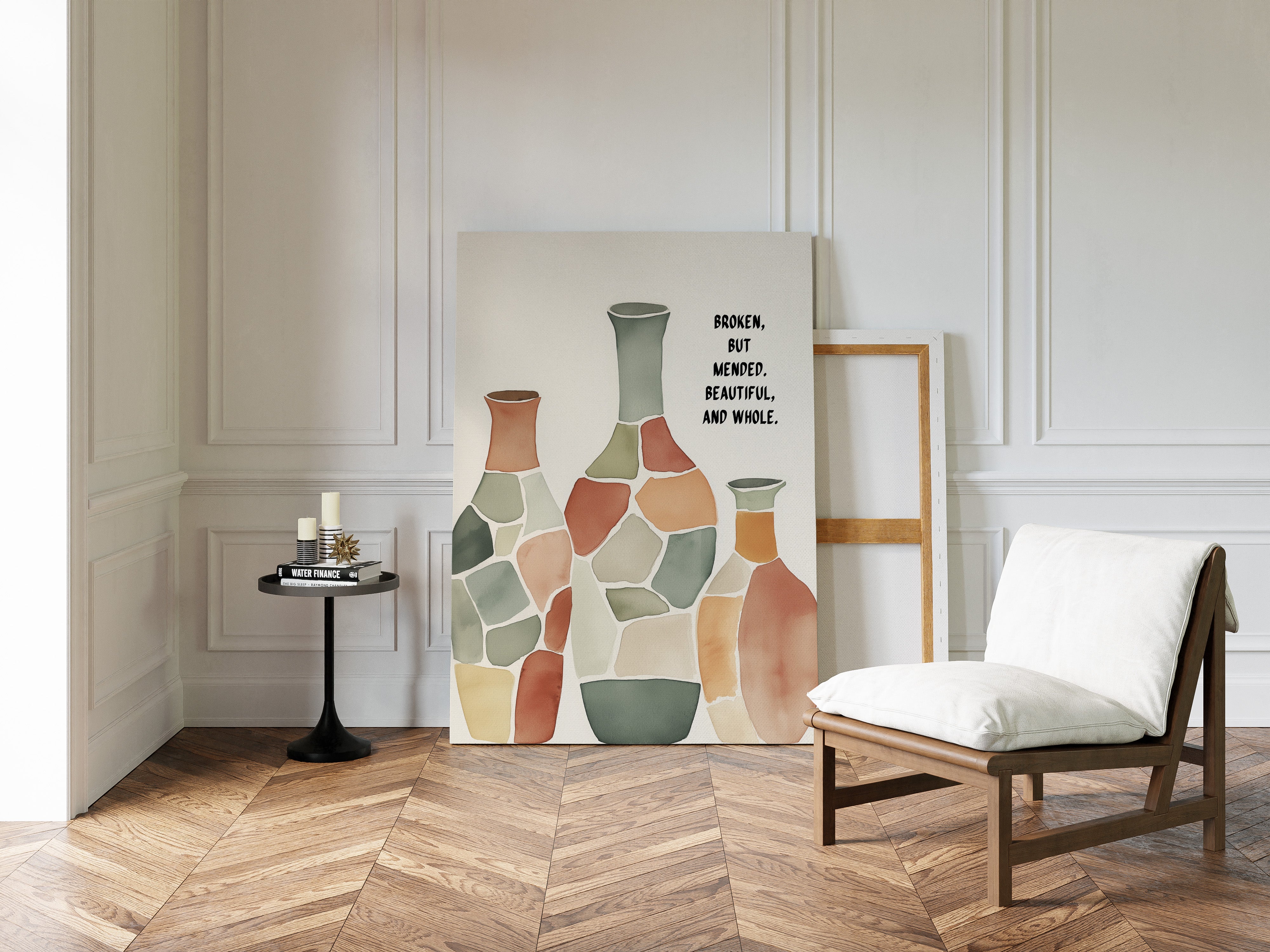 Soft and soulful, this watercolor of patchwork vases speaks of healing—broken yet whole, scarred yet beautiful, made strong through restoration.