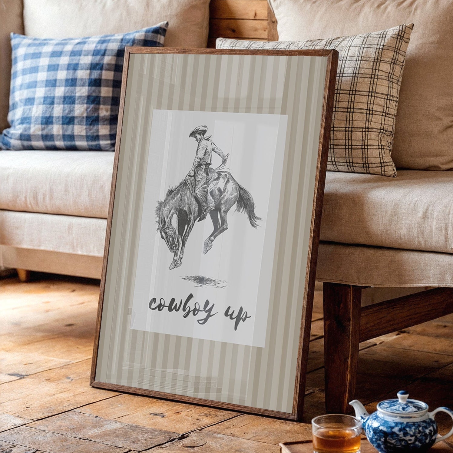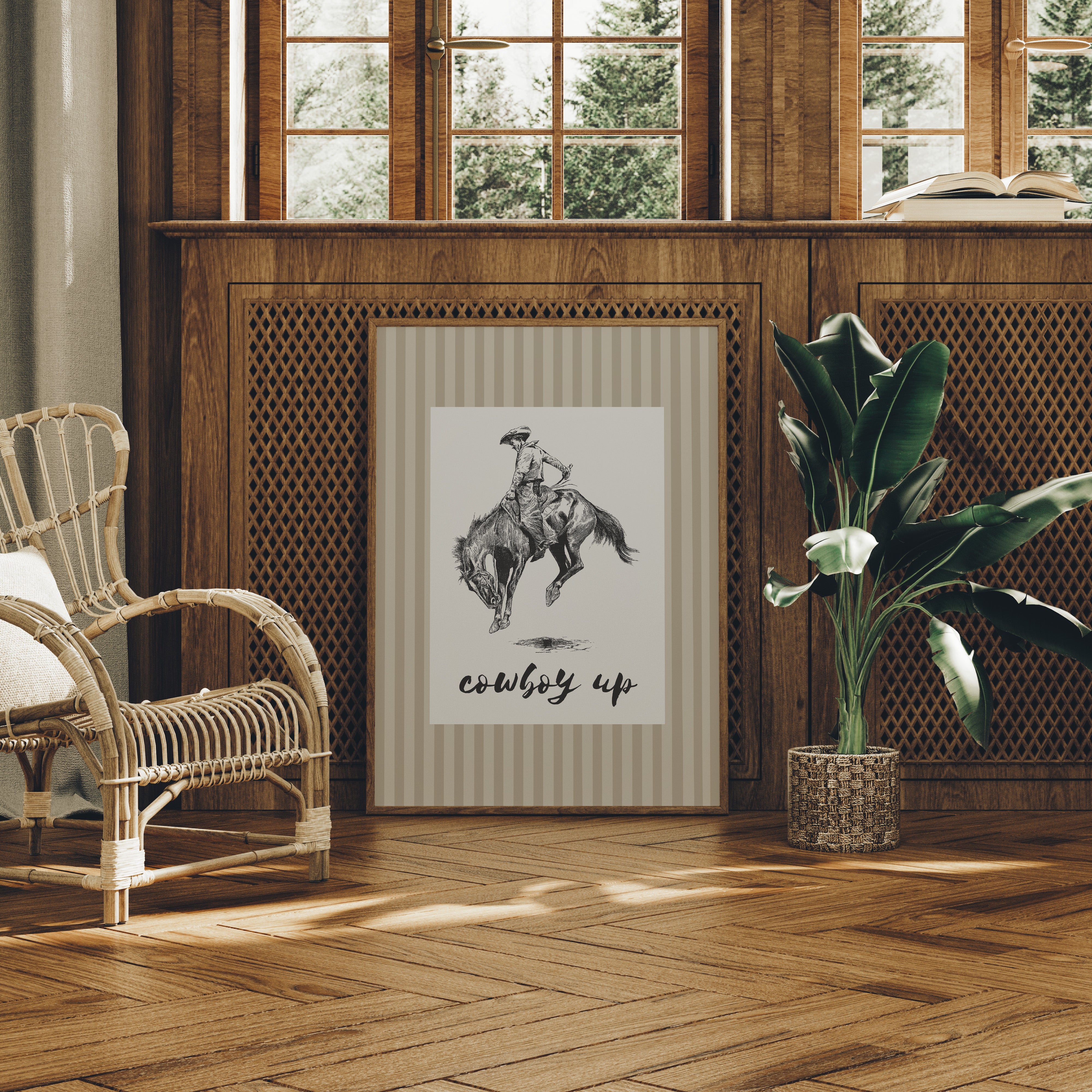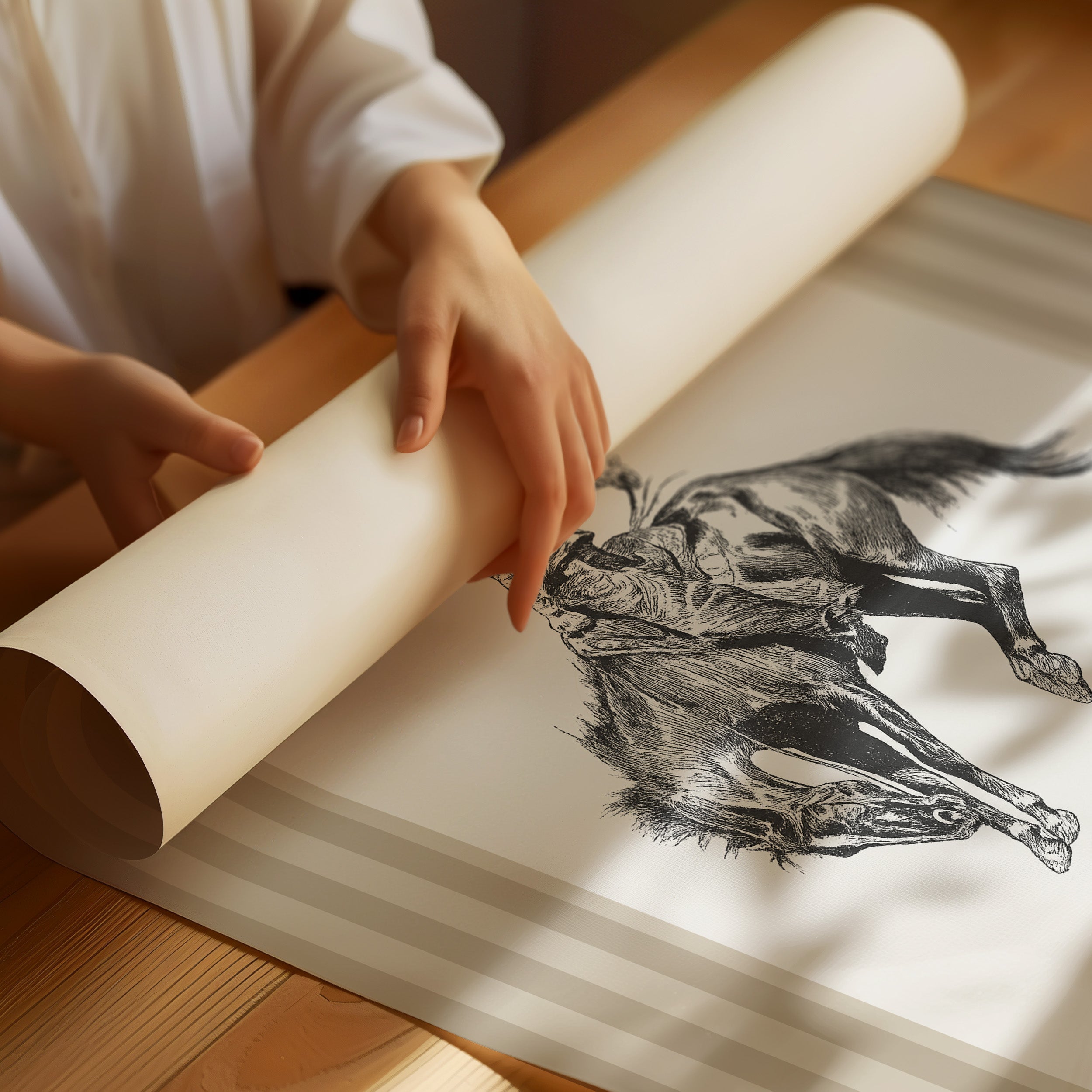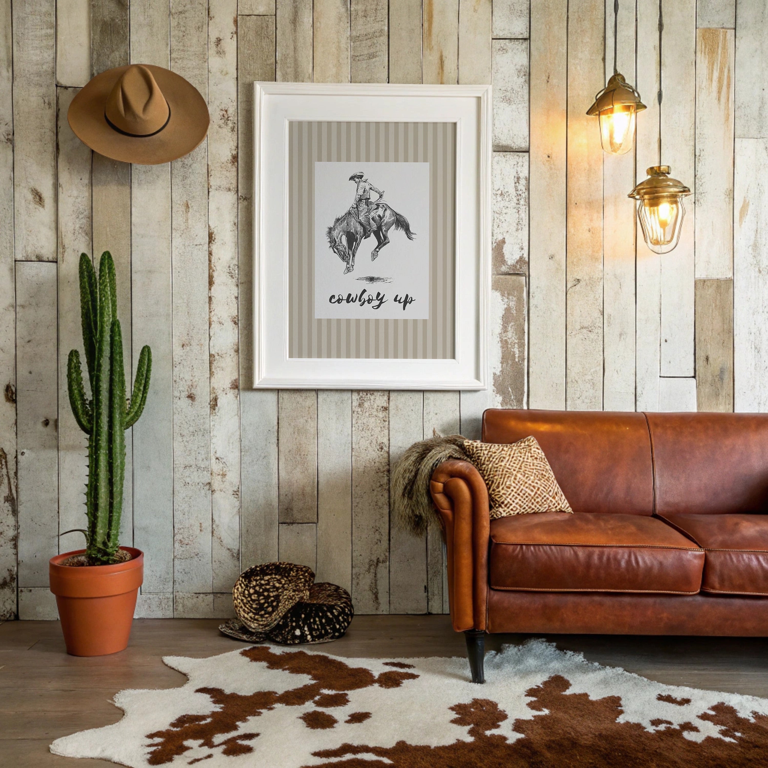 A moment frozen in wild motion, where strength meets grace in midair. The dynamic sketch captures a bronc rider testing their mettle against nature's raw power, rendered in bold, confident strokes that emphasize every muscle and movement. The stark black and white composition strips the scene to its essential elements - rider, horse, and the space between earth and sky. Perfect for adding authentic Western character to a home office, ranch house great room, or any space celebrating the untamed spirit of the American West.