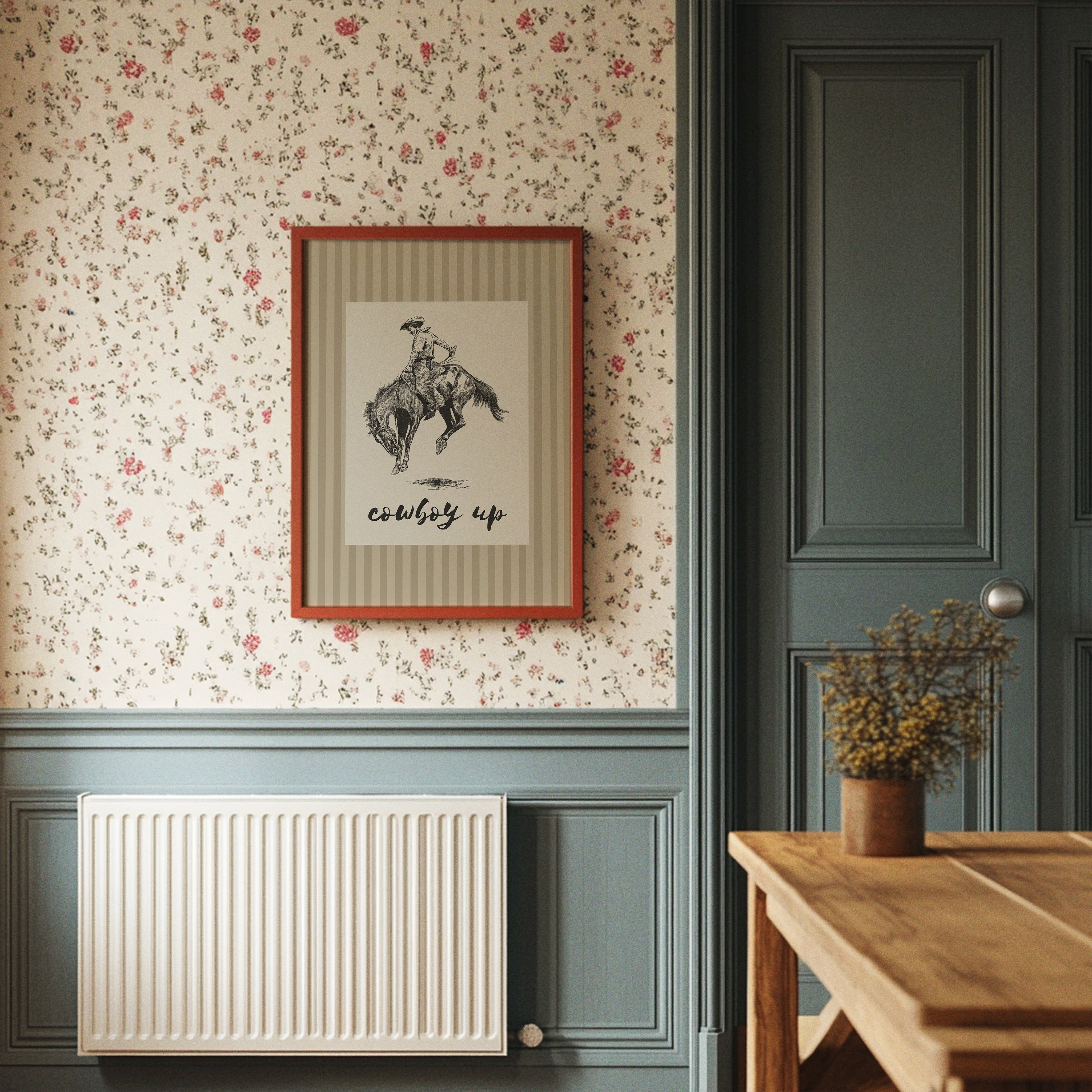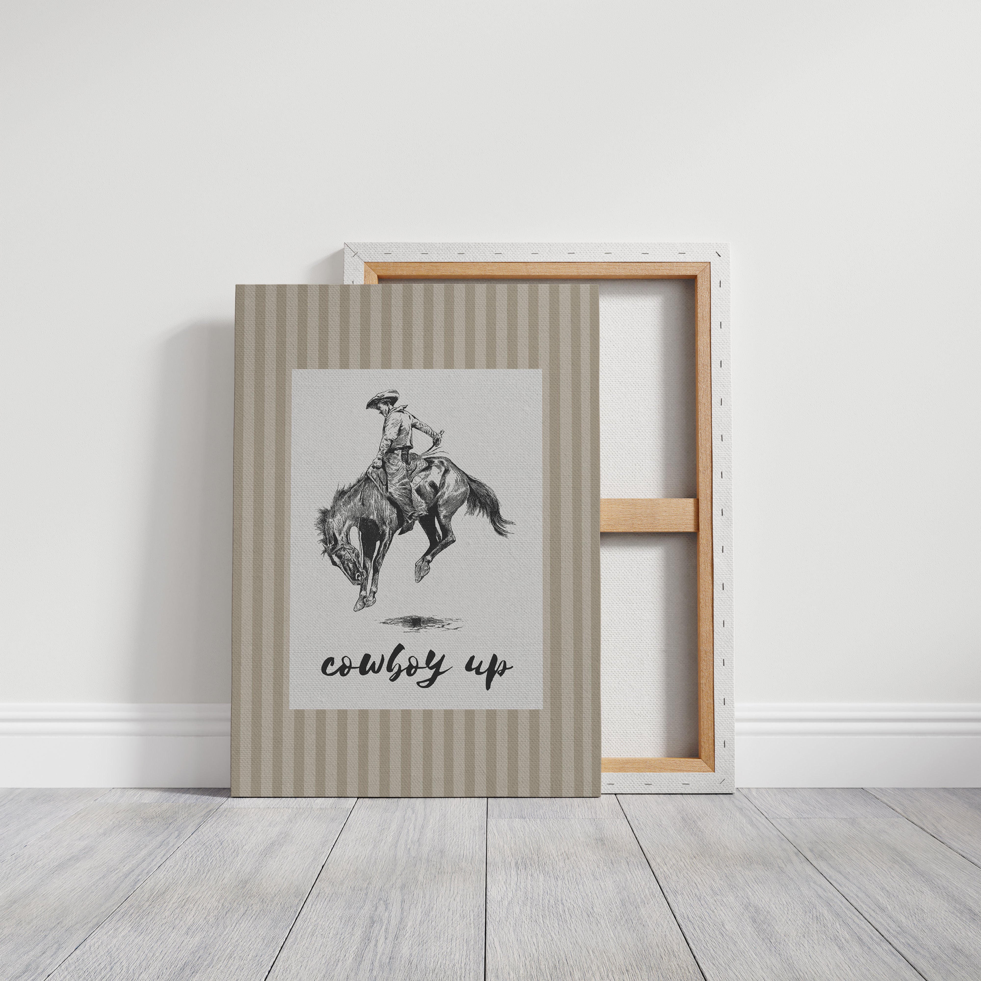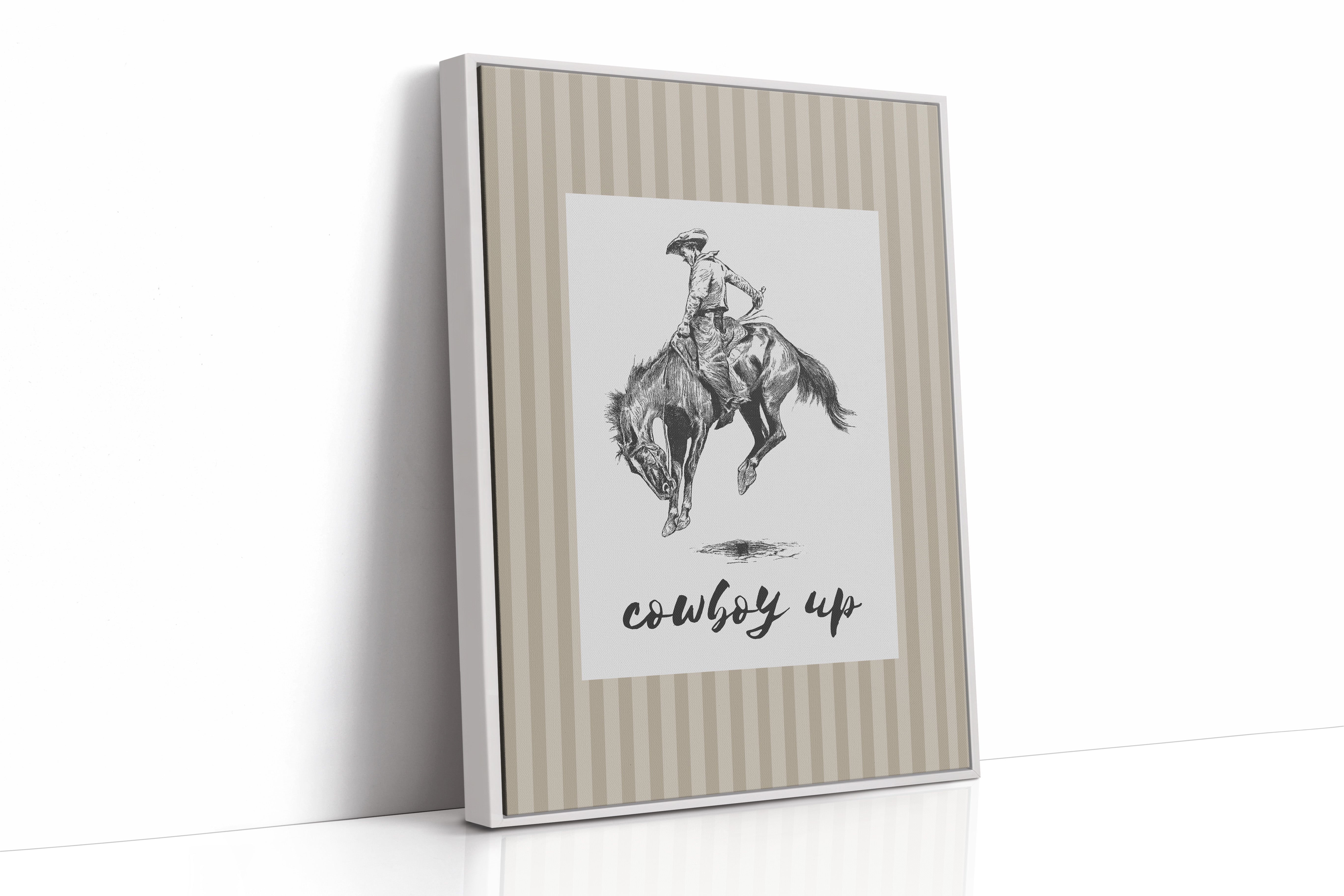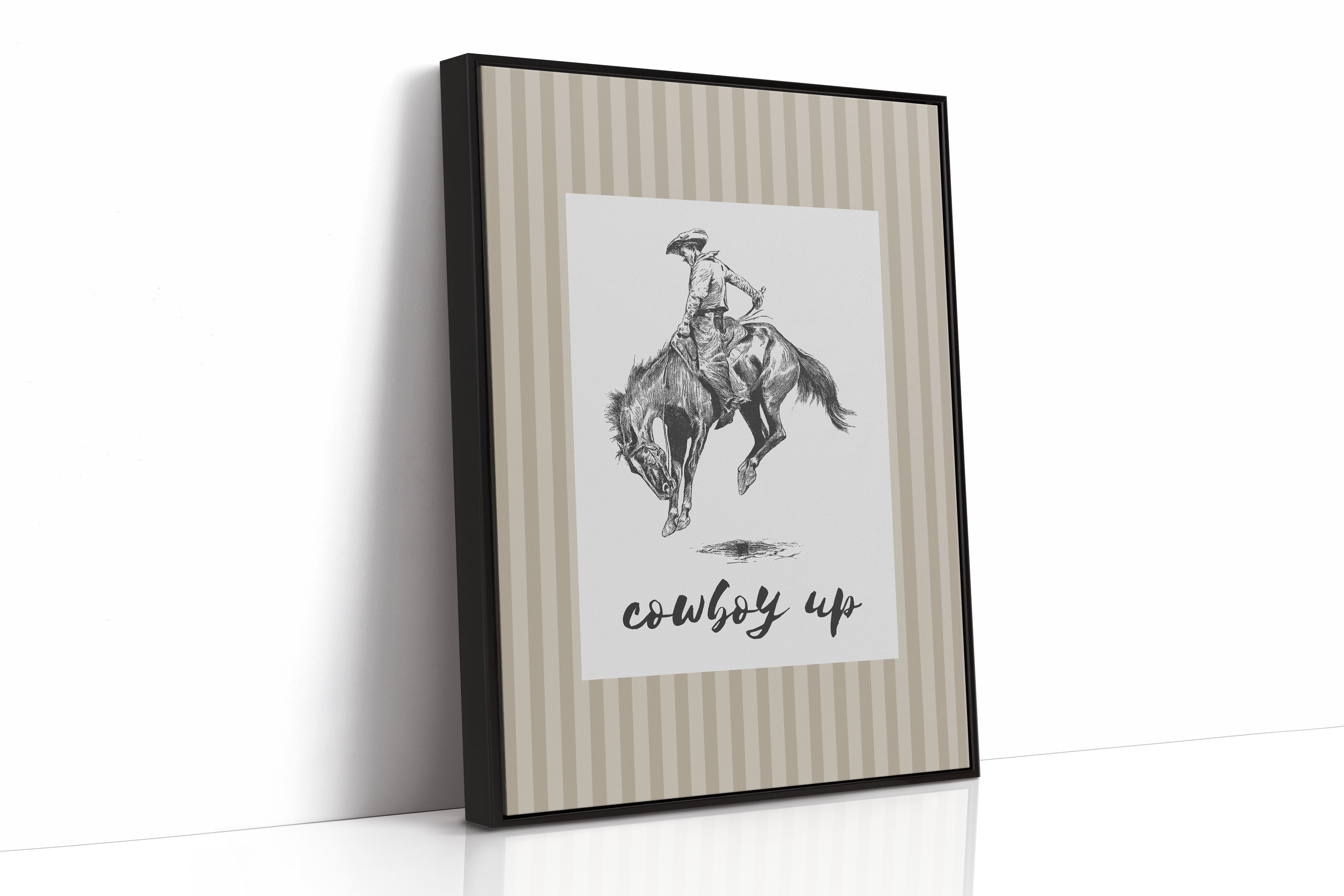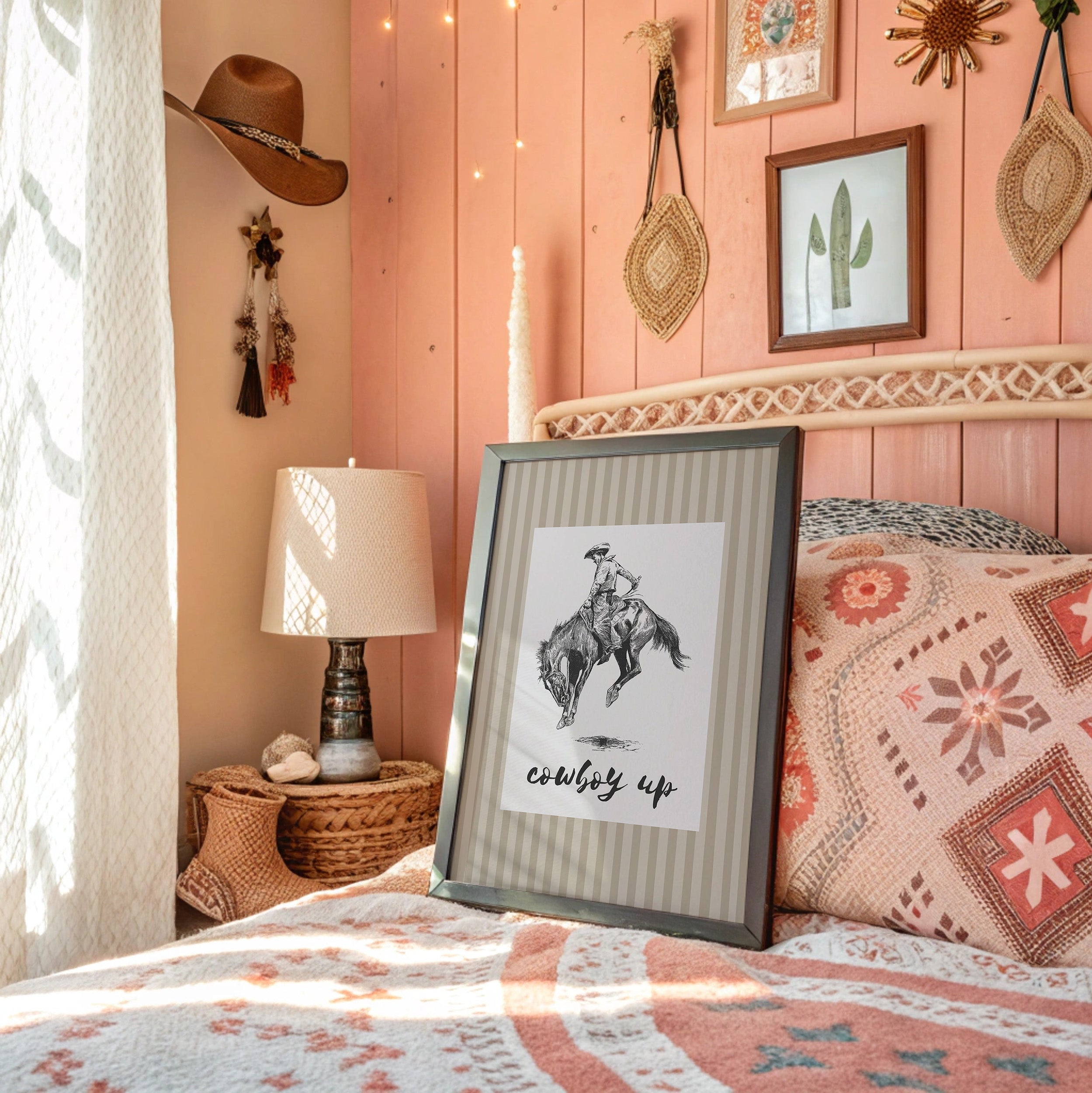 A moment frozen in wild motion, where strength meets grace in midair. The dynamic sketch captures a bronc rider testing their mettle against nature's raw power, rendered in bold, confident strokes that emphasize every muscle and movement. The stark black and white composition strips the scene to its essential elements - rider, horse, and the space between earth and sky. Perfect for adding authentic Western character to a home office, ranch house great room, or any space celebrating the untamed spirit of the American West.